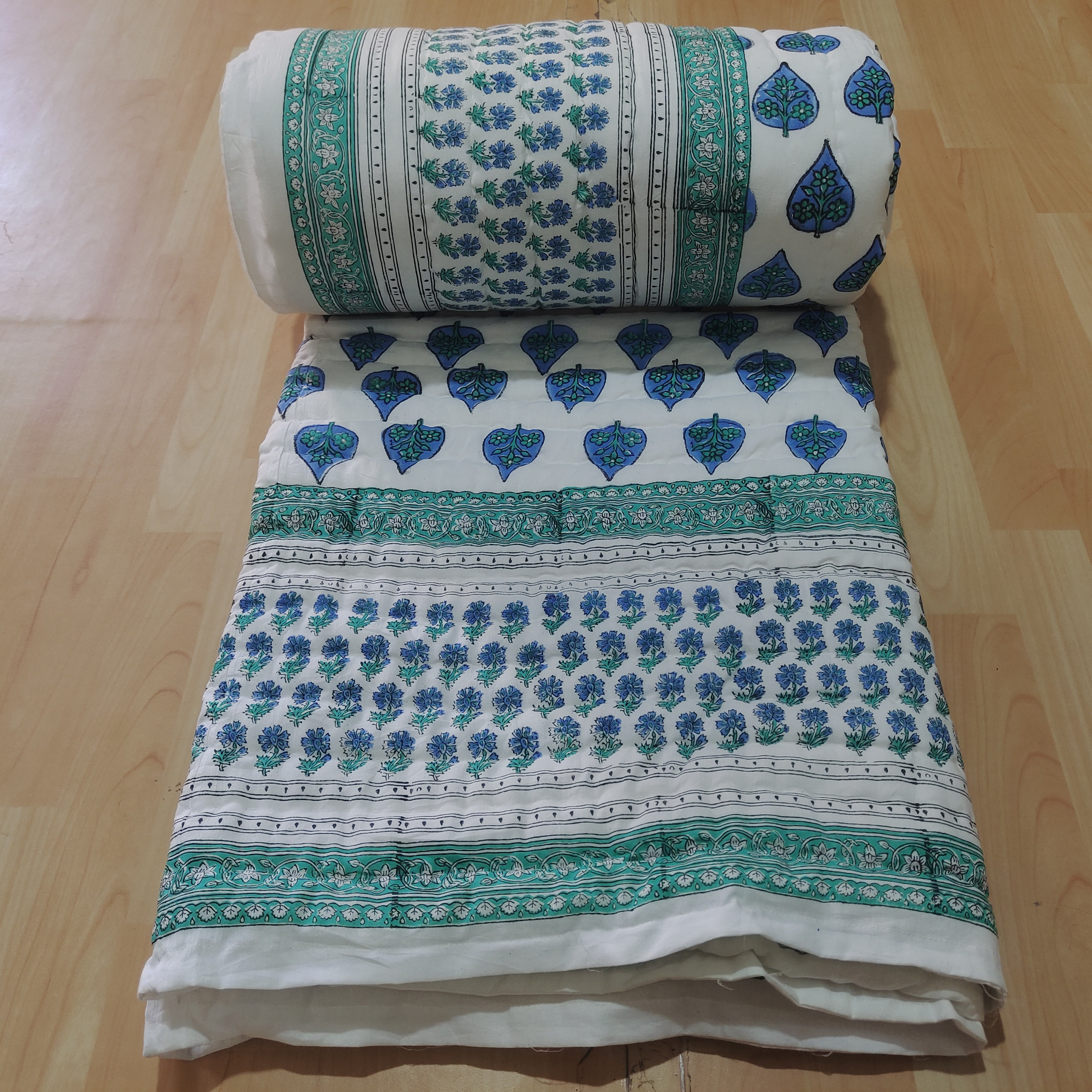 Policy- Buyer Are Responsible to Pay Duty and Taxes Charges,Transform your bedroom with this luxurious hand-block print quilt, featuring a vibrant blue floral design. This queen-size quilt (90x108 inches) is reversible, offering two stunning looks in one. Crafted with care by skilled artisans, it is hand-stitched and filled with natural loose cotton, ensuring breathable comfort and eco-friendly charm.