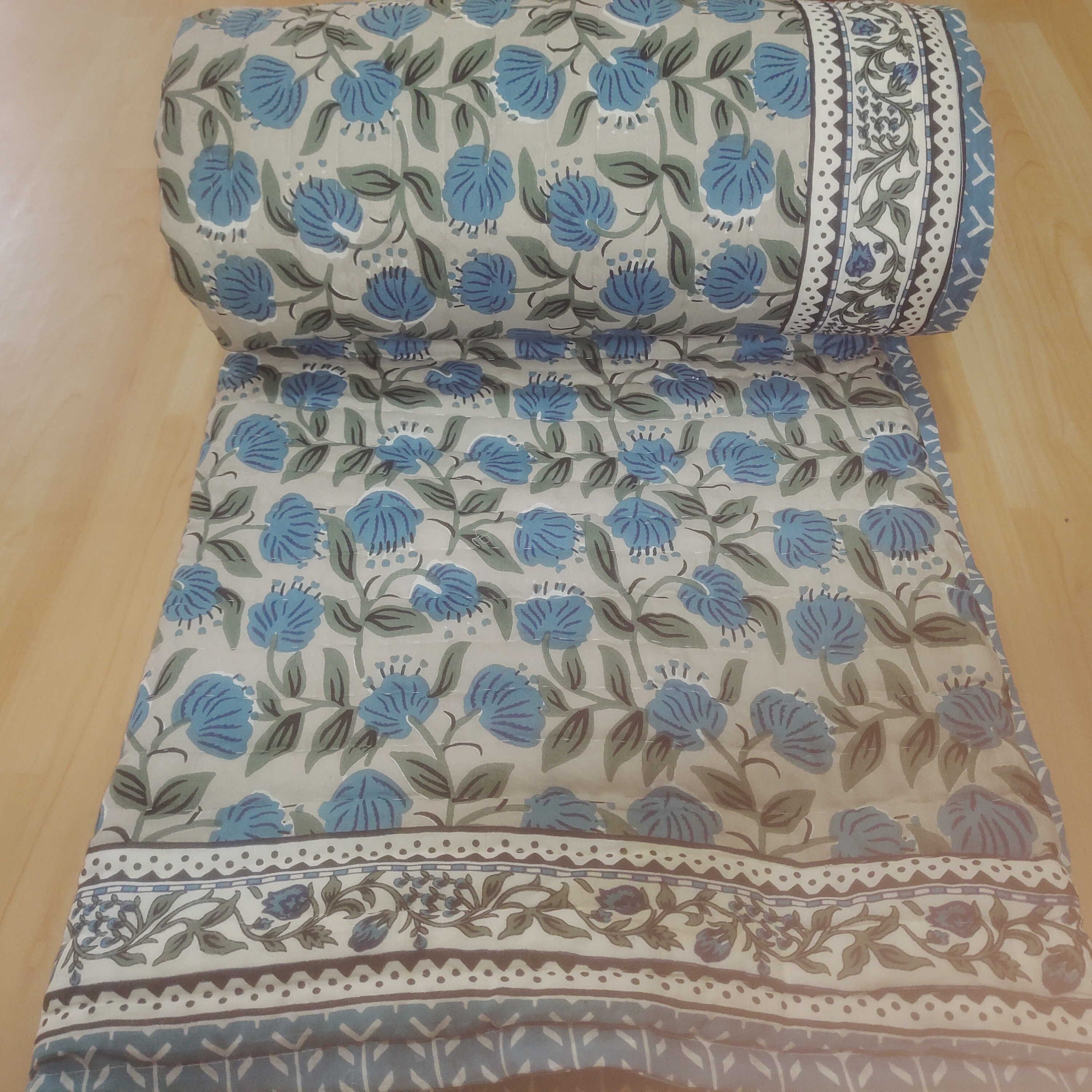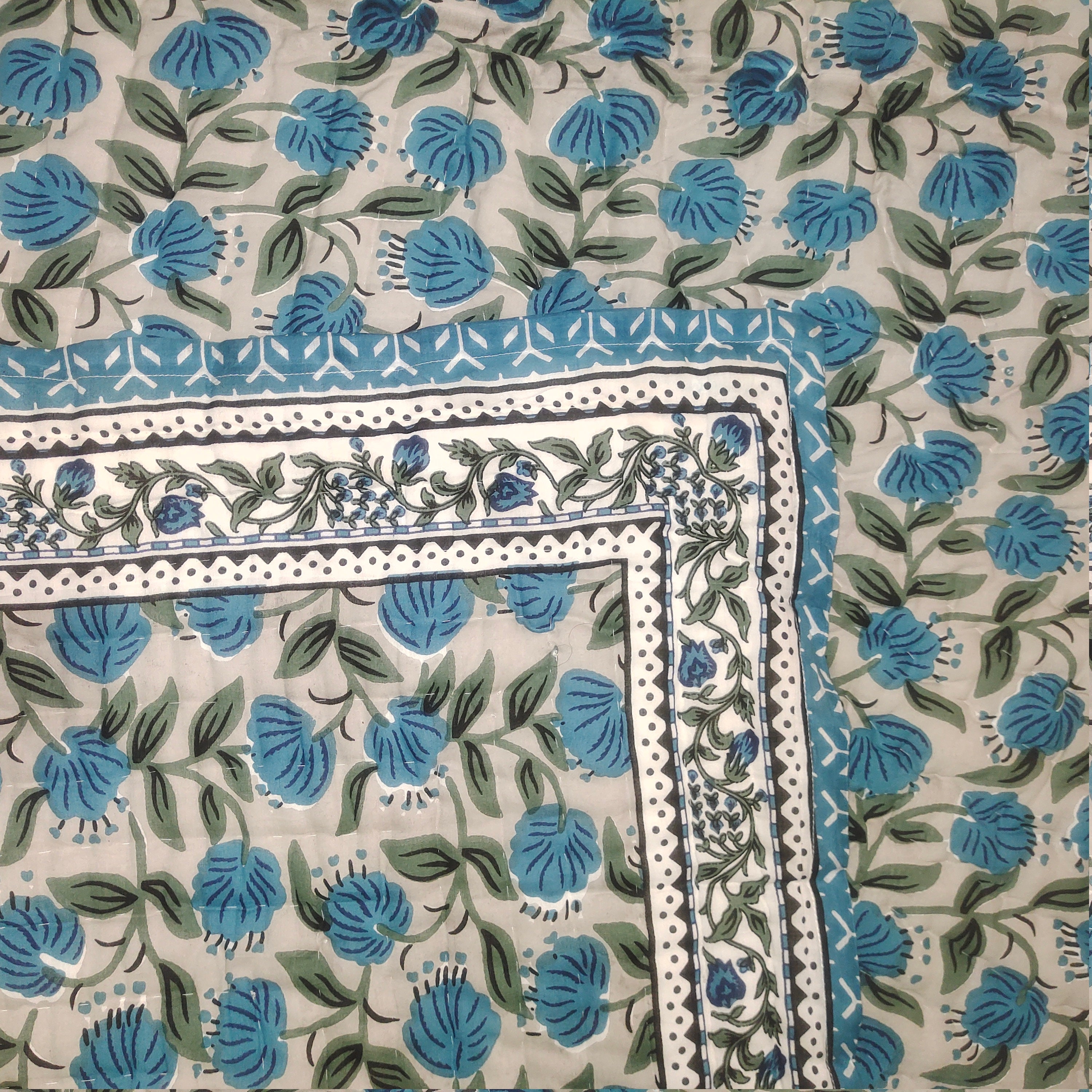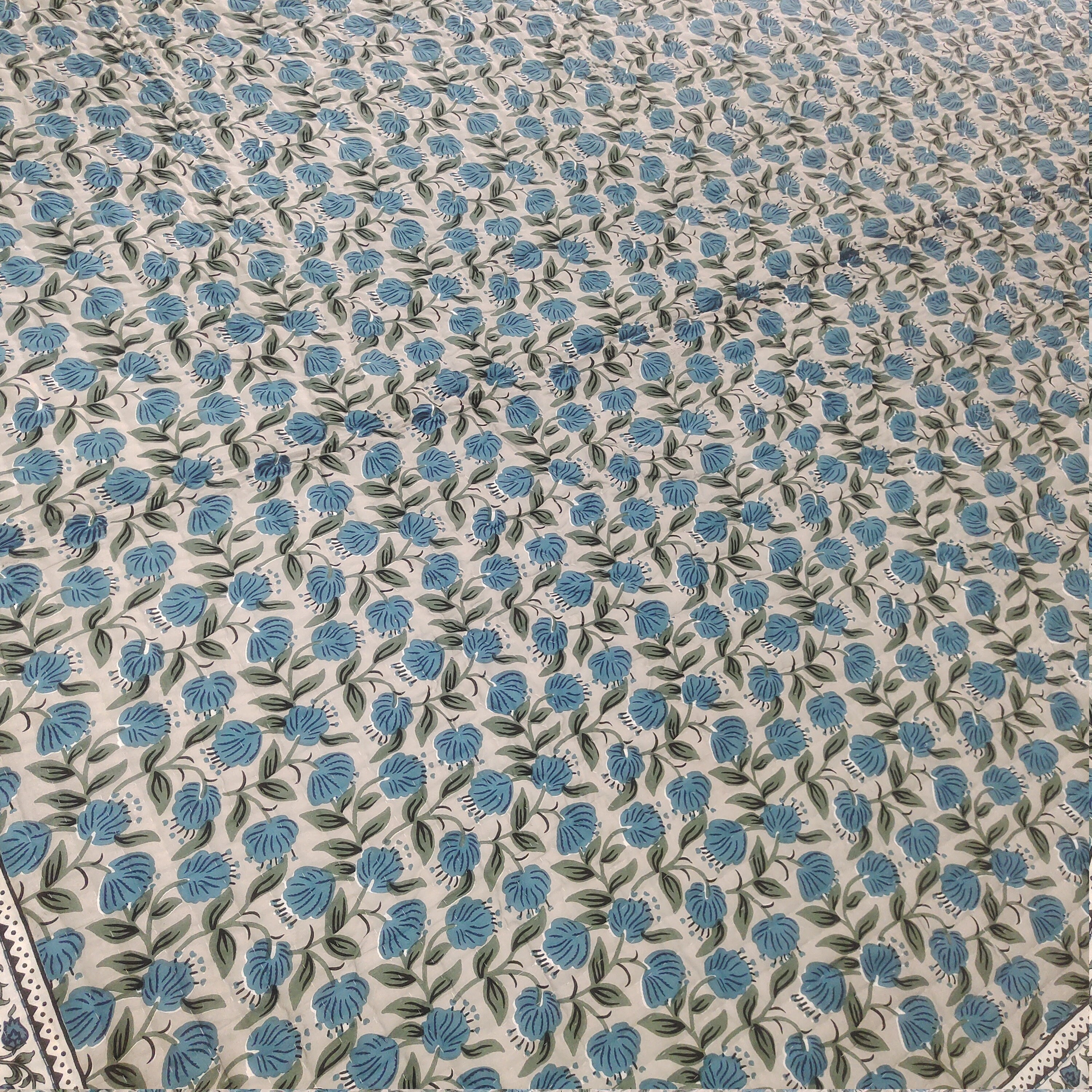 Blue Flower Hand Block Print Quilt - Reversible Cotton Queen Bedding
