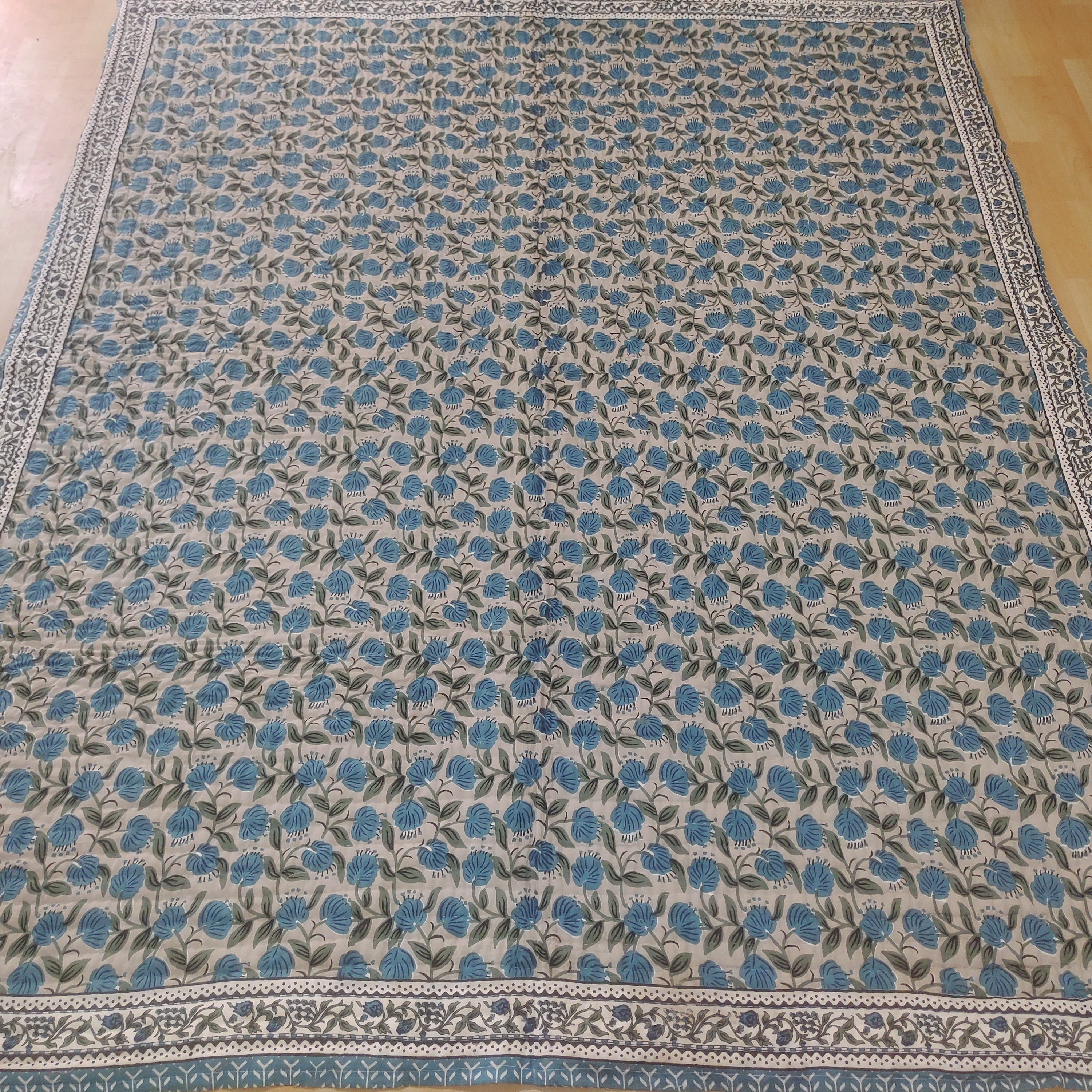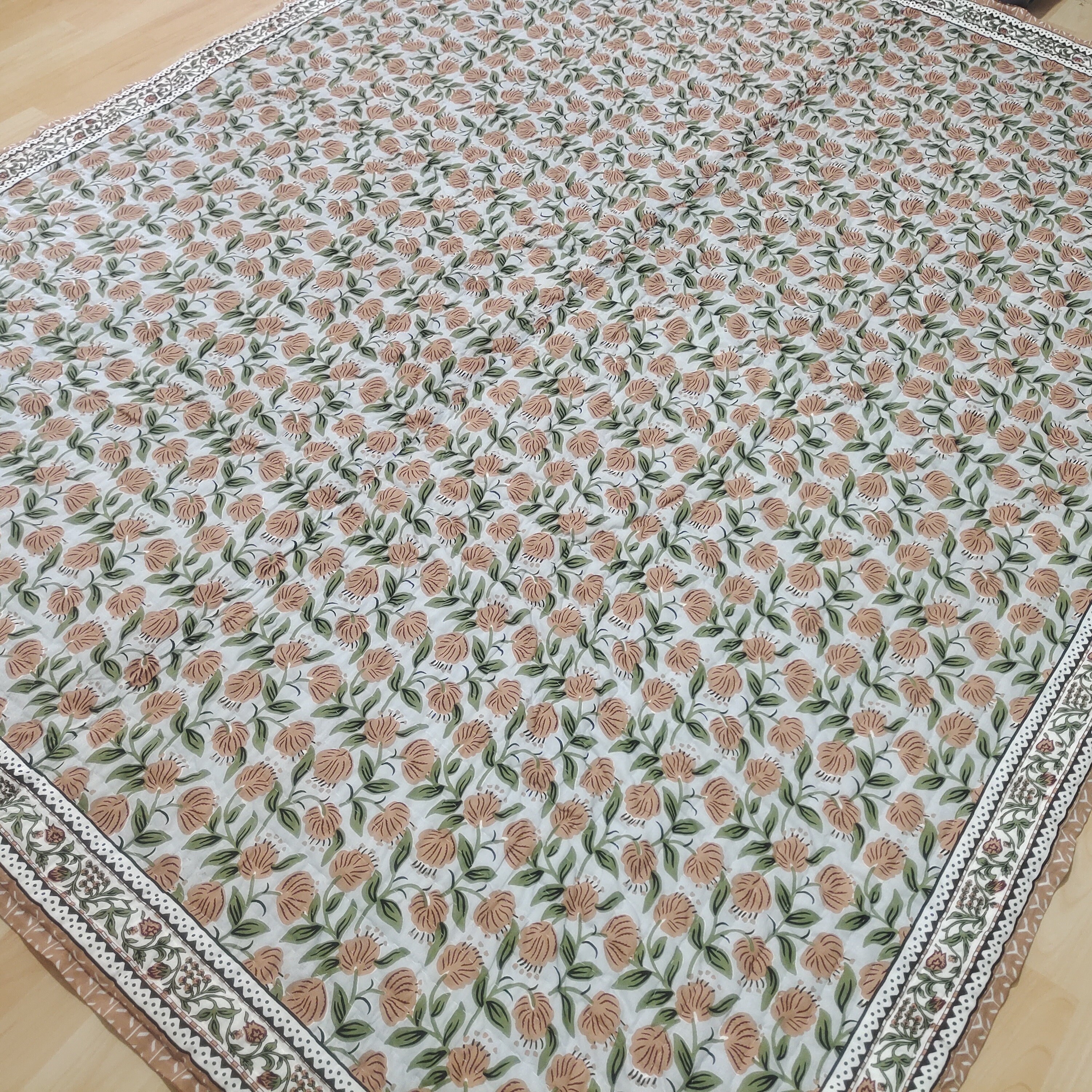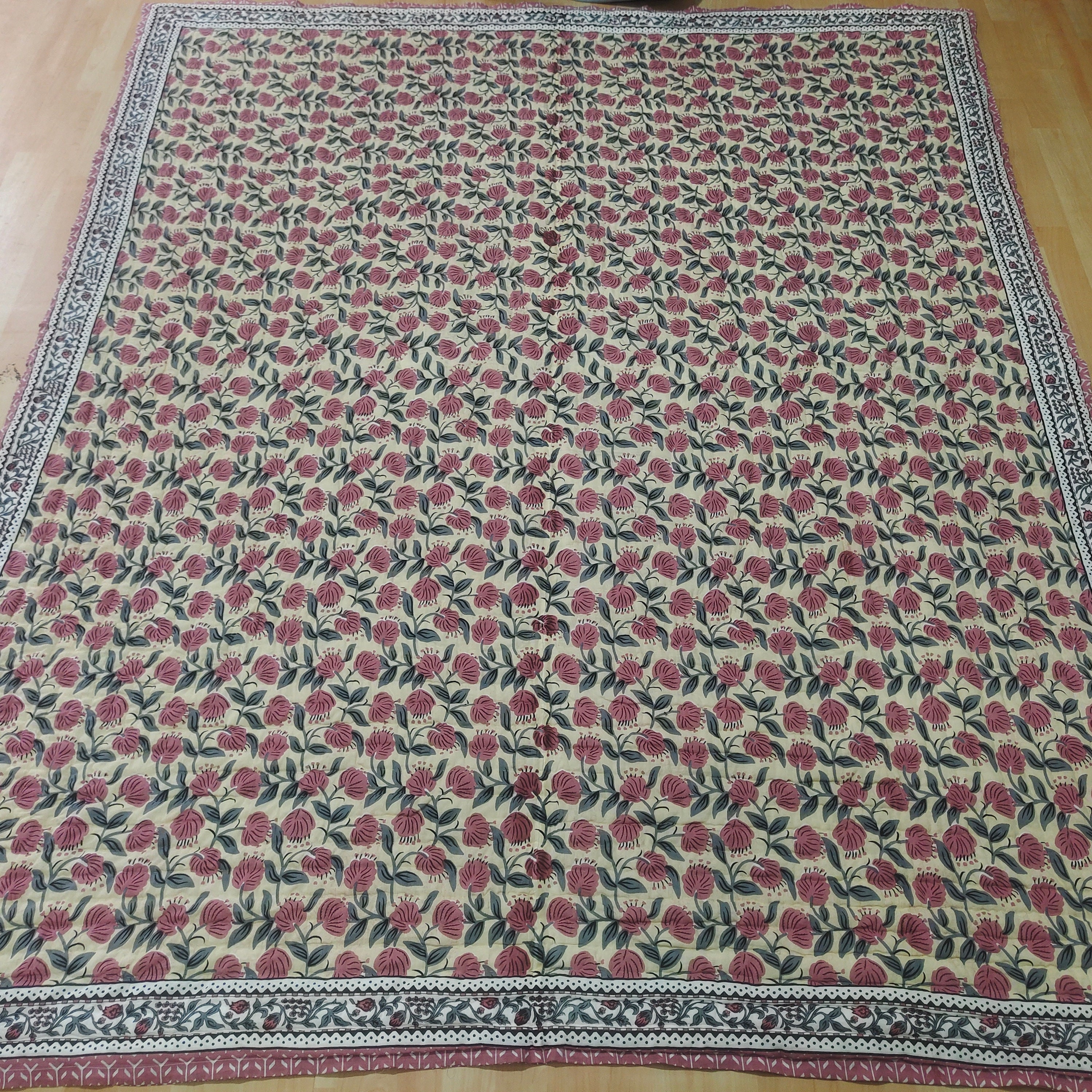Hand Block Print Cotton Quilt: Floral Hand Stitched Queen Bedding