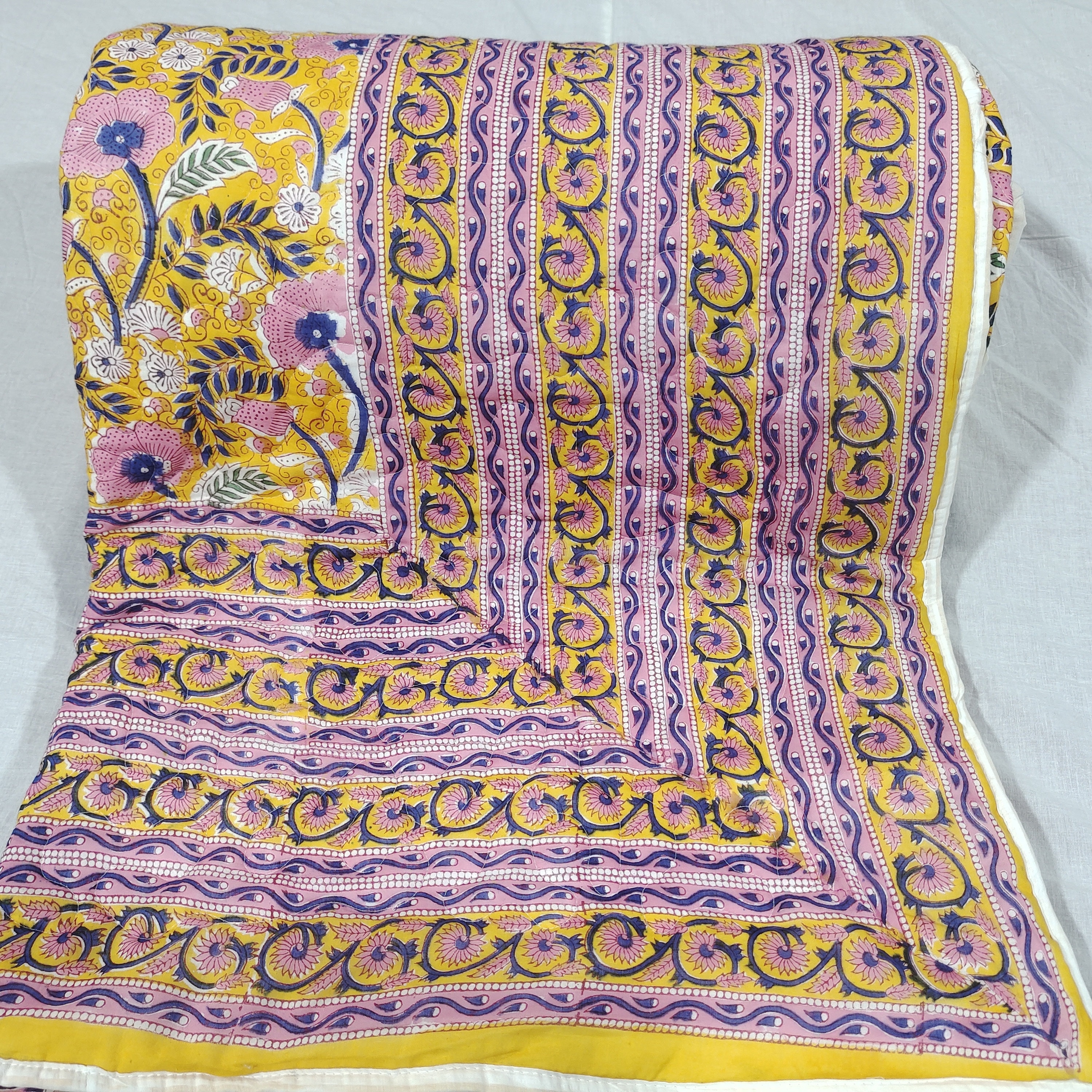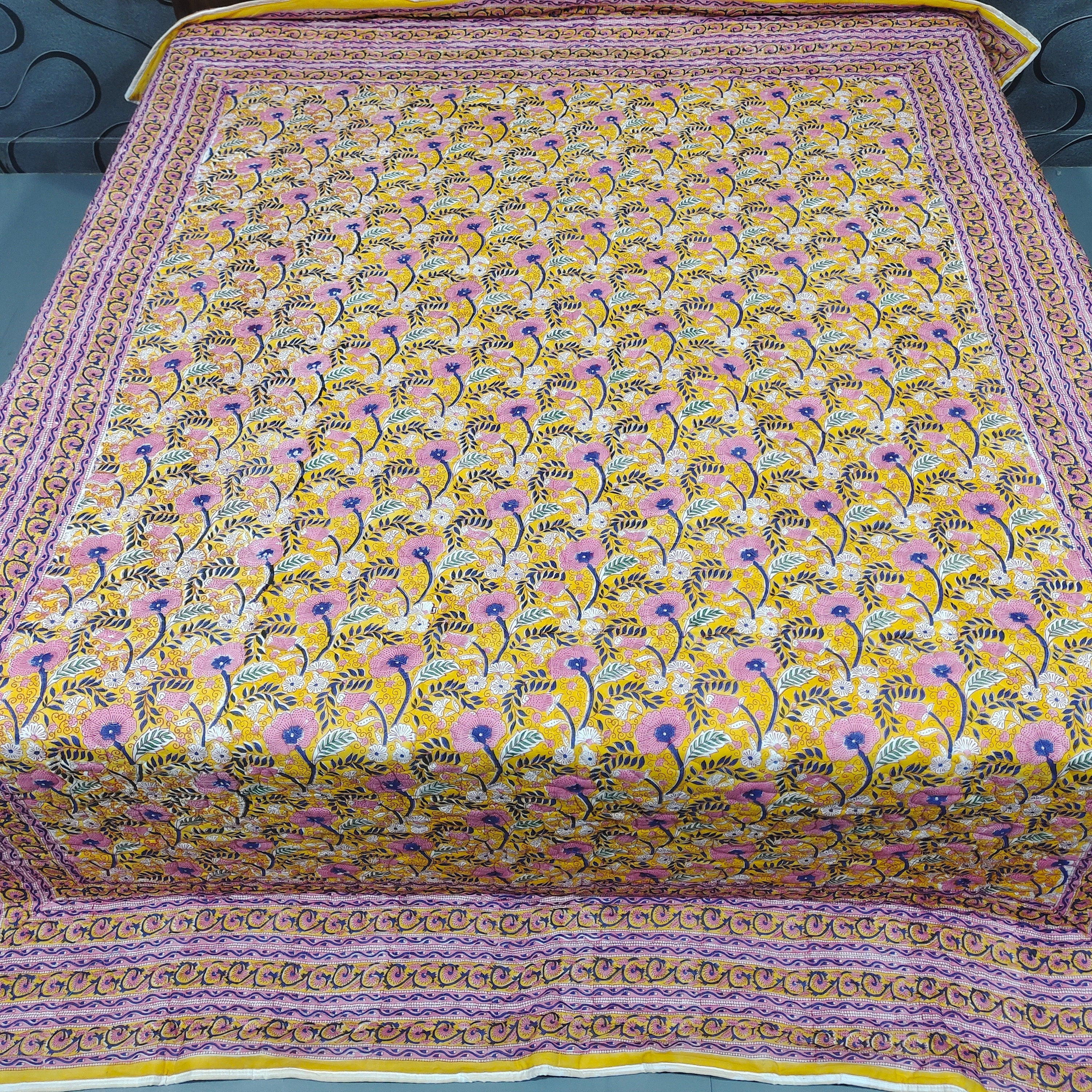 Hand Block Print Cotton Quilt: Reversible Floral Kantha Throw