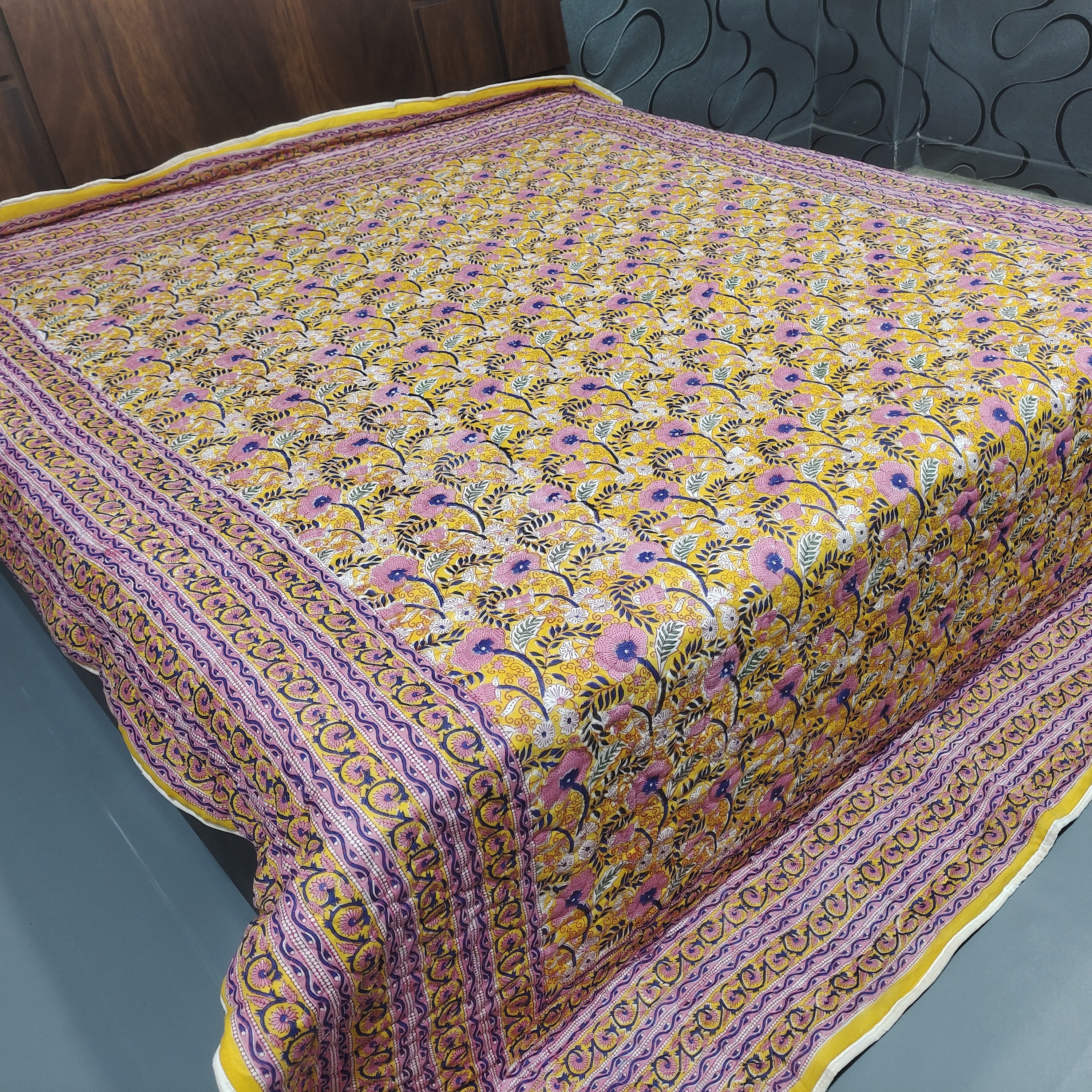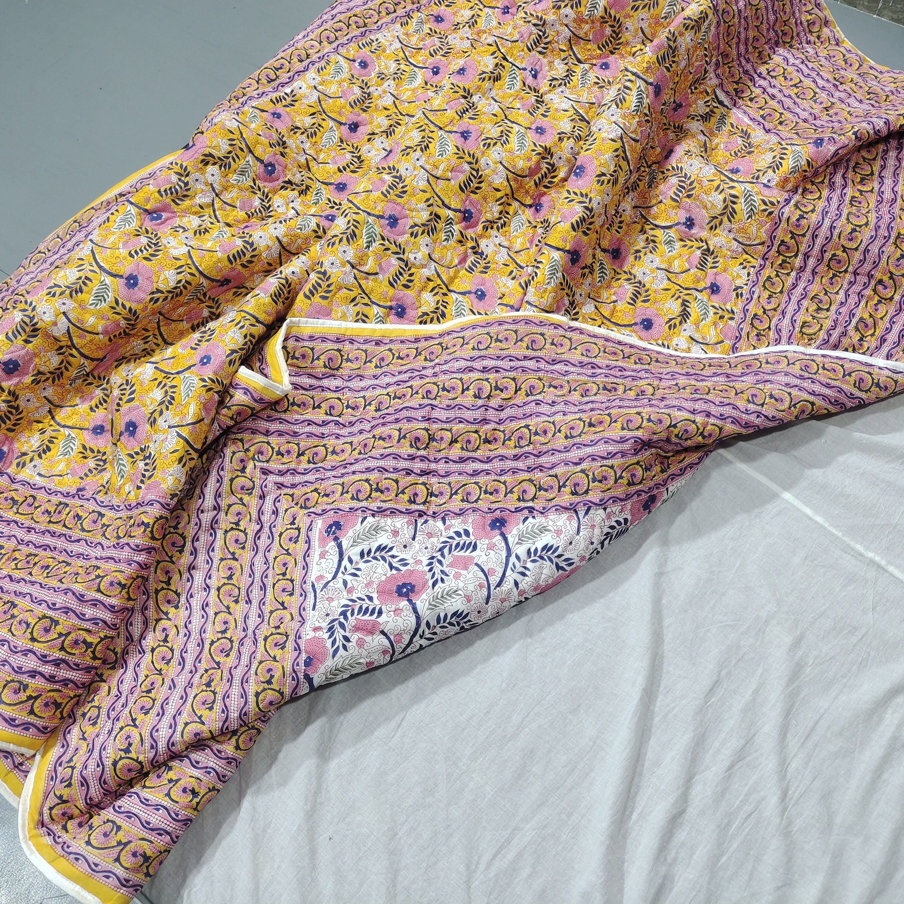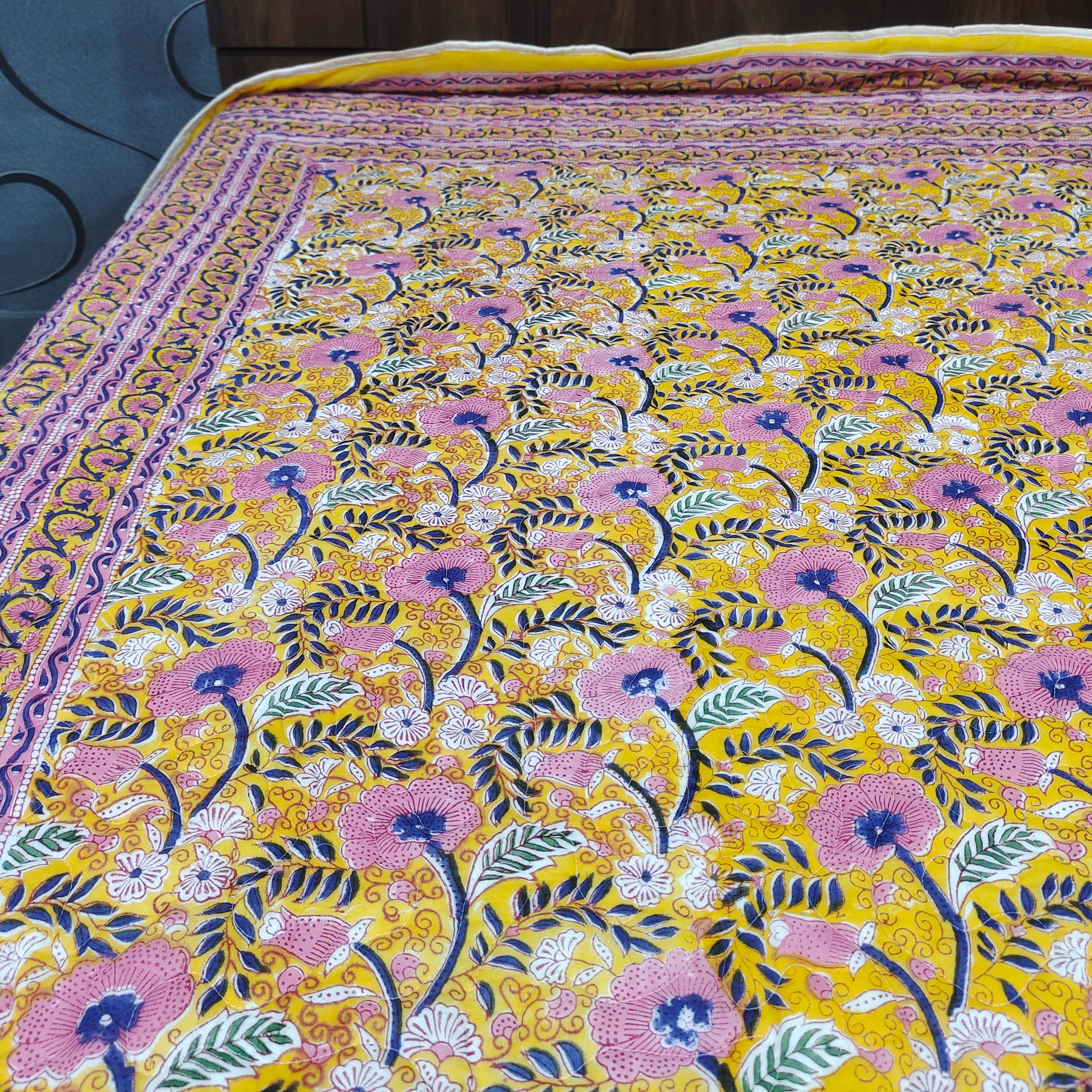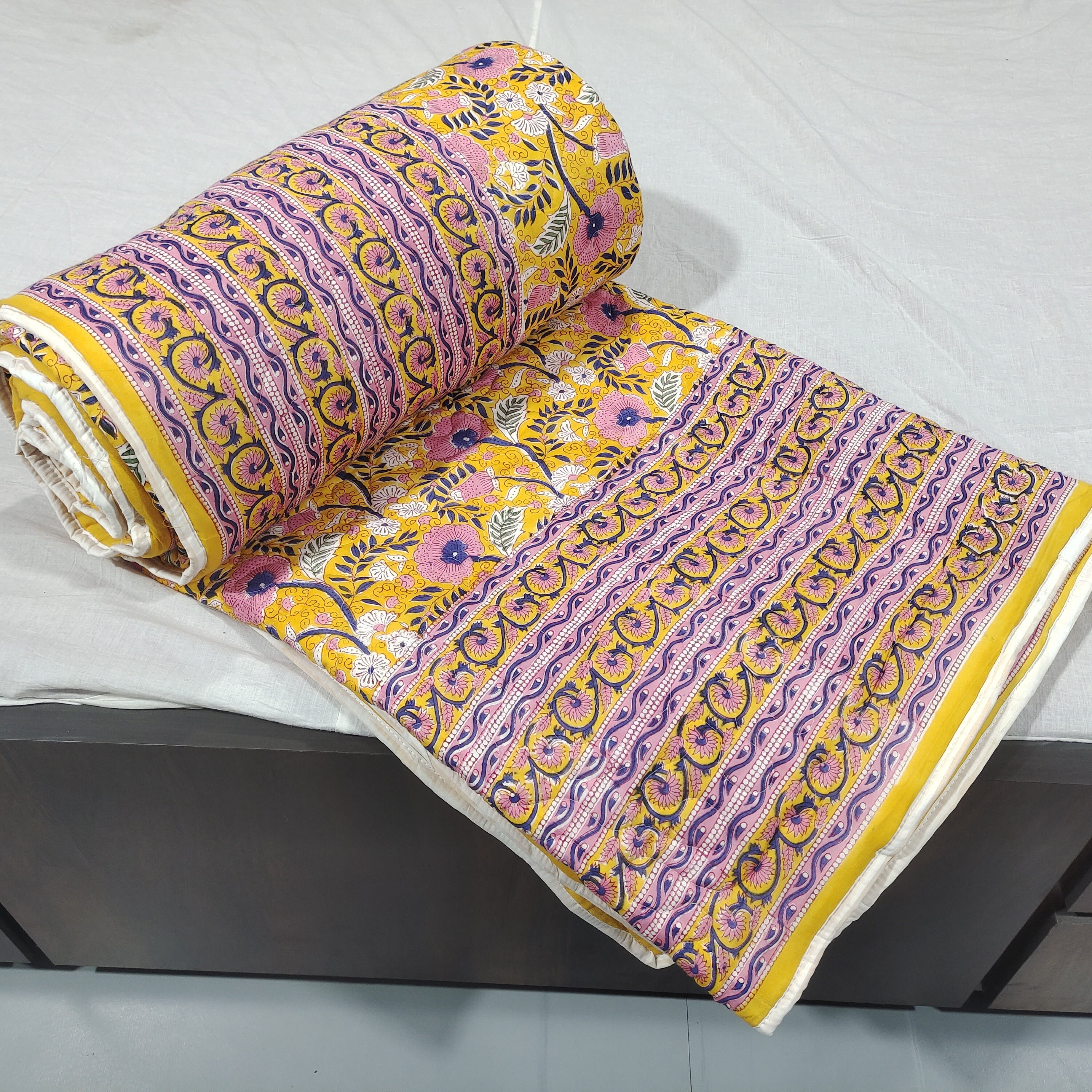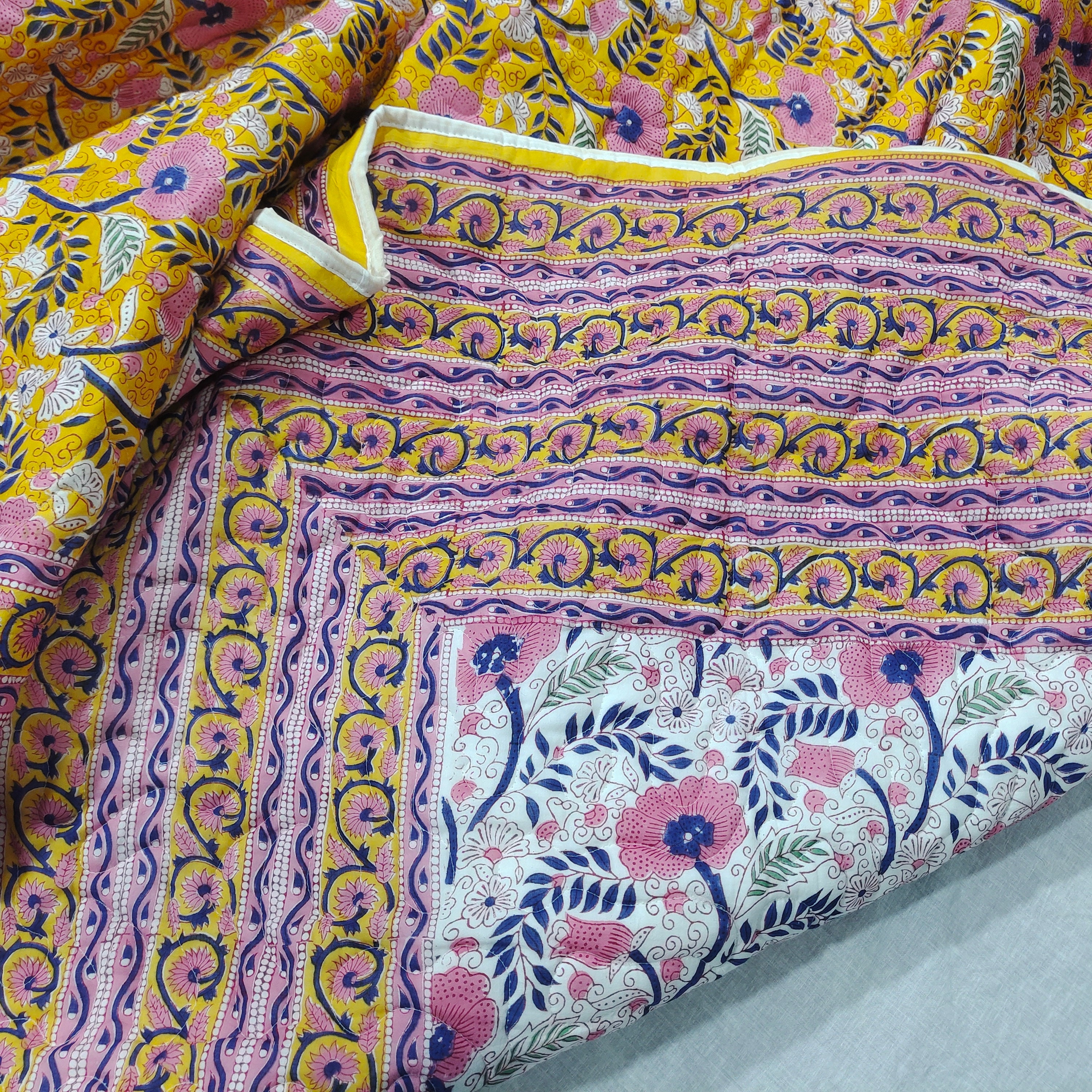 One distinctive feature of this quilt is its reversible hand block print. This traditional printing technique adds a unique and artistic touch to the quilt, making it not only a functional bedding item but also a piece of aesthetic appeal. Hand block printing involves skilled artisans carving intricate designs onto wooden blocks, which are then dipped in dye and stamped onto the fabric.
