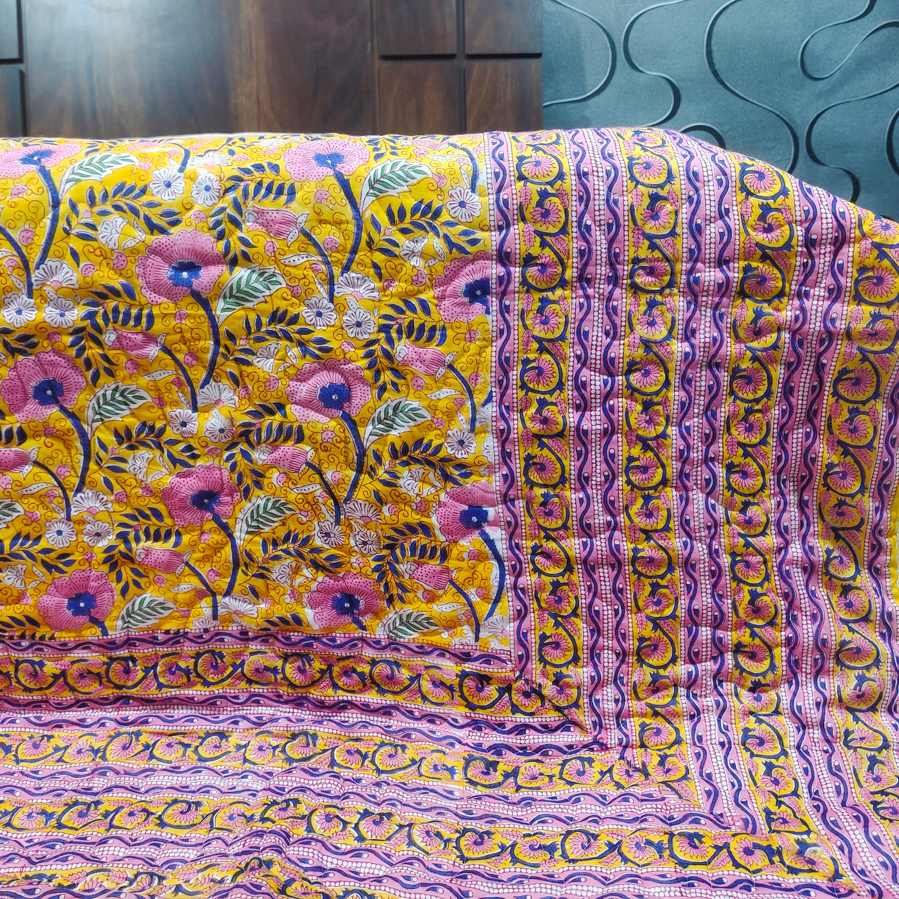 In conclusion, this machine-stitched quilt with zigzag patterns, filled with a surgical cotton sheet of 200 GSM, featuring a reversible hand block print, is a harmonious blend of craftsmanship and practicality. Its decorative elements and thoughtful construction make it a stylish yet functional addition to any bedroom. The quilt's machine washability adds a layer of convenience, ensuring that it remains a cherished and enduring part of daily lifeInternational Shipping & Customs Notice We are proud to ship our handmade cotton quilts worldwide from Jaipur, India. Please be advised:
