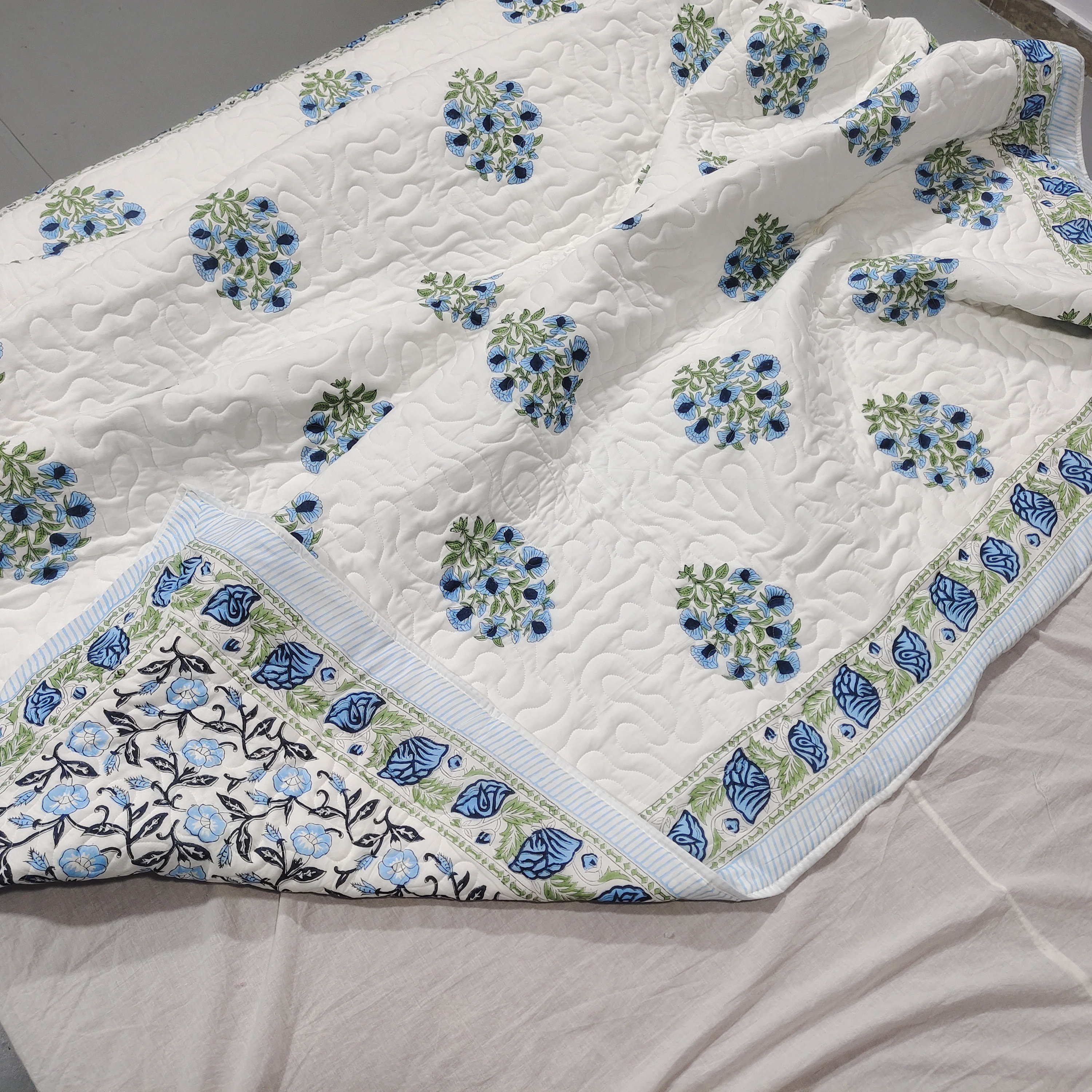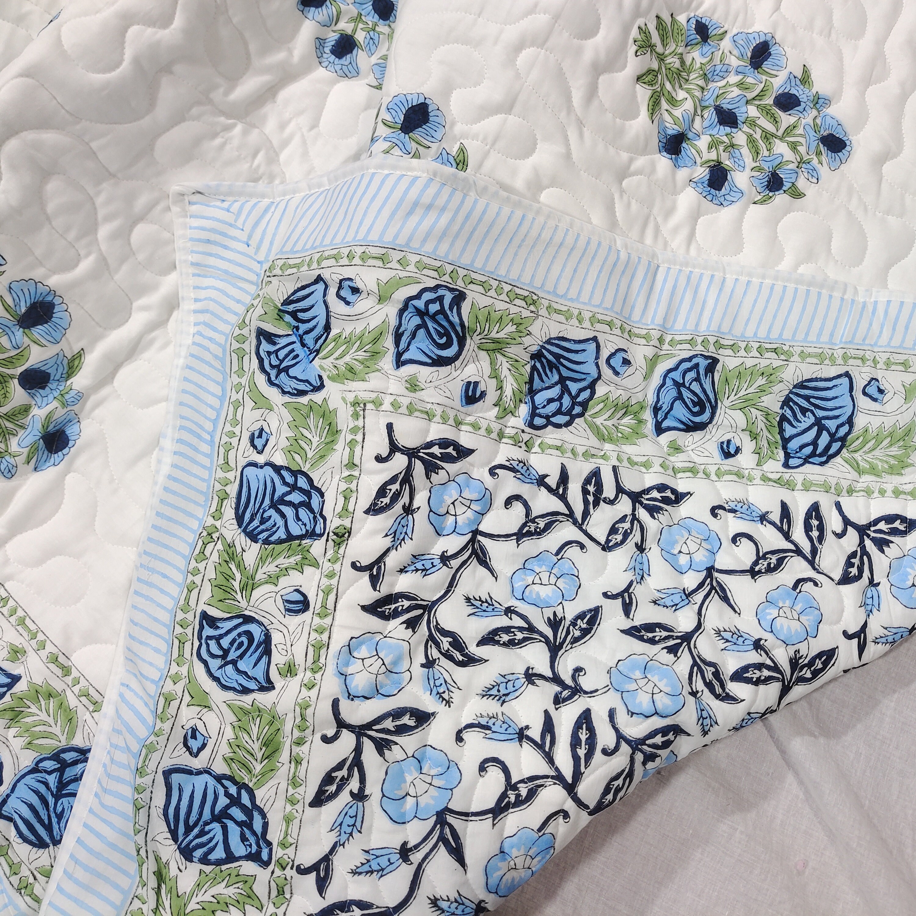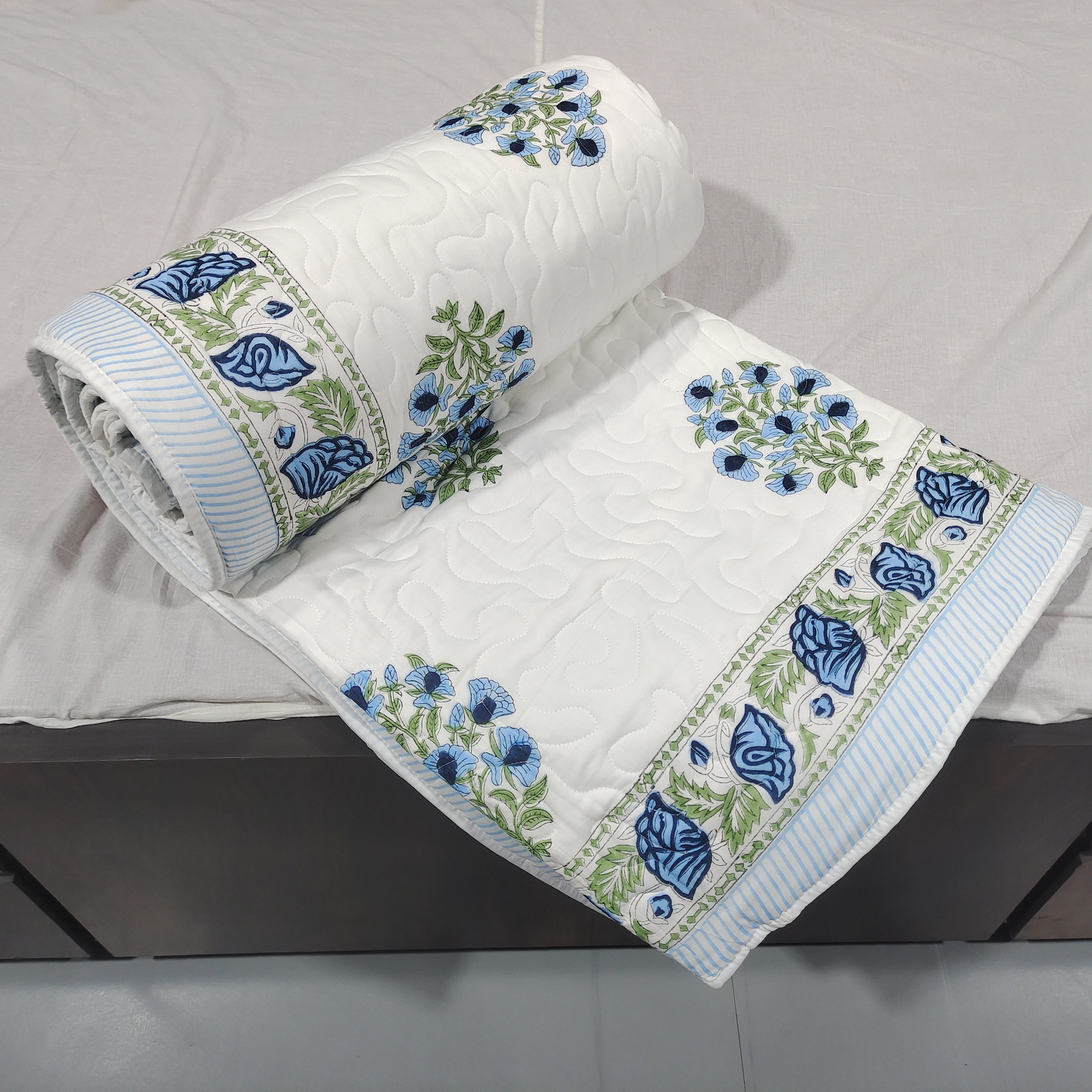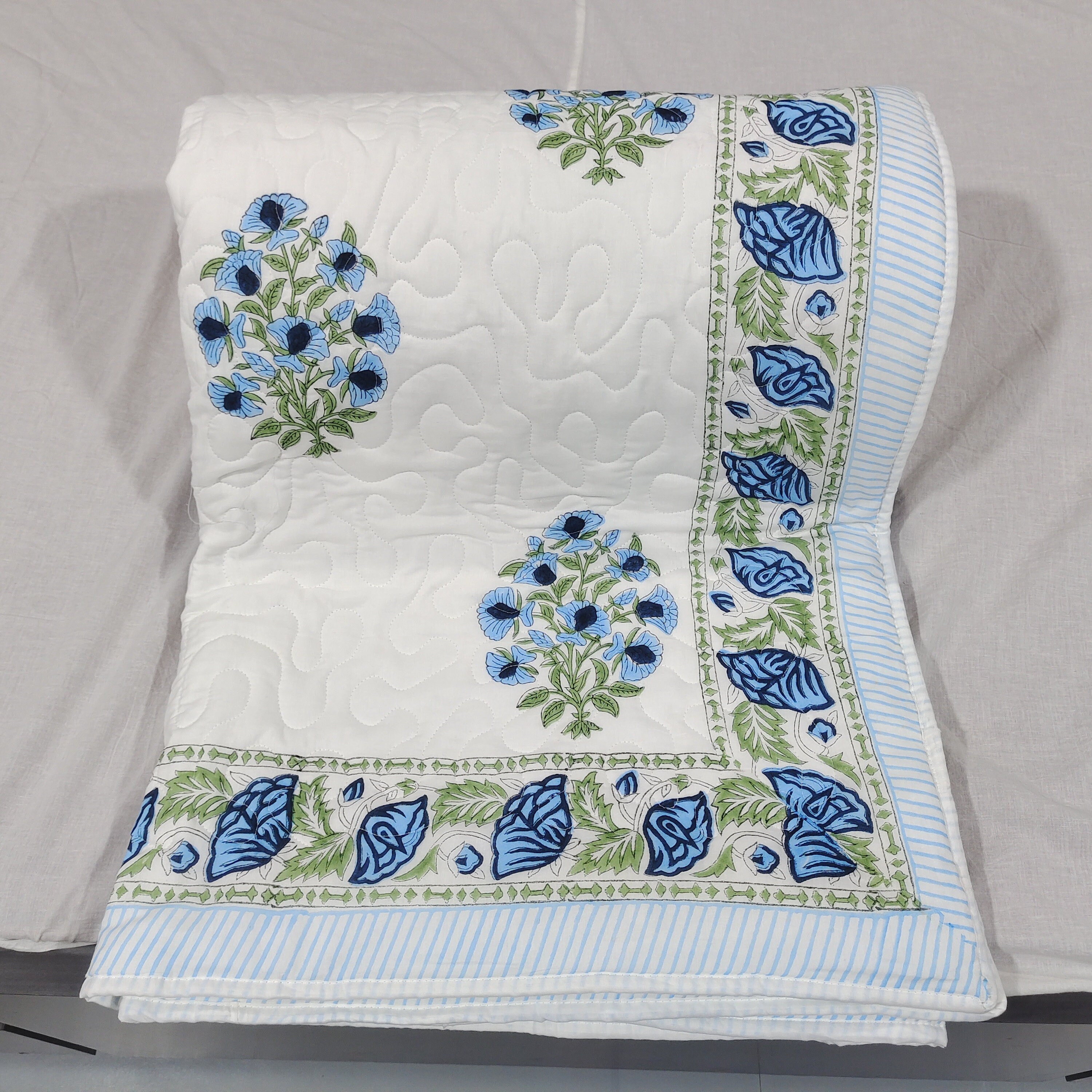 One distinctive feature of this quilt is its reversible hand block print. This traditional printing technique adds a unique and artistic touch to the quilt, making it not only a functional bedding item but also a piece of aesthetic appeal. Hand block printing involves skilled artisans carving intricate designs onto wooden blocks, which are then dipped in dye and stamped onto the fabric.