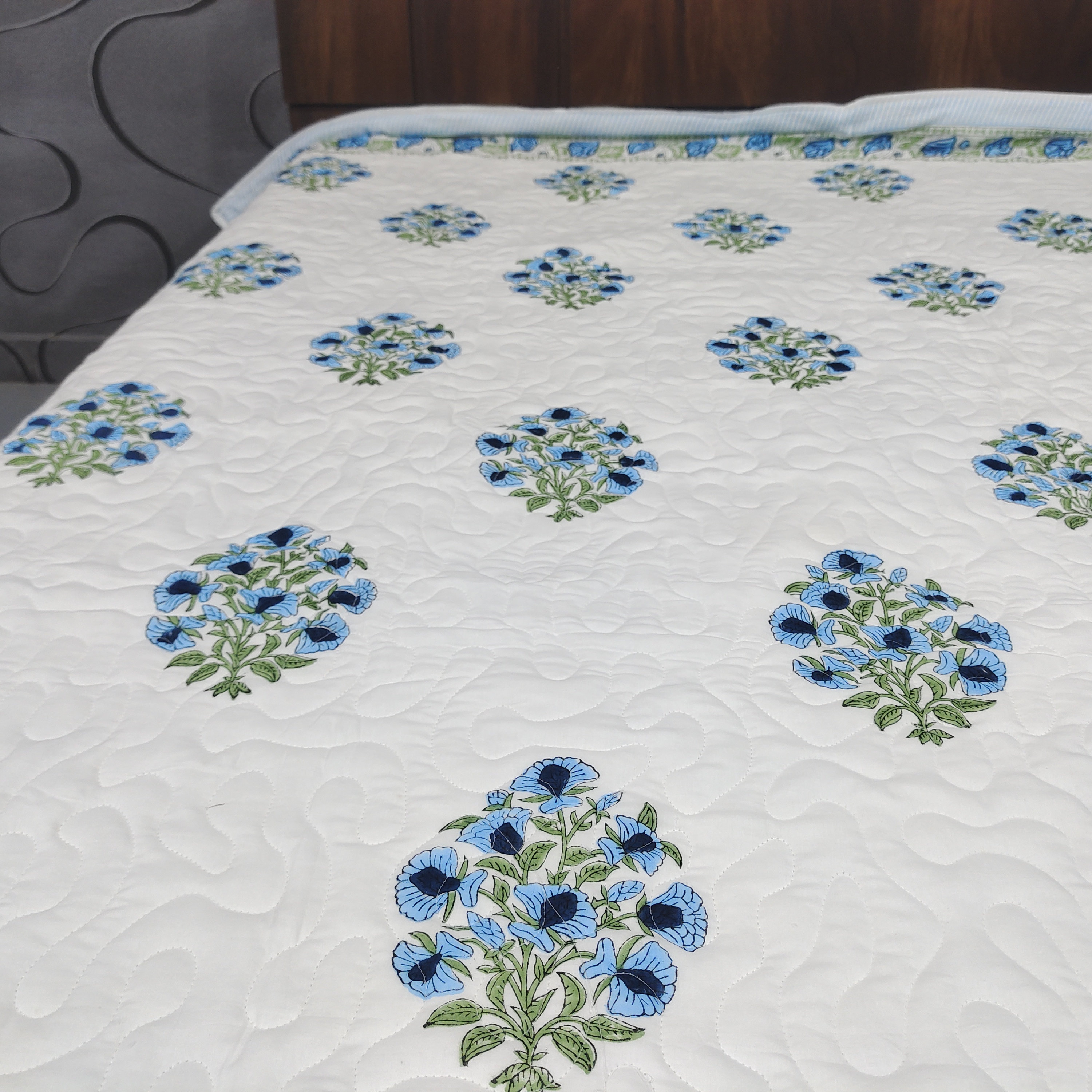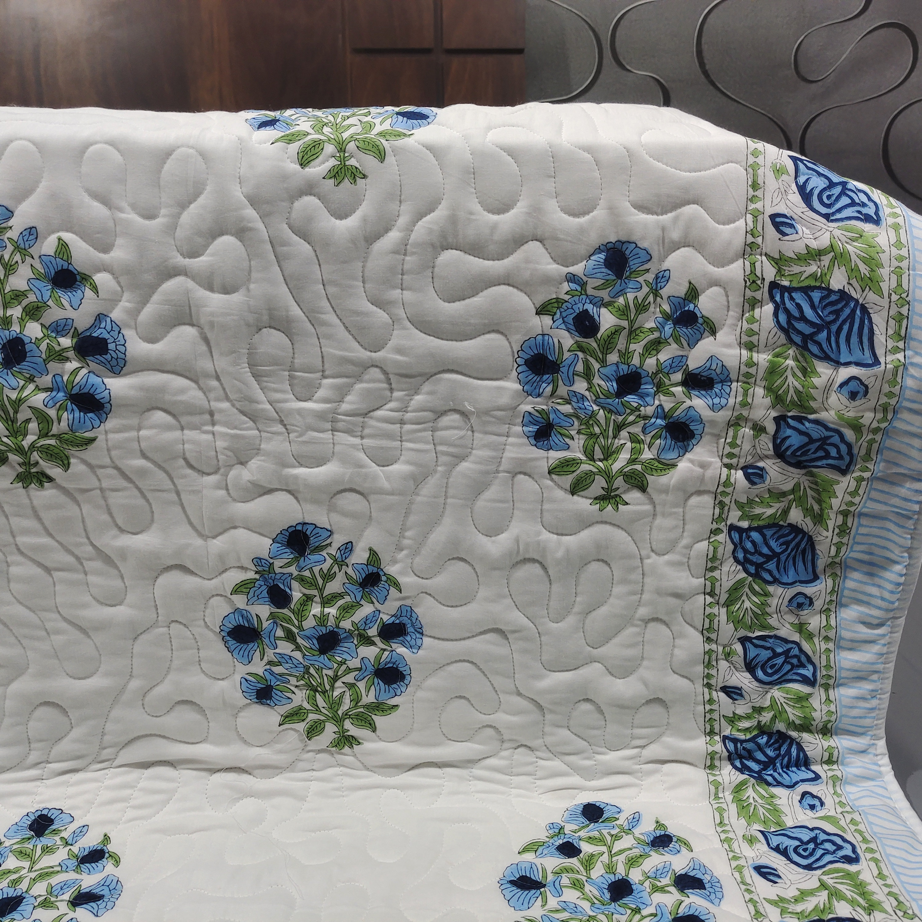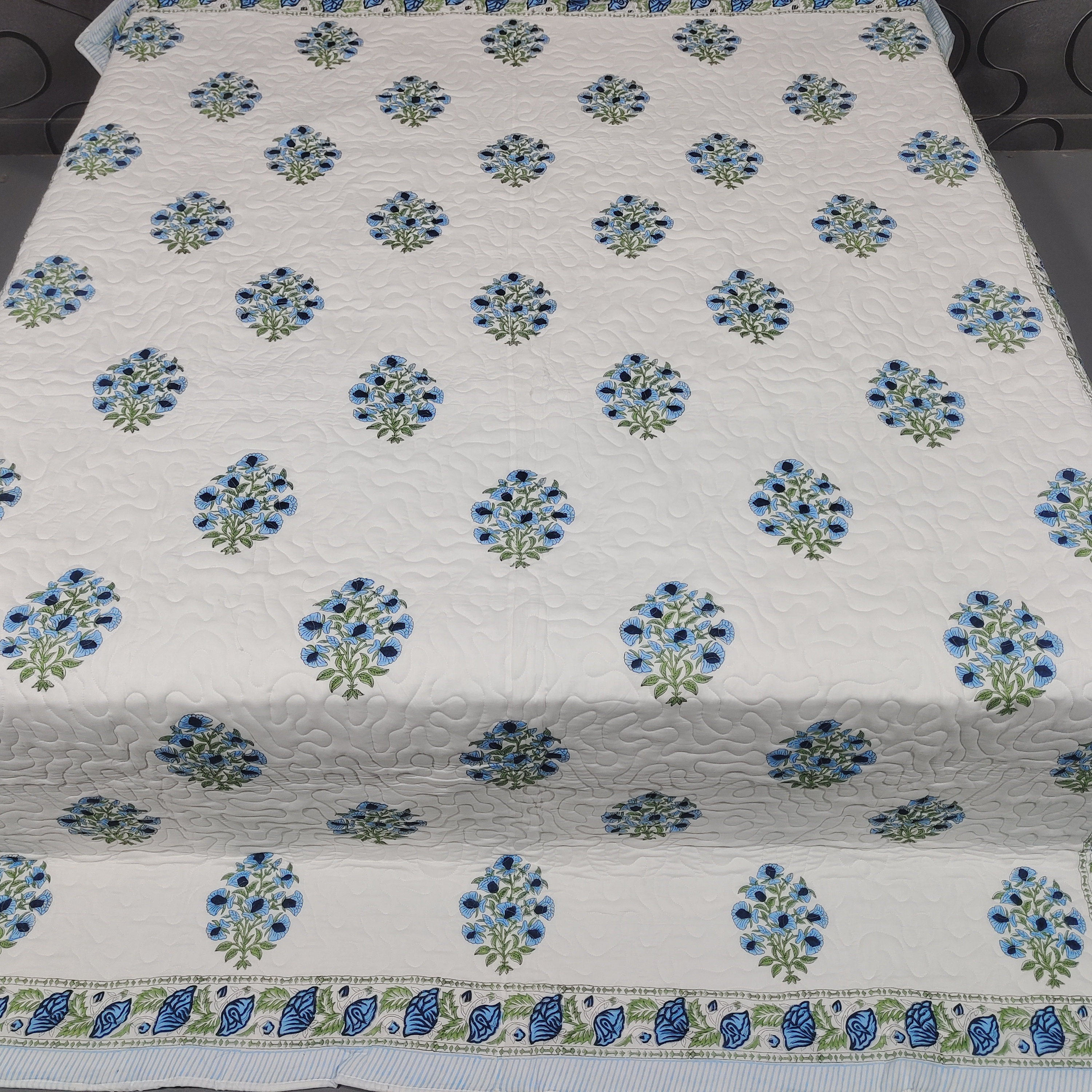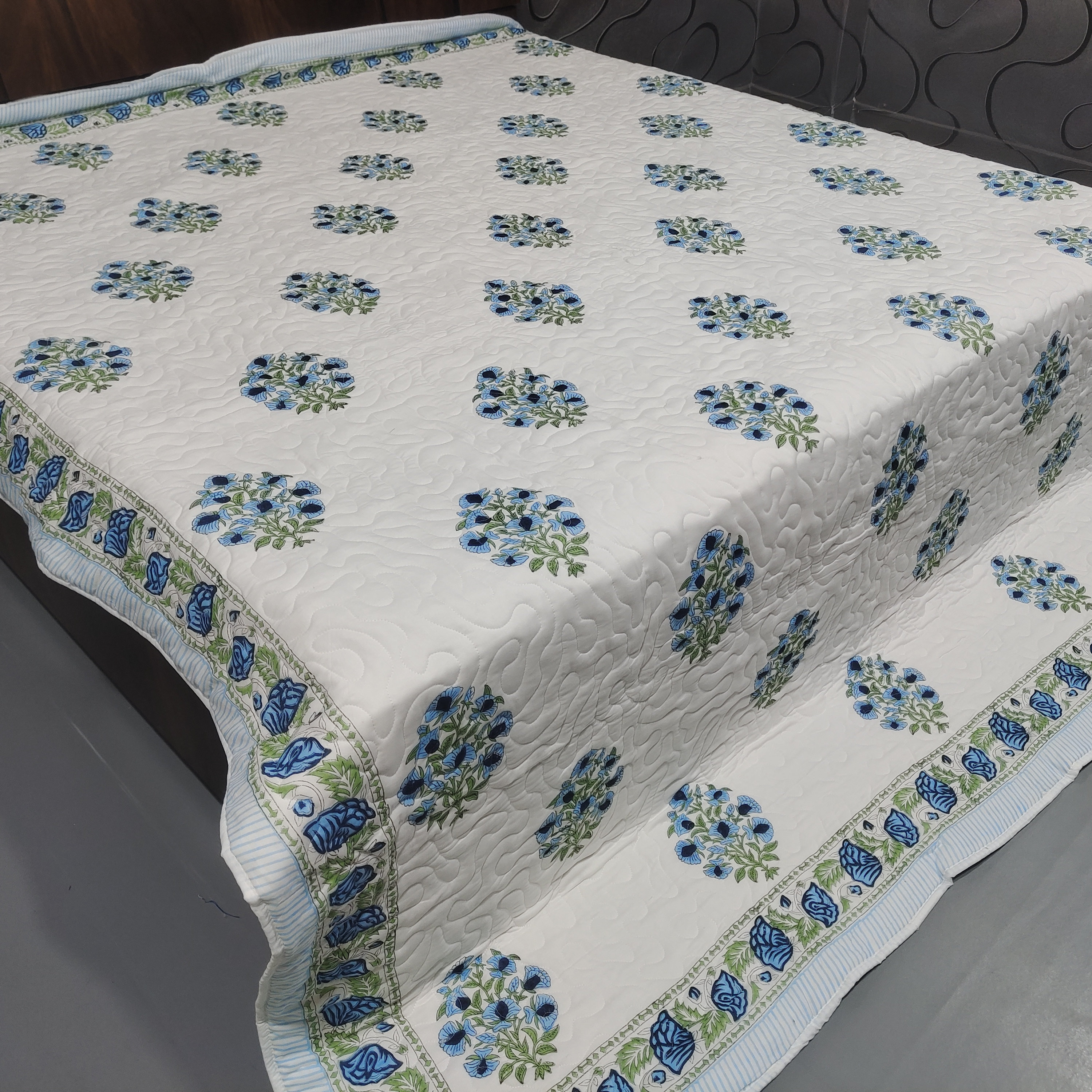One distinctive feature of this quilt is its reversible hand block print. This traditional printing technique adds a unique and artistic touch to the quilt, making it not only a functional bedding item but also a piece of aesthetic appeal. Hand block printing involves skilled artisans carving intricate designs onto wooden blocks, which are then dipped in dye and stamped onto the fabric.