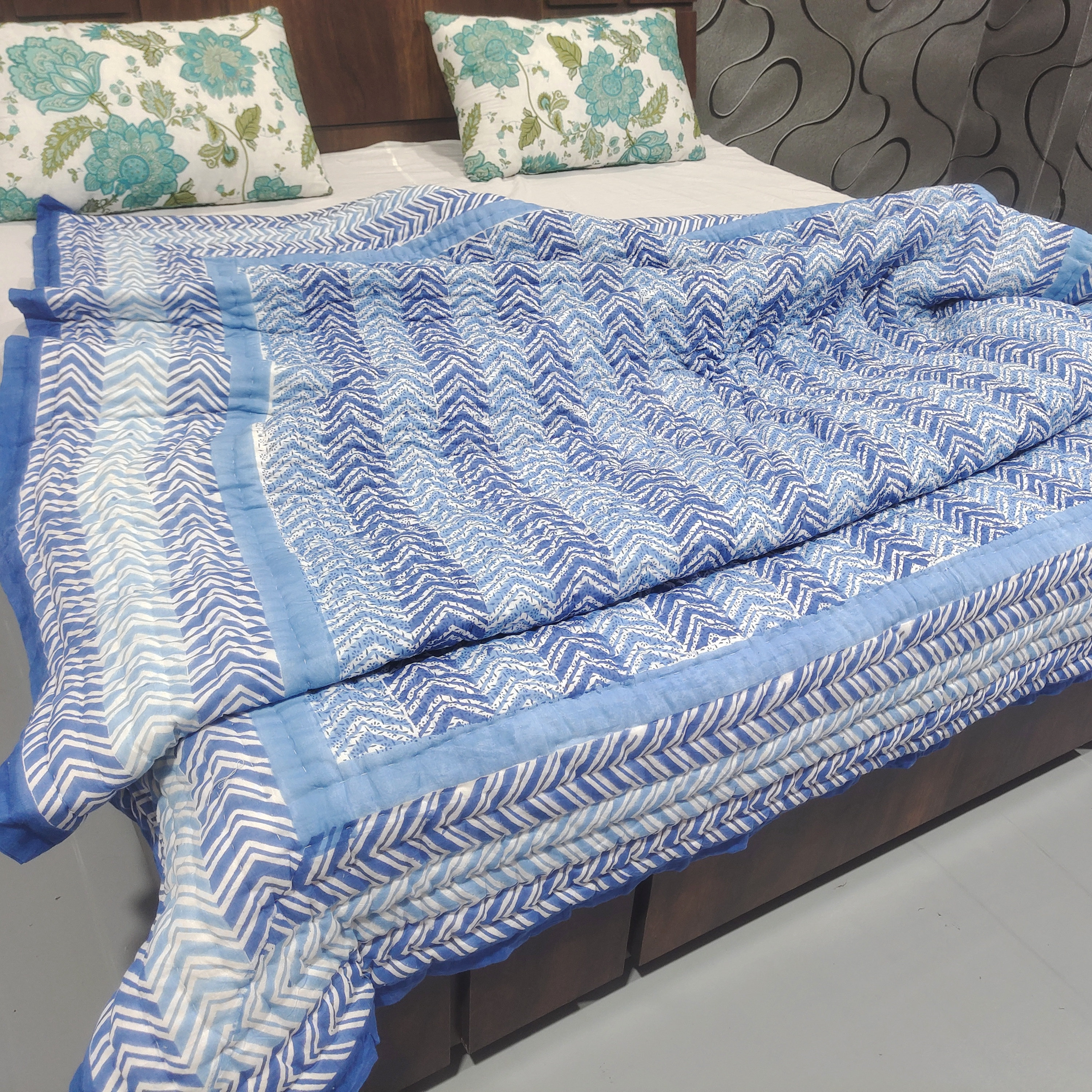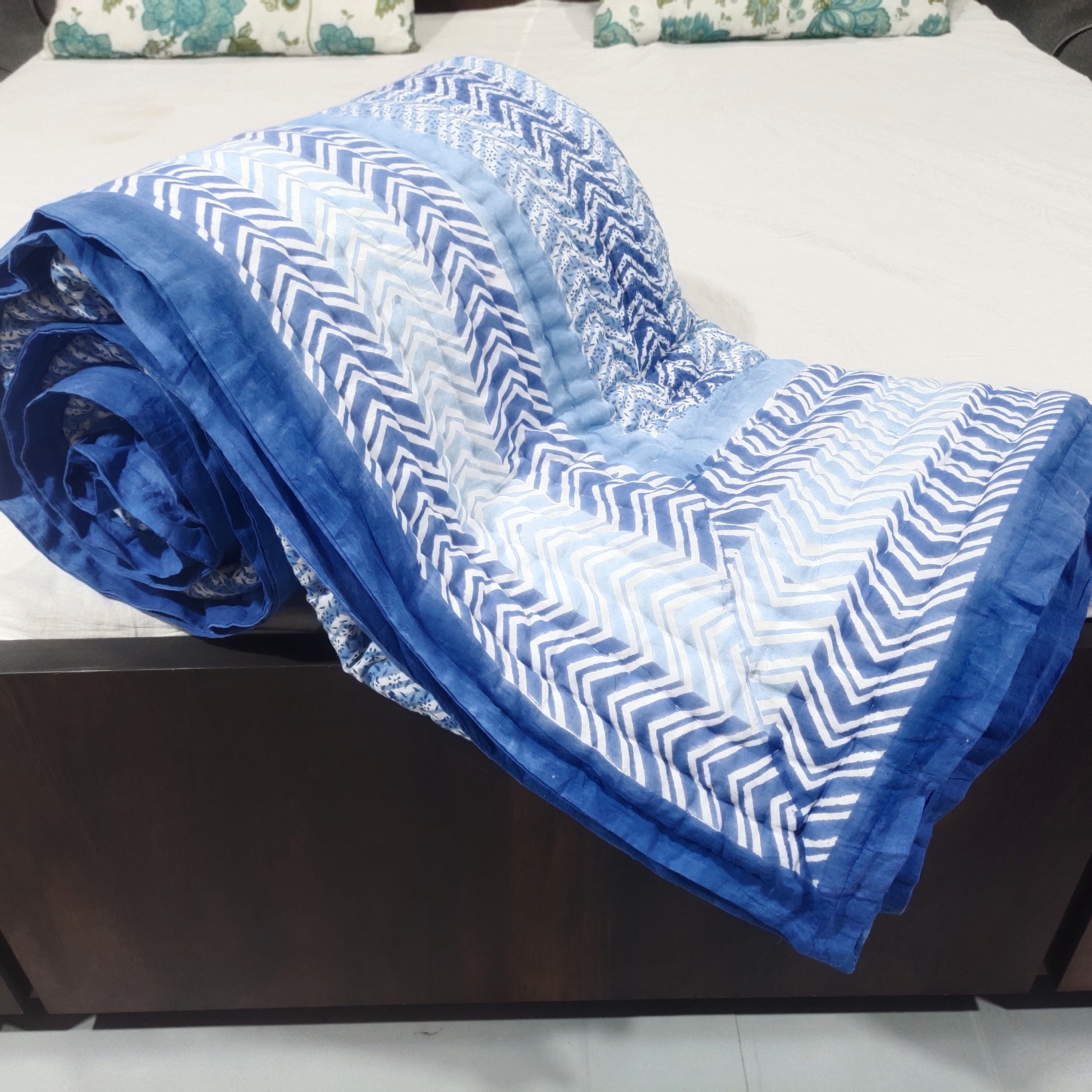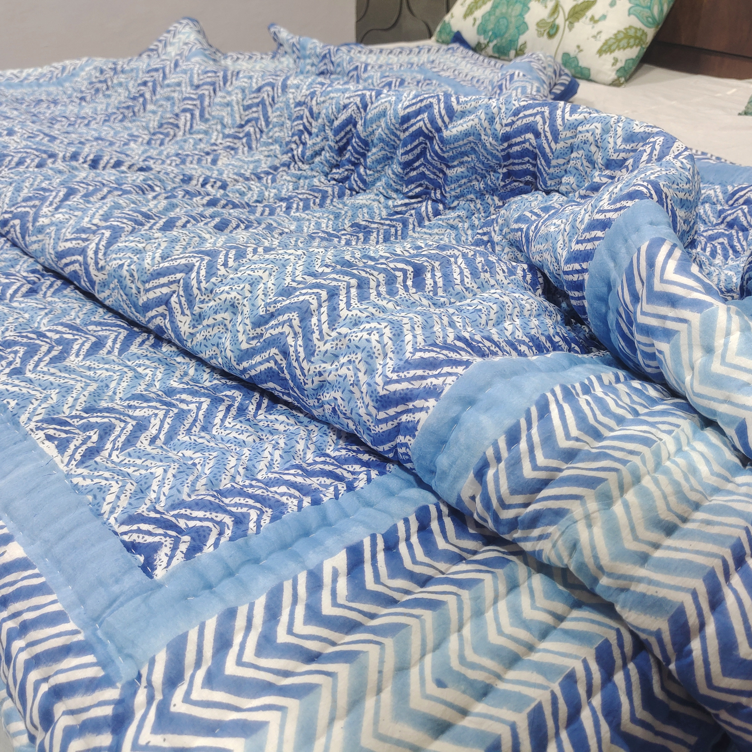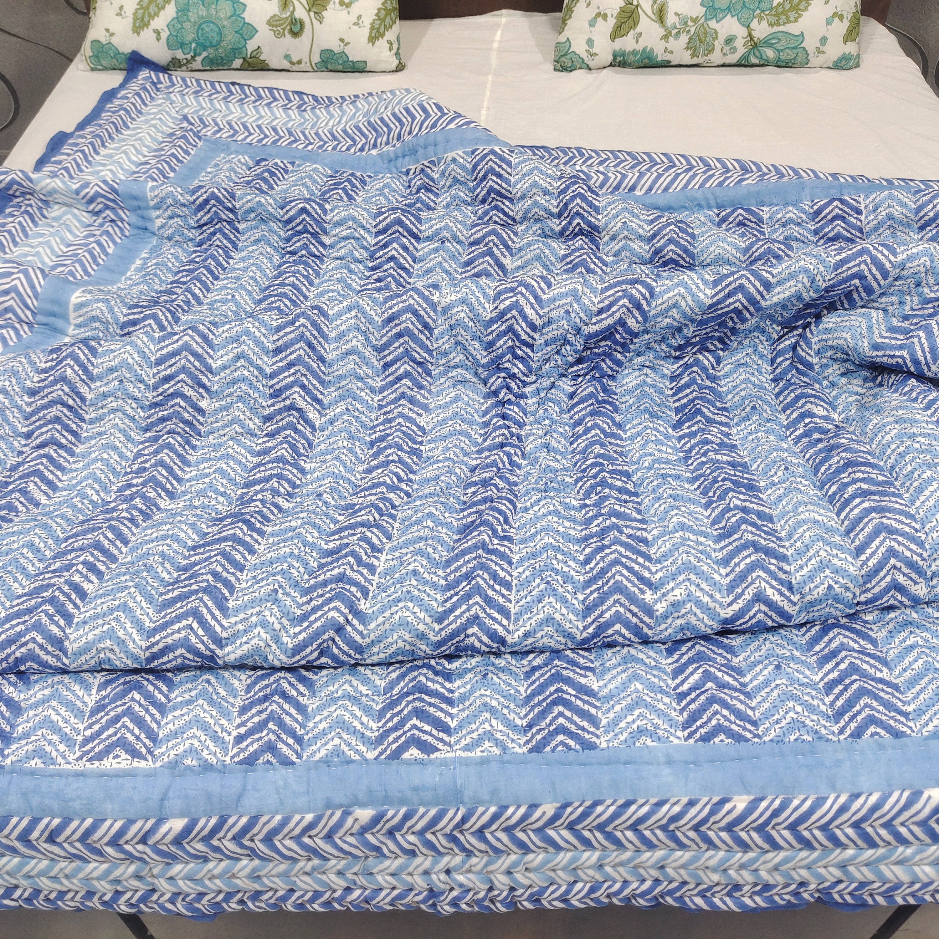 Blue Hand Block Print Cotton Quilt: Indian Boho Bedding