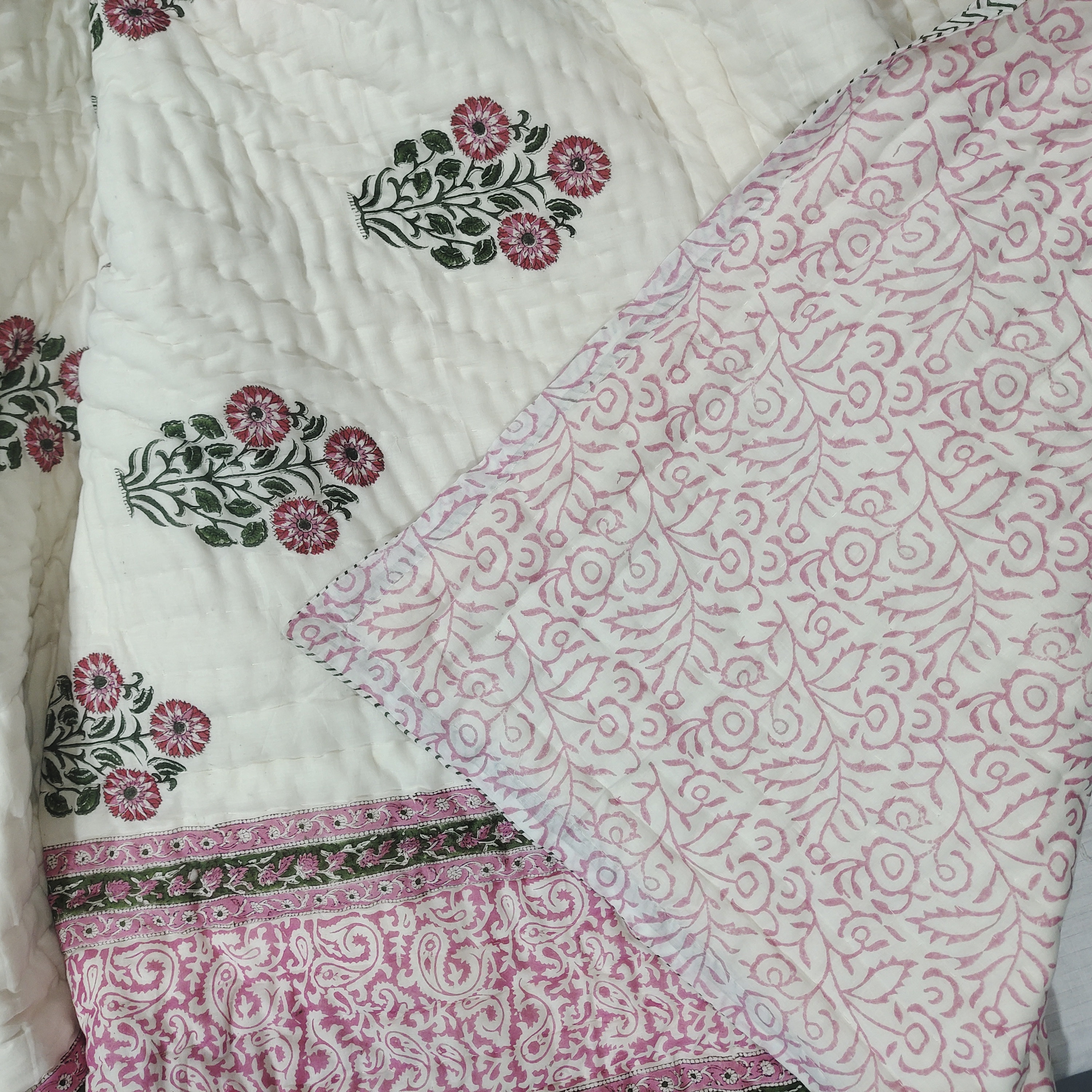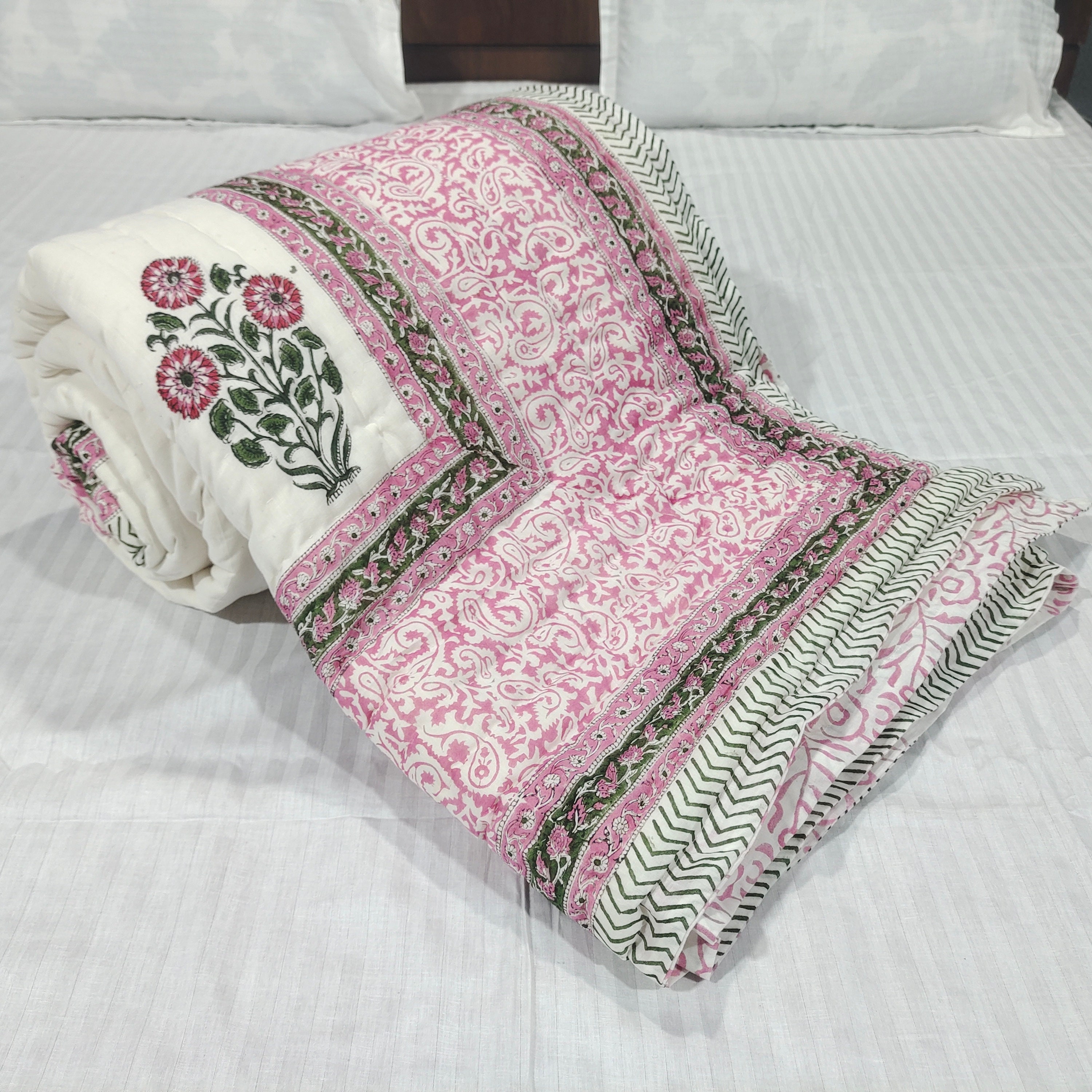 Hand Block Printed Cotton Quilt: Pink Green Floral Twin Bedspread