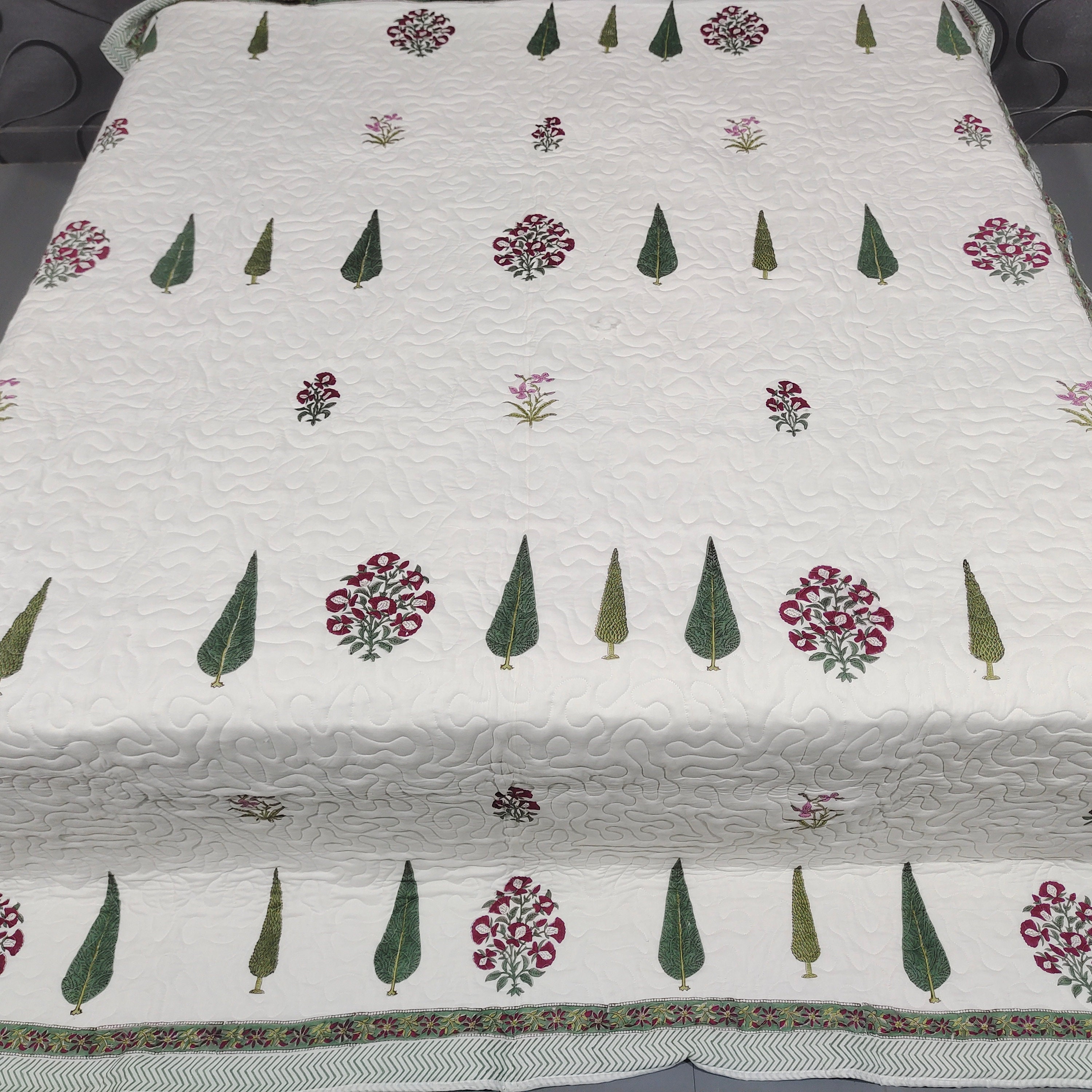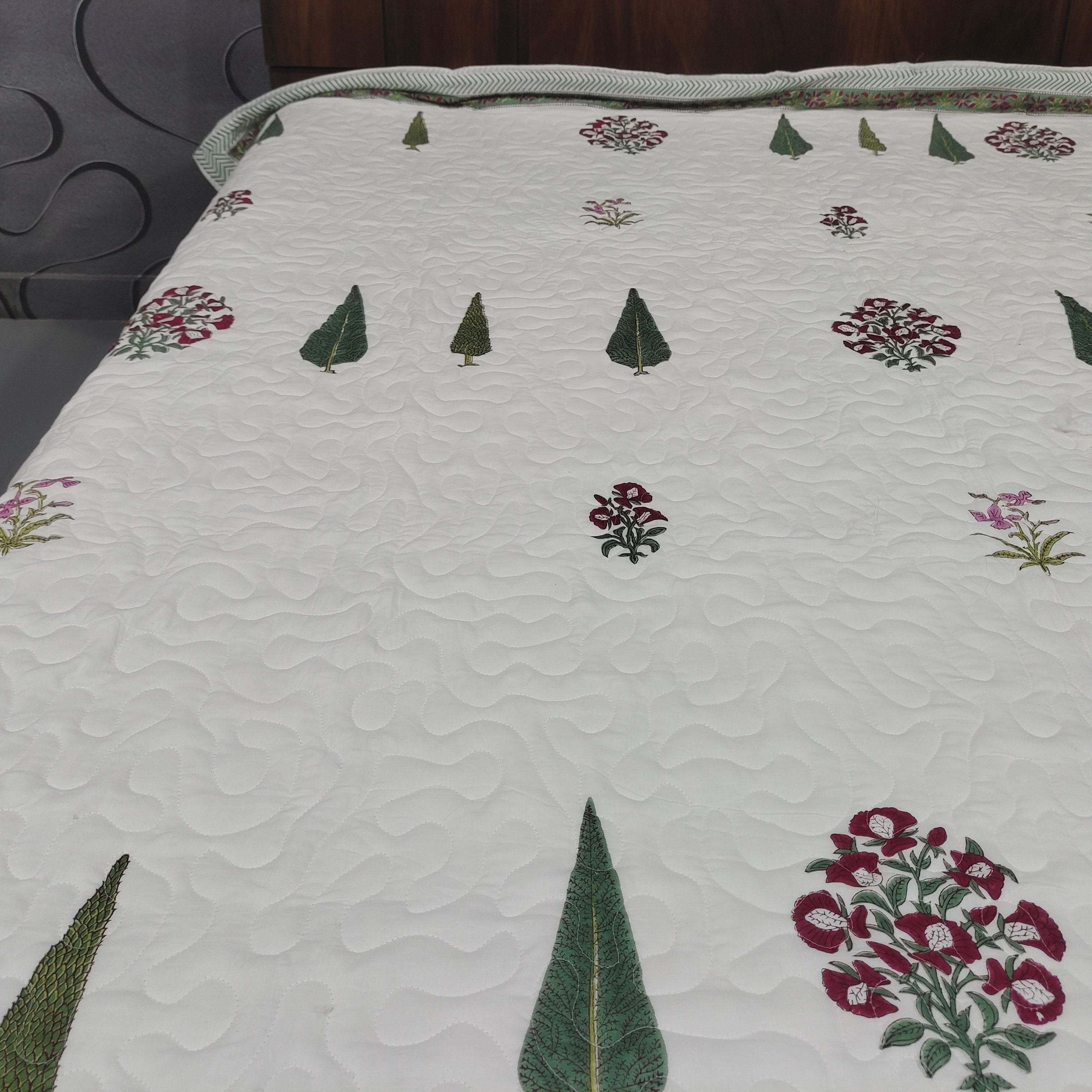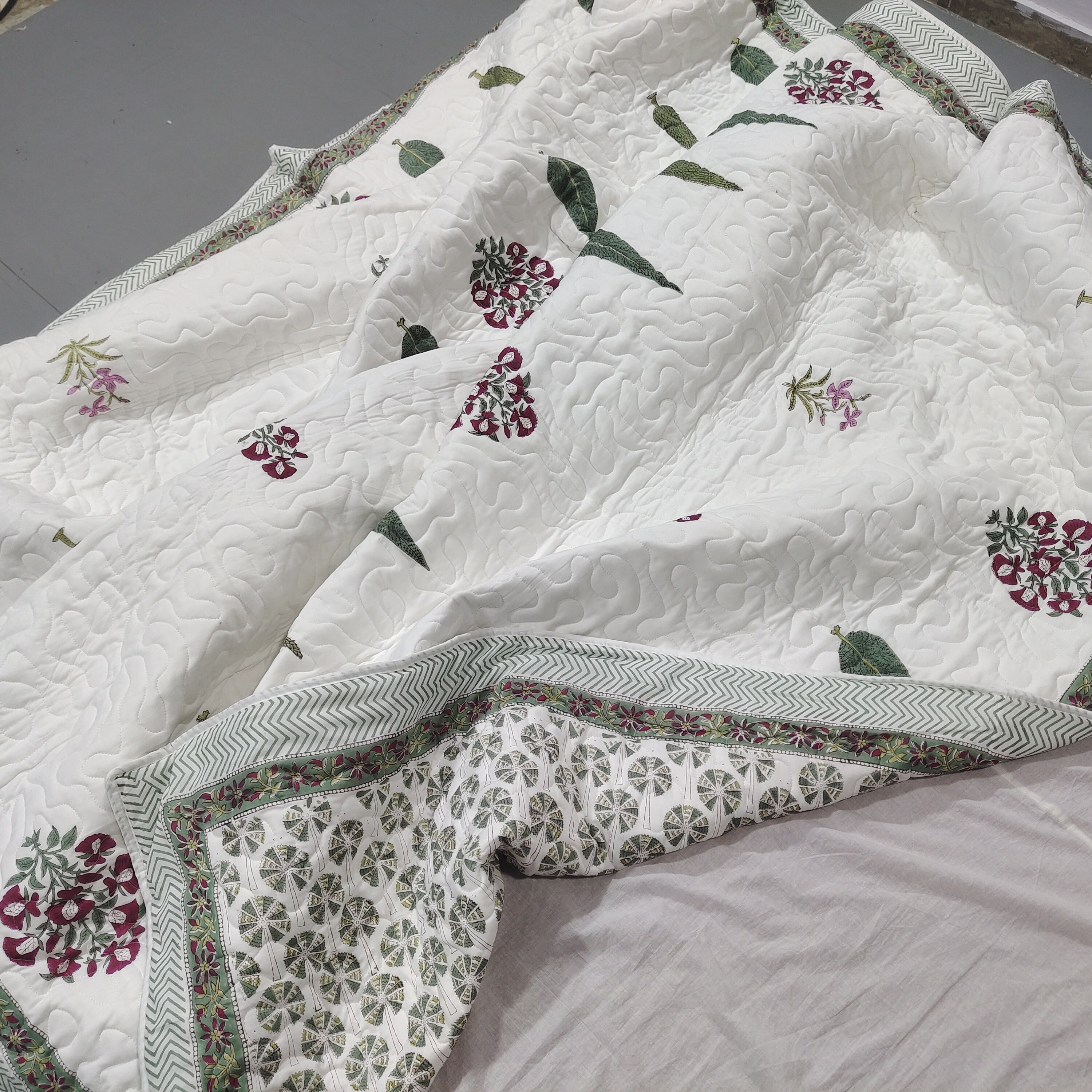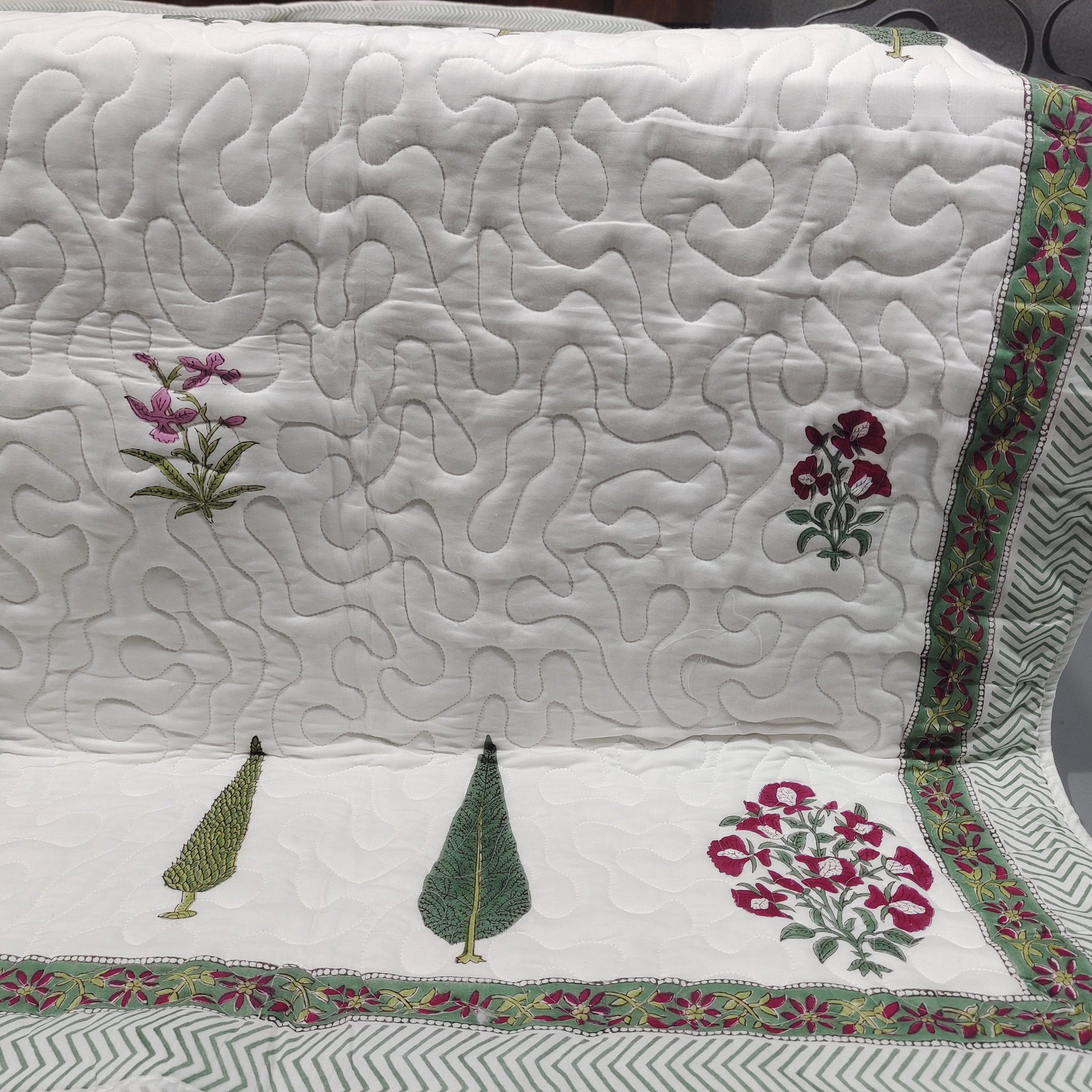 One distinctive feature of this quilt is its reversible hand block print. This traditional printing technique adds a unique and artistic touch to the quilt, making it not only a functional bedding item but also a piece of aesthetic appeal. Hand block printing involves skilled artisans carving intricate designs onto wooden blocks, which are then dipped in dye and stamped onto the fabric.