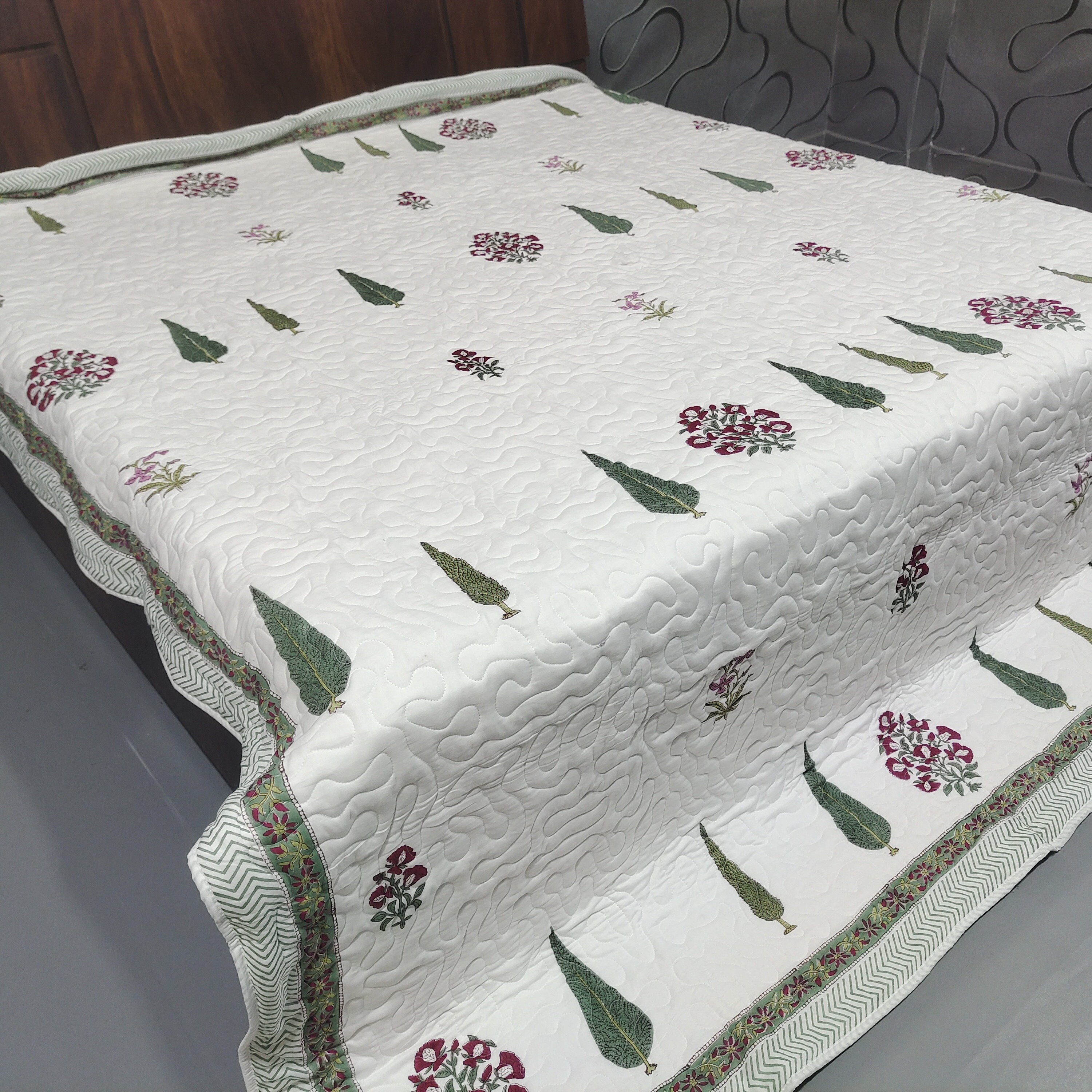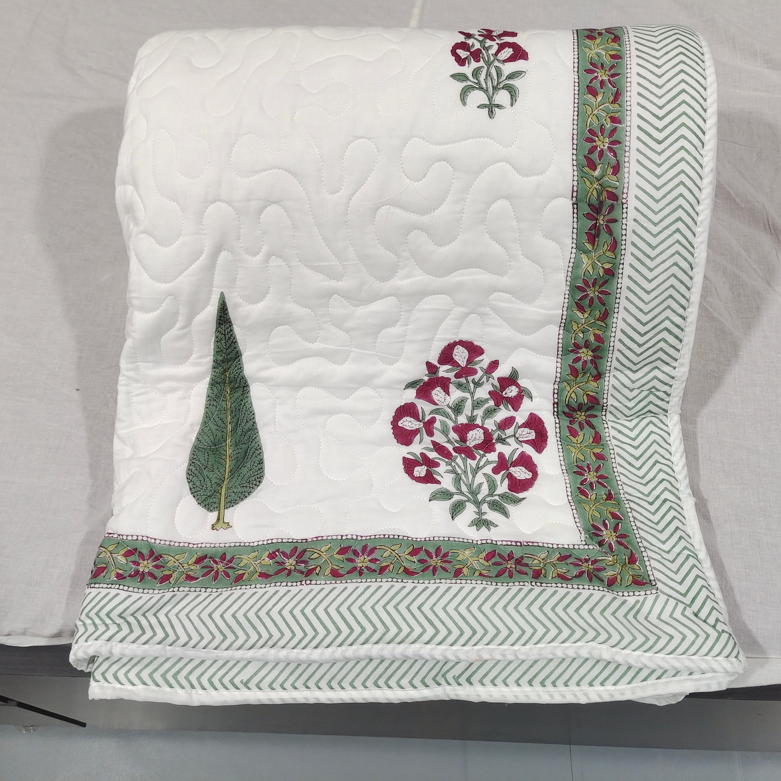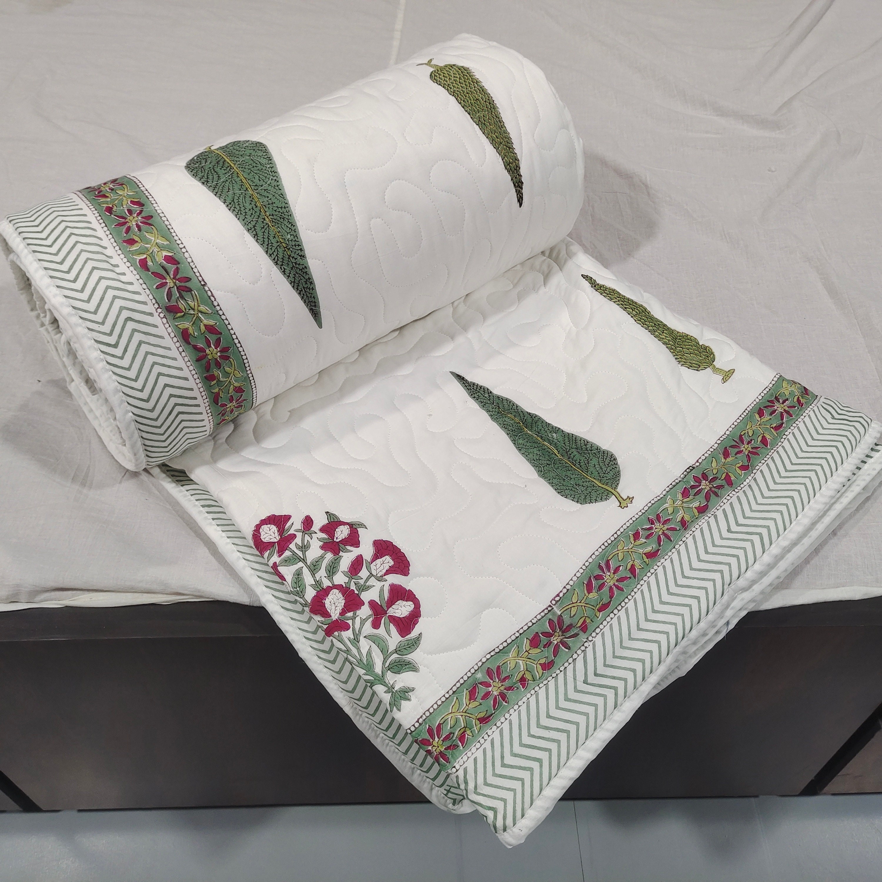 In conclusion, this machine-stitched quilt with zigzag patterns, filled with a surgical cotton sheet of 200 GSM, featuring a reversible hand block print, is a harmonious blend of craftsmanship and practicality. Its decorative elements and thoughtful construction make it a stylish yet functional addition to any bedroom. The quilt's machine washability adds a layer of convenience, ensuring that it remains a cherished and enduring part of daily lifeInternational Shipping & Customs Notice We are proud to ship our handmade cotton quilts worldwide from Jaipur, India. Please be advised: