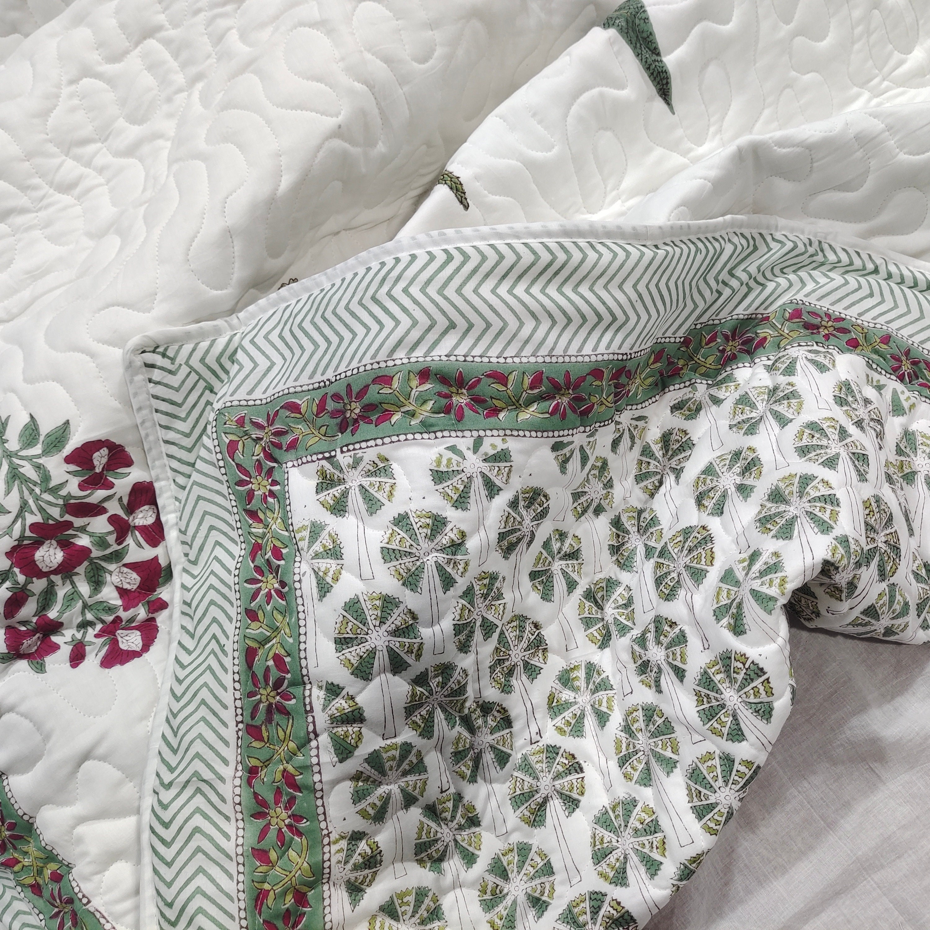 The reversible nature of the hand block print adds versatility to the quilt, allowing users to change the look and feel of their bedding with a simple flip. This dual-sided design extends the life and aesthetic appeal of the quilt, offering flexibility in bedroom decor.