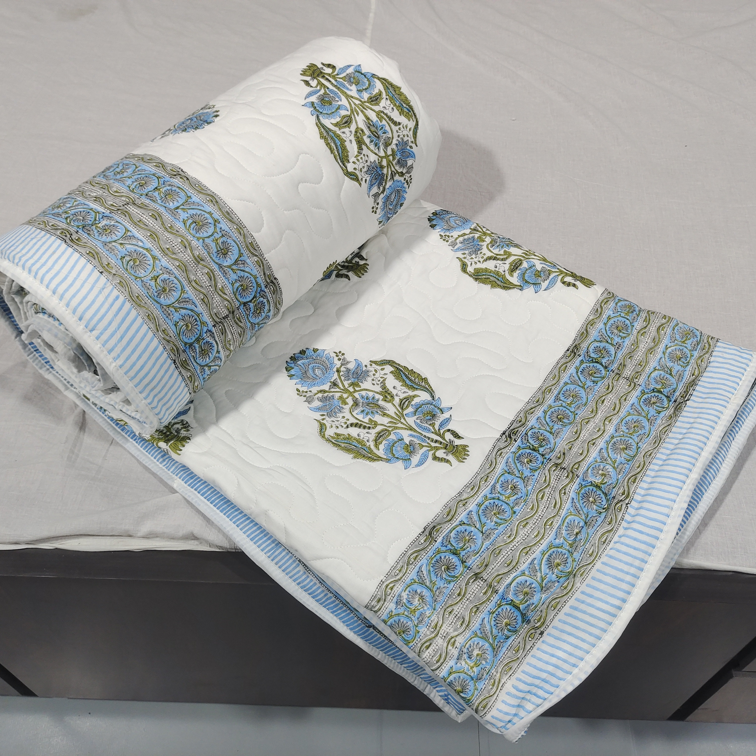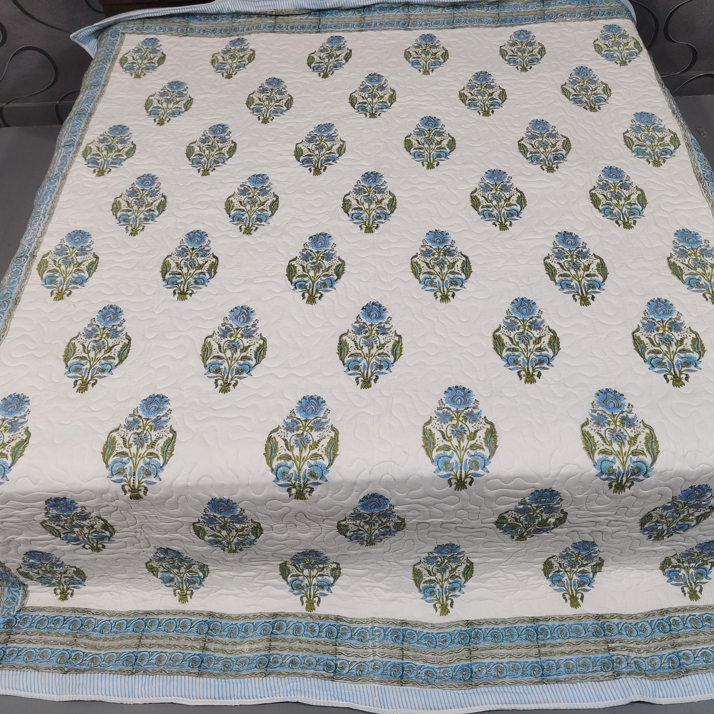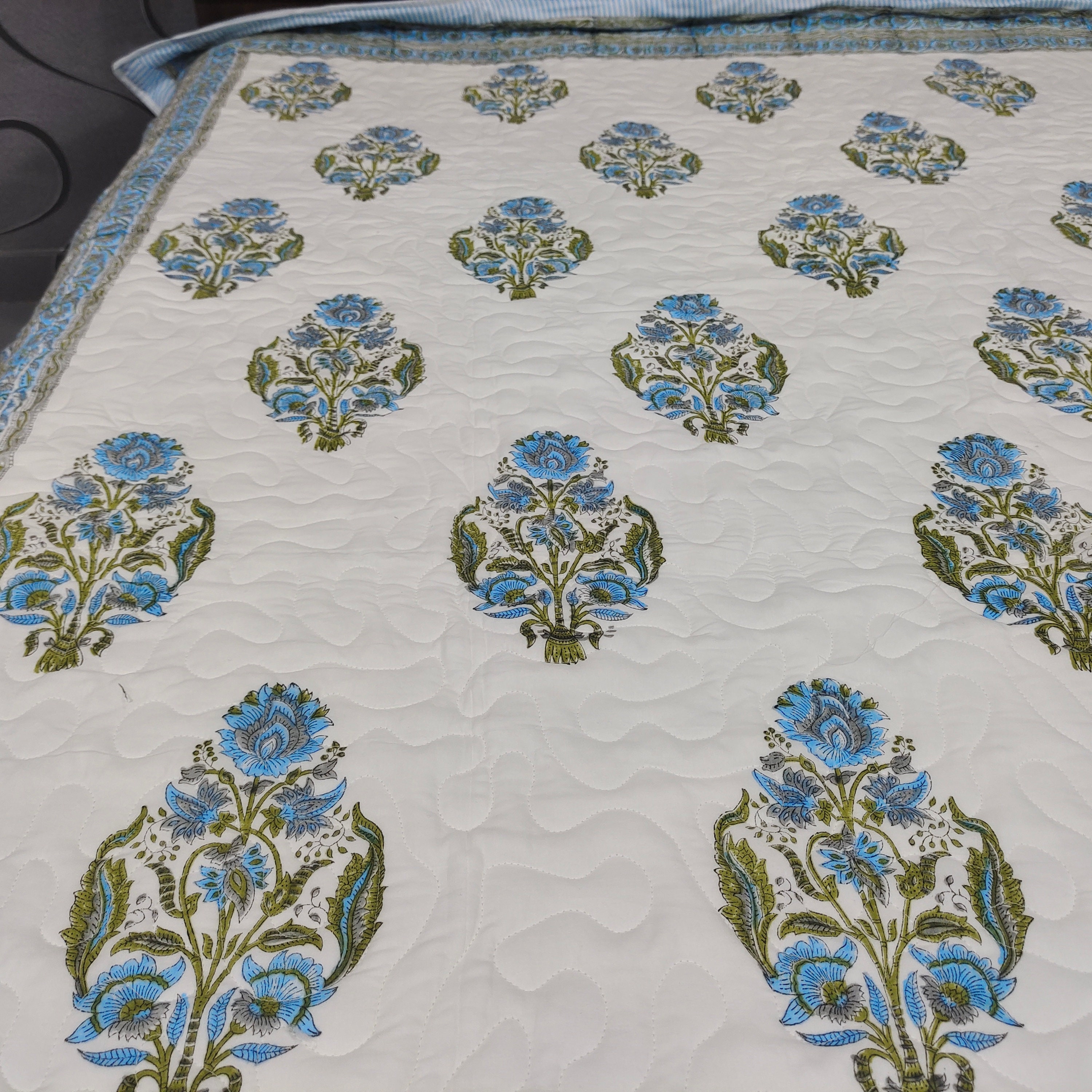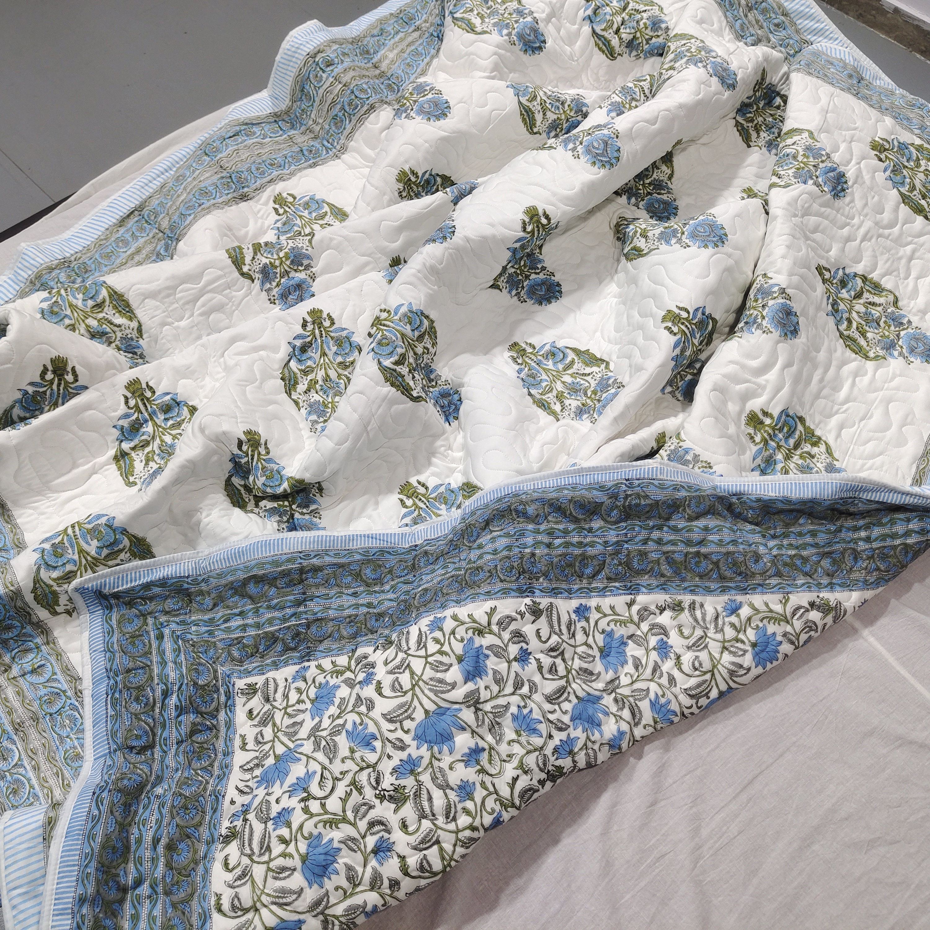 One distinctive feature of this quilt is its reversible hand block print. This traditional printing technique adds a unique and artistic touch to the quilt, making it not only a functional bedding item but also a piece of aesthetic appeal. Hand block printing involves skilled artisans carving intricate designs onto wooden blocks, which are then dipped in dye and stamped onto the fabric.