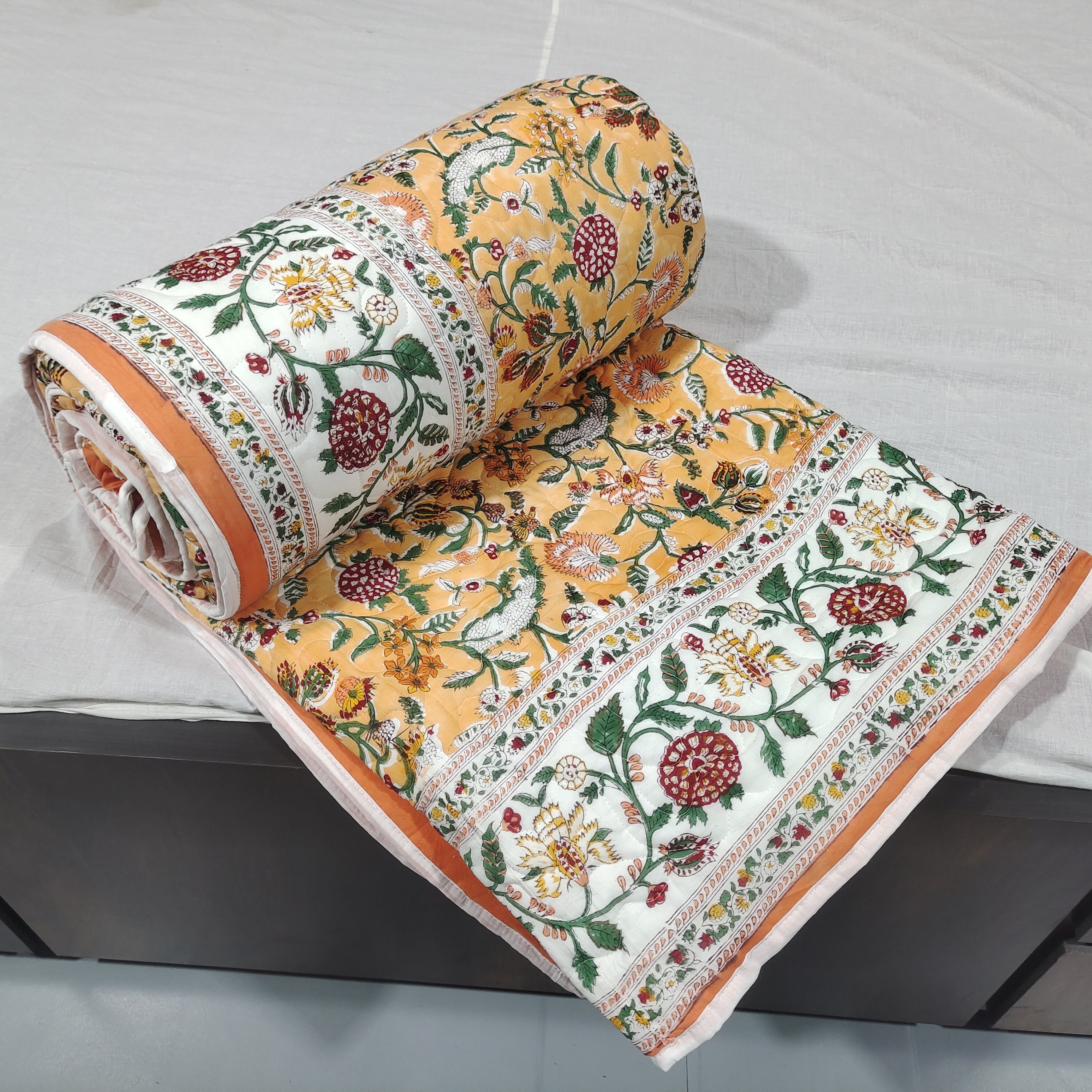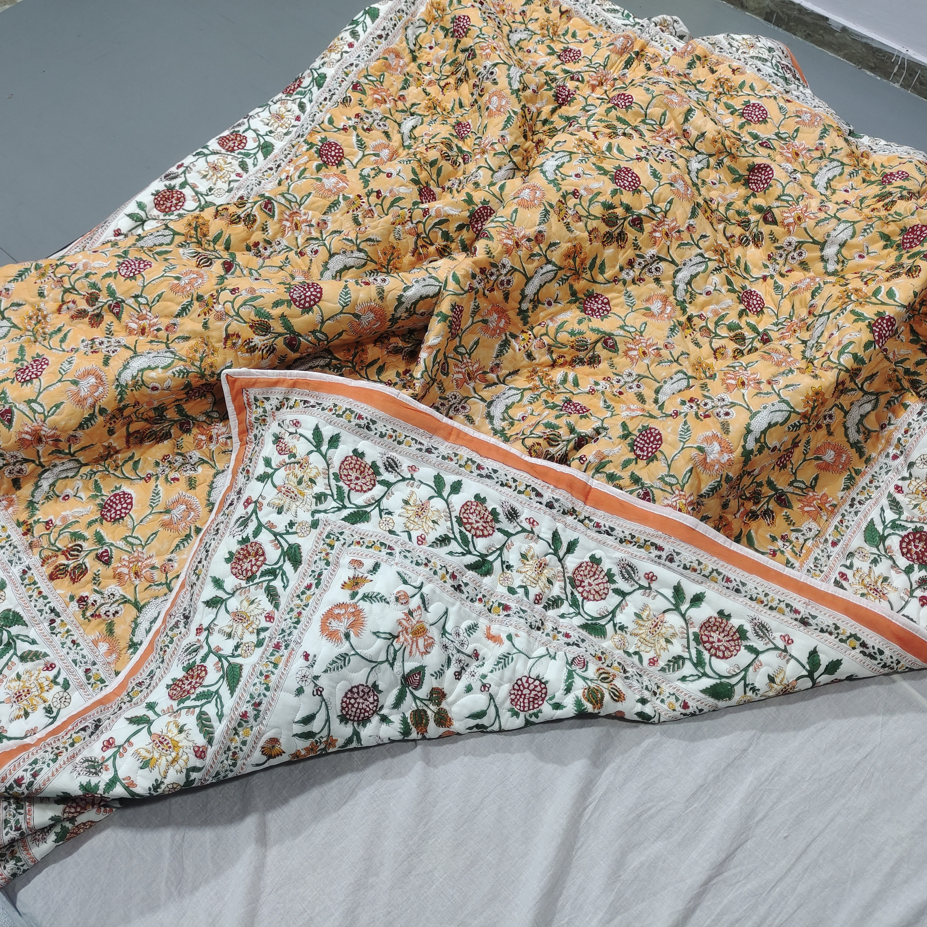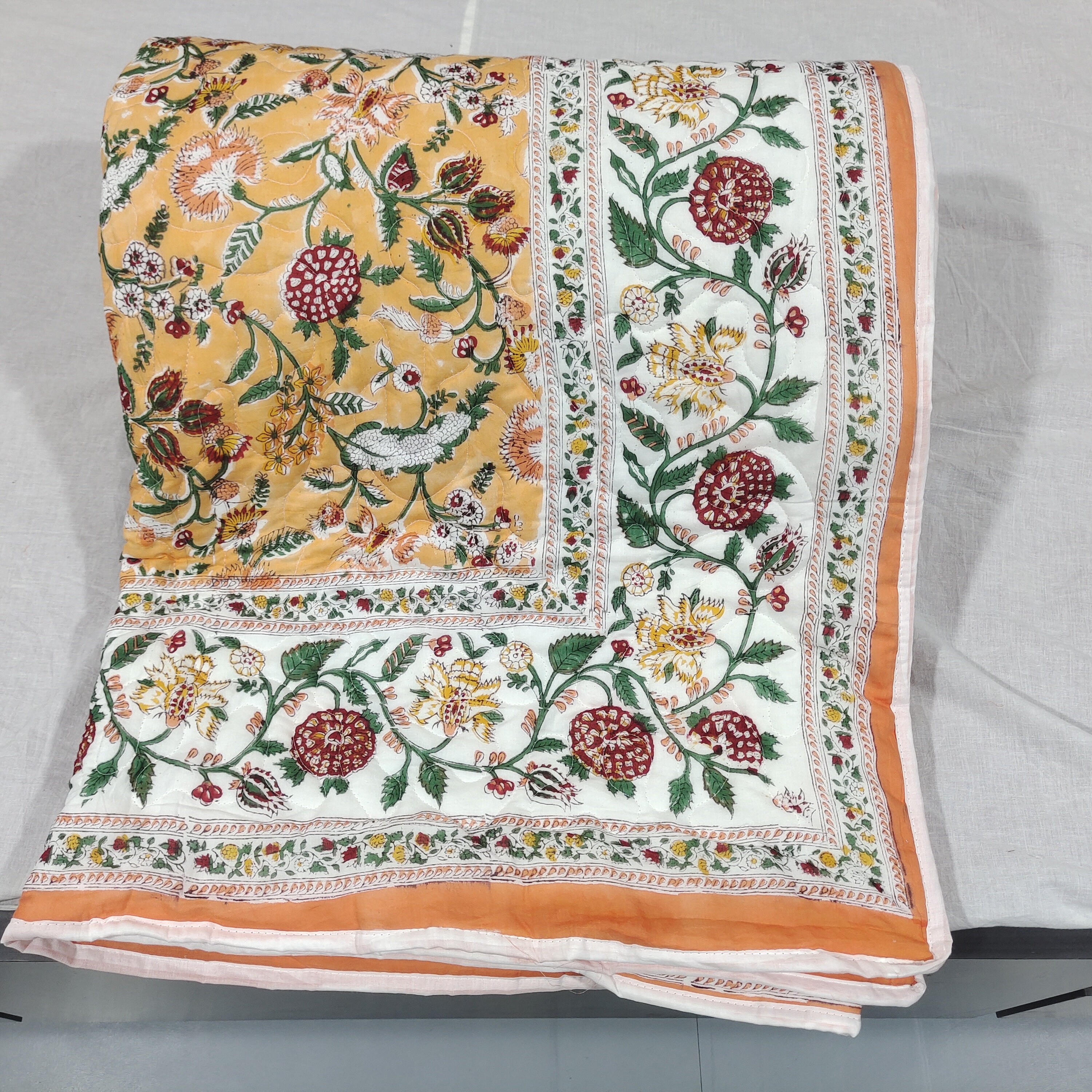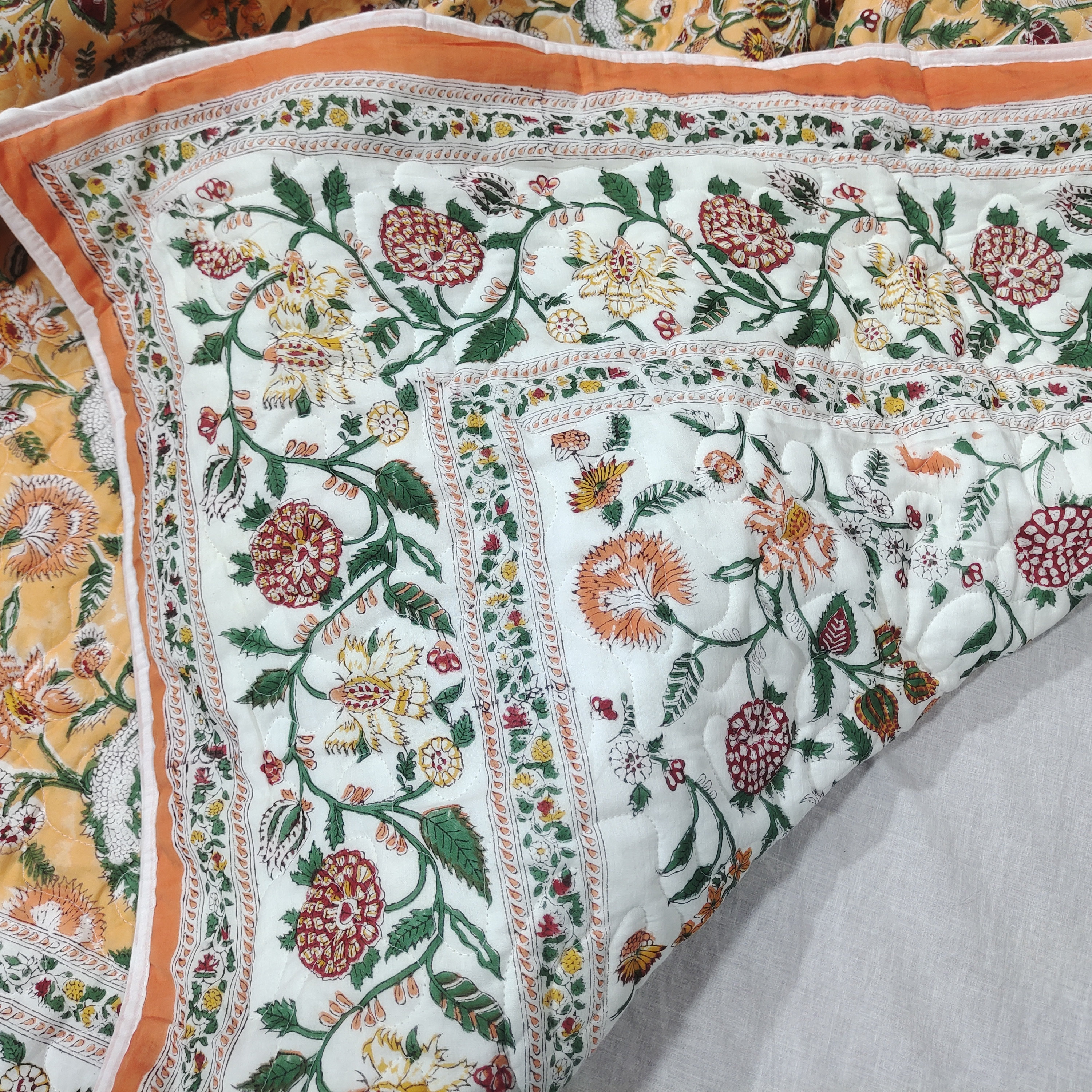 One distinctive feature of this quilt is its reversible hand block print. This traditional printing technique adds a unique and artistic touch to the quilt, making it not only a functional bedding item but also a piece of aesthetic appeal. Hand block printing involves skilled artisans carving intricate designs onto wooden blocks, which are then dipped in dye and stamped onto the fabric.