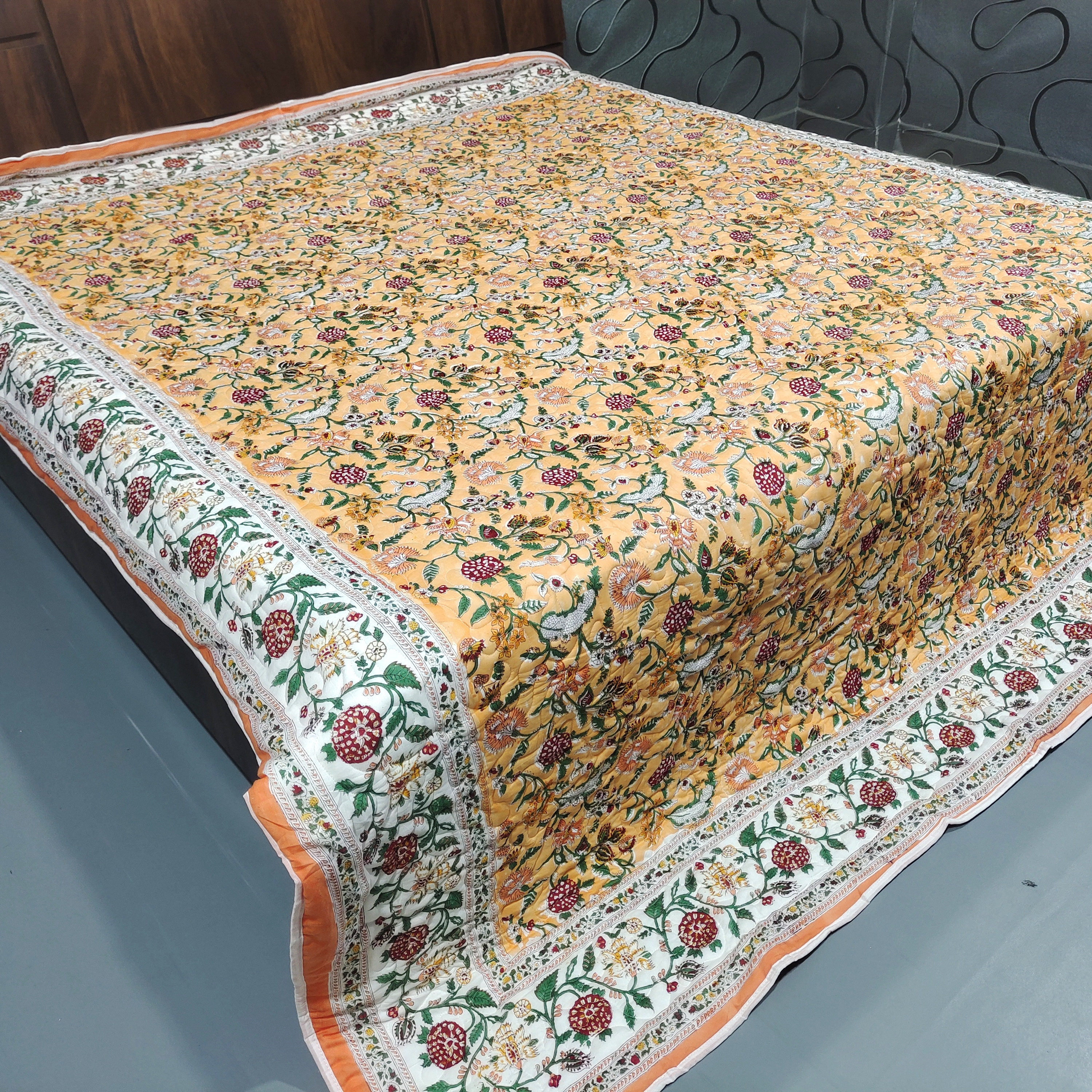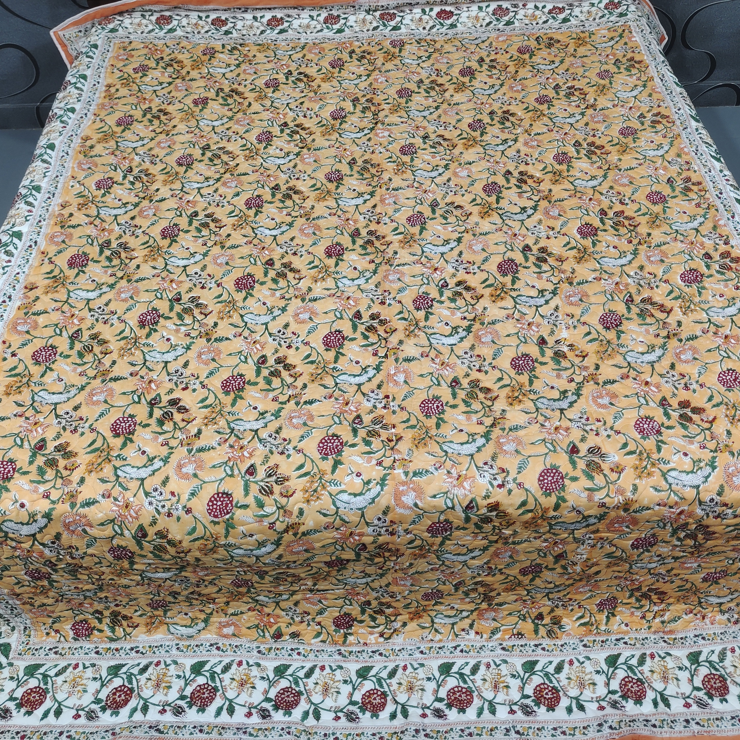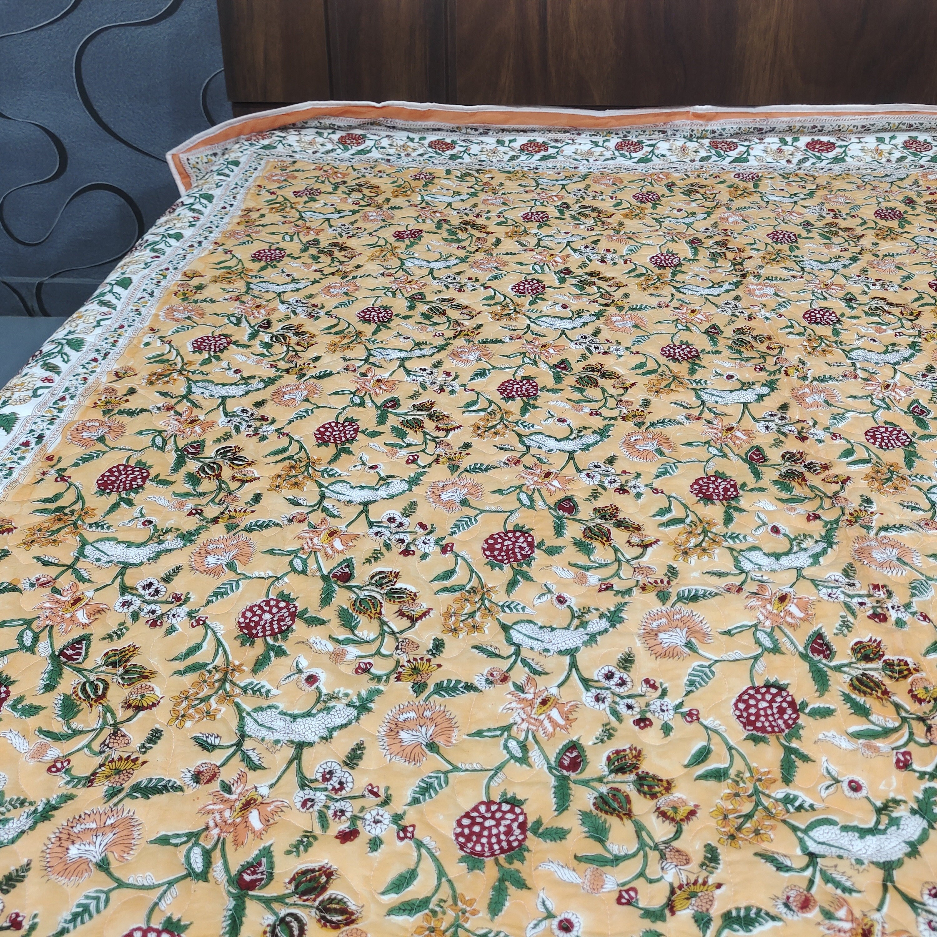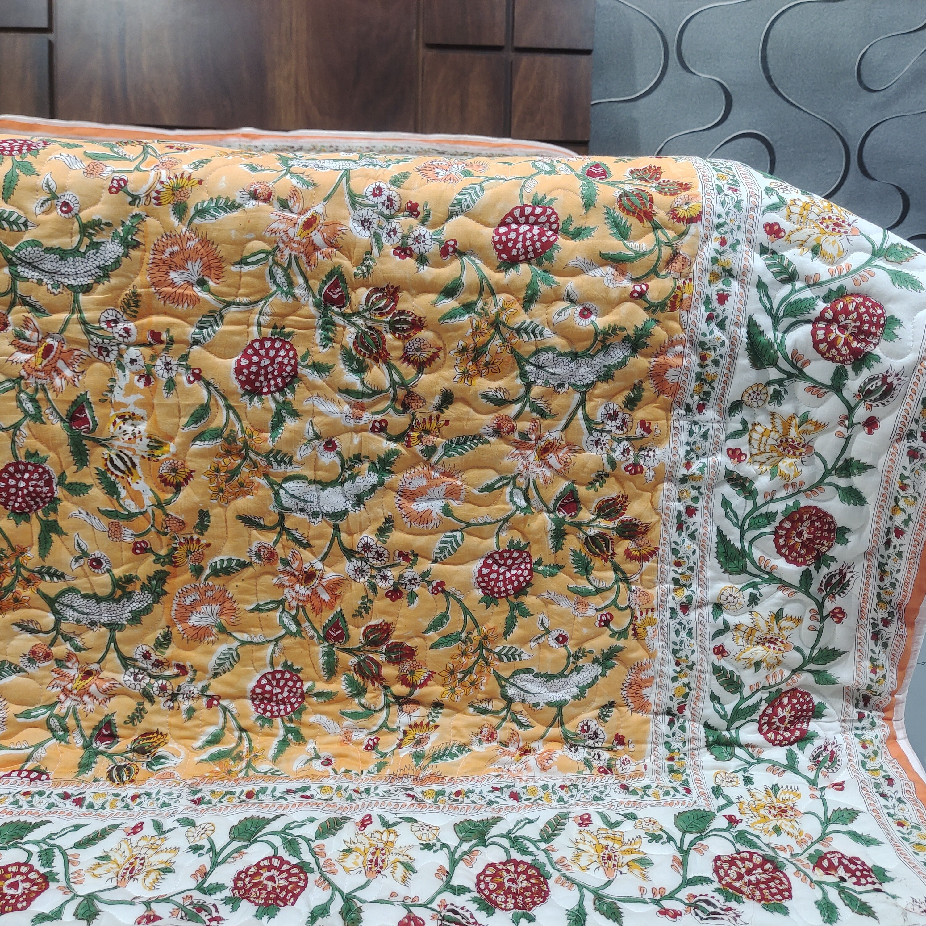 One distinctive feature of this quilt is its reversible hand block print. This traditional printing technique adds a unique and artistic touch to the quilt, making it not only a functional bedding item but also a piece of aesthetic appeal. Hand block printing involves skilled artisans carving intricate designs onto wooden blocks, which are then dipped in dye and stamped onto the fabric.