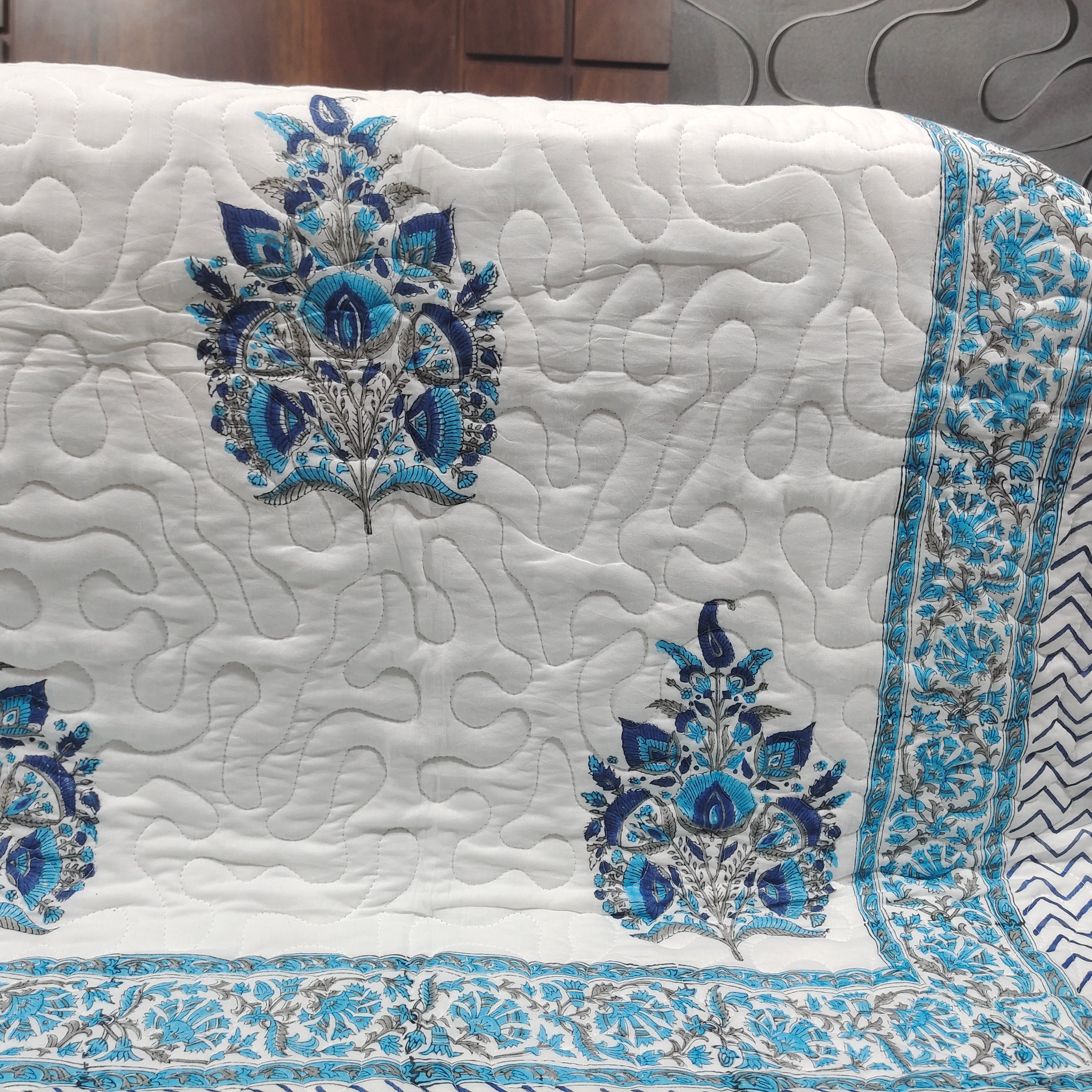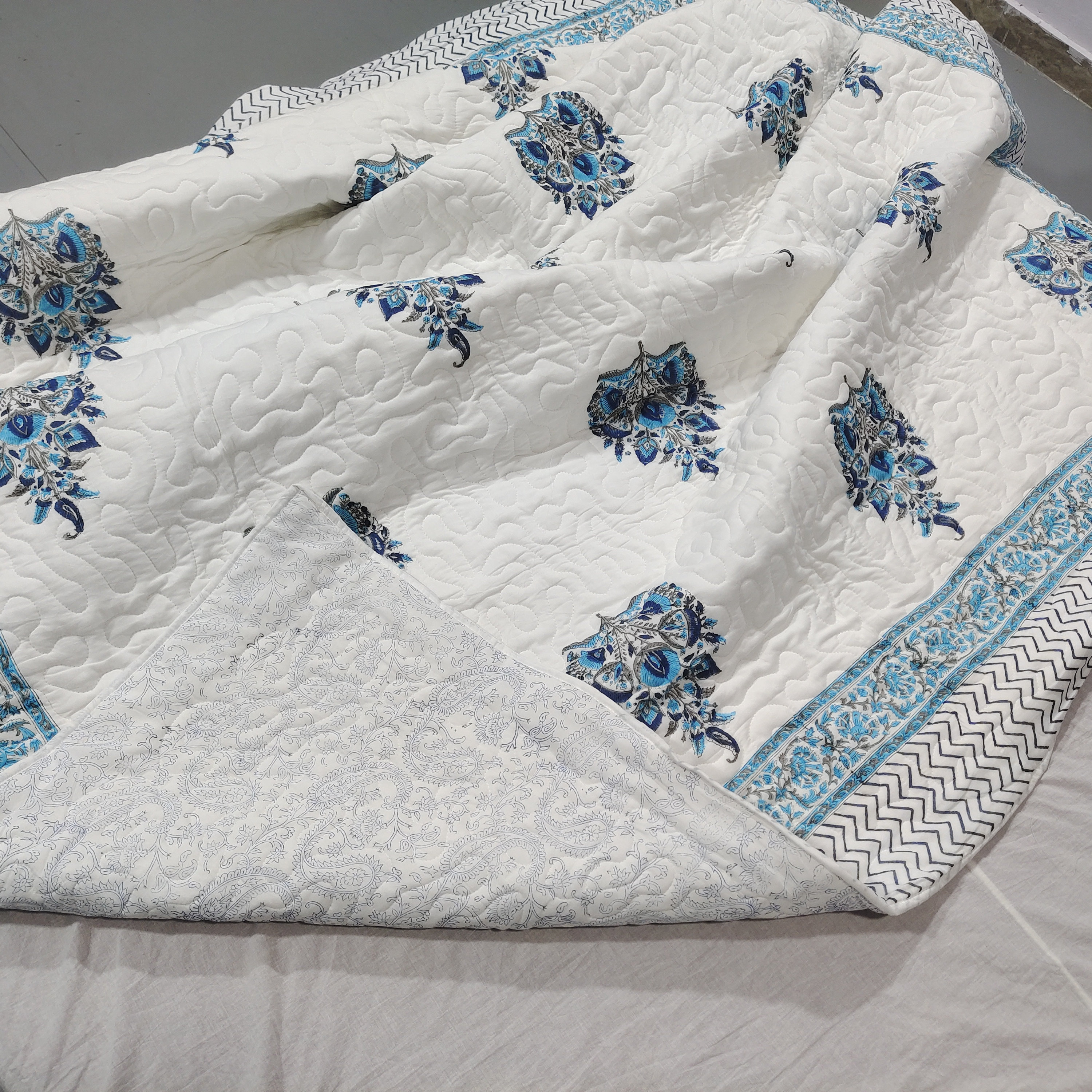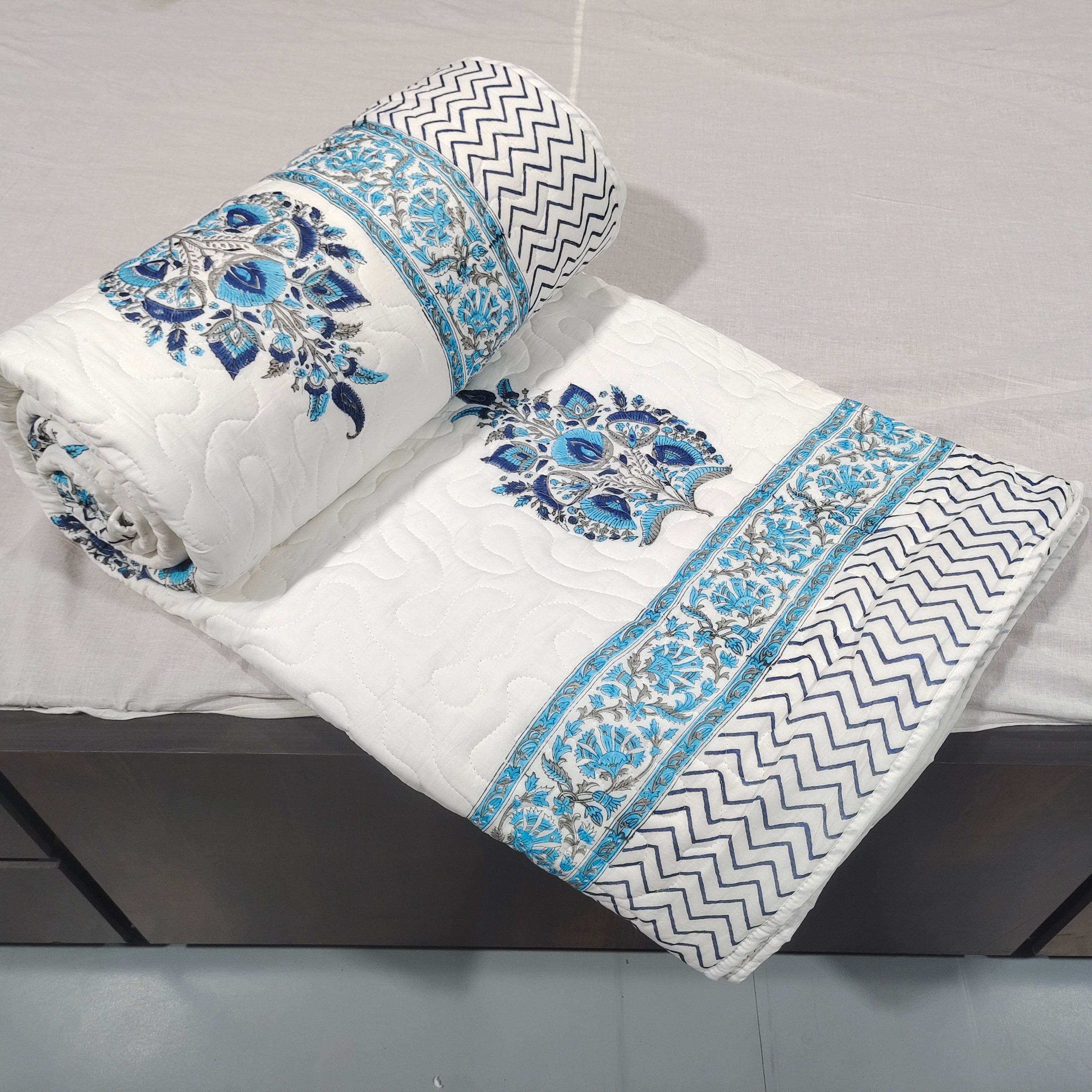 One distinctive feature of this quilt is its reversible hand block print. This traditional printing technique adds a unique and artistic touch to the quilt, making it not only a functional bedding item but also a piece of aesthetic appeal. Hand block printing involves skilled artisans carving intricate designs onto wooden blocks, which are then dipped in dye and stamped onto the fabric.
