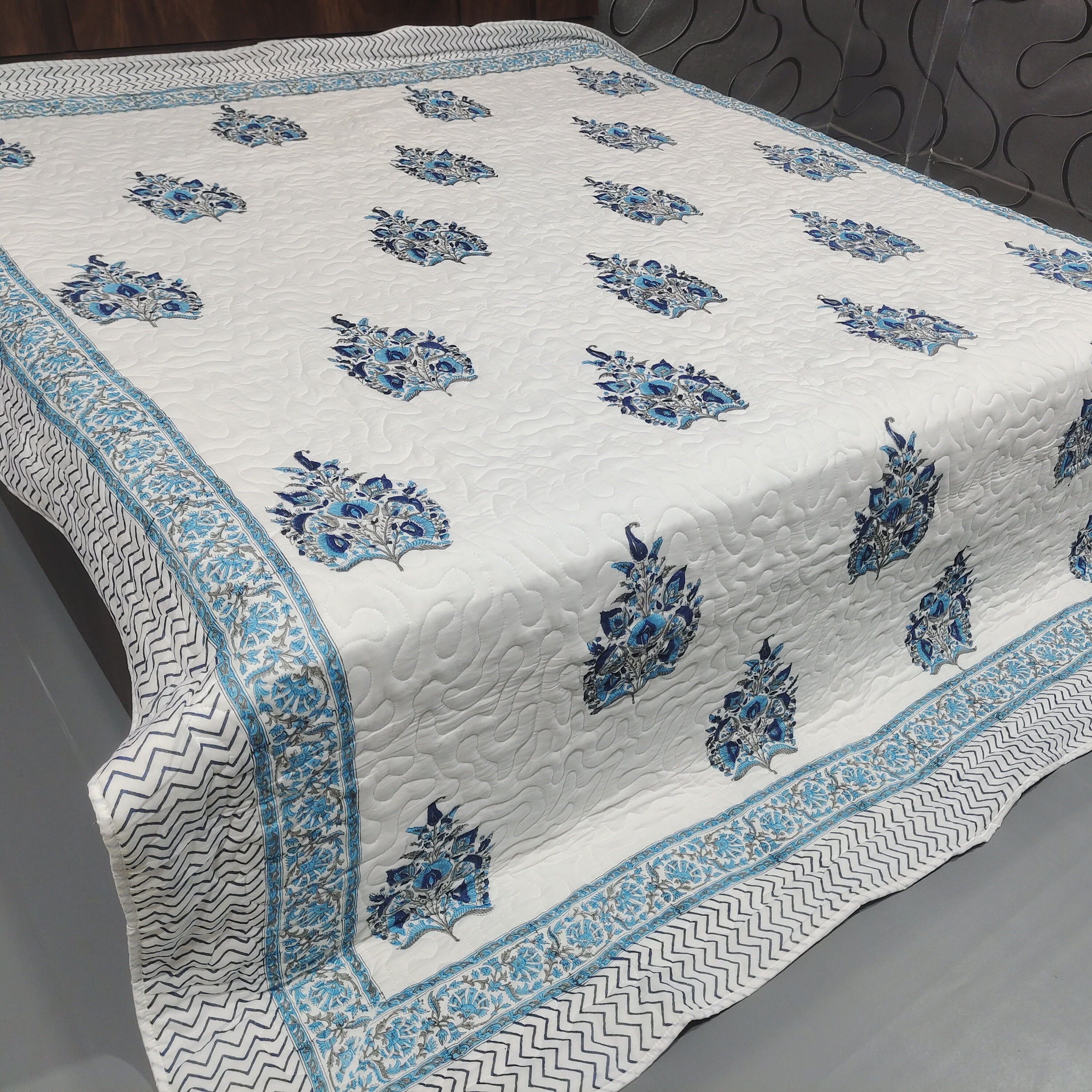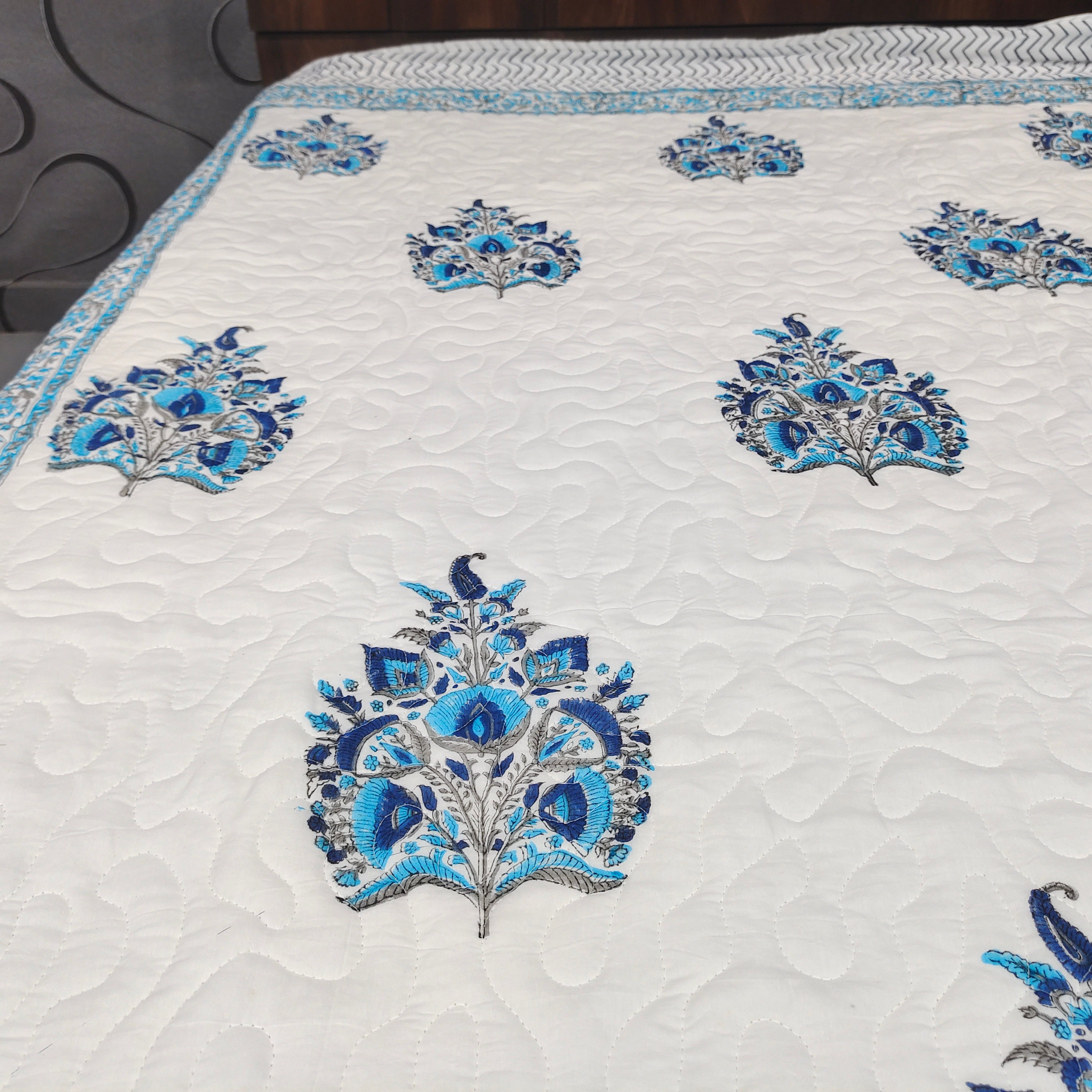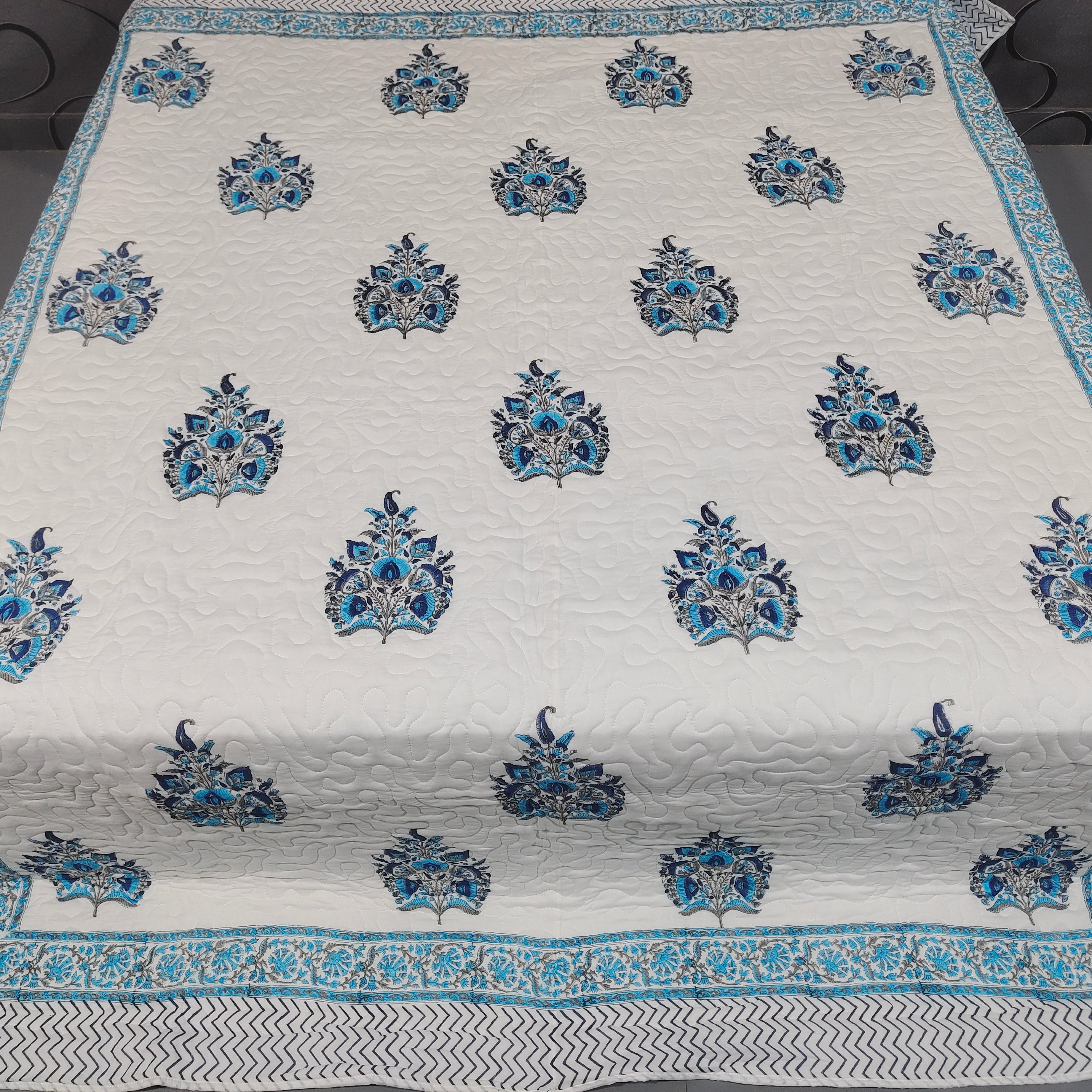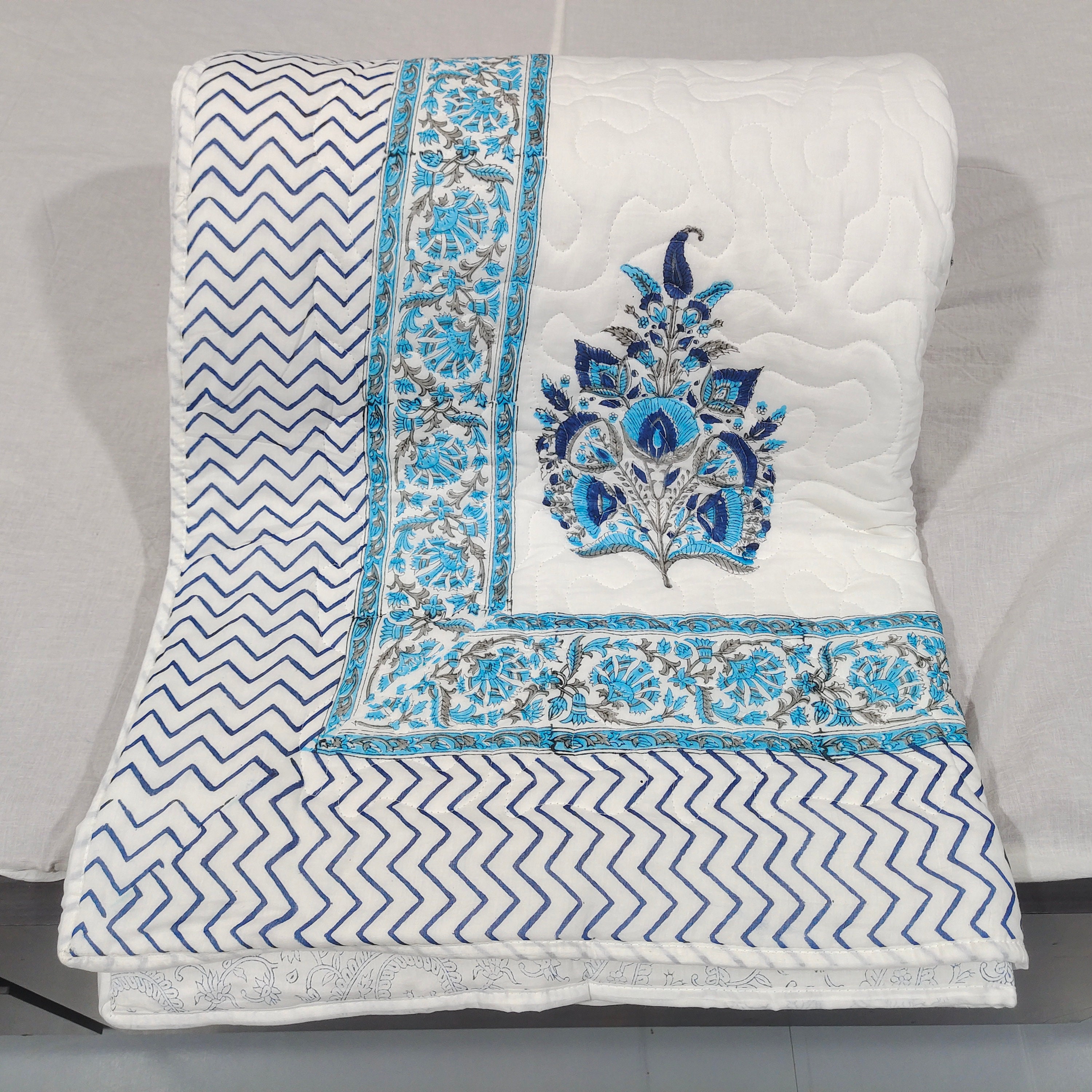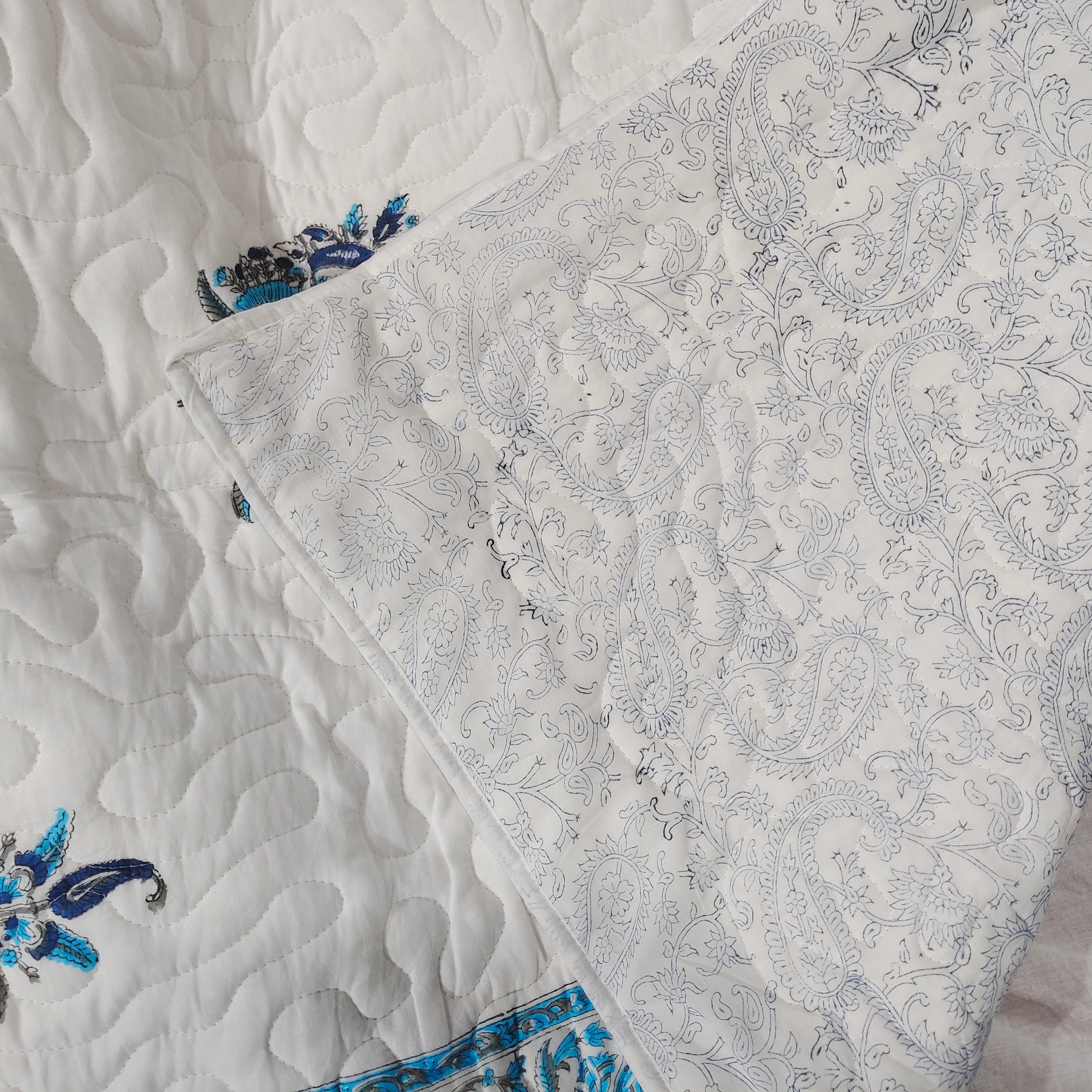 Blue Hand Block Print Quilt: Reversible Indian Bedspread