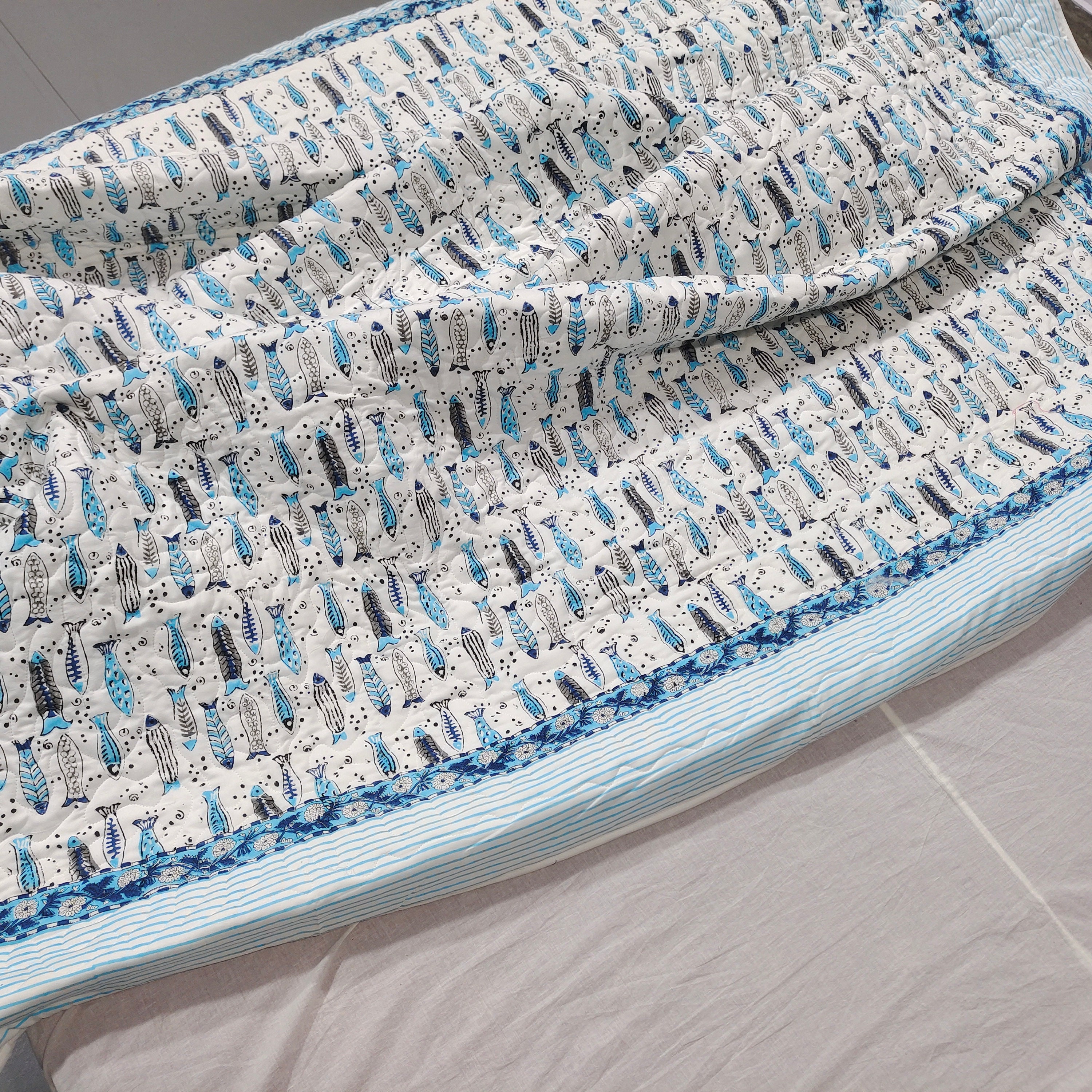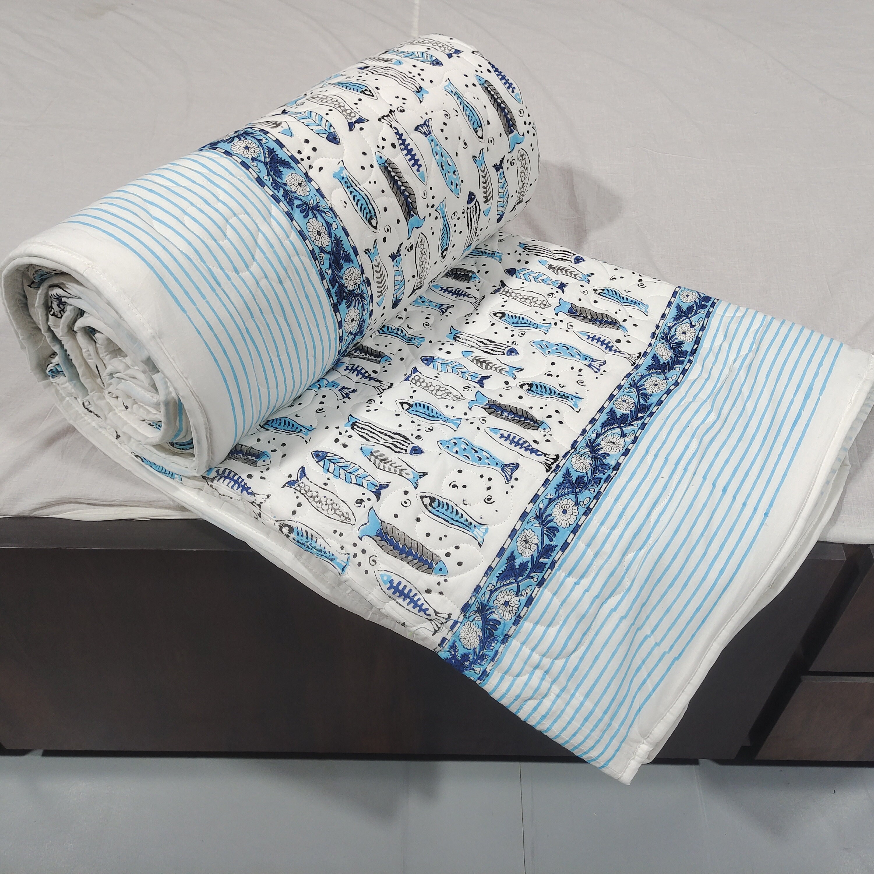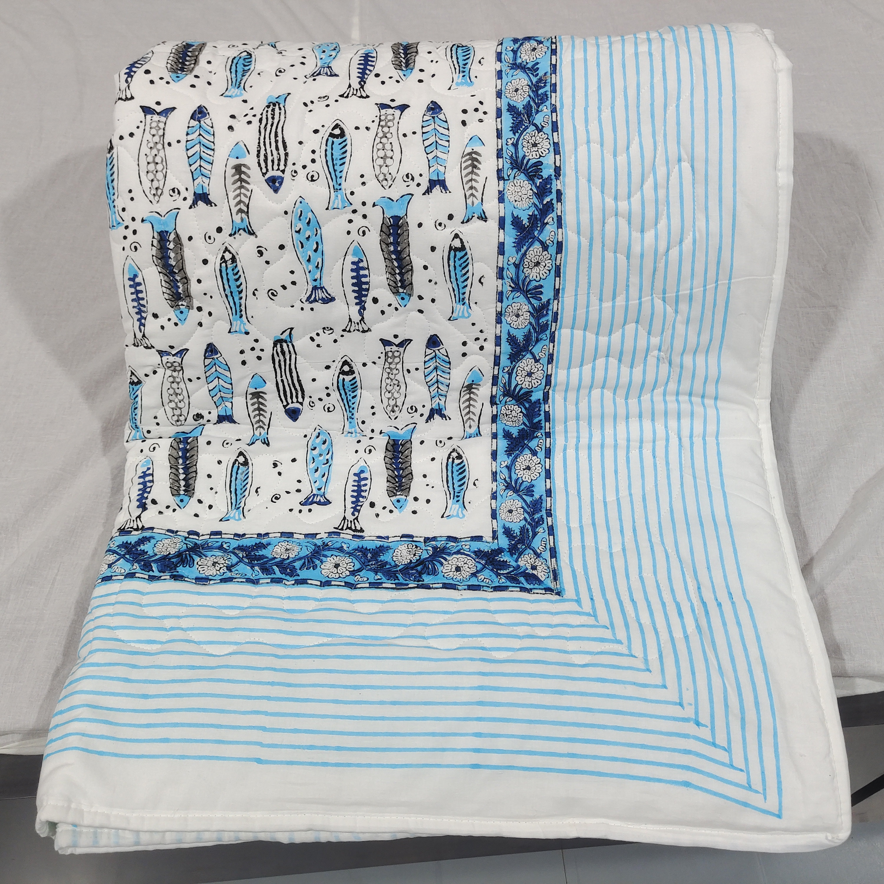 One distinctive feature of this quilt is its reversible hand block print. This traditional printing technique adds a unique and artistic touch to the quilt, making it not only a functional bedding item but also a piece of aesthetic appeal. Hand block printing involves skilled artisans carving intricate designs onto wooden blocks, which are then dipped in dye and stamped onto the fabric.