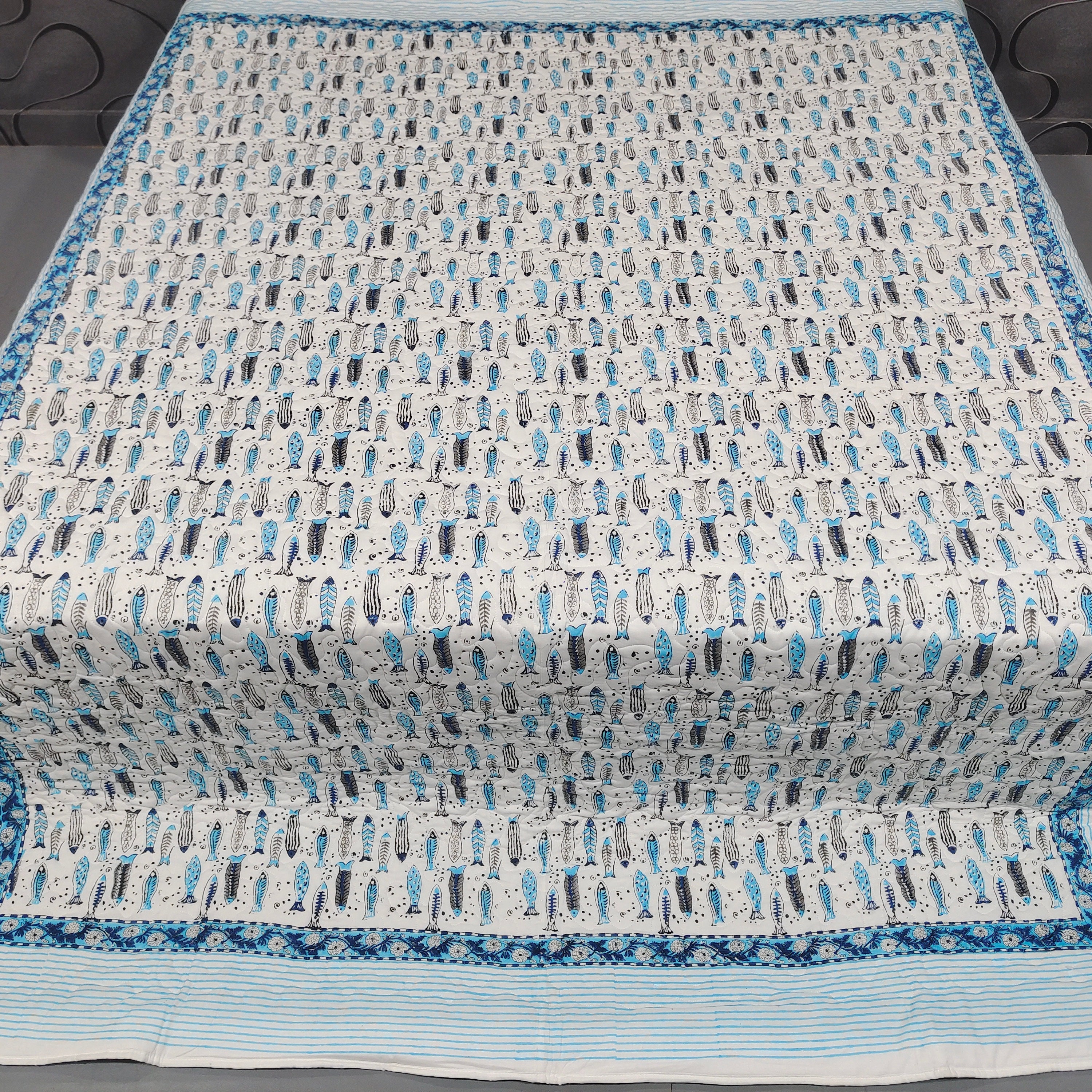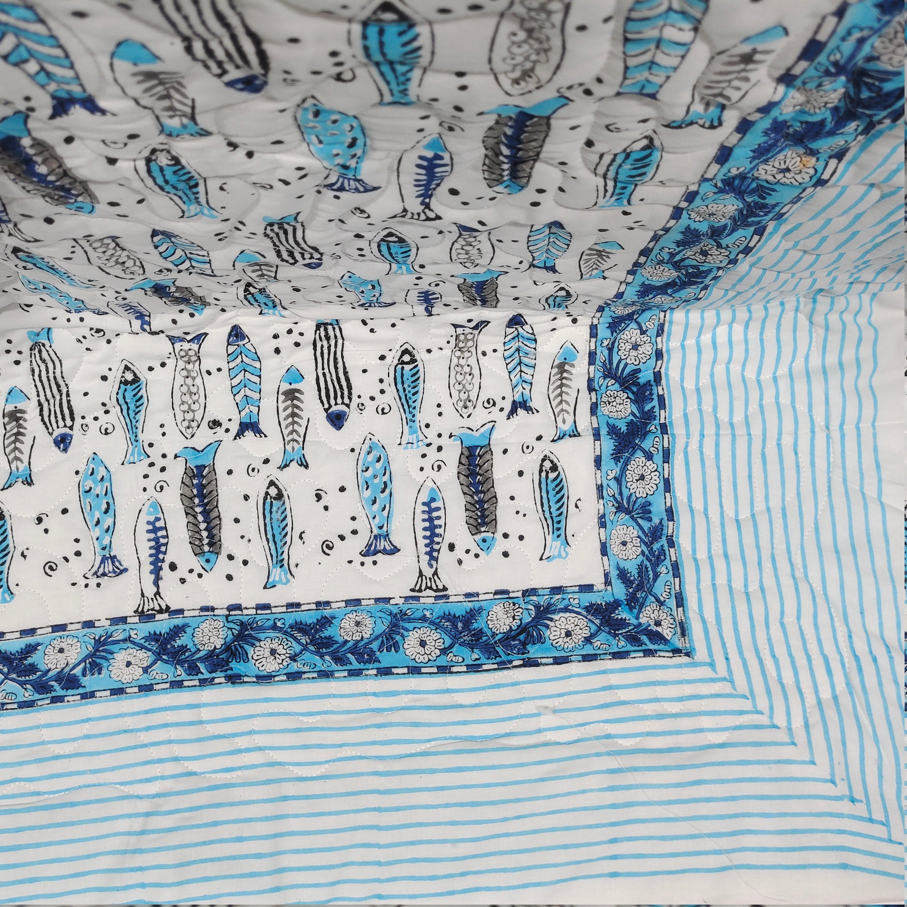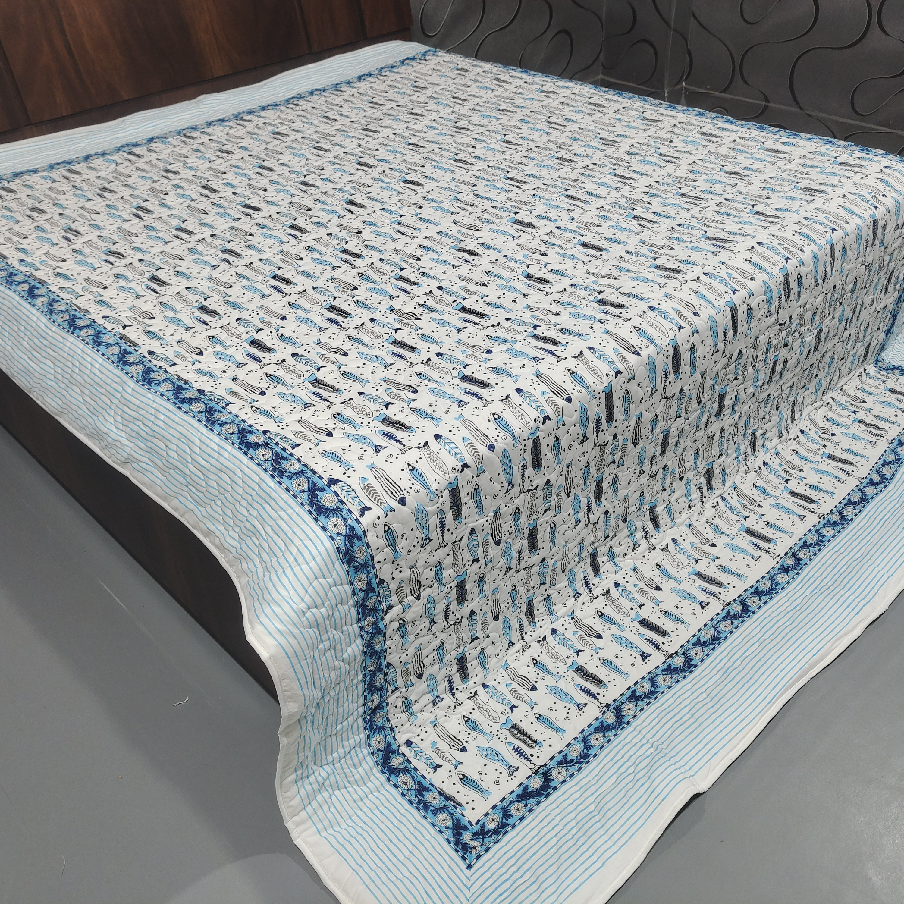 One distinctive feature of this quilt is its reversible hand block print. This traditional printing technique adds a unique and artistic touch to the quilt, making it not only a functional bedding item but also a piece of aesthetic appeal. Hand block printing involves skilled artisans carving intricate designs onto wooden blocks, which are then dipped in dye and stamped onto the fabric.