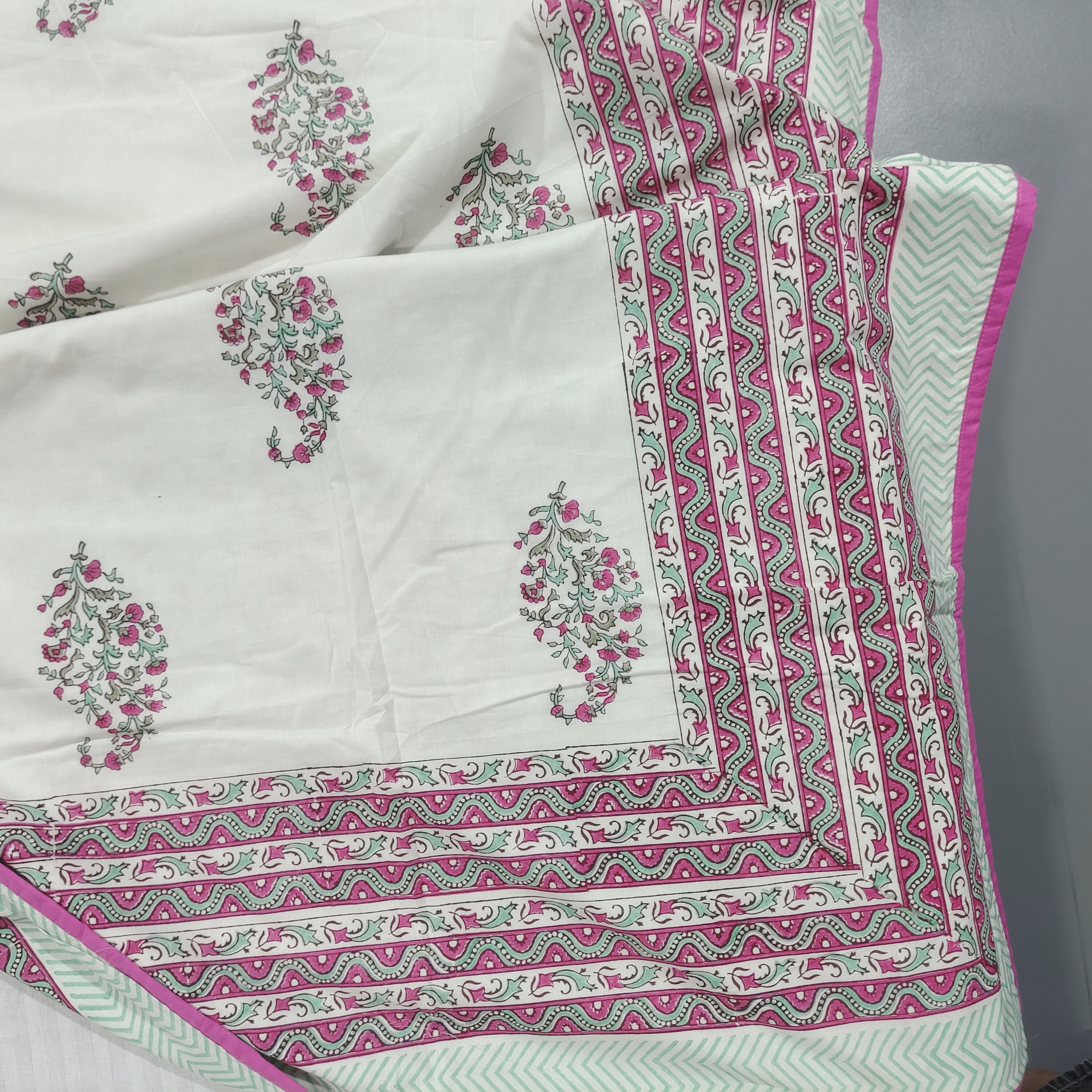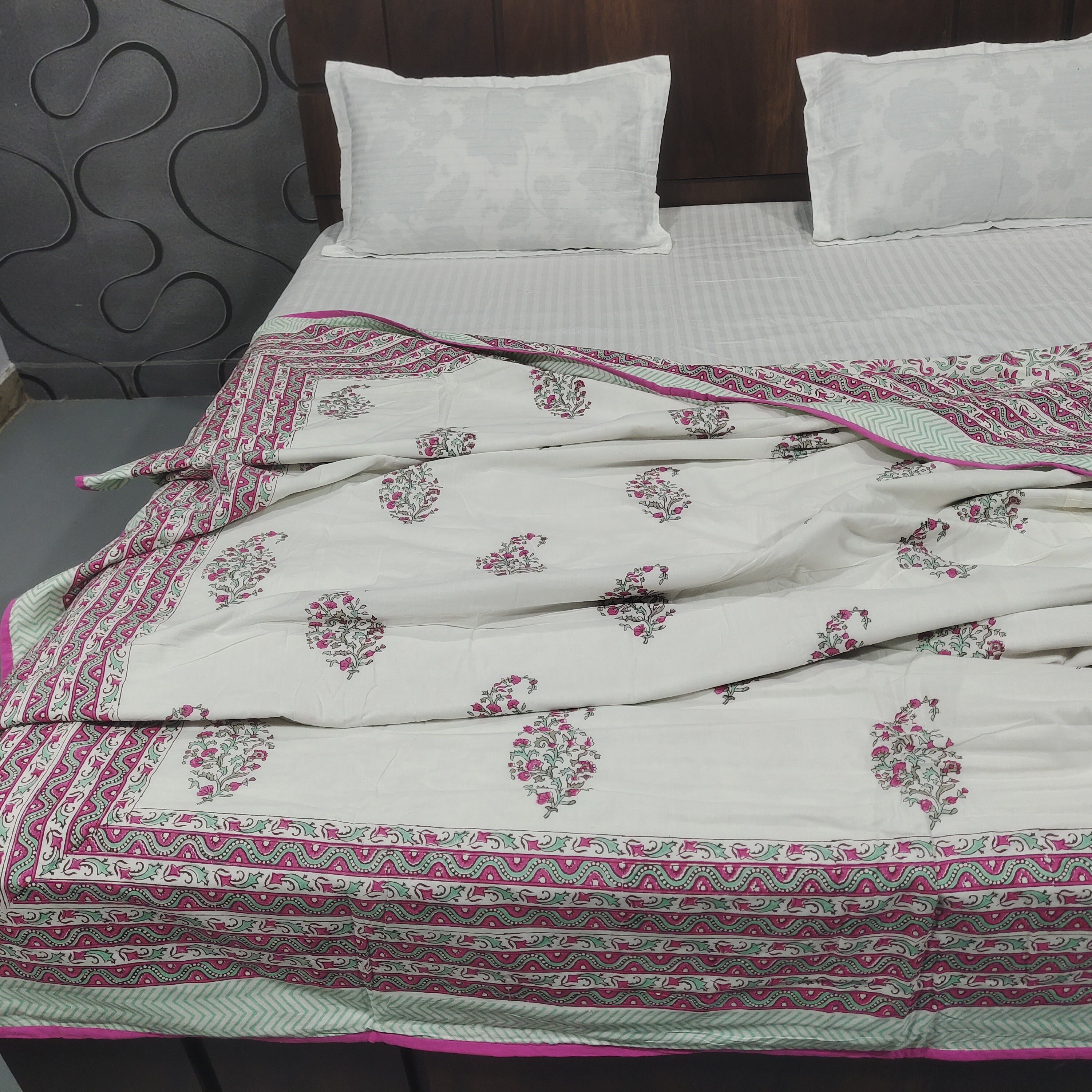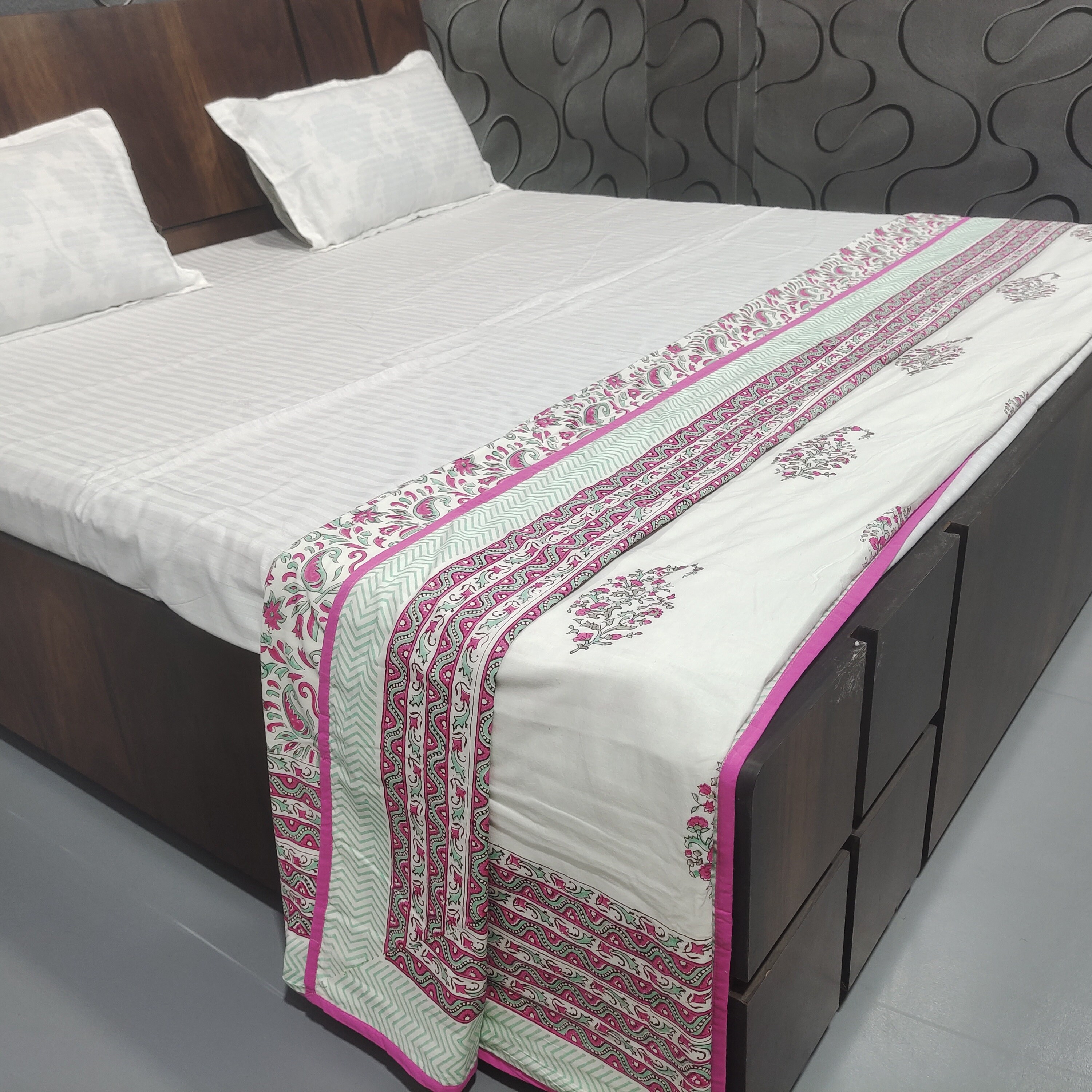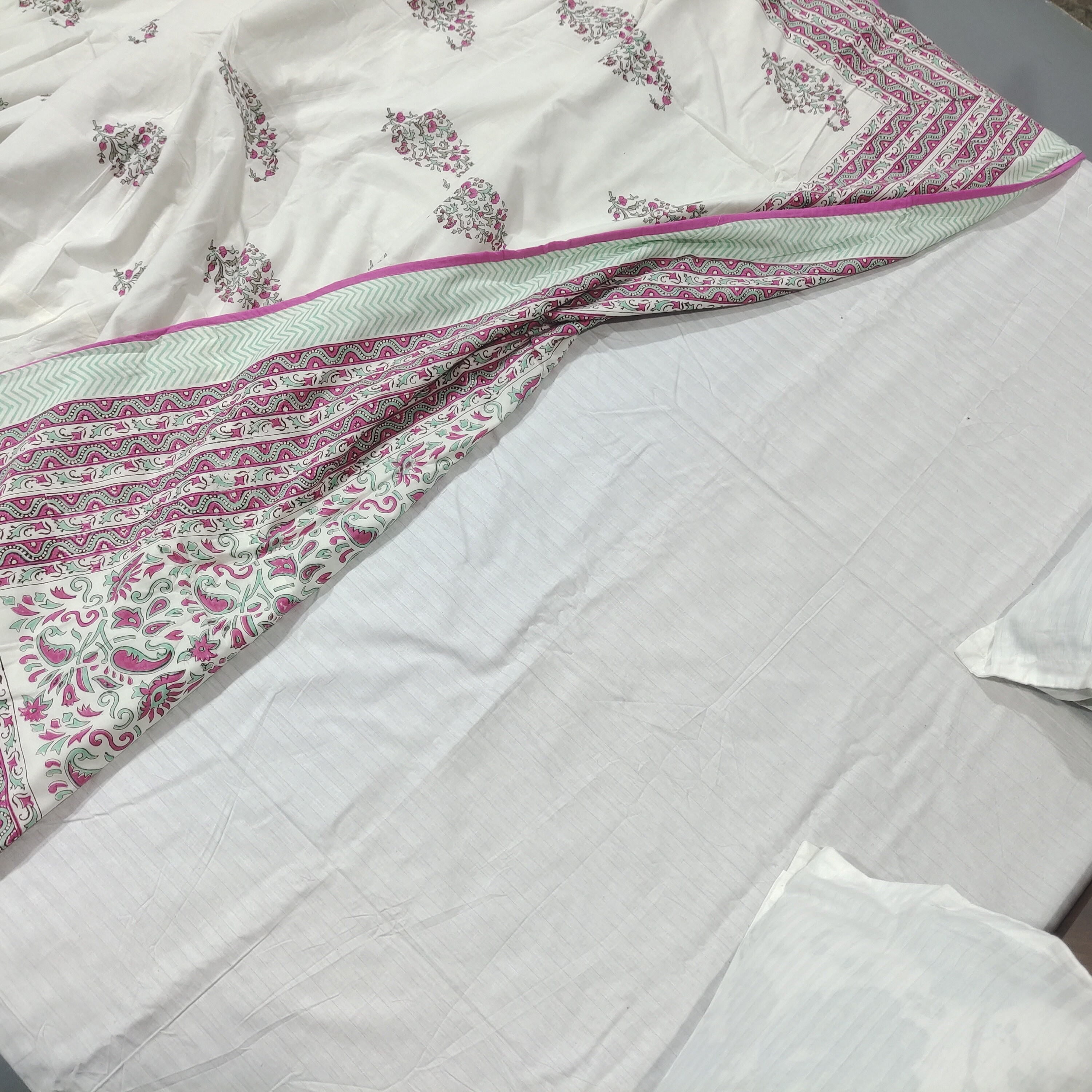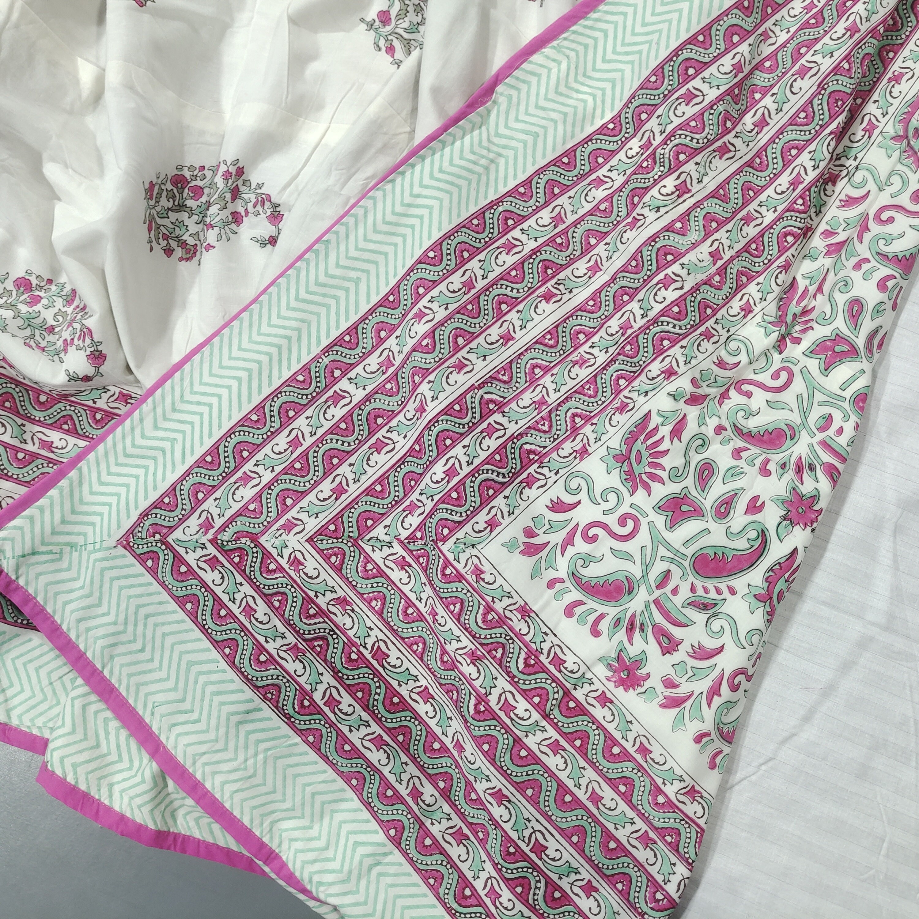 Experience the perfect blend of comfort and style with our Hand Block Printed AC Blanket (Dohar). Crafted with the same exquisite artistry as our quilts, this lightweight blanket is designed for optimal airflow and cooling comfort during warmer months. Made from soft and breathable mal mal fabric, each blanket features intricate hand block printing, adding a touch of artisanal elegance to your bedroom decor.
