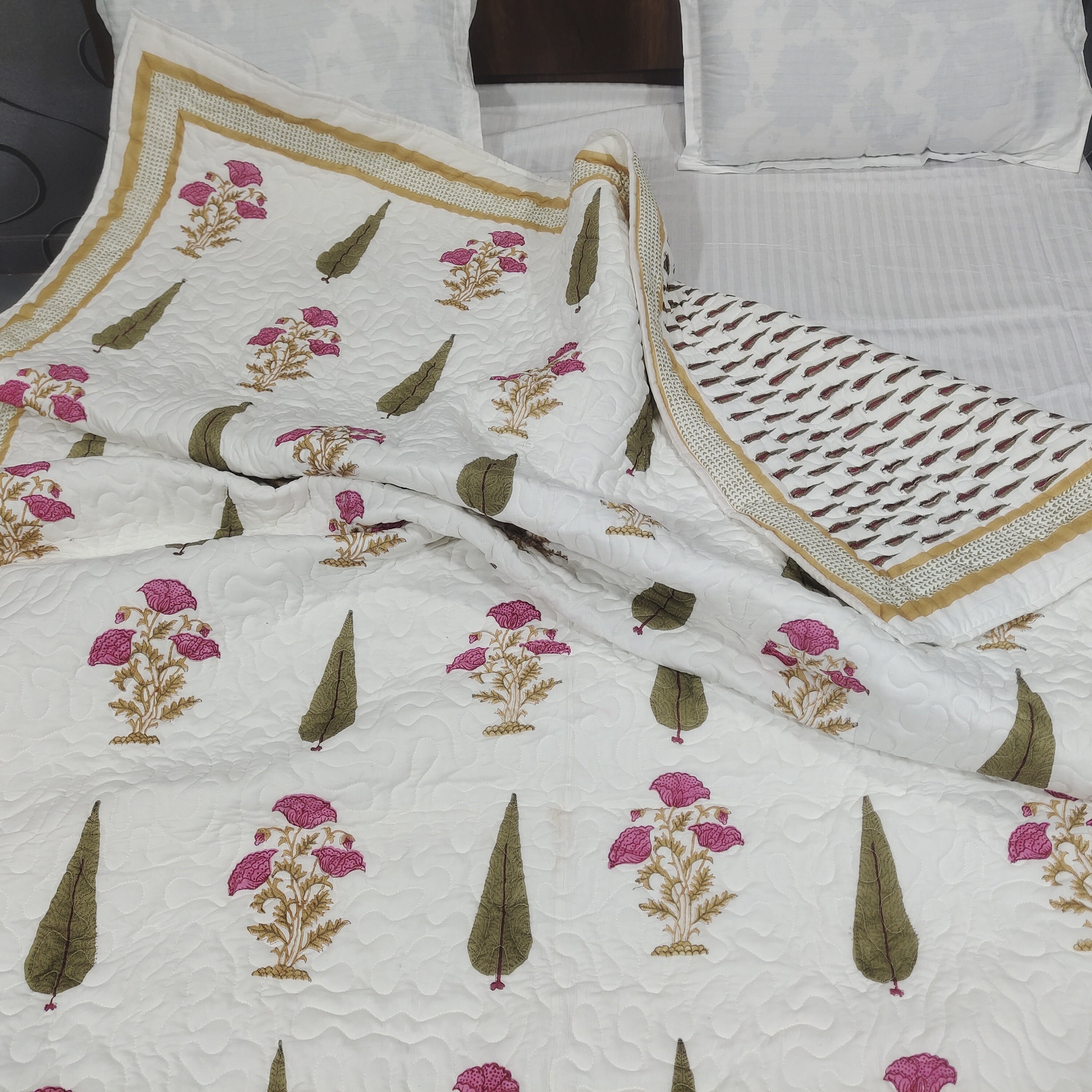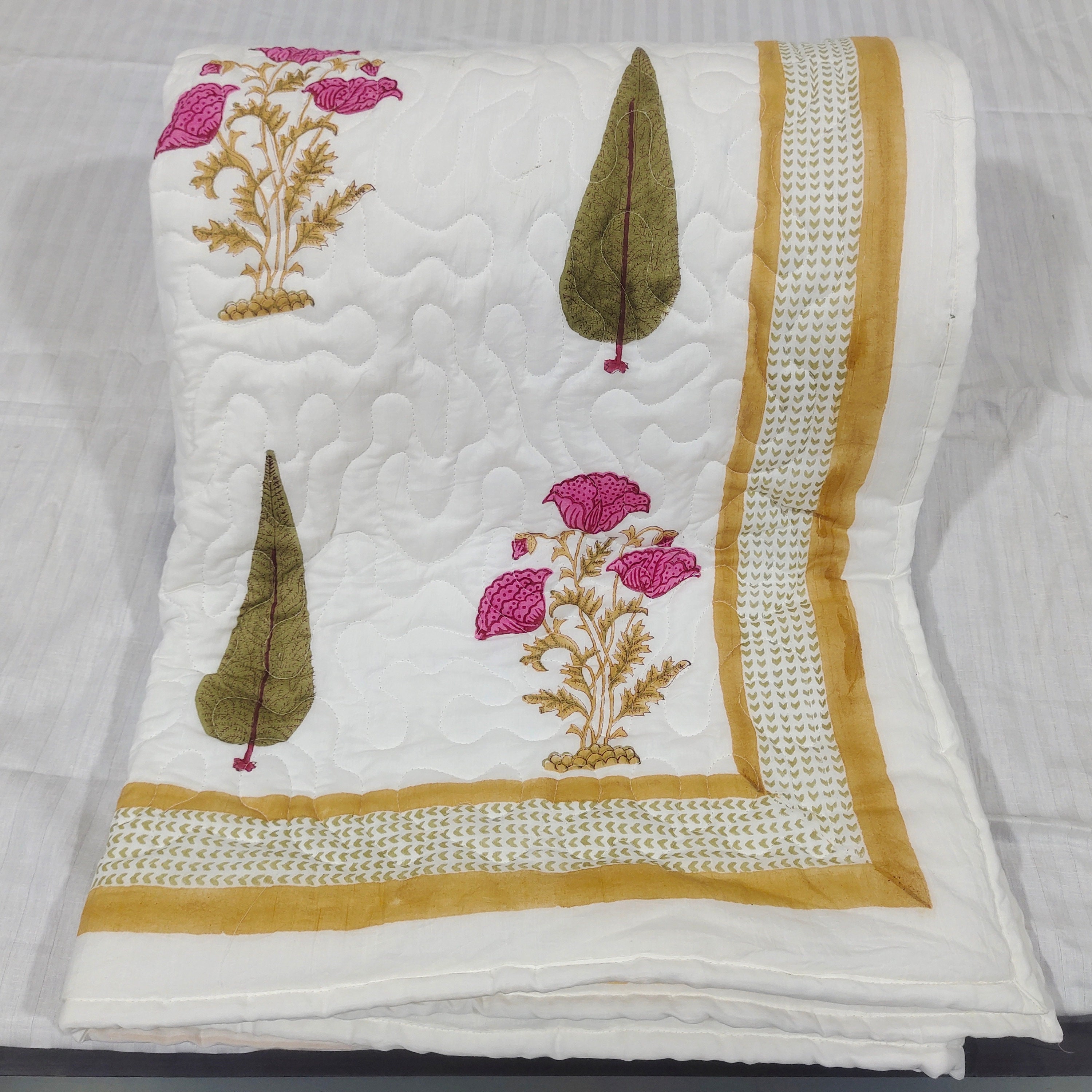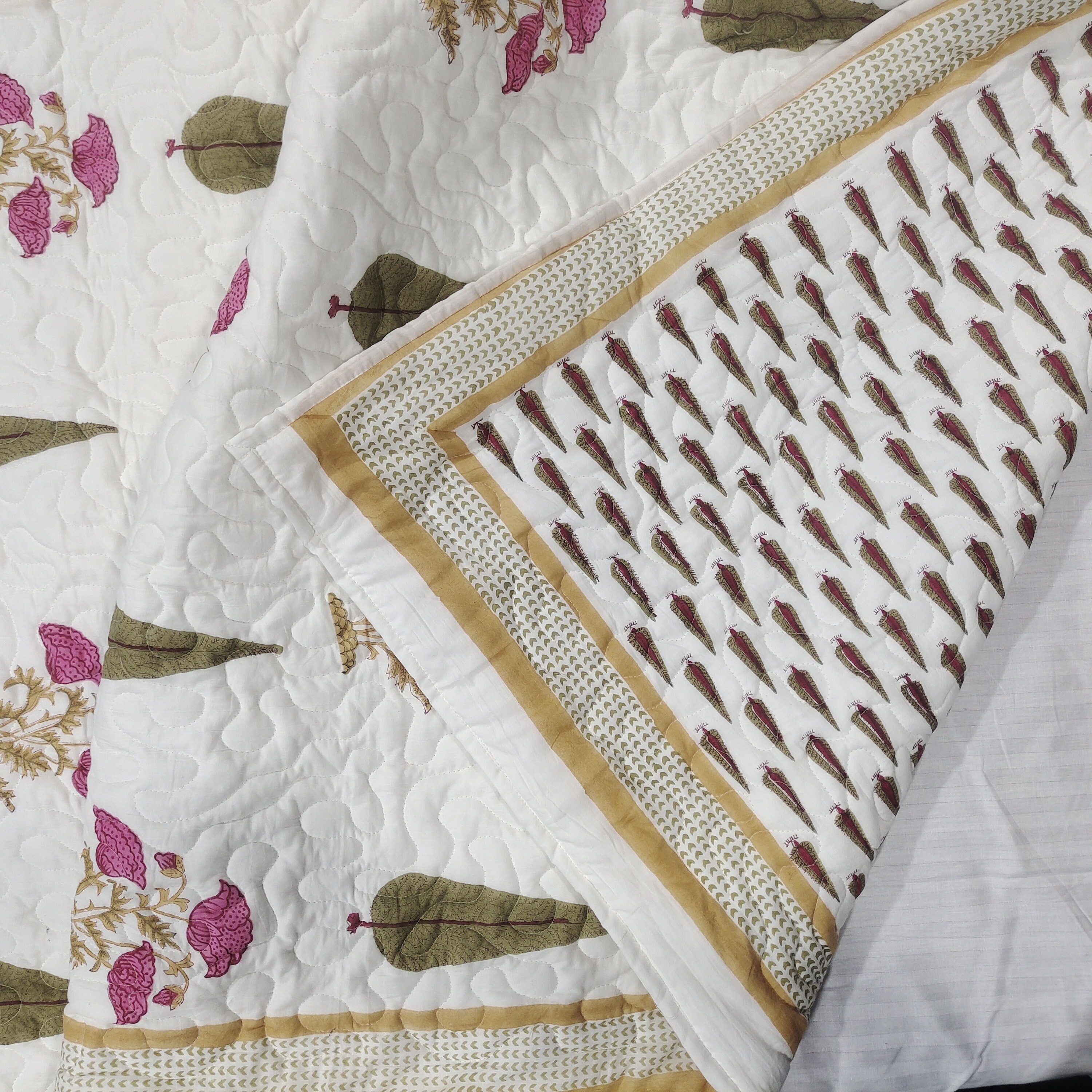 One distinctive feature of this quilt is its reversible hand block print. This traditional printing technique adds a unique and artistic touch to the quilt, making it not only a functional bedding item but also a piece of aesthetic appeal. Hand block printing involves skilled artisans carving intricate designs onto wooden blocks, which are then dipped in dye and stamped onto the fabric.