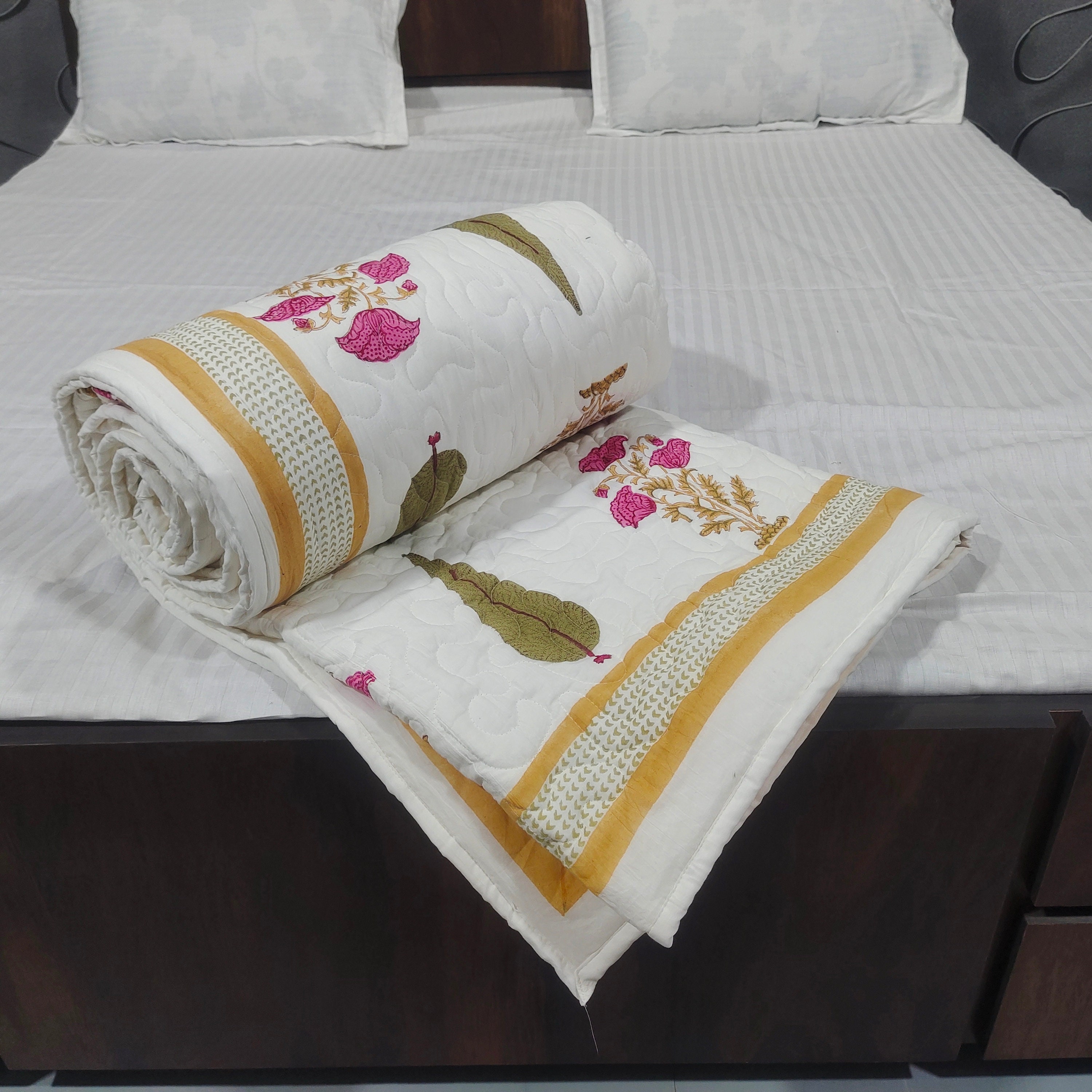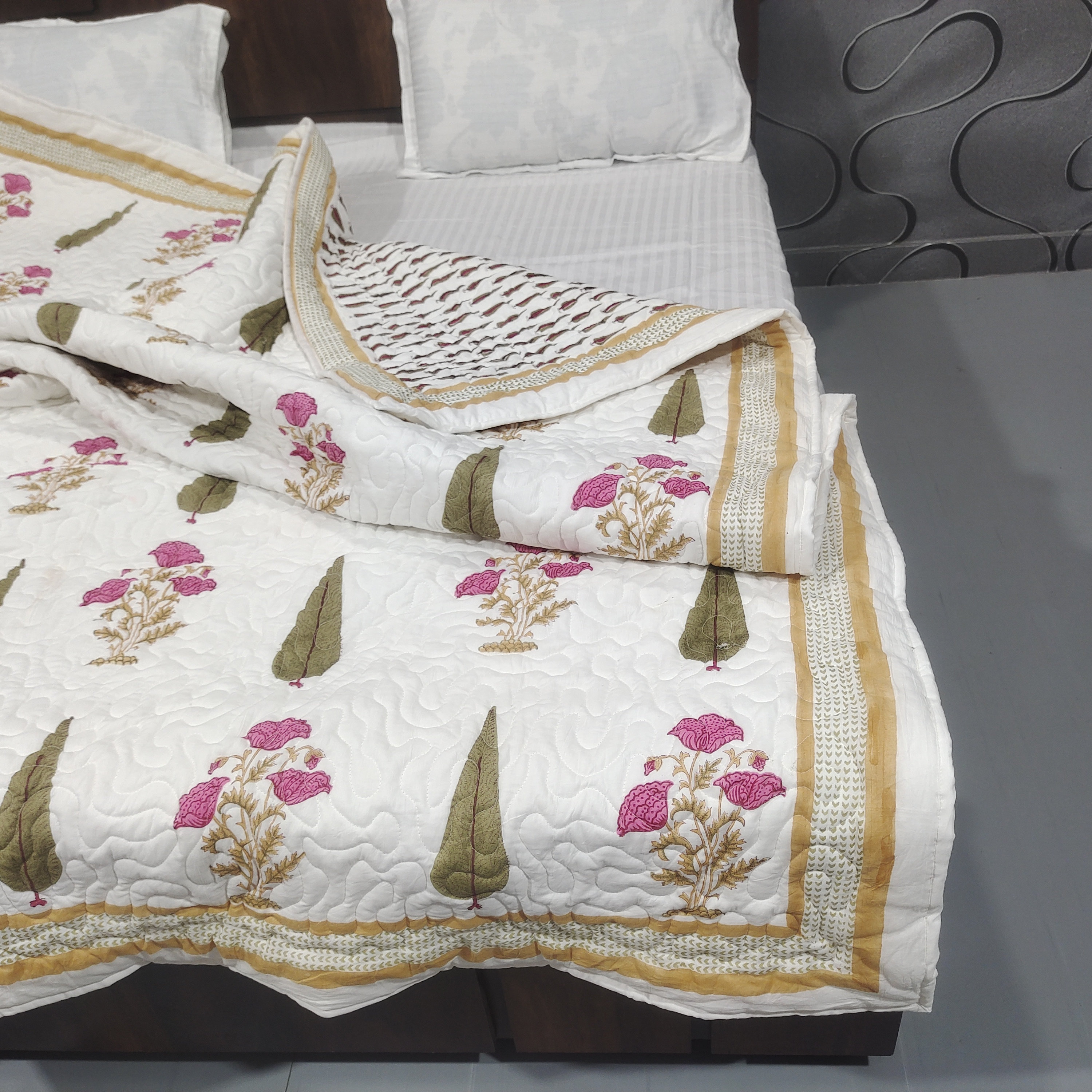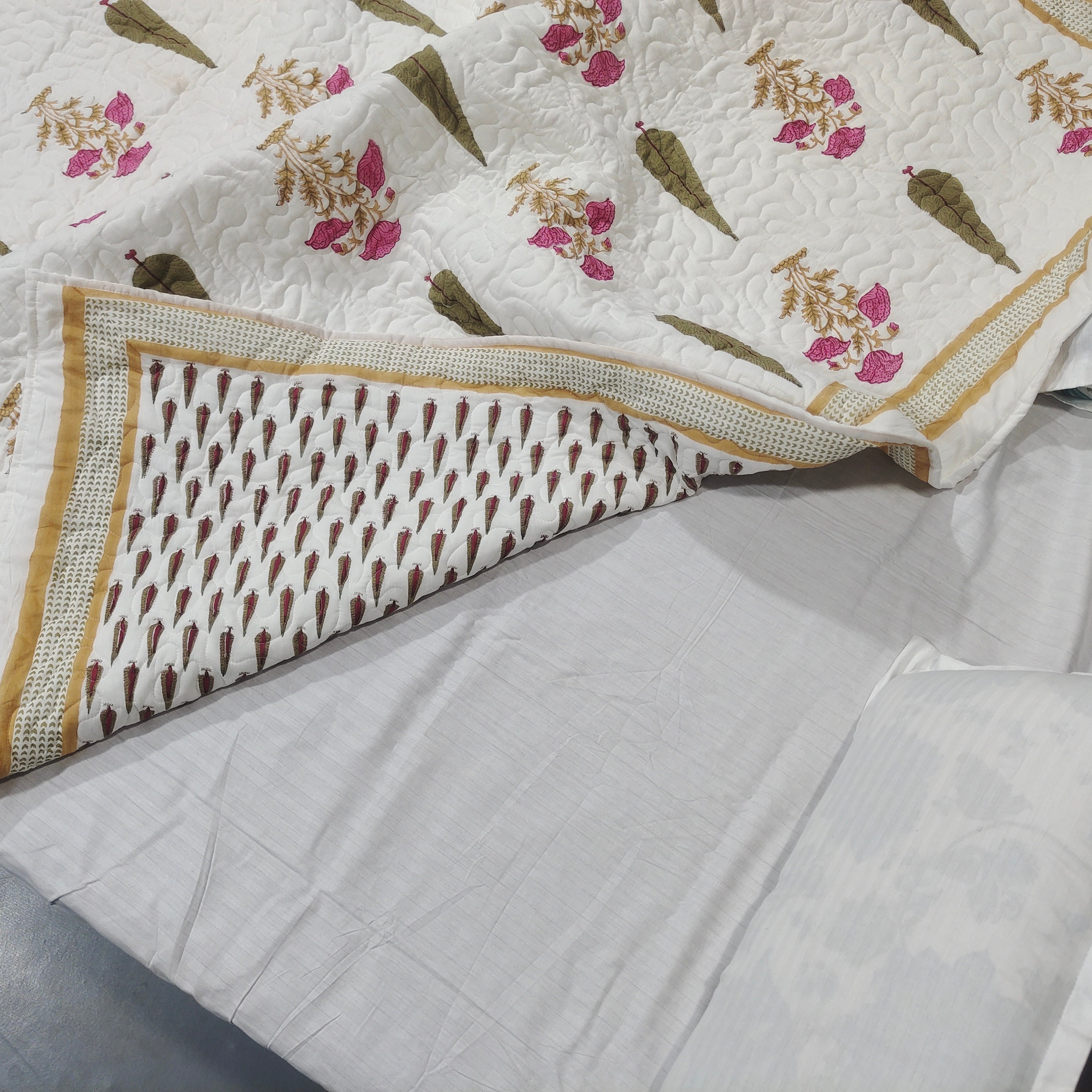 One distinctive feature of this quilt is its reversible hand block print. This traditional printing technique adds a unique and artistic touch to the quilt, making it not only a functional bedding item but also a piece of aesthetic appeal. Hand block printing involves skilled artisans carving intricate designs onto wooden blocks, which are then dipped in dye and stamped onto the fabric.