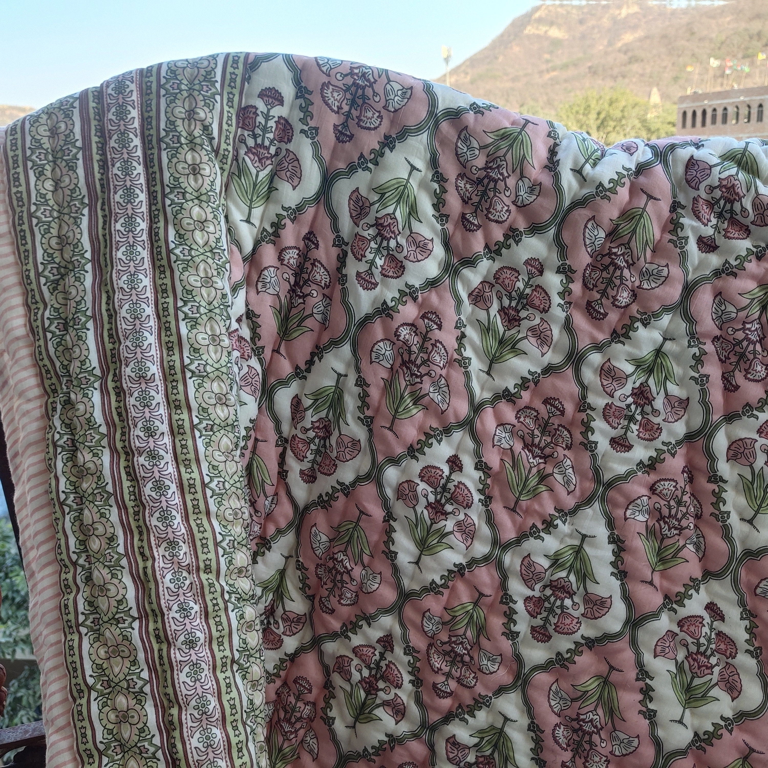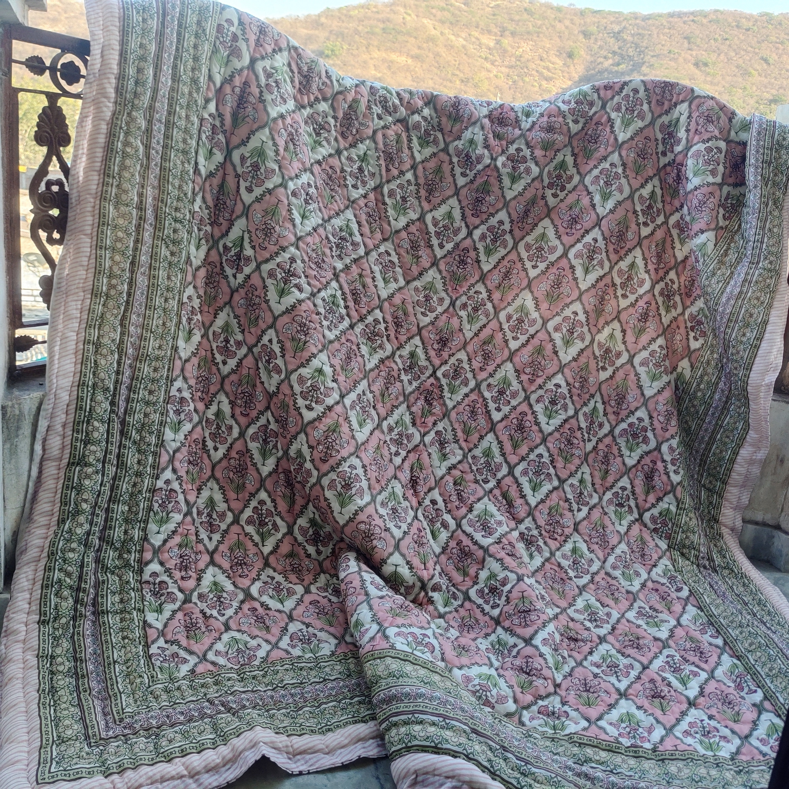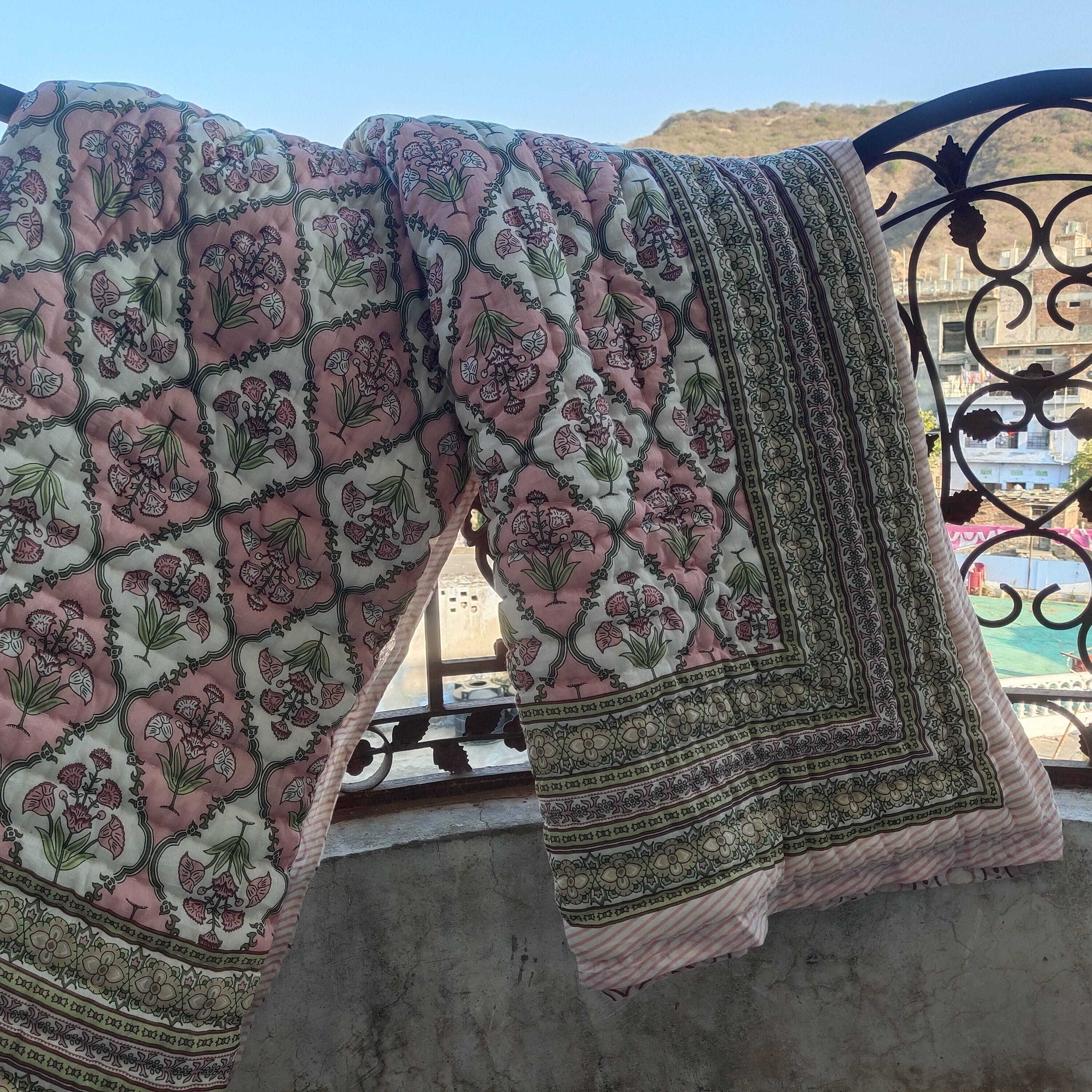 Hand Block Print Cotton Quilt: Queen Size Pink Floral Bedding (90x108)
