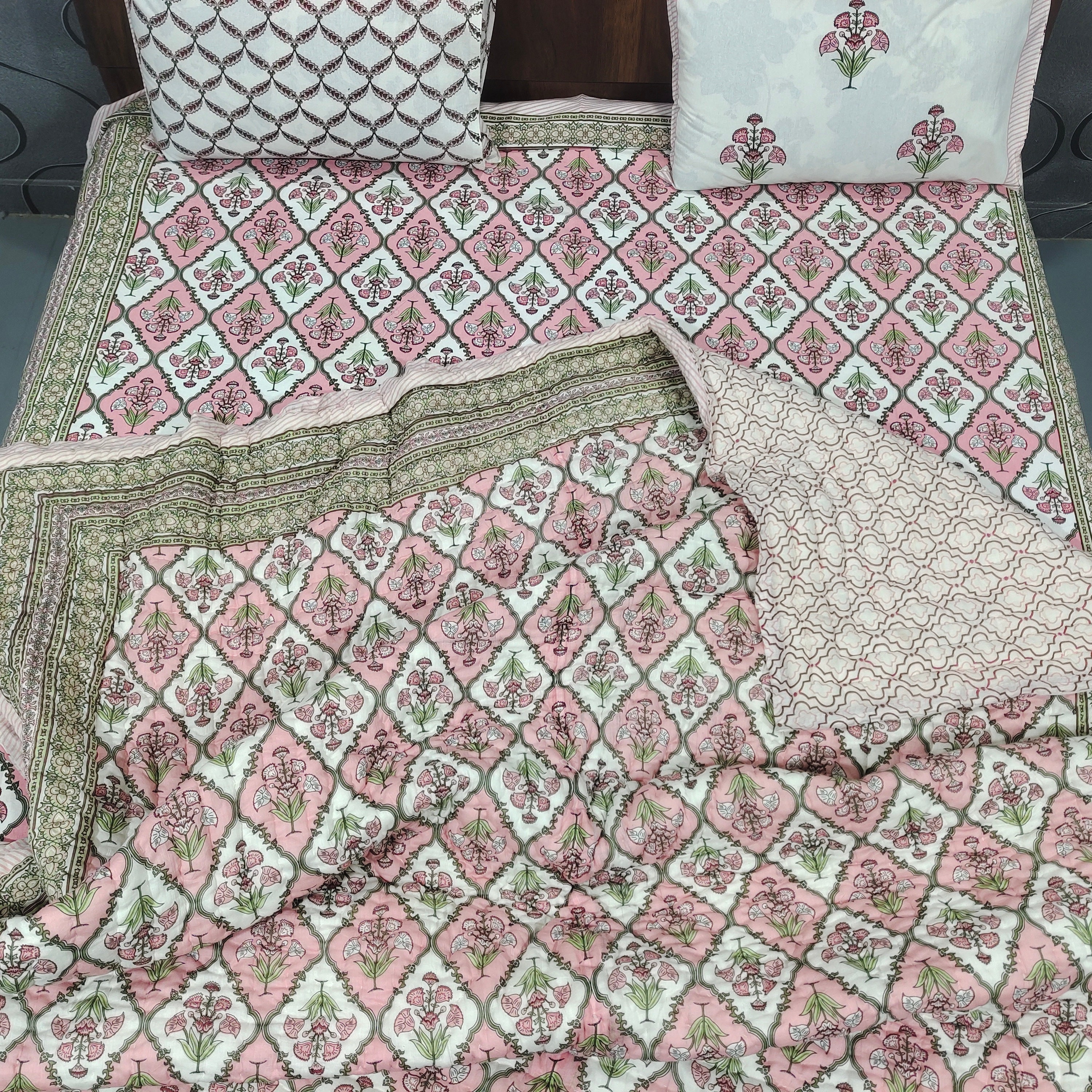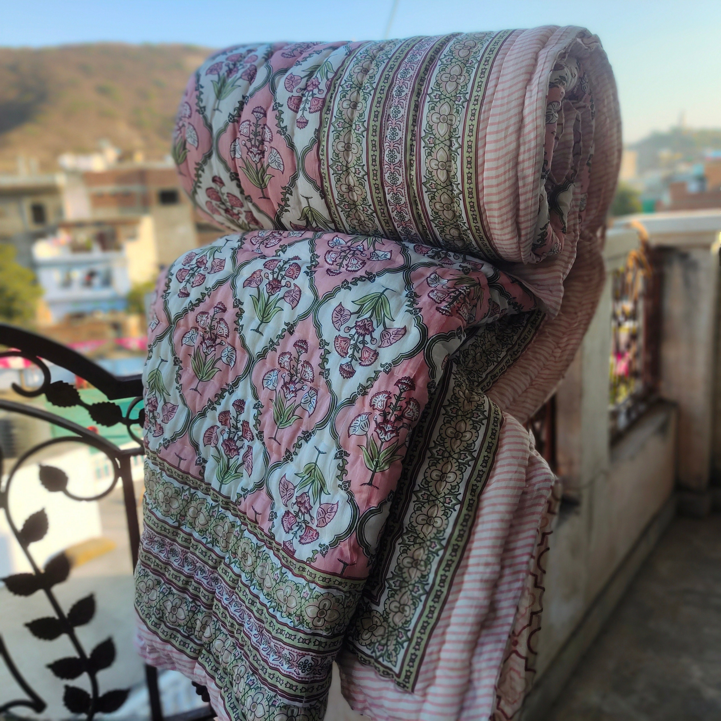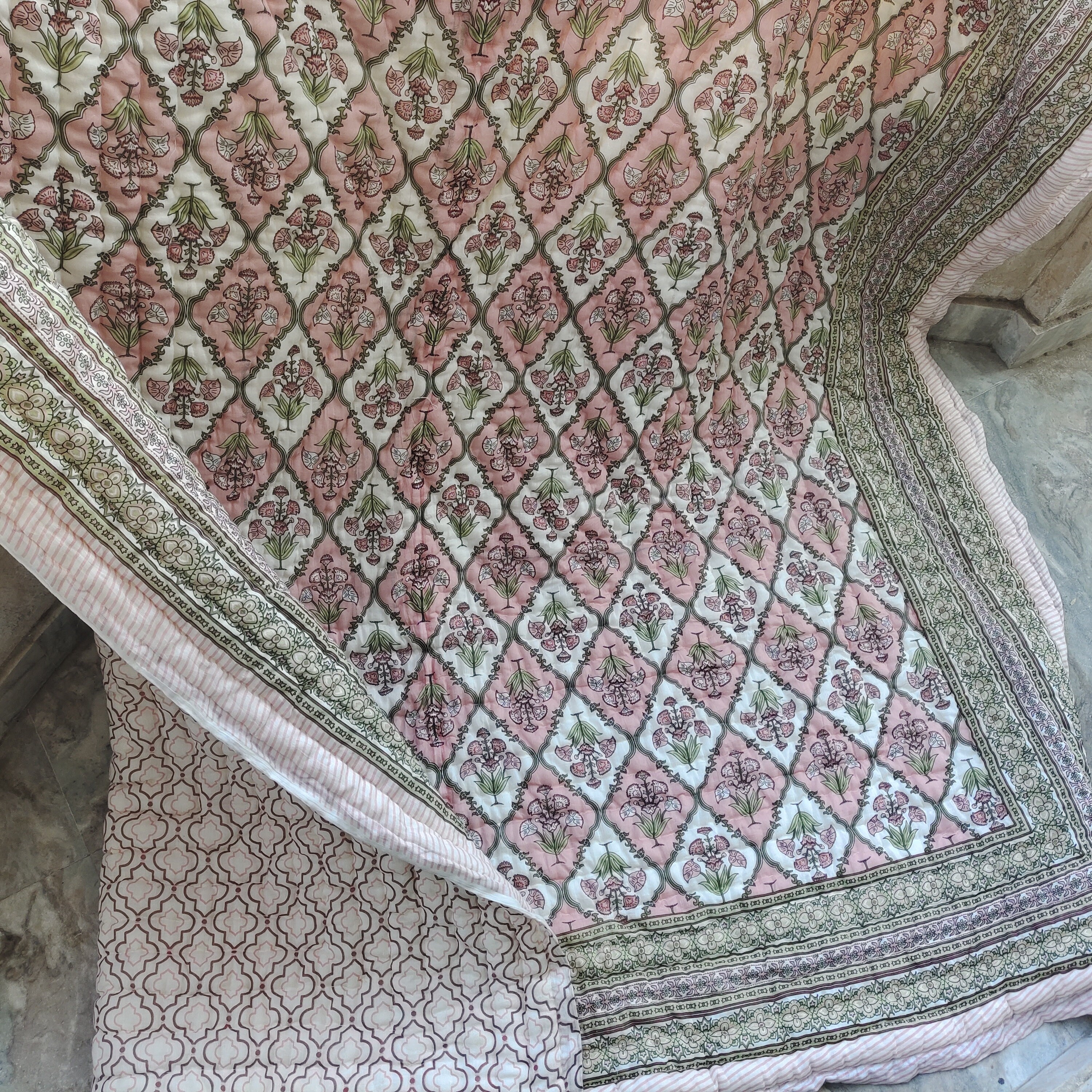 Hand Block Print Cotton Quilt: Queen Size Pink Floral Bedding (90x108)