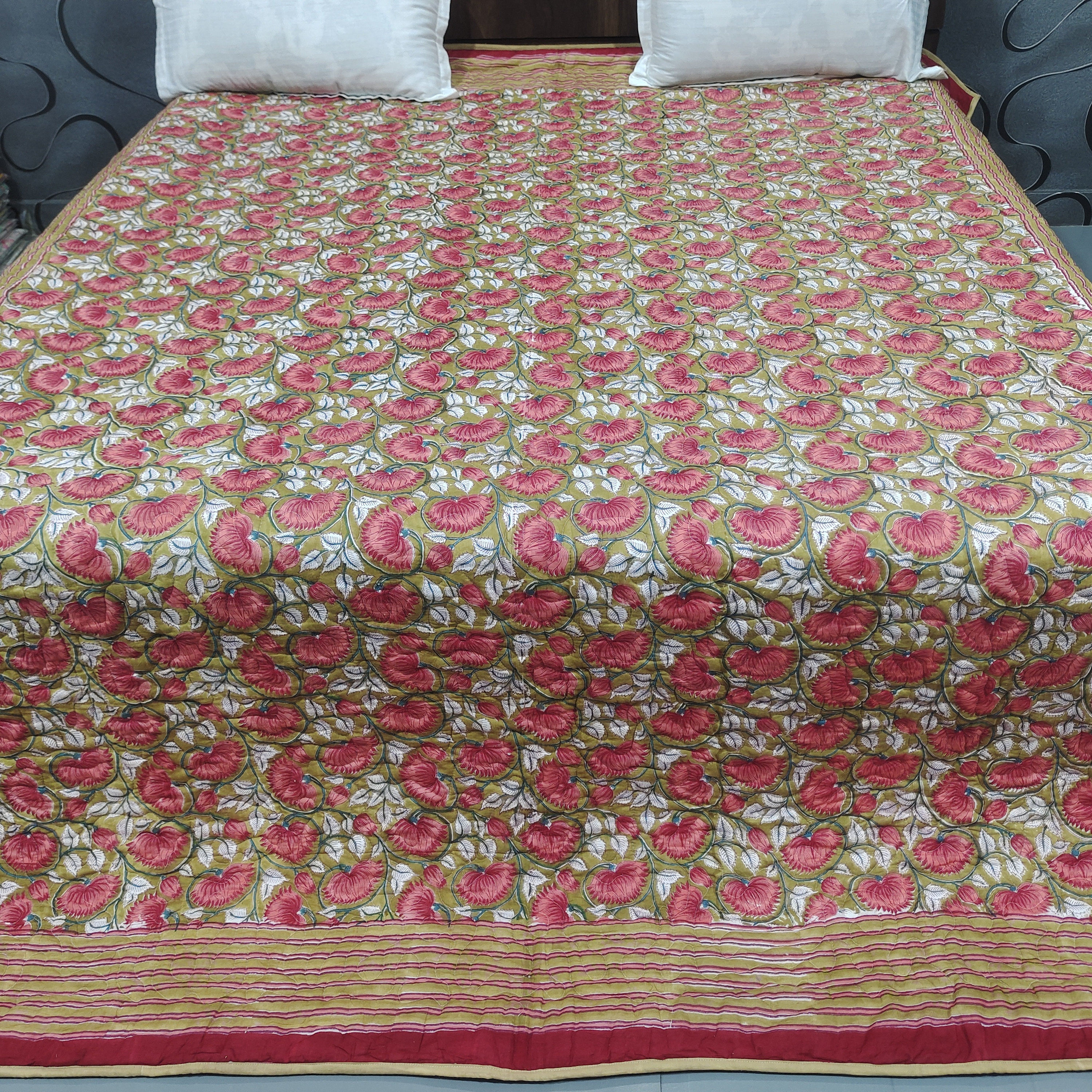 Red Floral Quilt: Hand Block Print Cotton Bedspread - US Queen/King