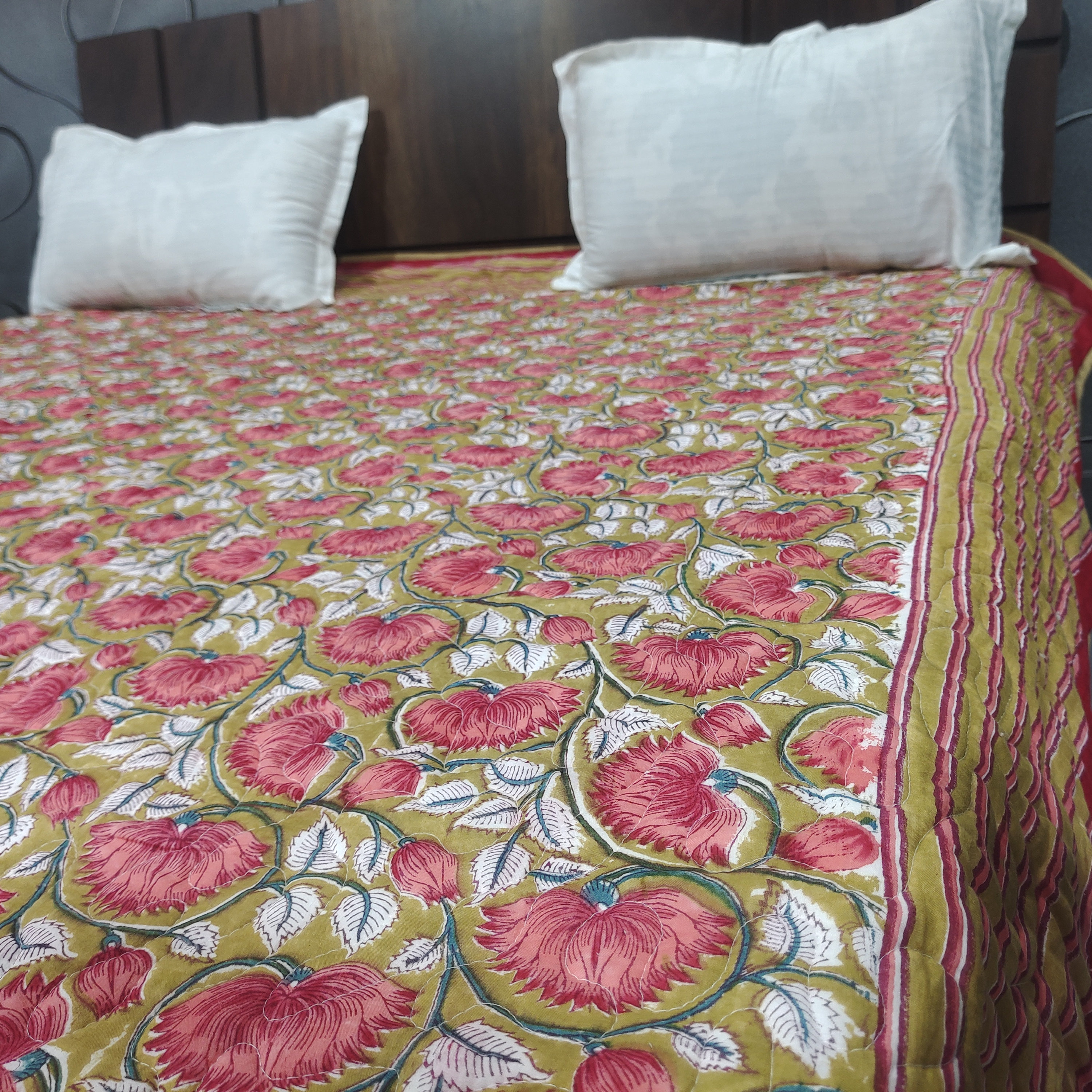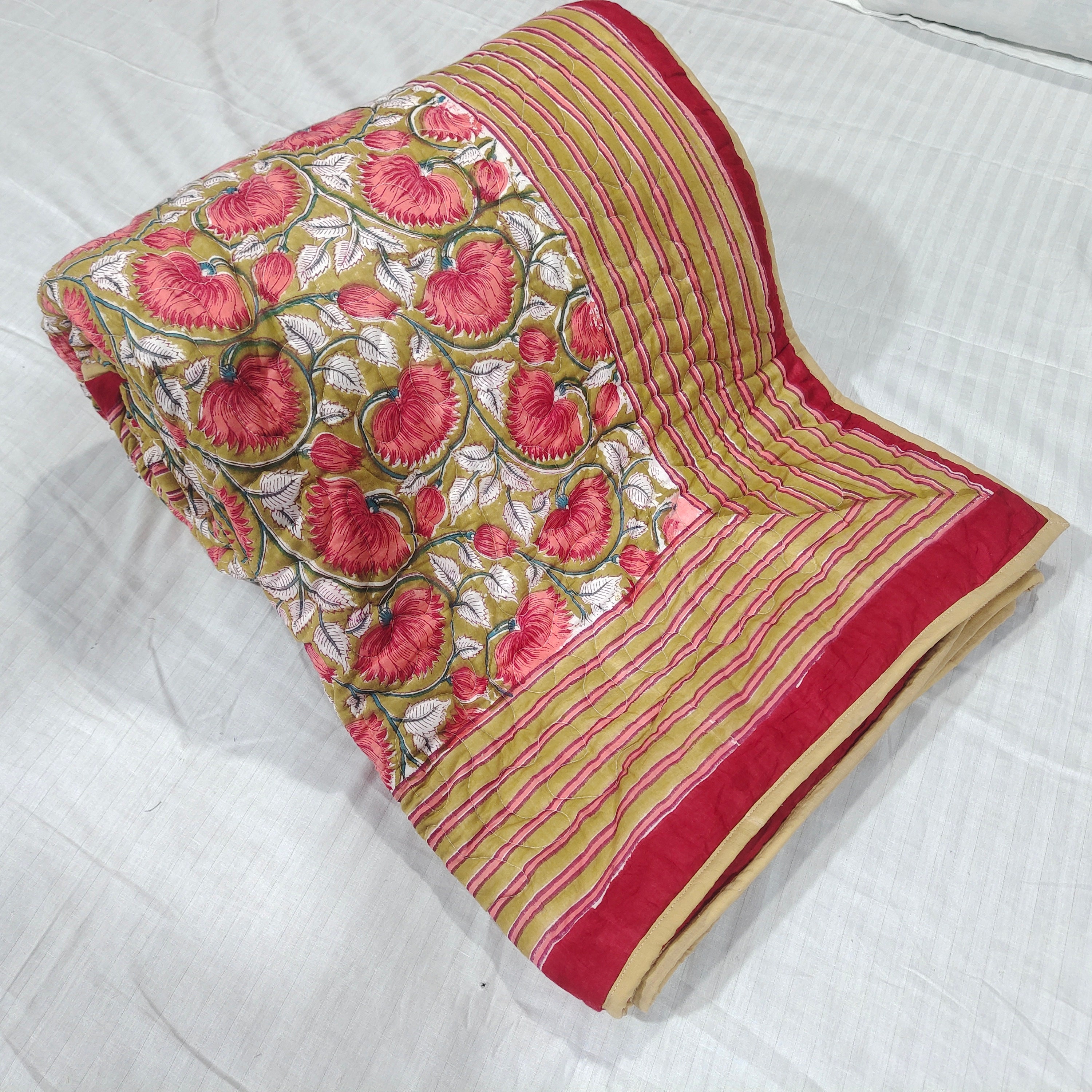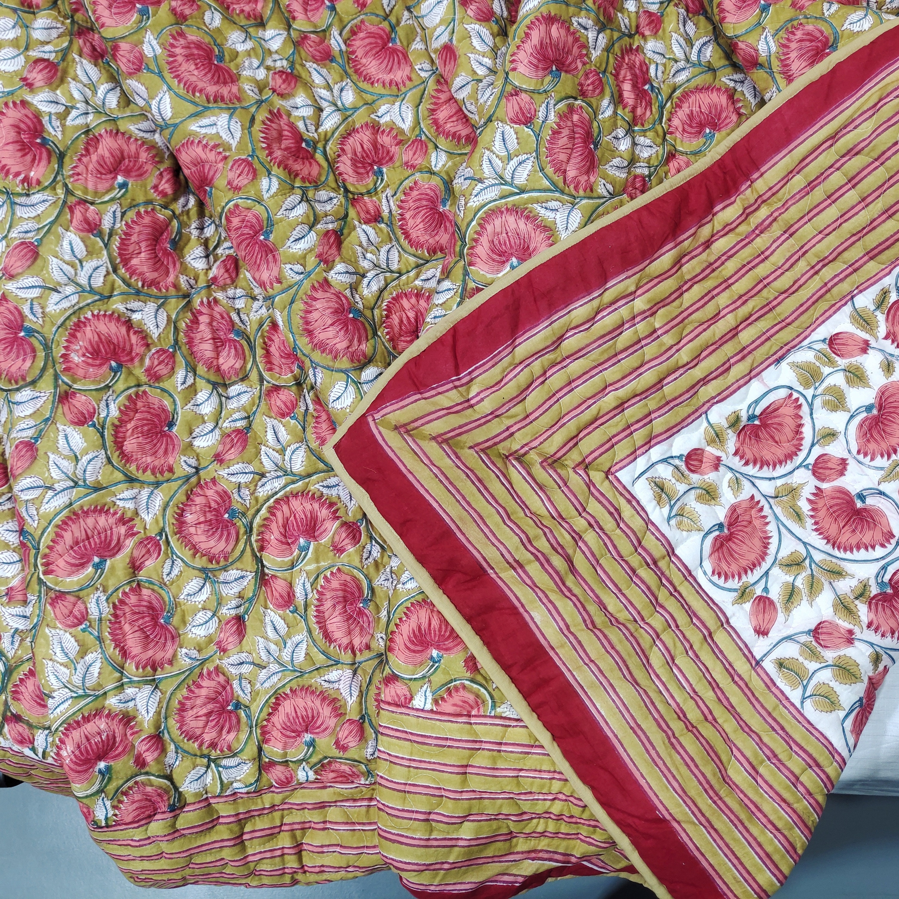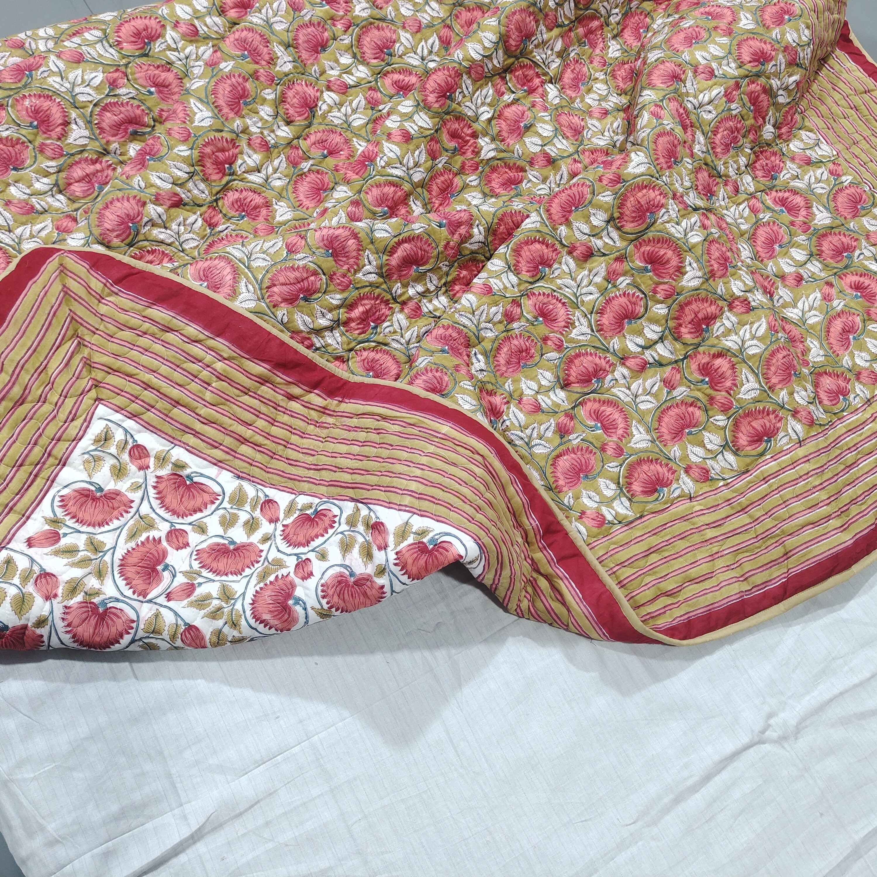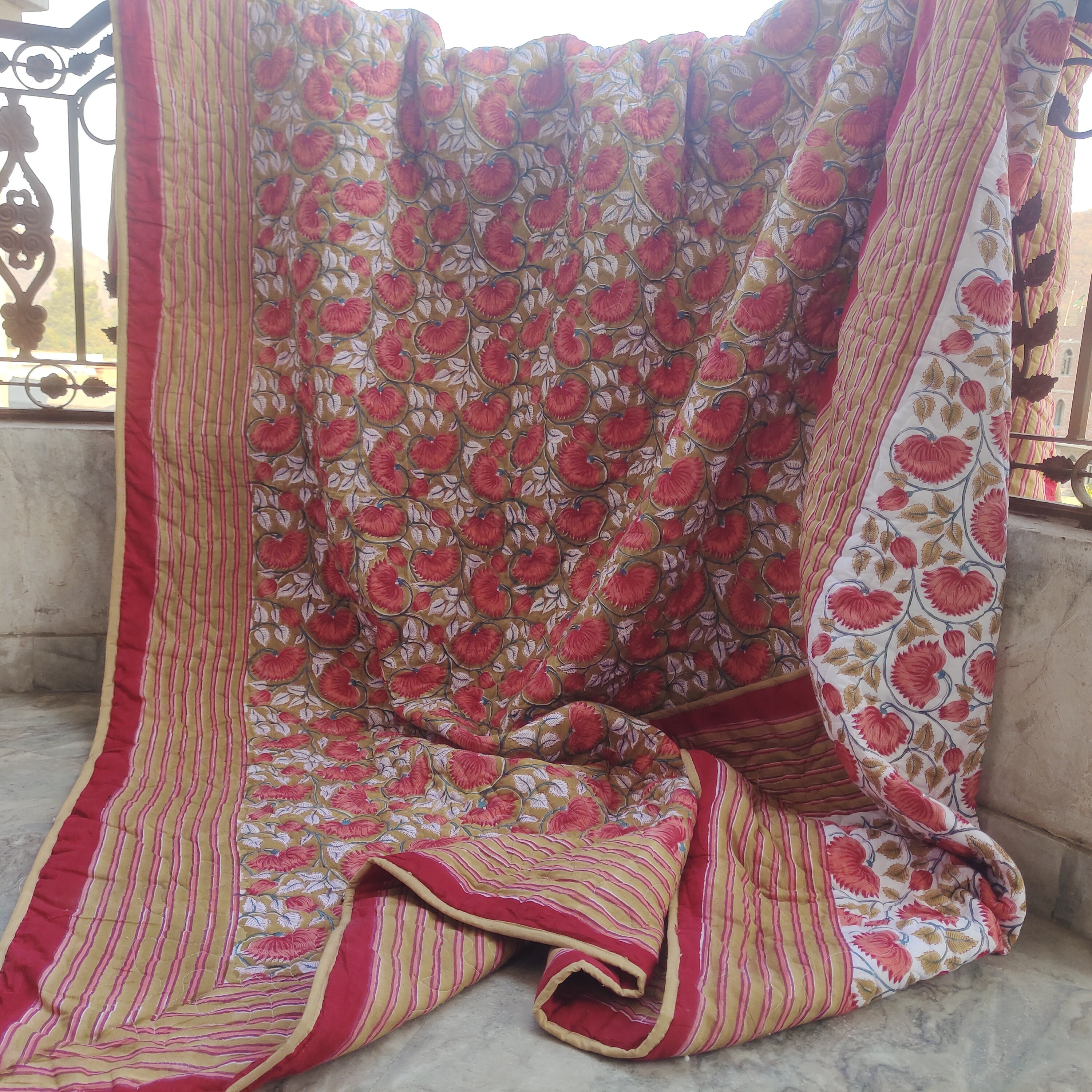 One distinctive feature of this quilt is its reversible hand block print. This traditional printing technique adds a unique and artistic touch to the quilt, making it not only a functional bedding item but also a piece of aesthetic appeal. Hand block printing involves skilled artisans carving intricate designs onto wooden blocks, which are then dipped in dye and stamped onto the fabric.