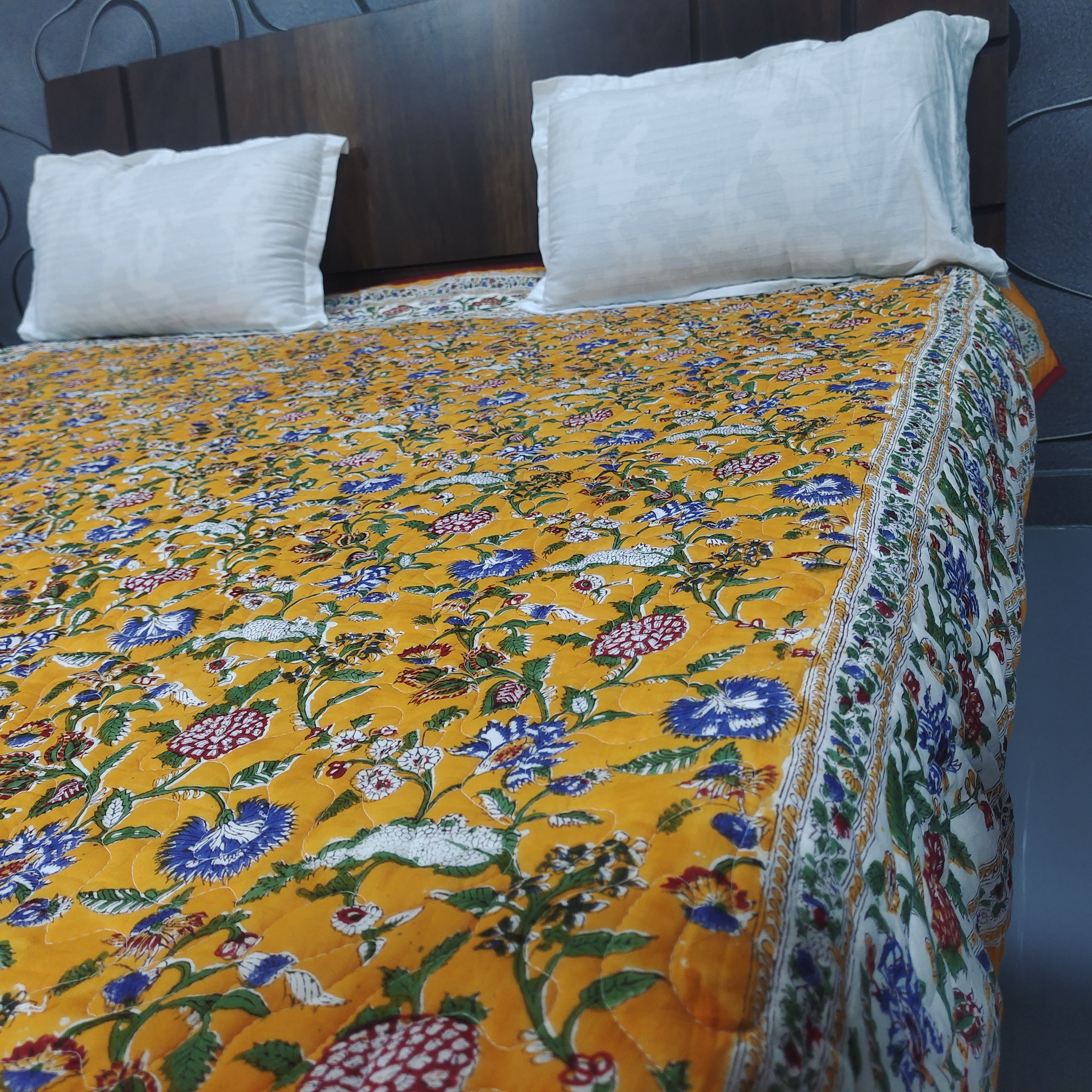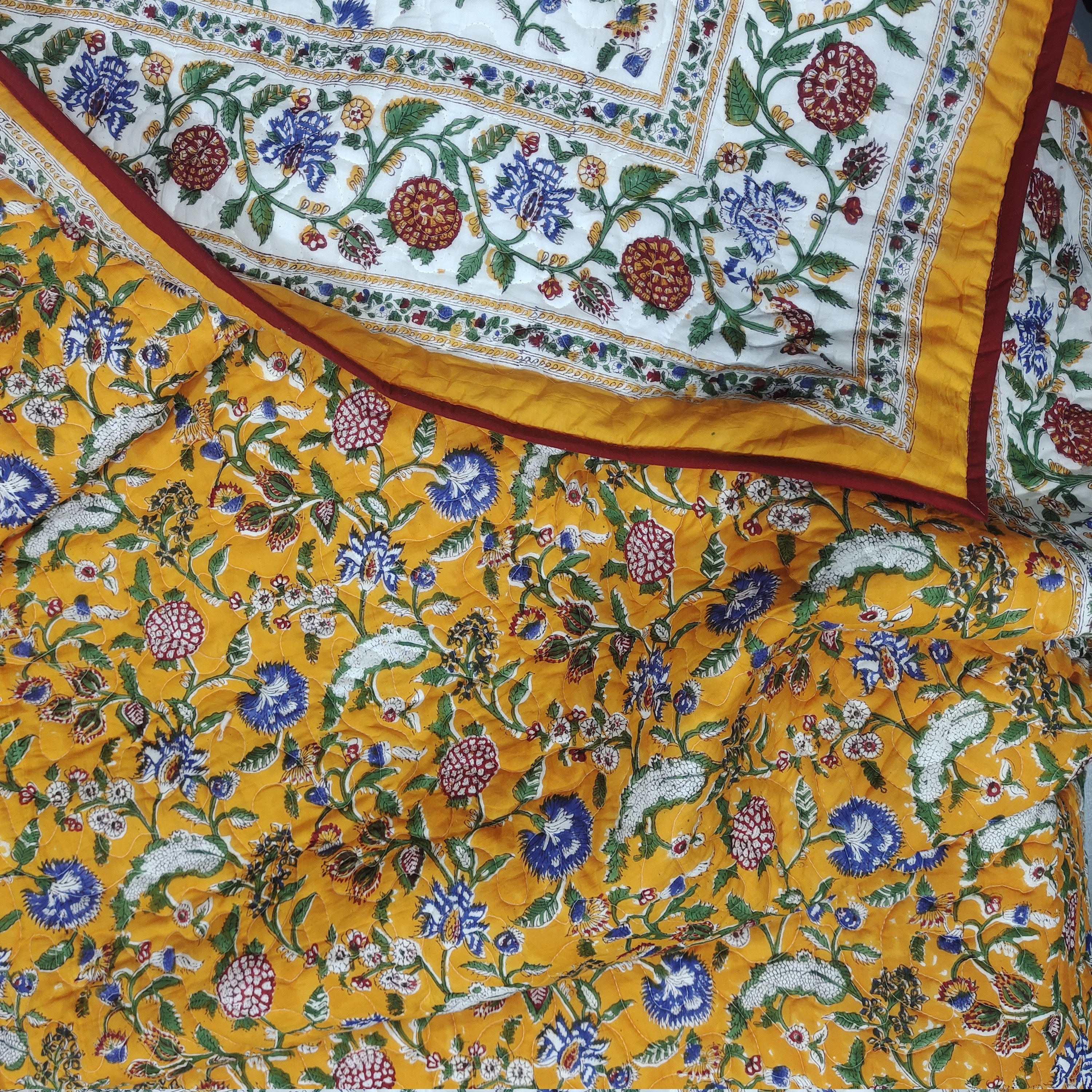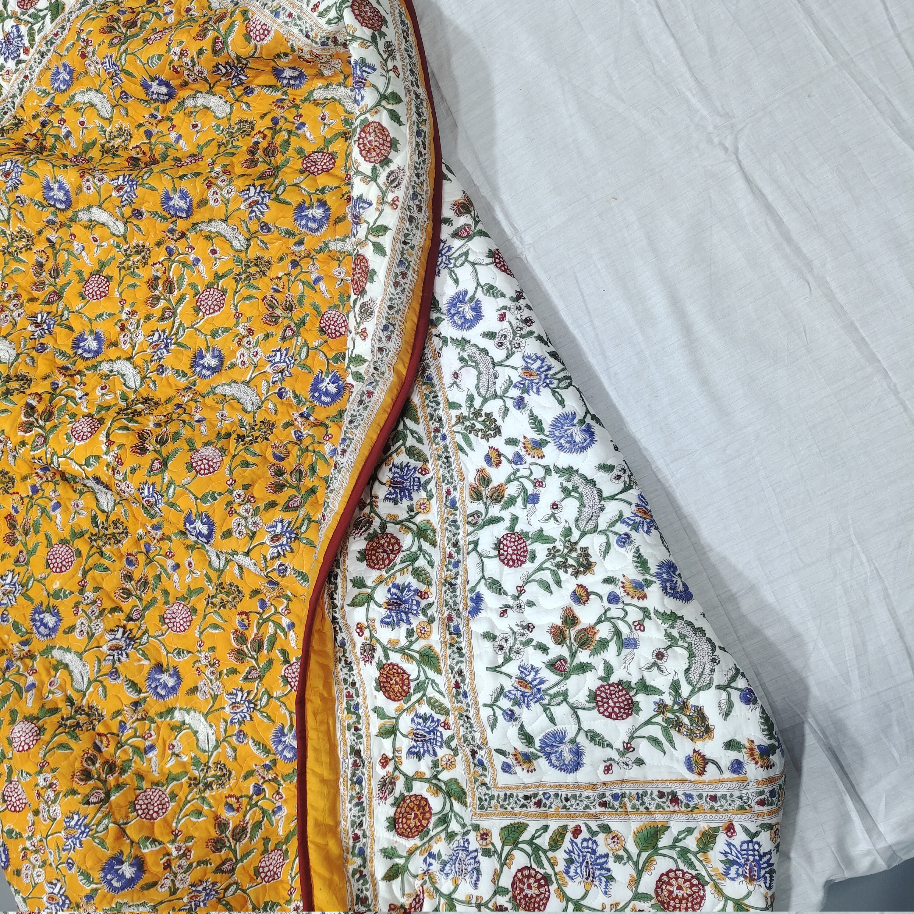 Hand Block Print Cotton Quilt: Reversible Floral Bedspread