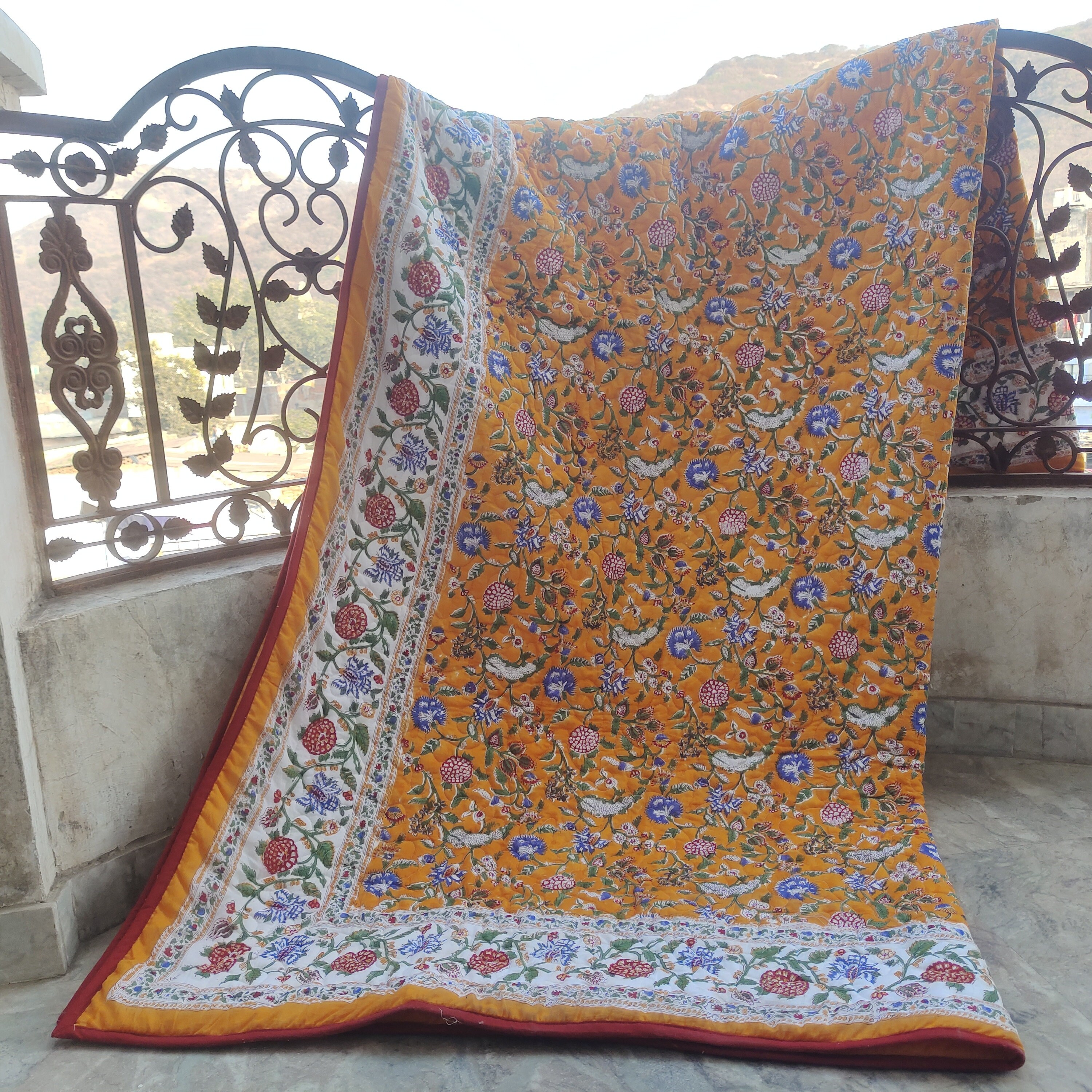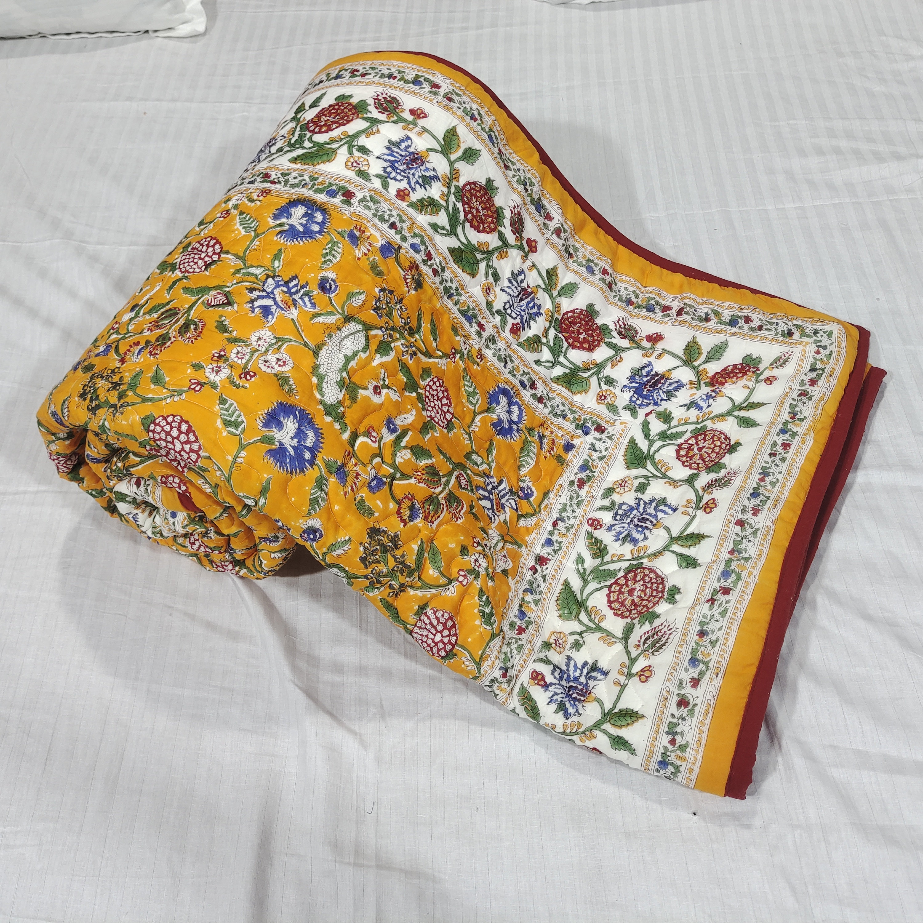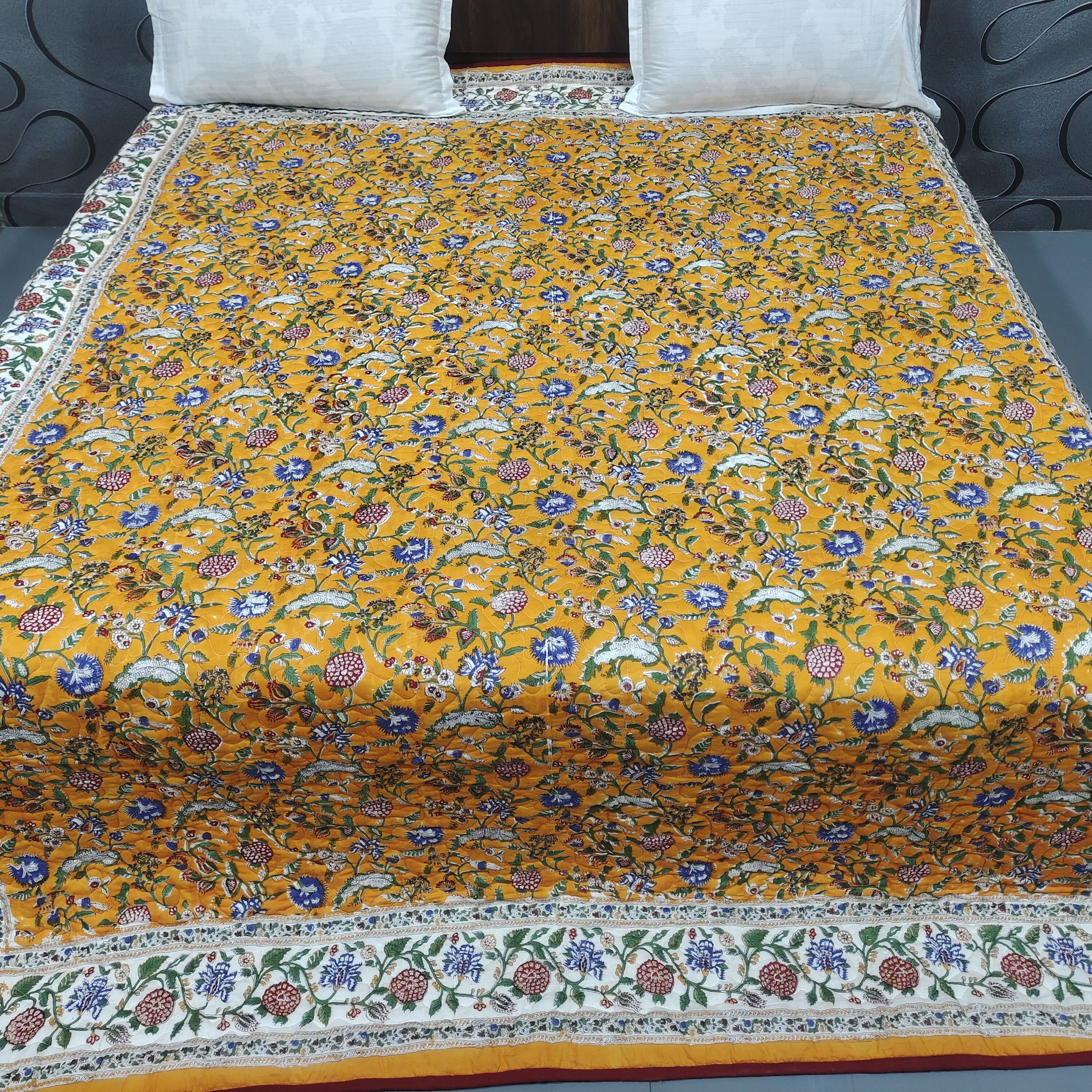 Hand Block Print Cotton Quilt: Reversible Floral Bedspread