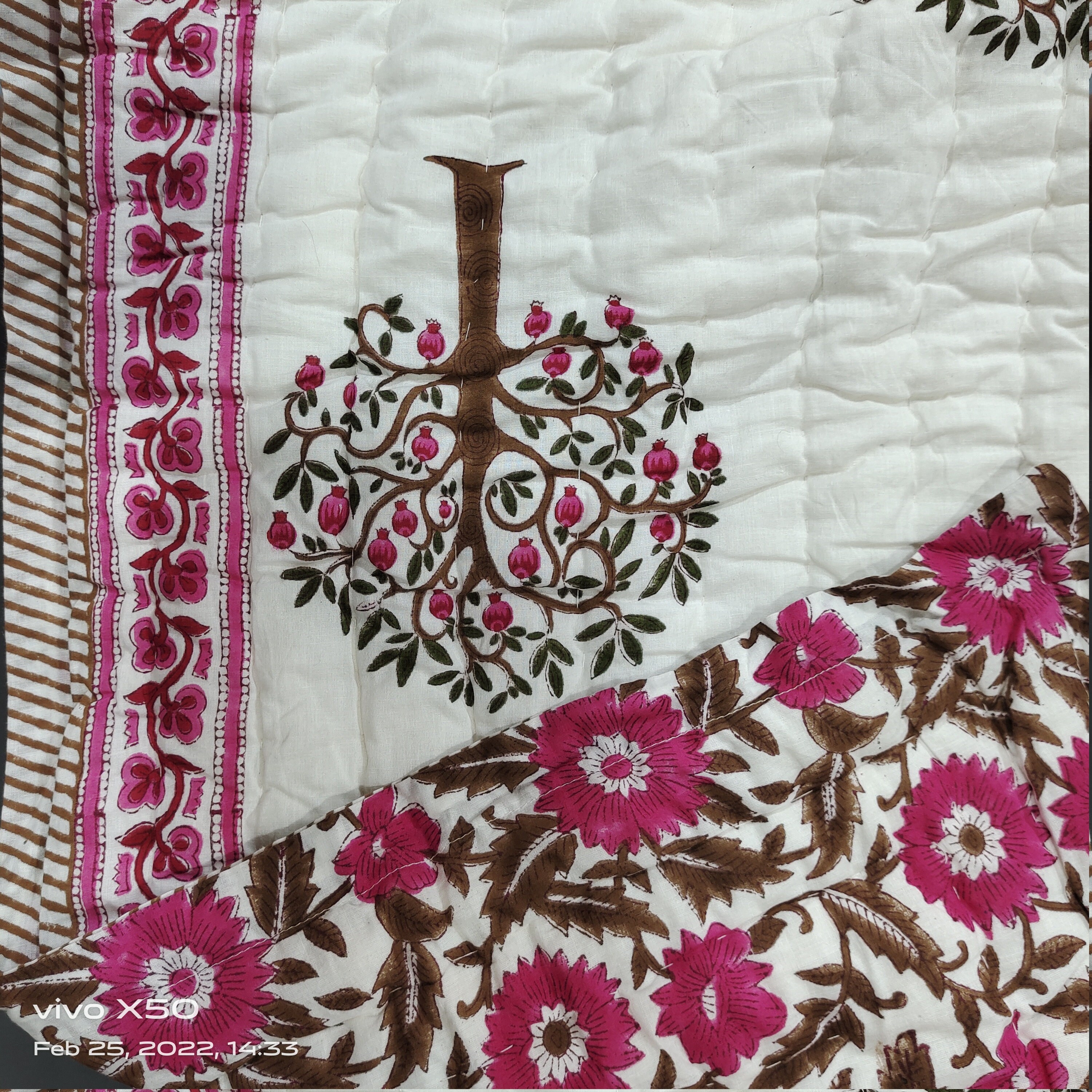Hand Block Print Cotton Queen Quilt: Tree of Life Kantha Blanket