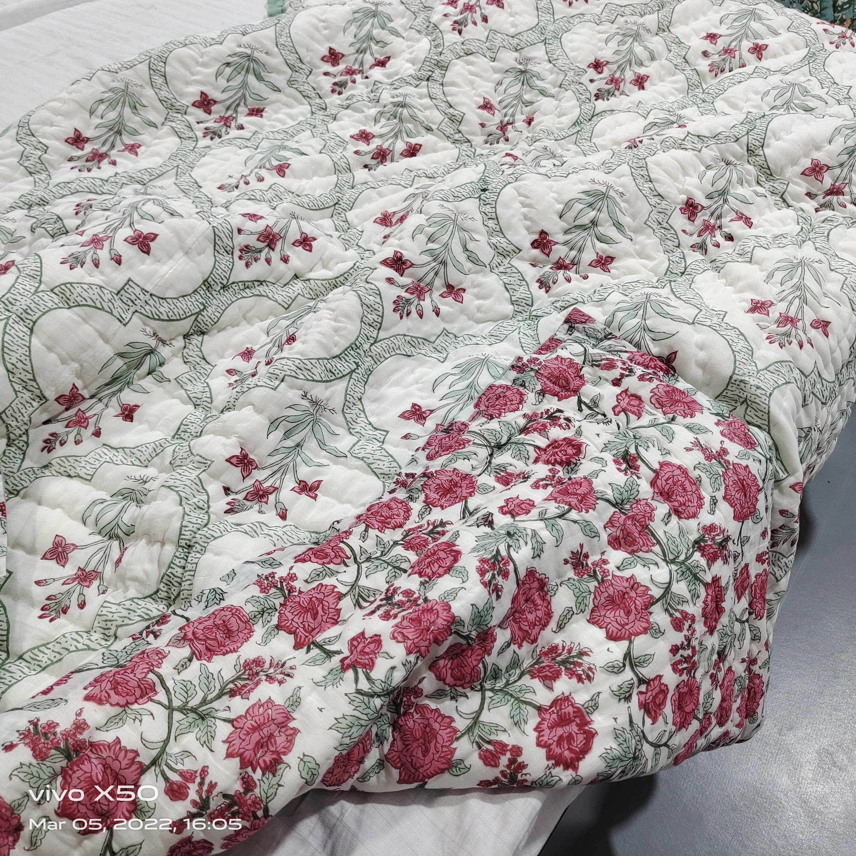 Hand Stitched Queen Quilt: Green & Pink Floral Block Print Cotton Bedding