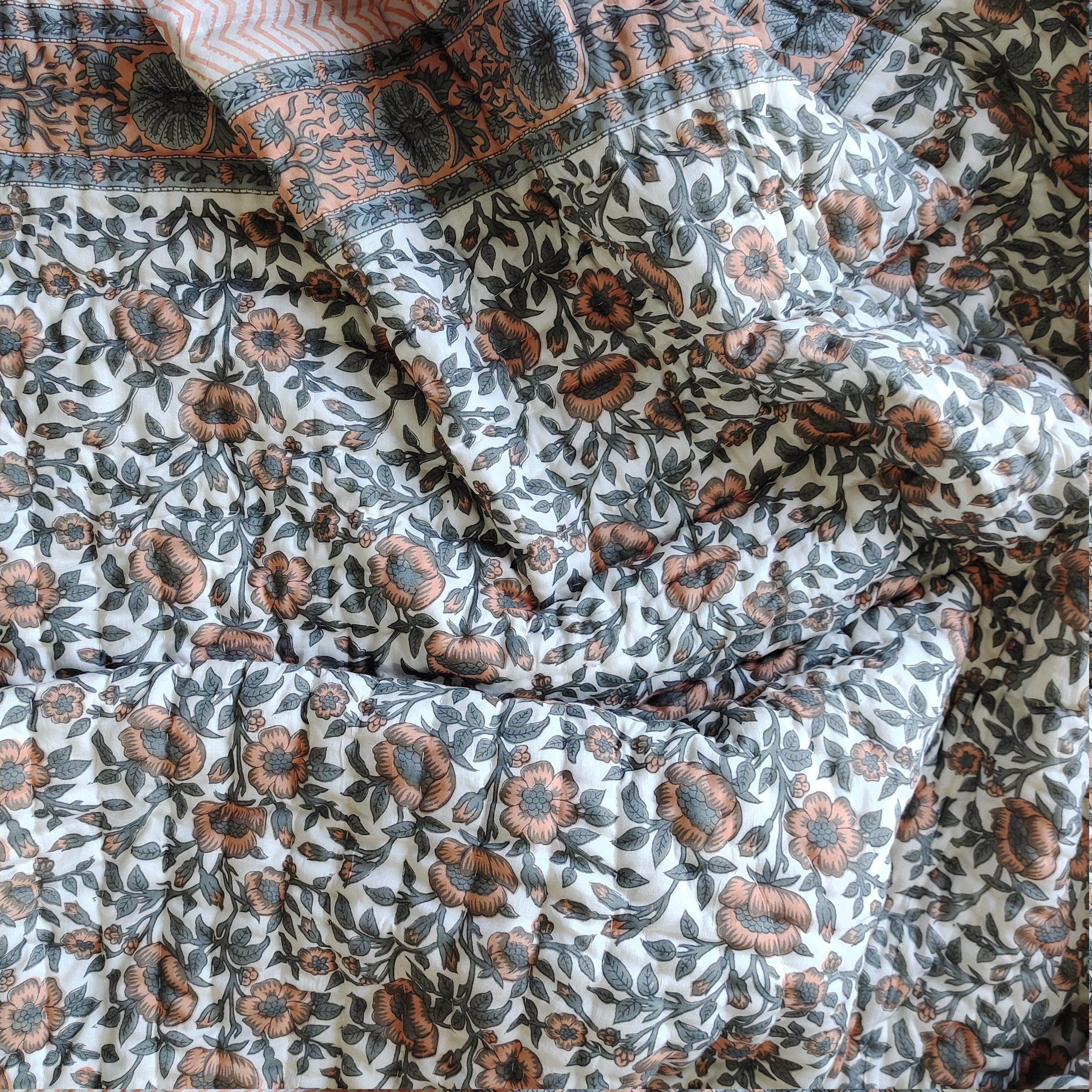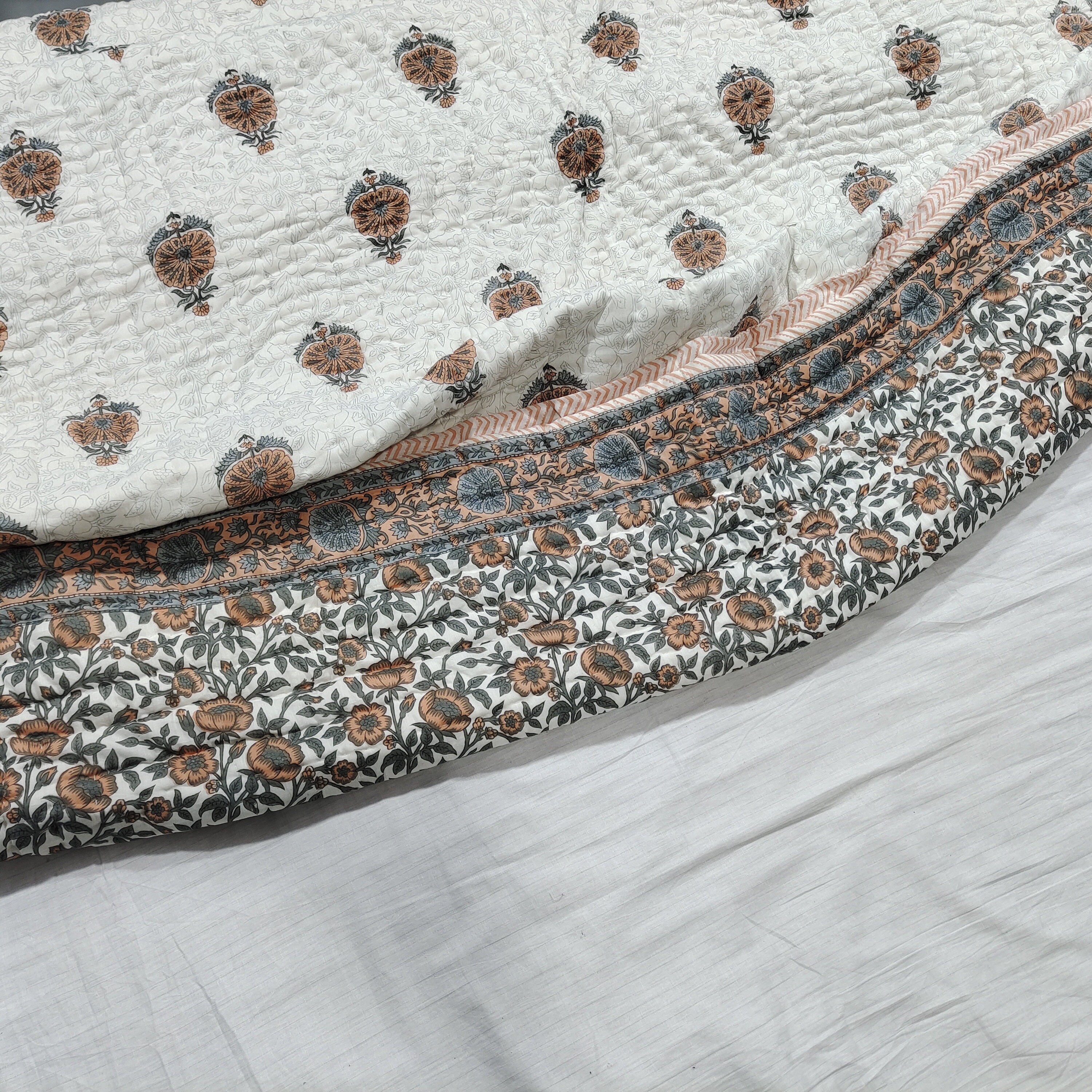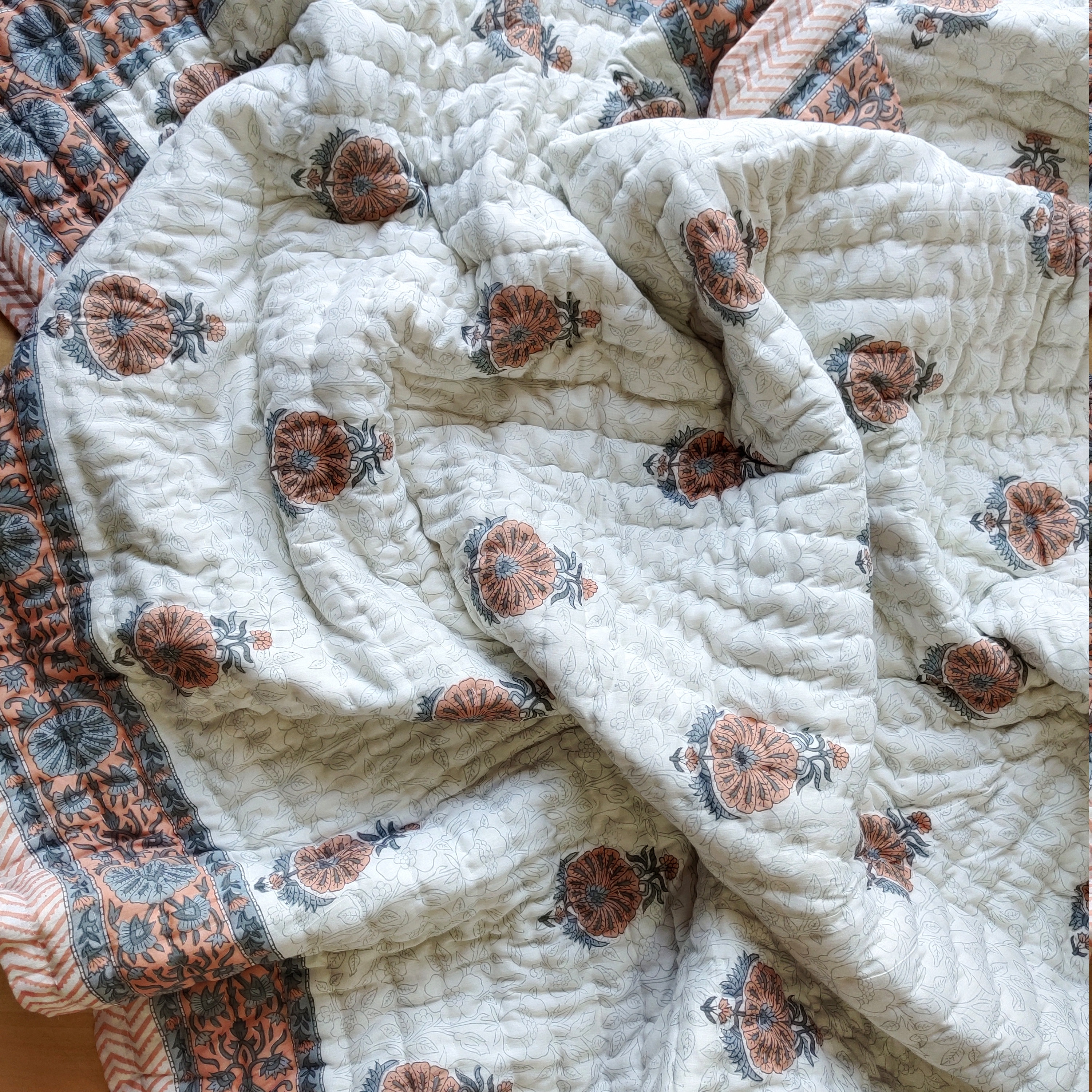 Floral Hand Block Print Cotton Quilt: Grey & Orange, 90x108 Inch