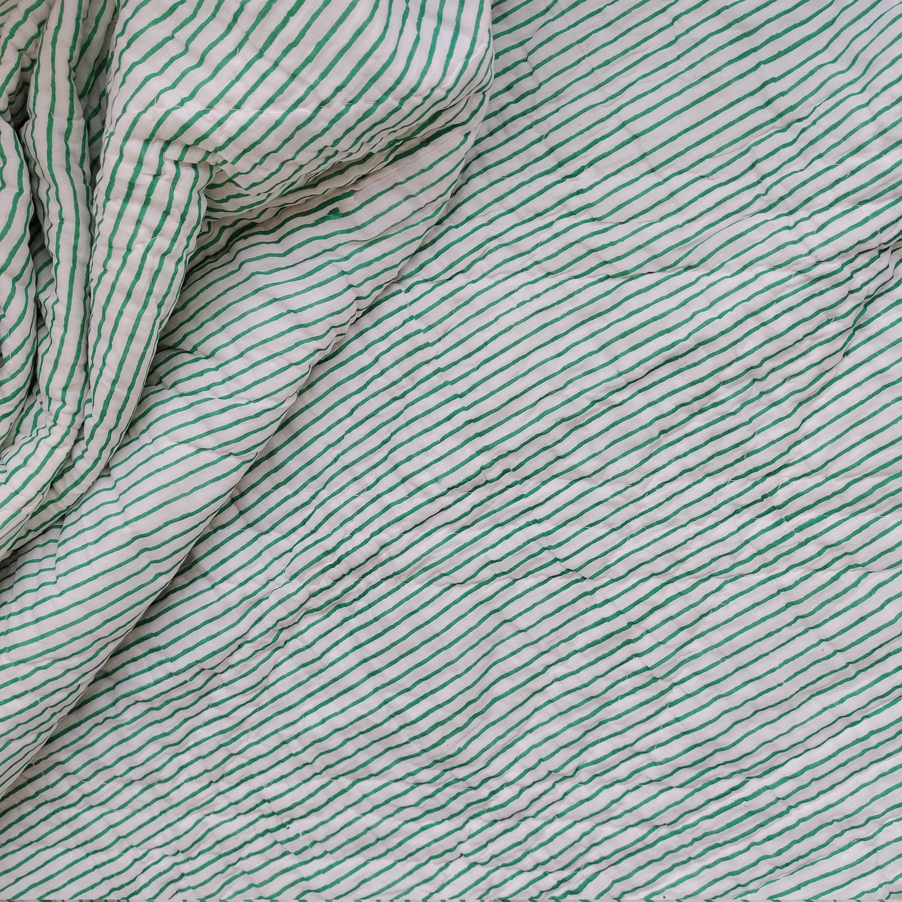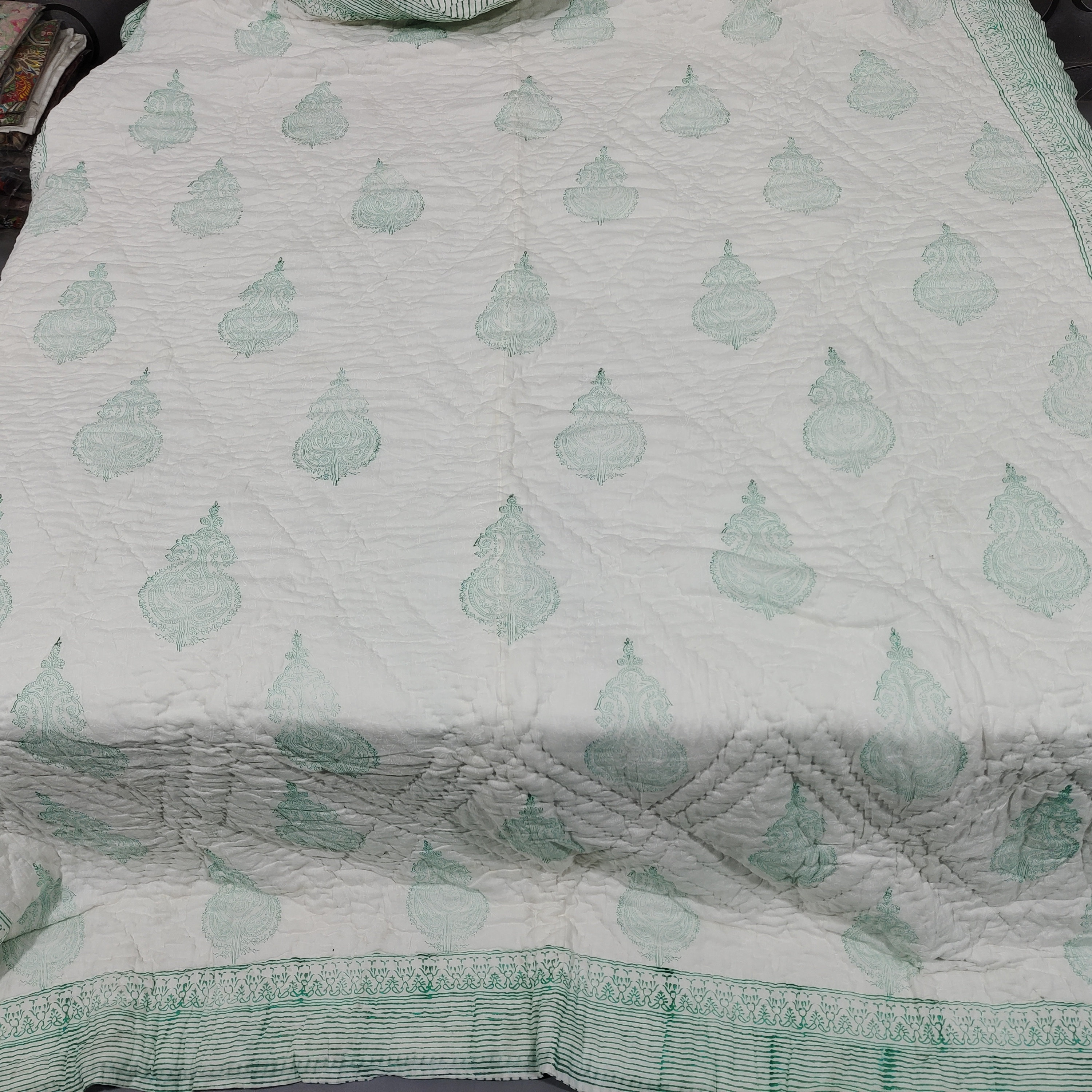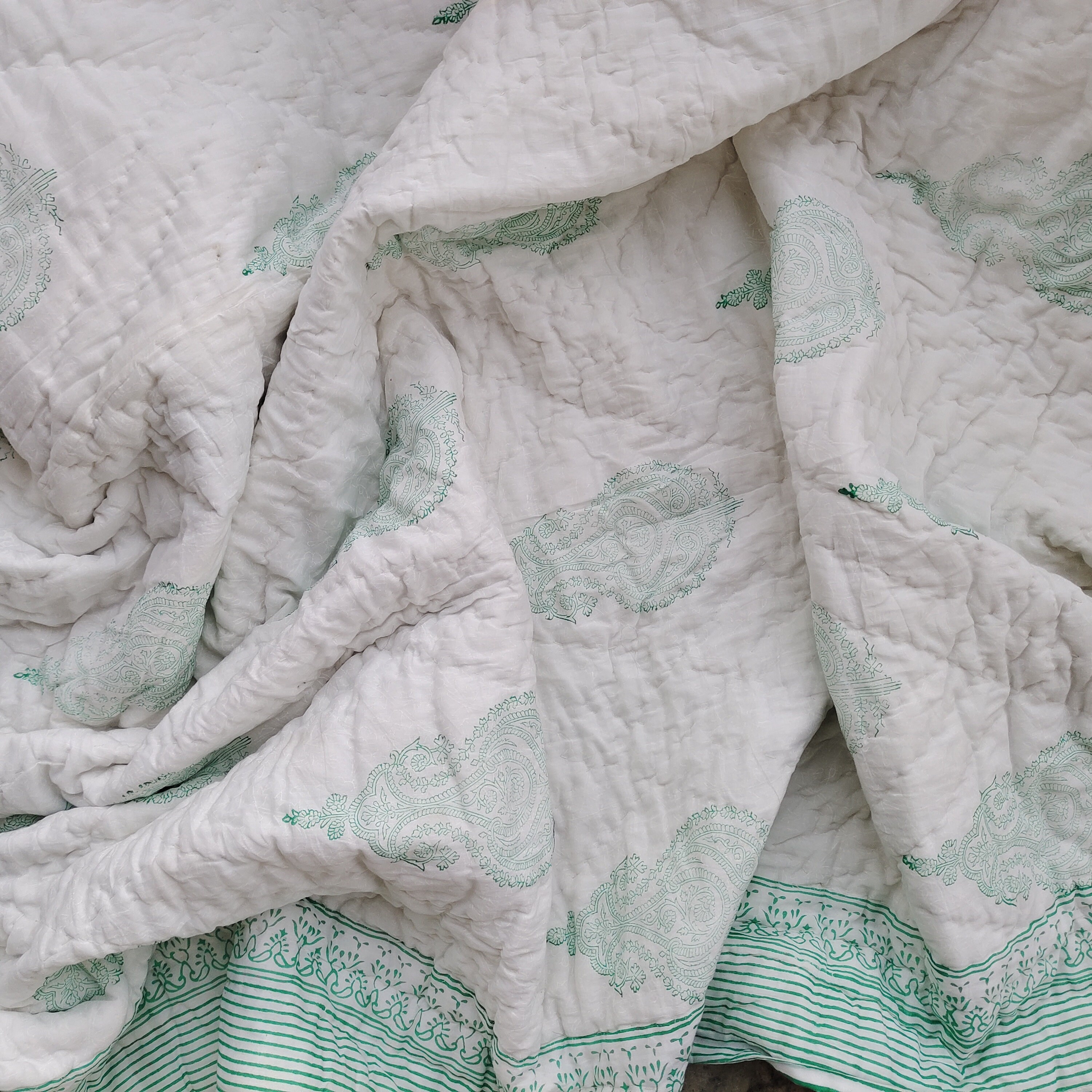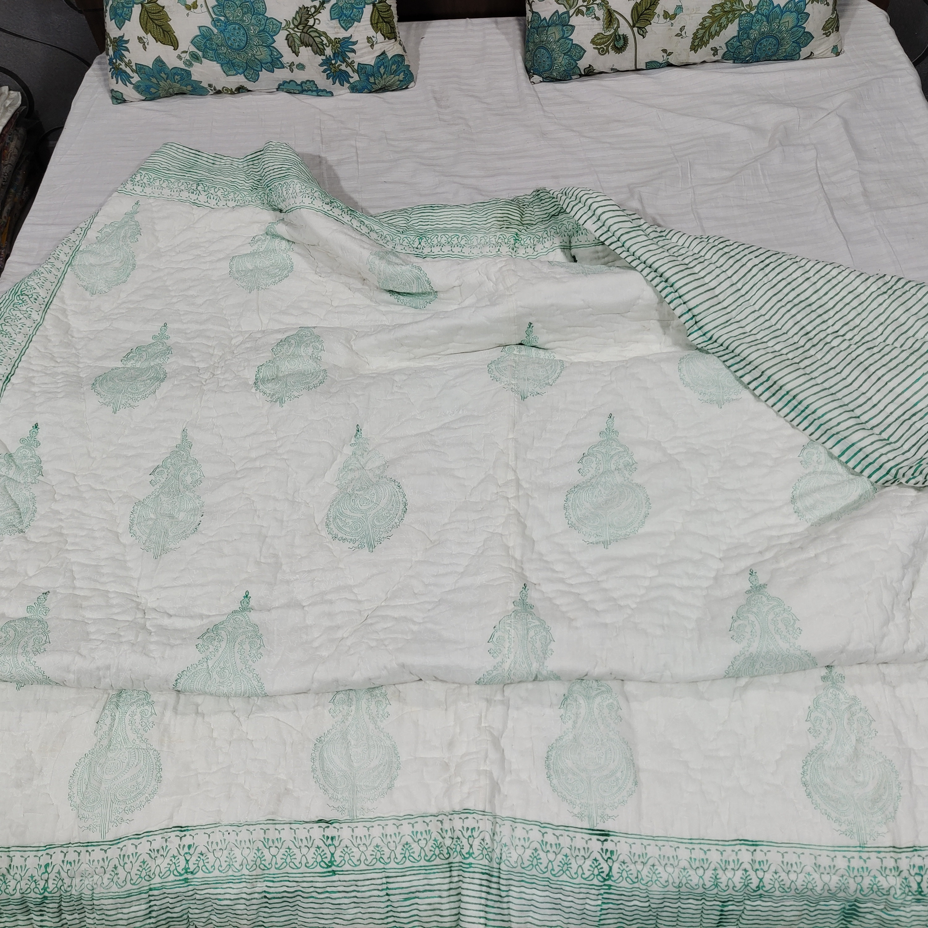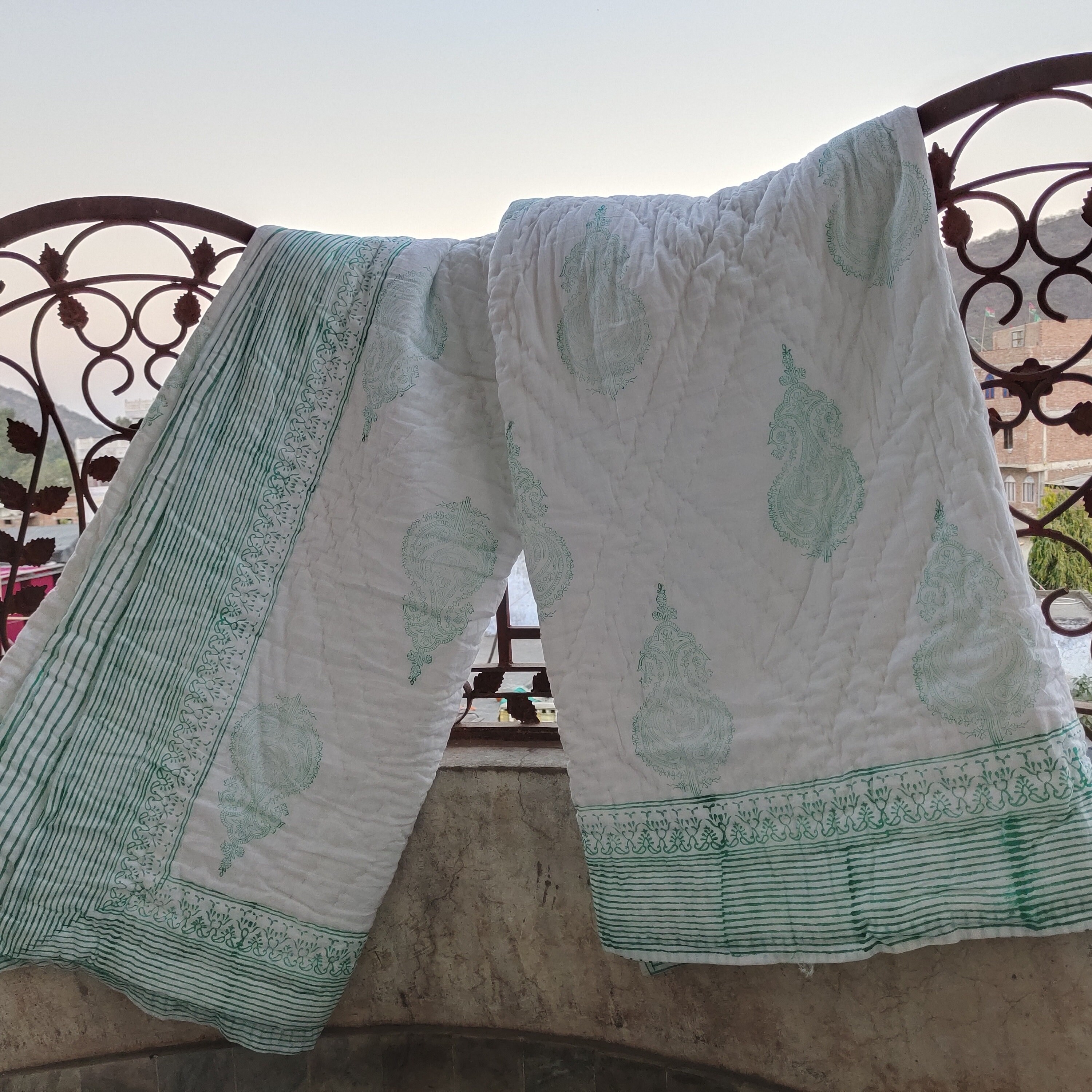 Green Floral Cotton Block Print Quilt: Hand Stitched Bed Cover