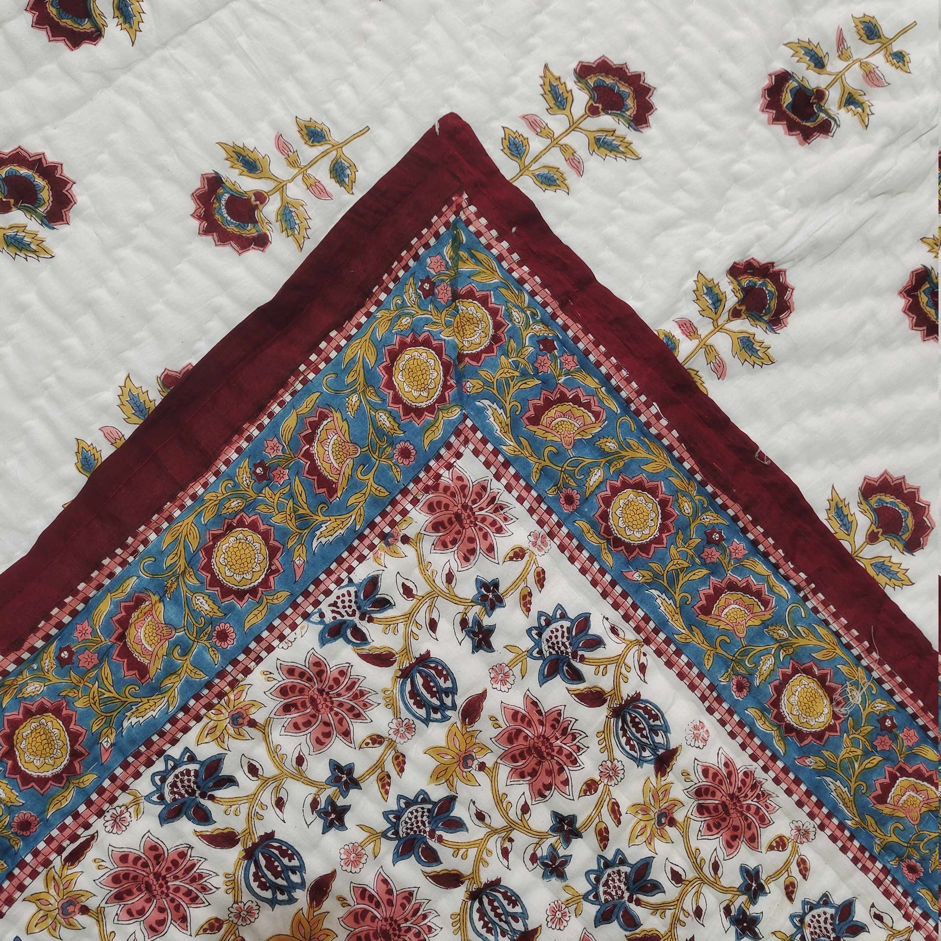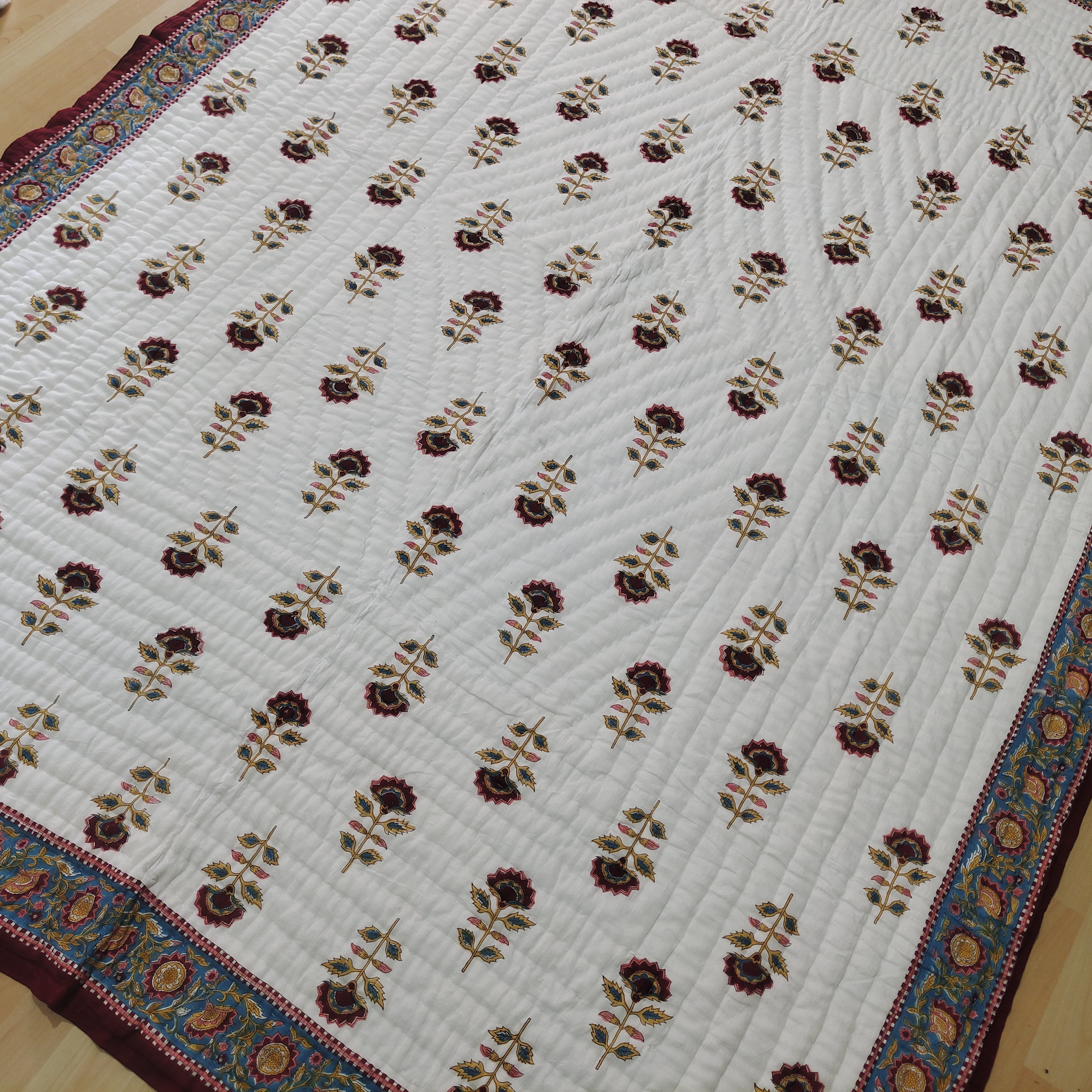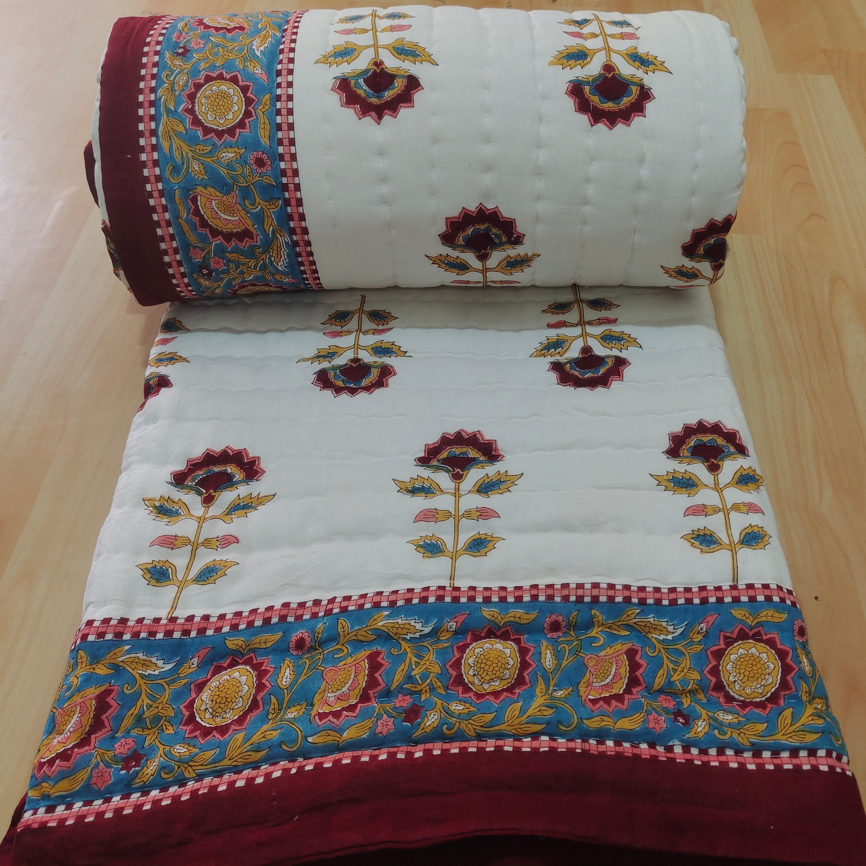 Hand Block Print Cotton Quilt: Boho Floral Bedding, Queen Size