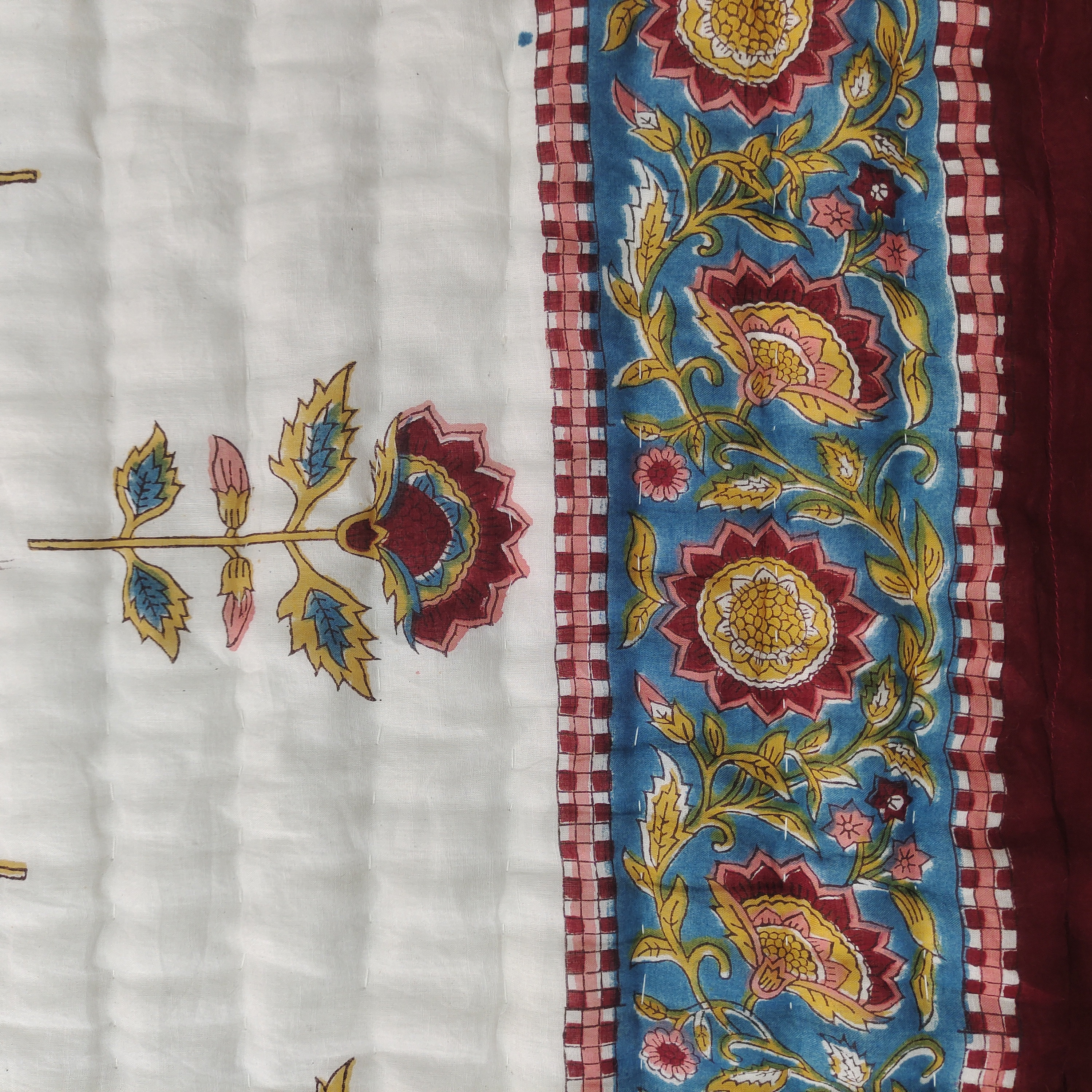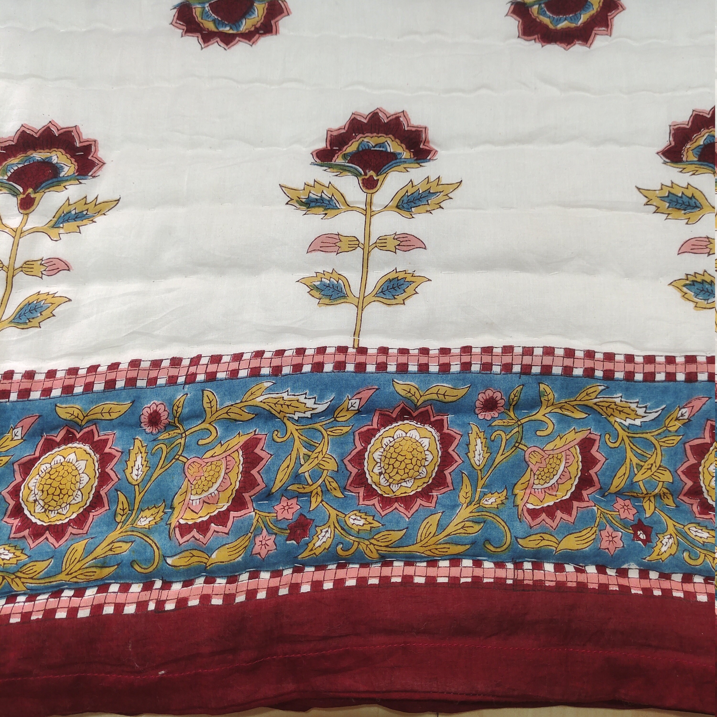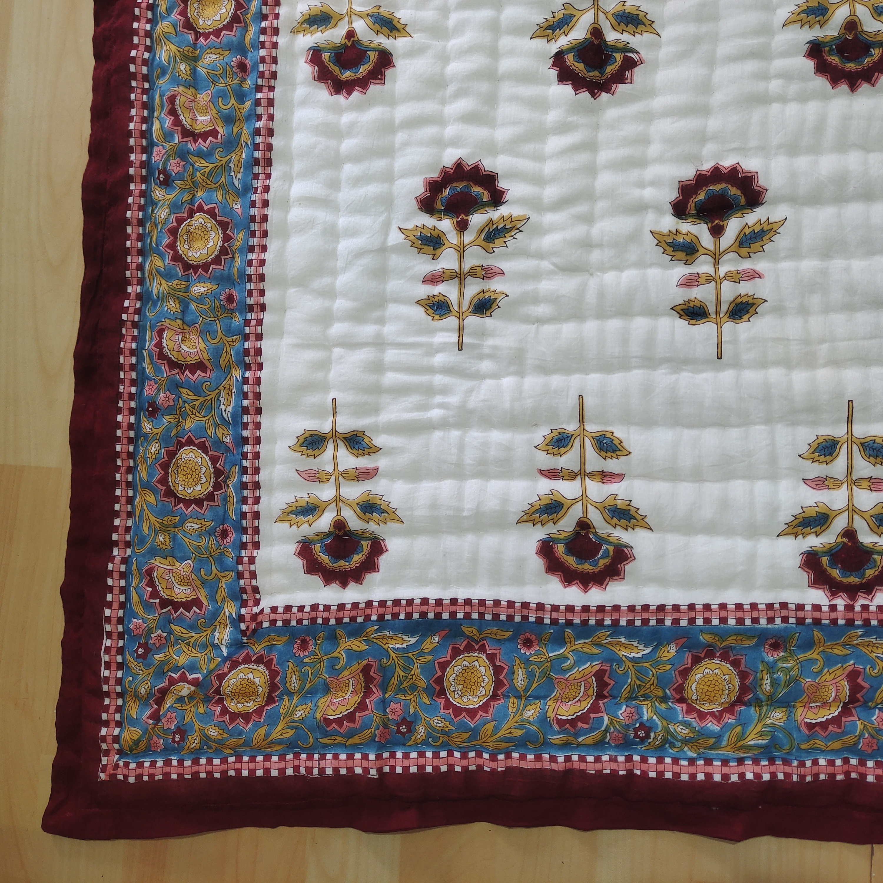 Hand Block Print Cotton Quilt: Boho Floral Bedding, Queen Size