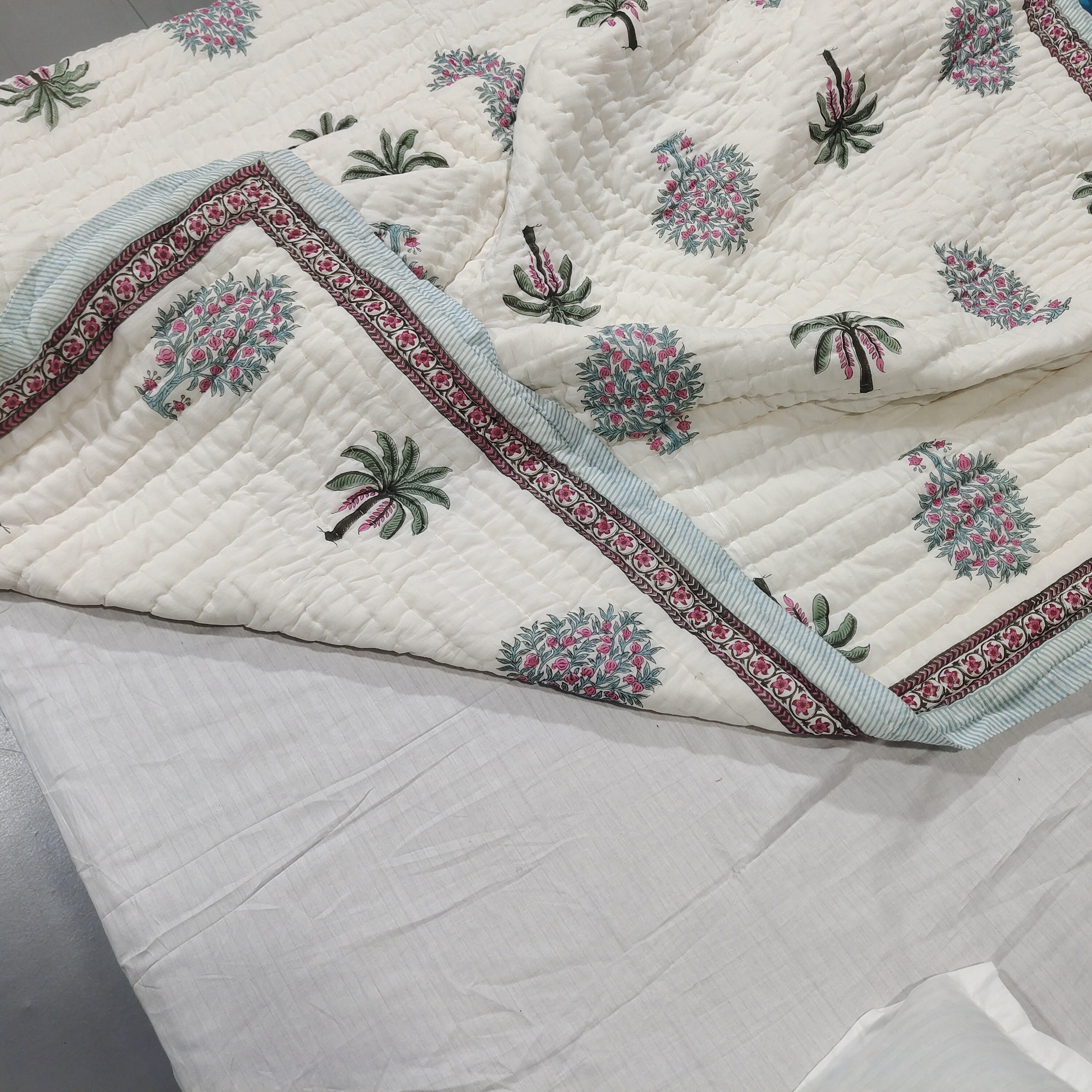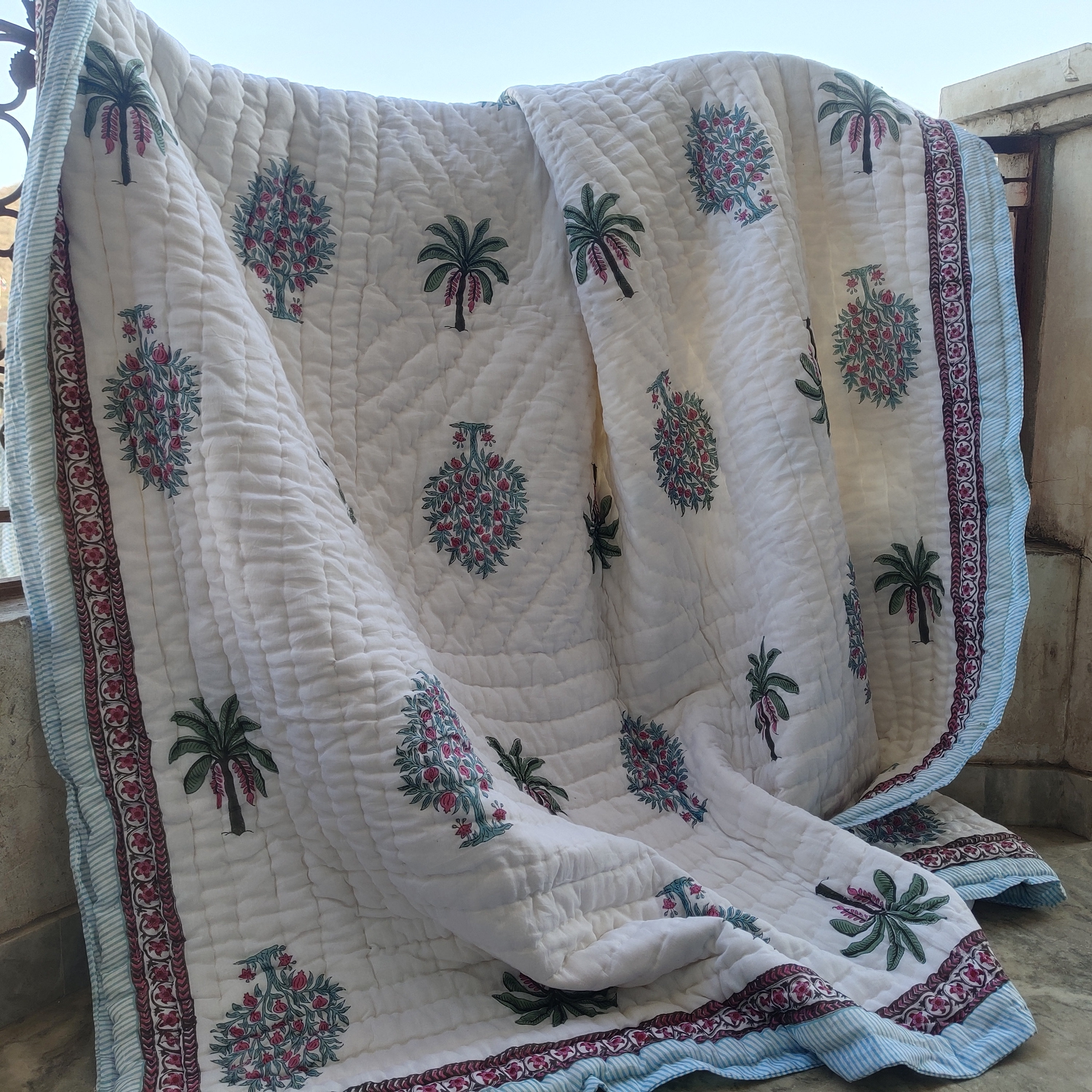 Hand Stitched Block Print Quilt: Palm Tree Cotton Queen Blanket