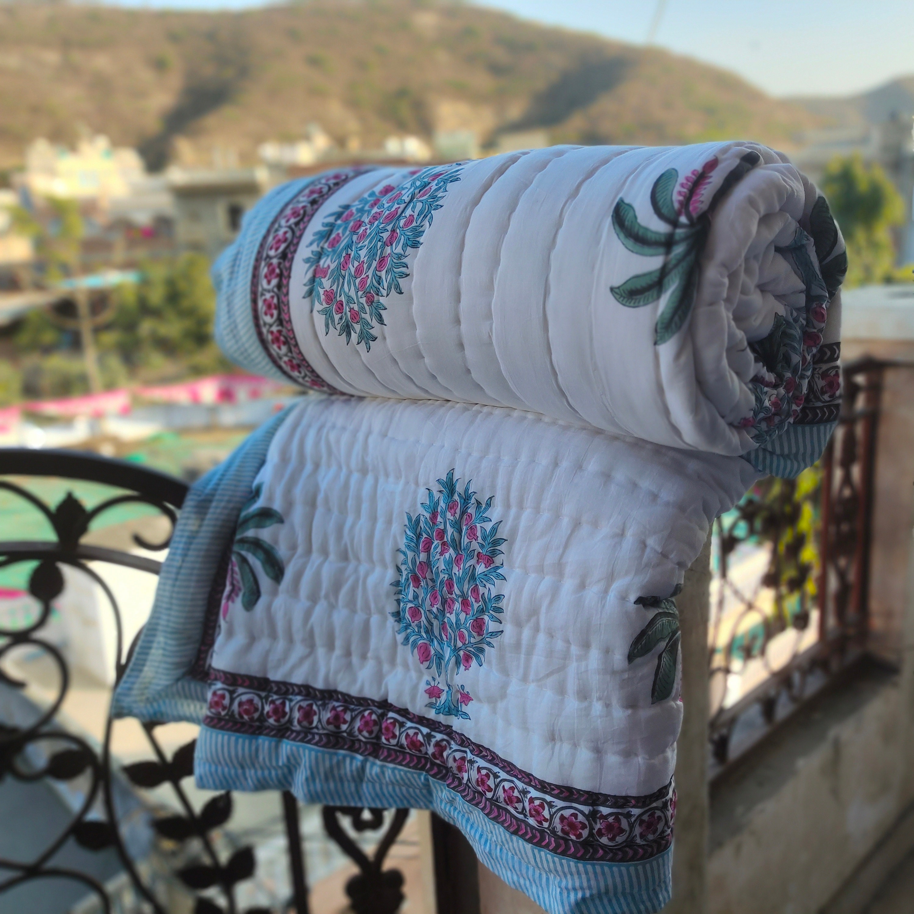 Indulge in the artistry of traditional craftsmanship with our exquisite Hand Stitched Hand Block Print Quilt. Each quilt is a masterpiece of skill and creativity, meticulously crafted by skilled artisans in Jaipur, India. From the intricate hand block printing to the careful stitching, every step in the process is a labor of love, resulting in a quilt that's as beautiful as it is functional.