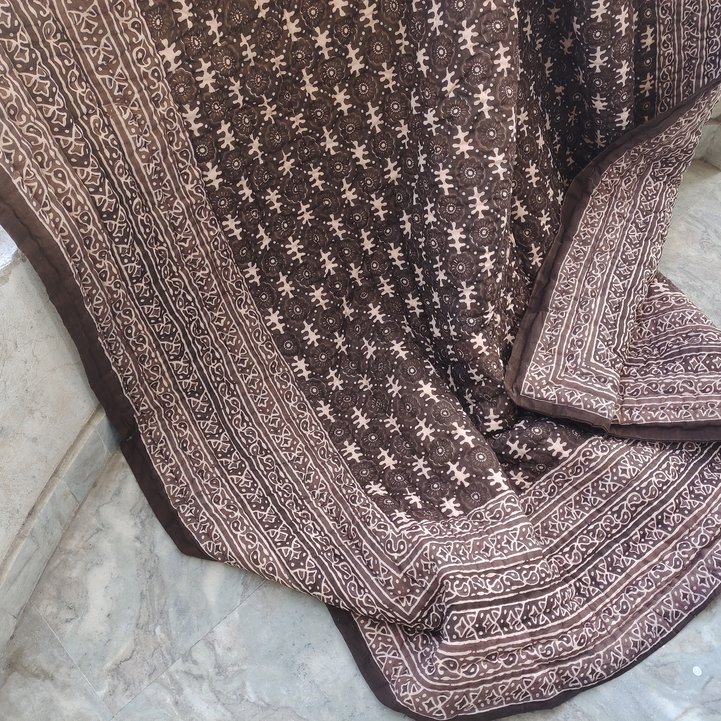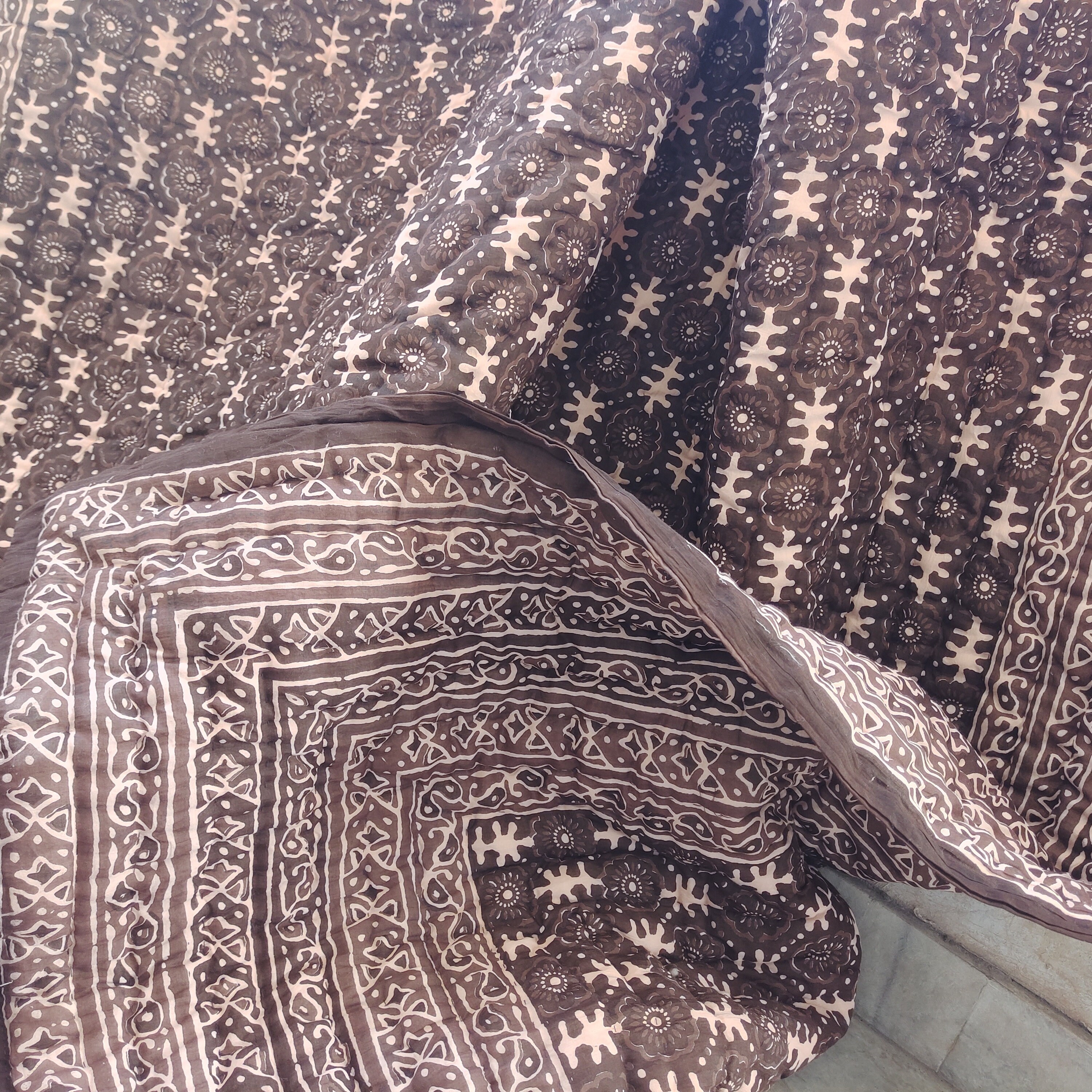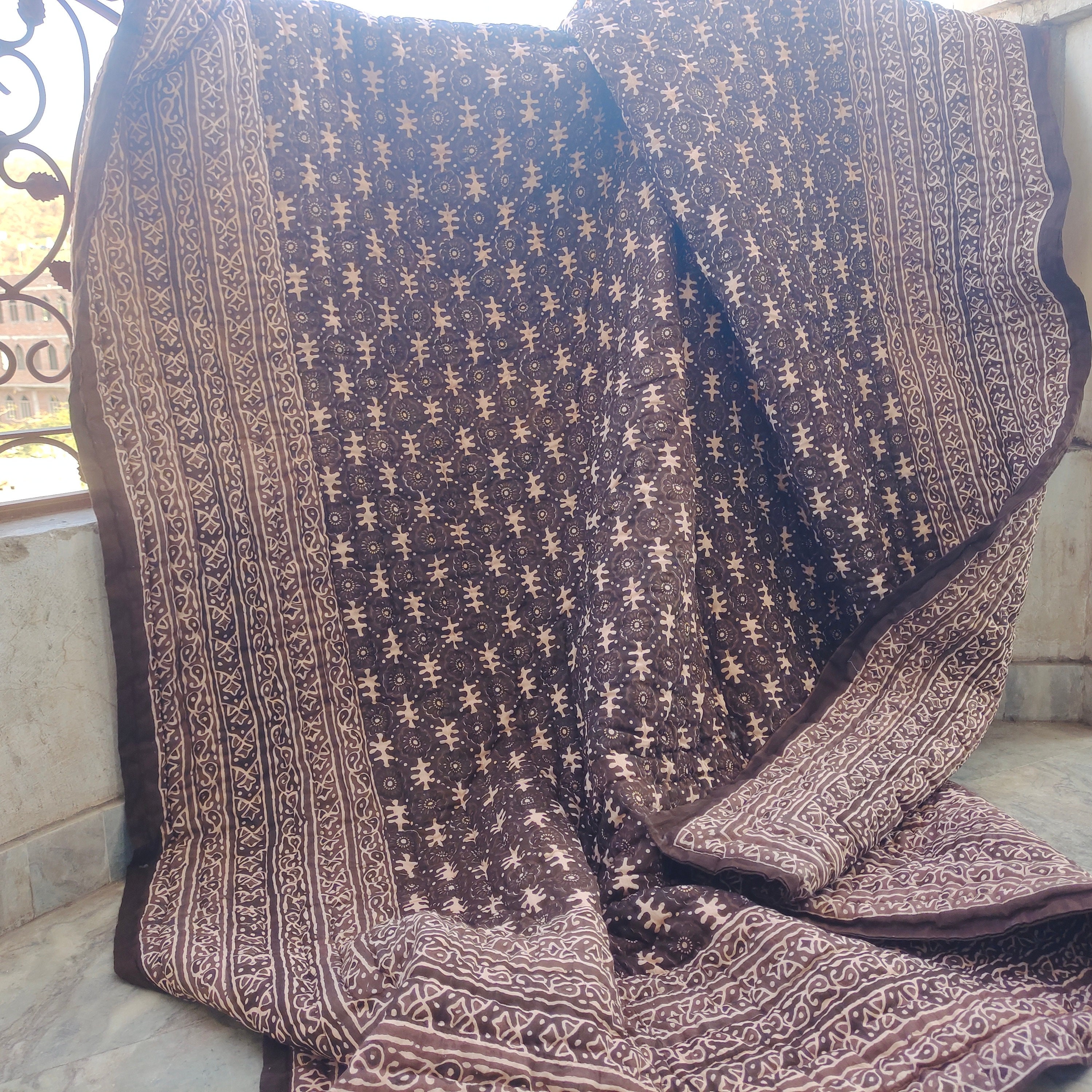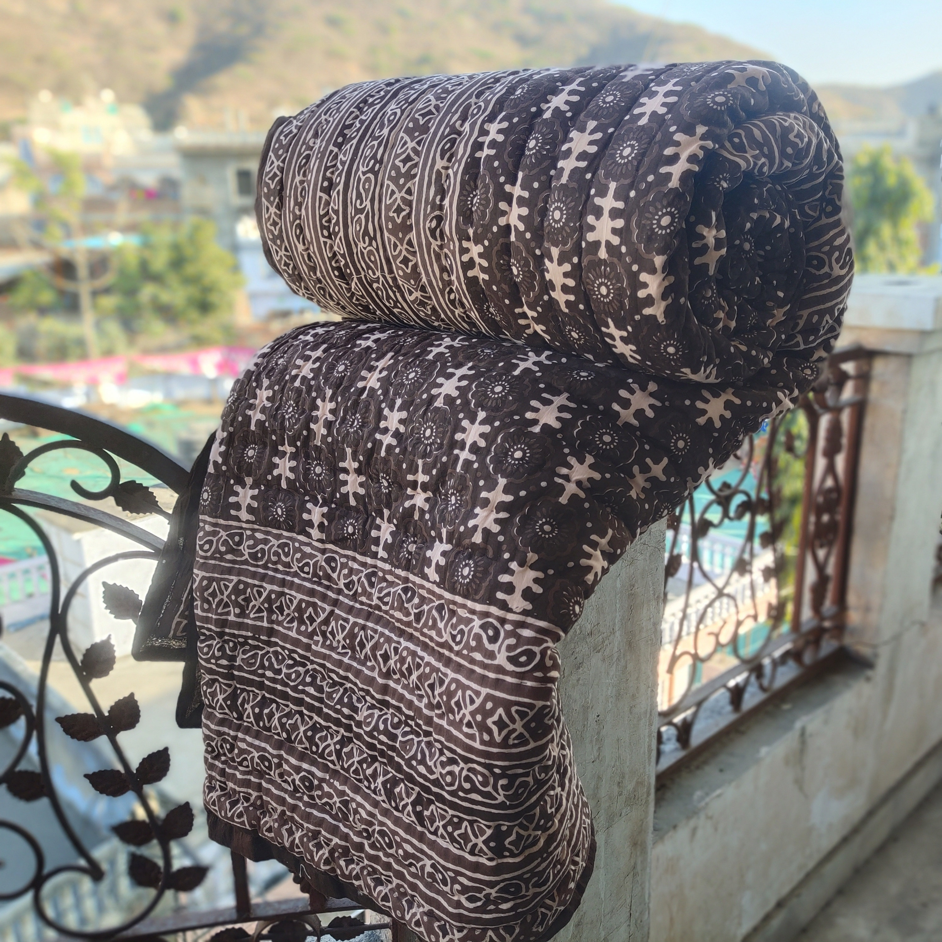 Hand Block Print Cotton Quilt: Reversible Bagru Blanket, US Queen Size