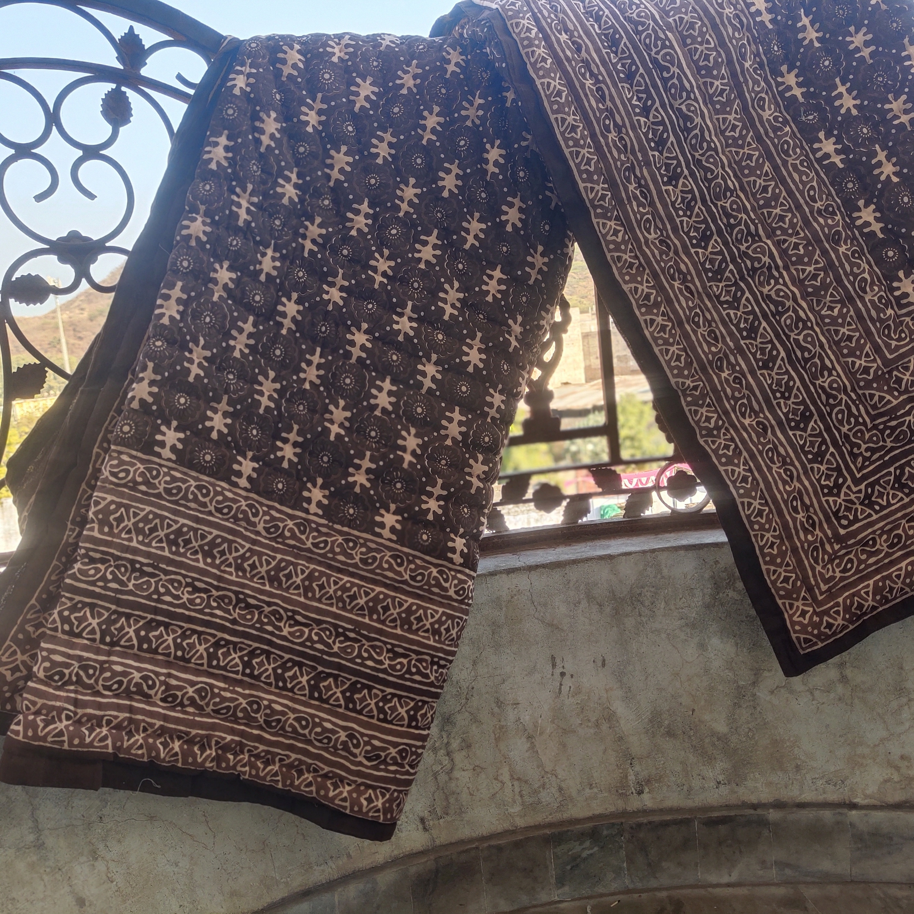 Hand Block Printing: Skilled artisans carve intricate designs onto wooden blocks, which are then dipped in natural dyes and stamped onto the fabric with precision. This ancient technique results in unique patterns and vibrant colors that are characteristic of hand block printing.