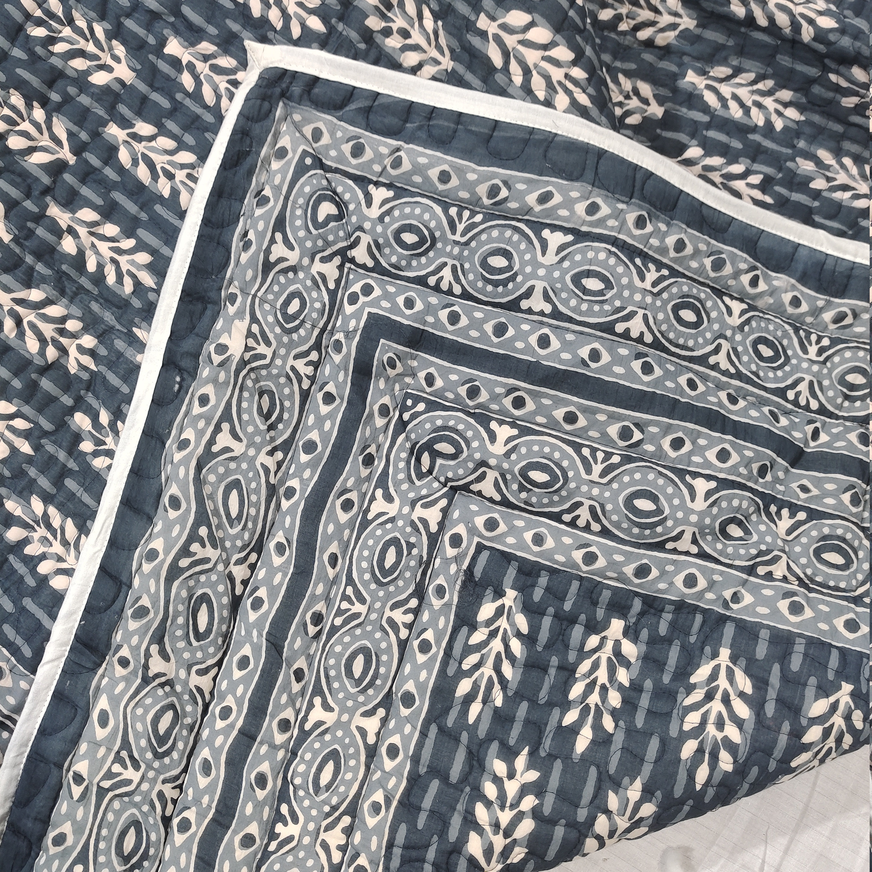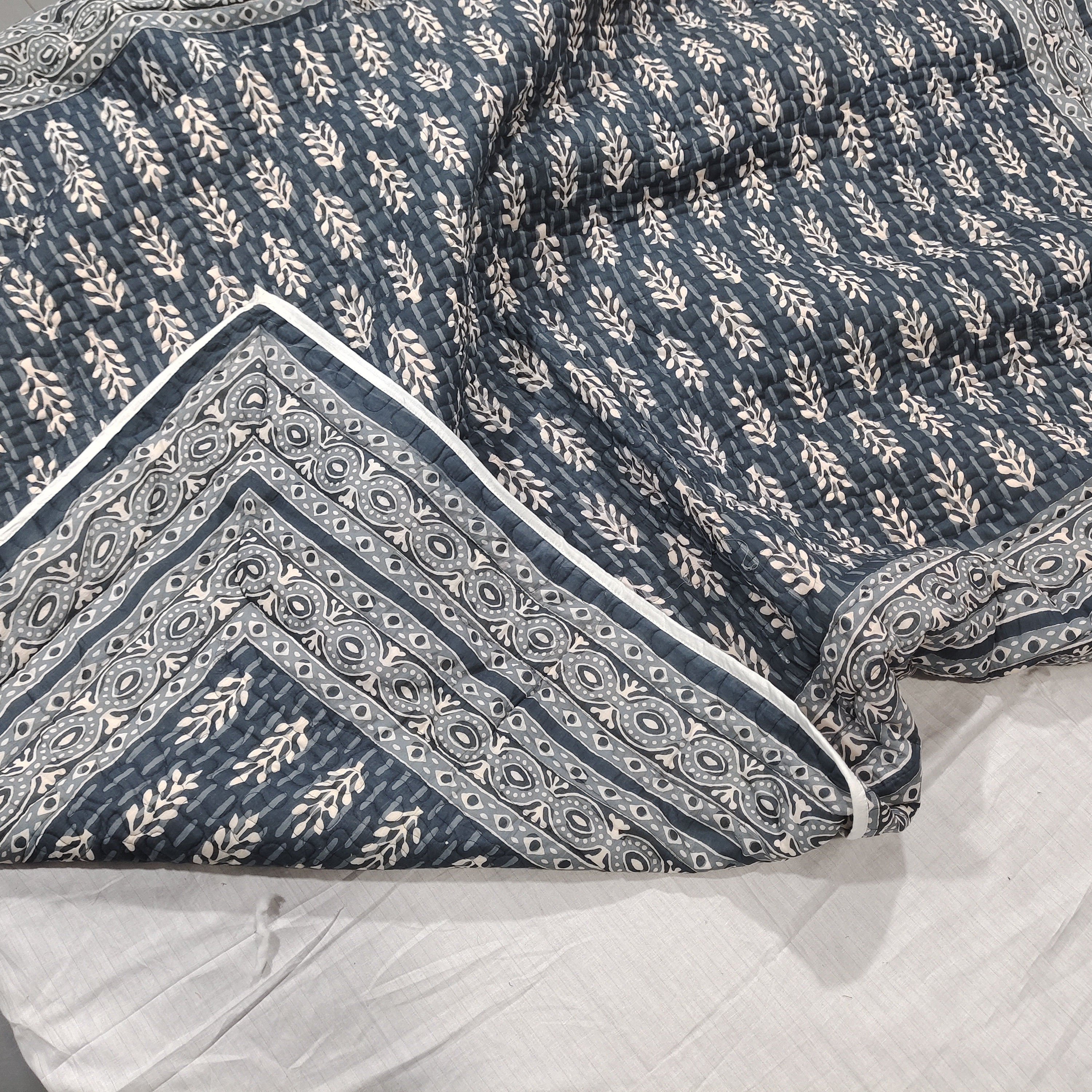 In conclusion, this machine-stitched quilt with zigzag patterns, filled with a surgical cotton sheet of 200 GSM, featuring a reversible hand block print, is a harmonious blend of craftsmanship and practicality. Its decorative elements and thoughtful construction make it a stylish yet functional addition to any bedroom. The quilt's machine washability adds a layer of convenience, ensuring that it remains a cherished and enduring part of daily lifeInternational Shipping & Customs Notice We are proud to ship our handmade cotton quilts worldwide from Jaipur, India. Please be advised: