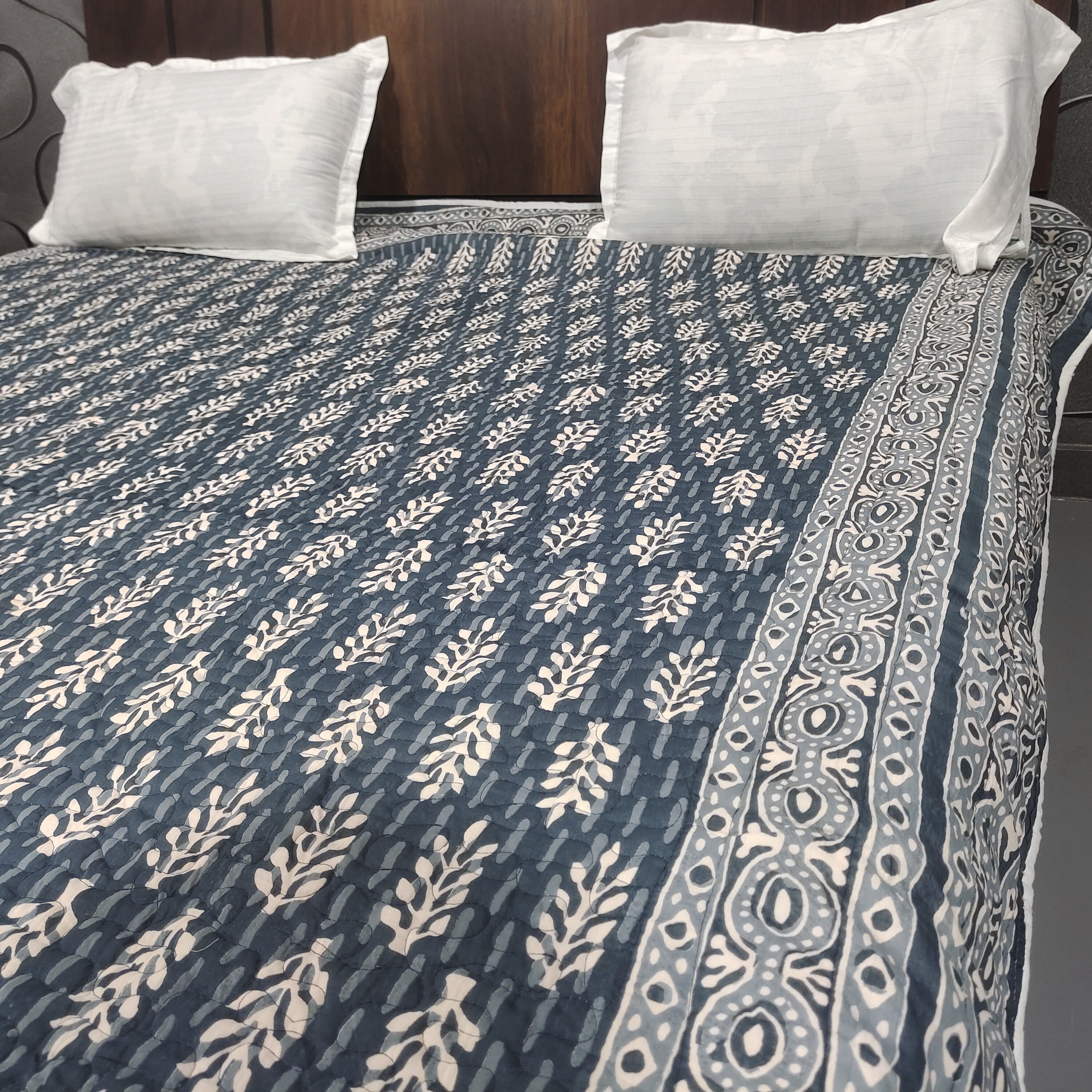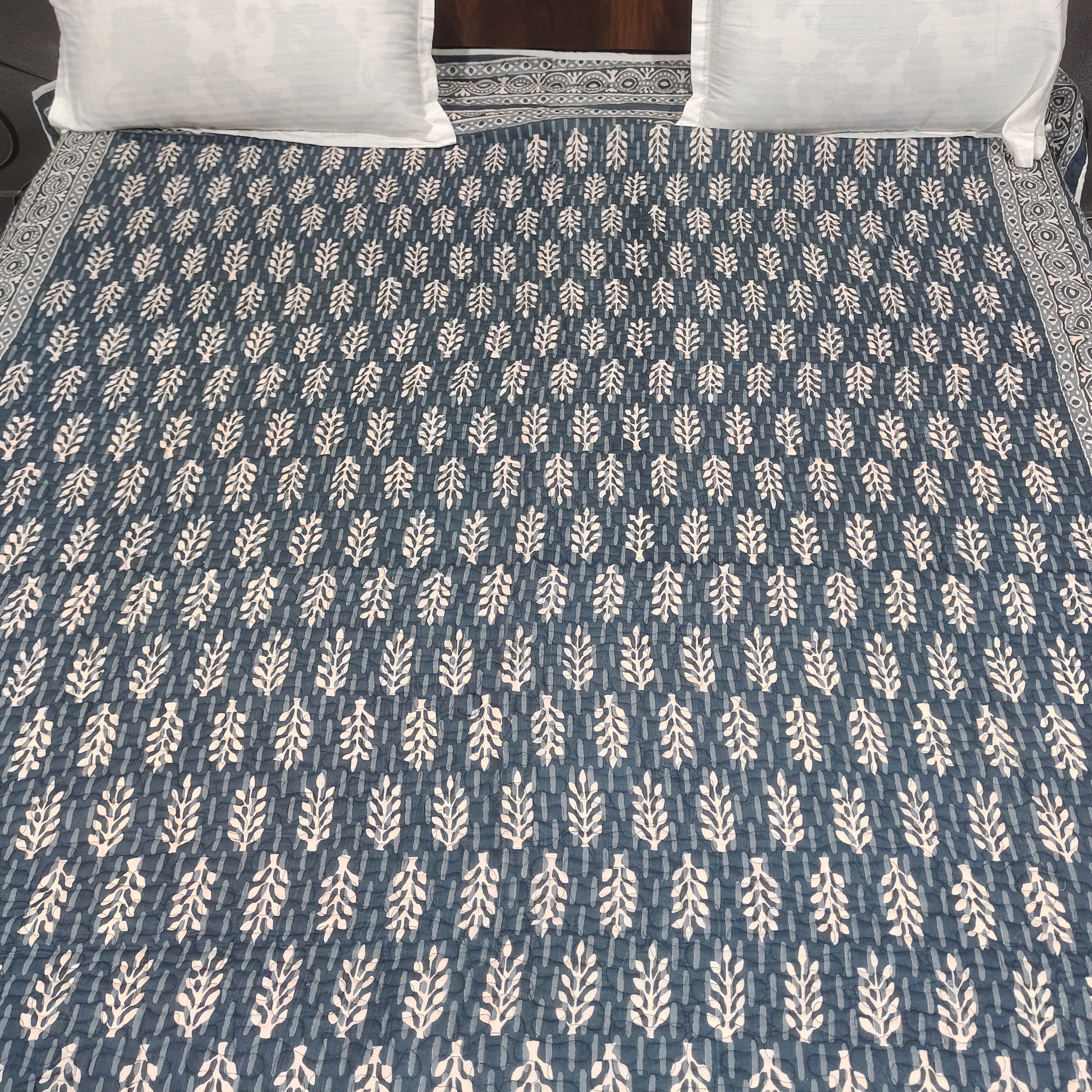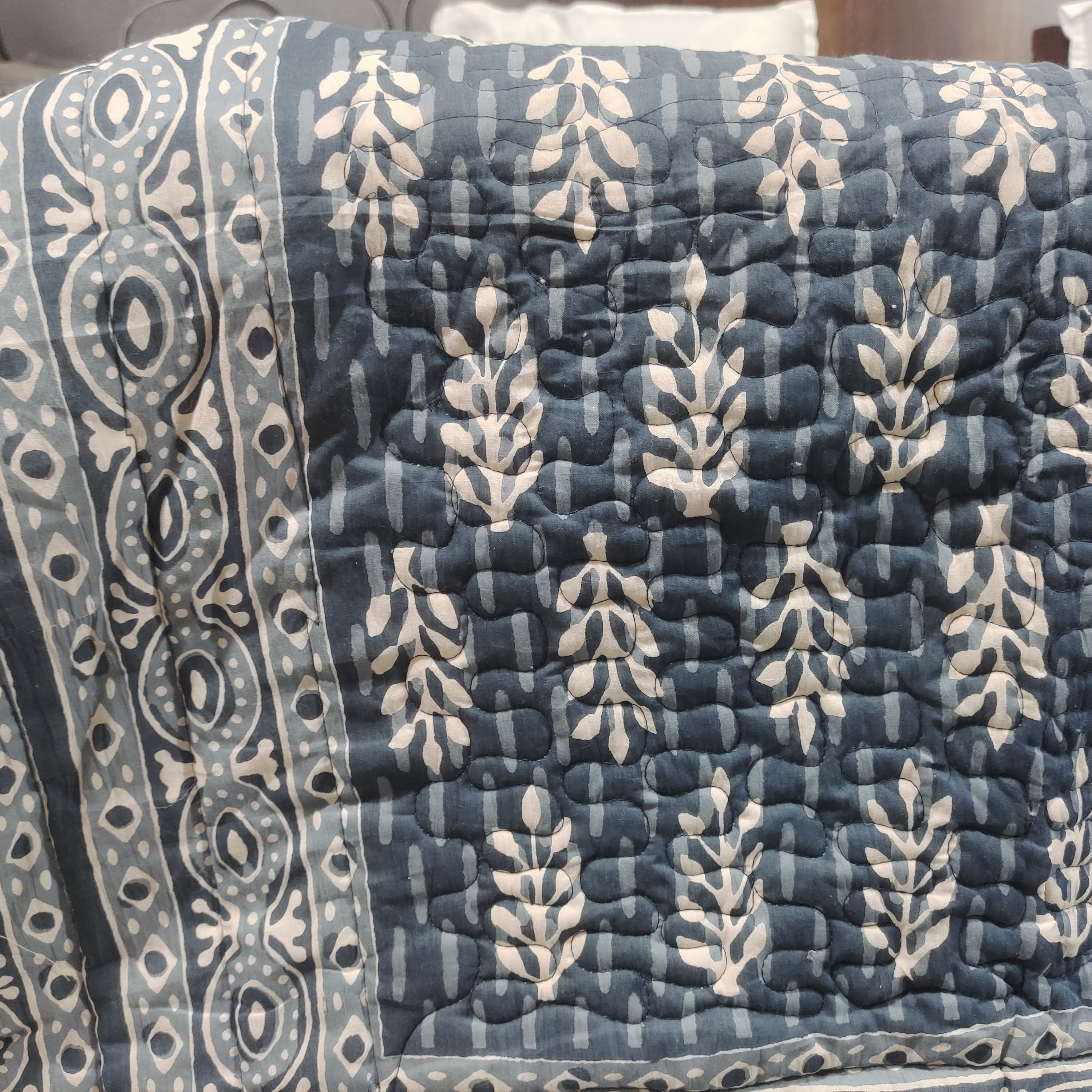 One distinctive feature of this quilt is its reversible hand block print. This traditional printing technique adds a unique and artistic touch to the quilt, making it not only a functional bedding item but also a piece of aesthetic appeal. Hand block printing involves skilled artisans carving intricate designs onto wooden blocks, which are then dipped in dye and stamped onto the fabric.