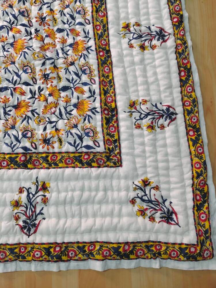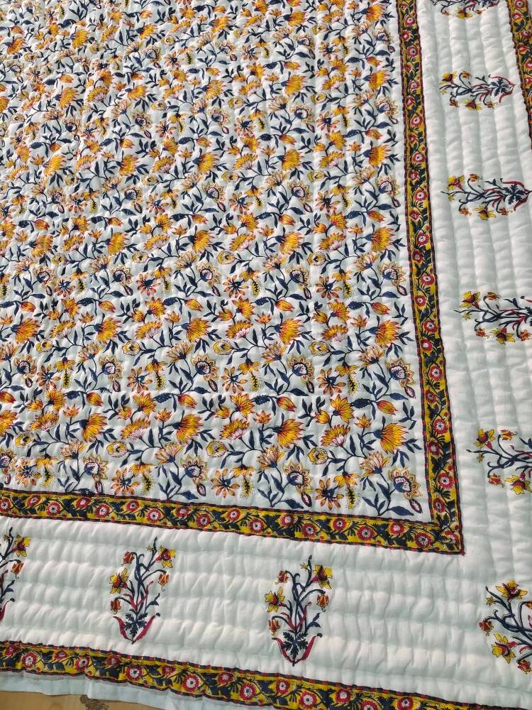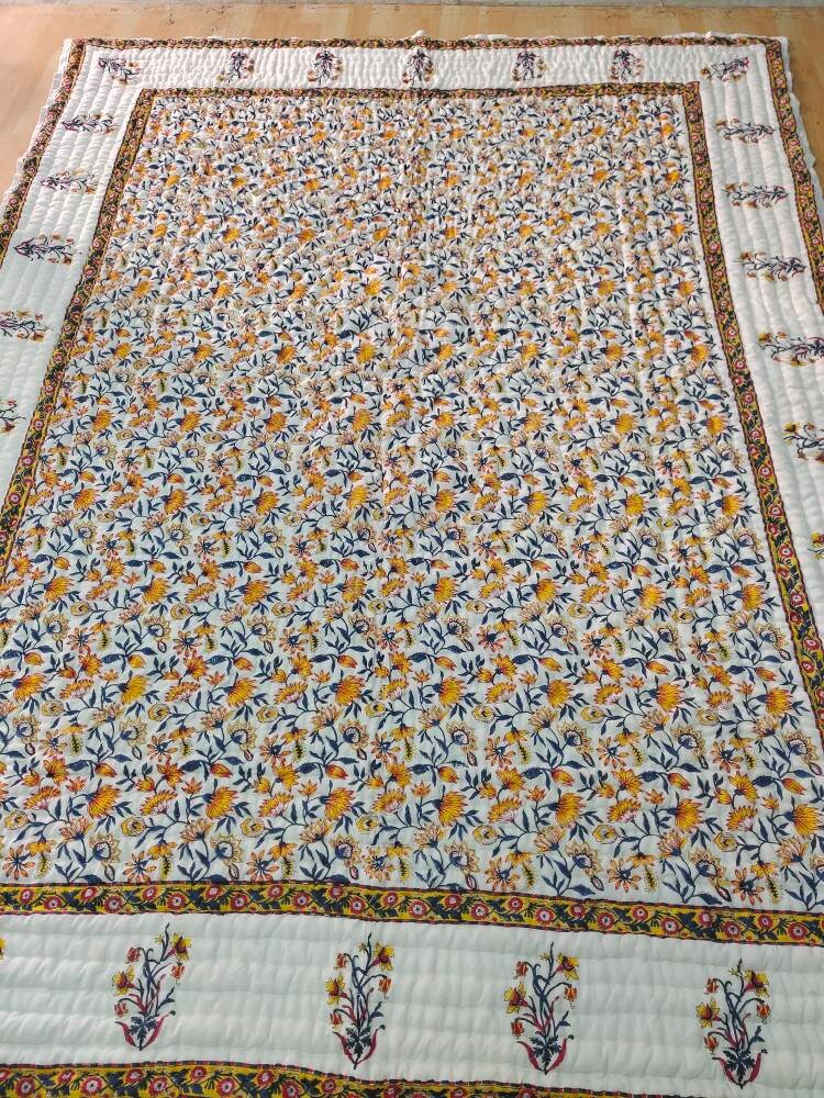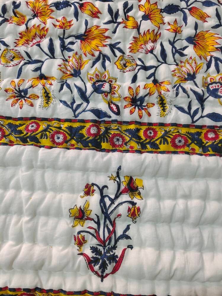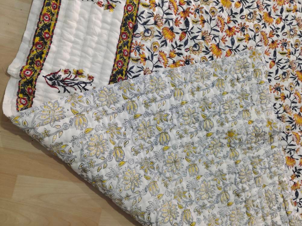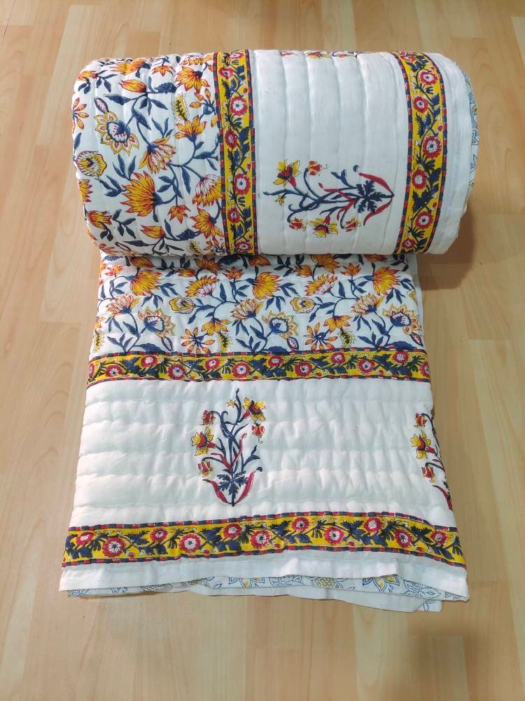 Indulge in the artistry of traditional craftsmanship with our exquisite Hand Stitched Hand Block Print Quilt. Each quilt is a masterpiece of skill and creativity, meticulously crafted by skilled artisans in Jaipur, India. From the intricate hand block printing to the careful stitching, every step in the process is a labor of love, resulting in a quilt that's as beautiful as it is functional.