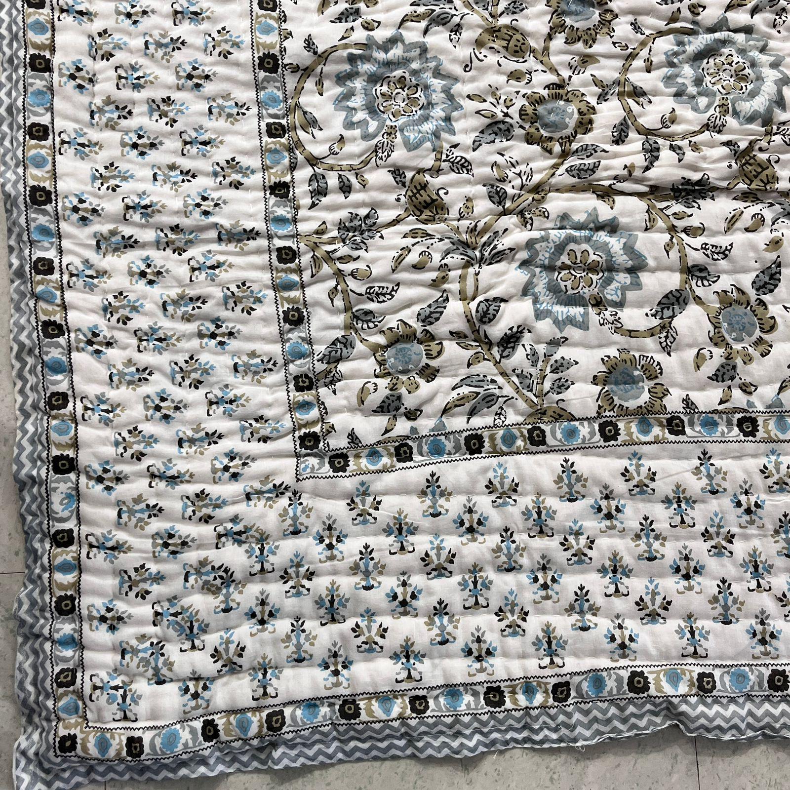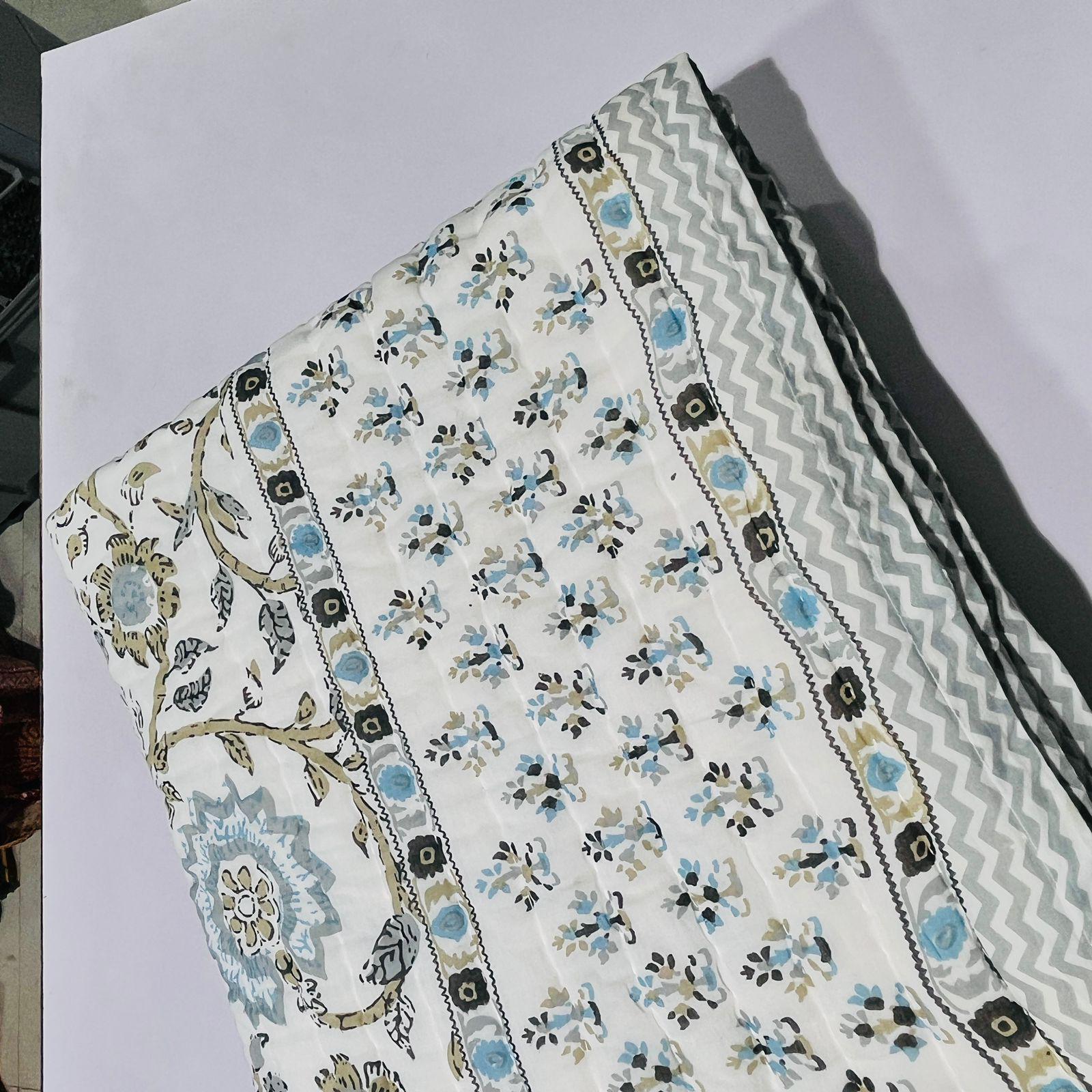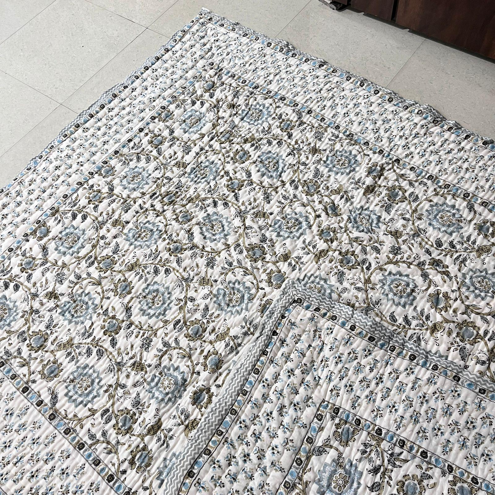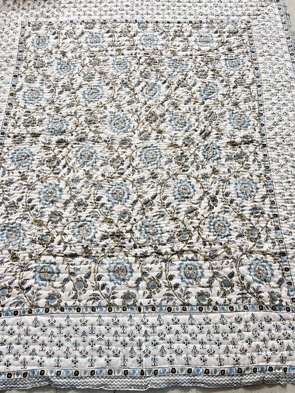 Jaipuri Hand Block Print Quilt: Queen Size Reversible Floral Razai