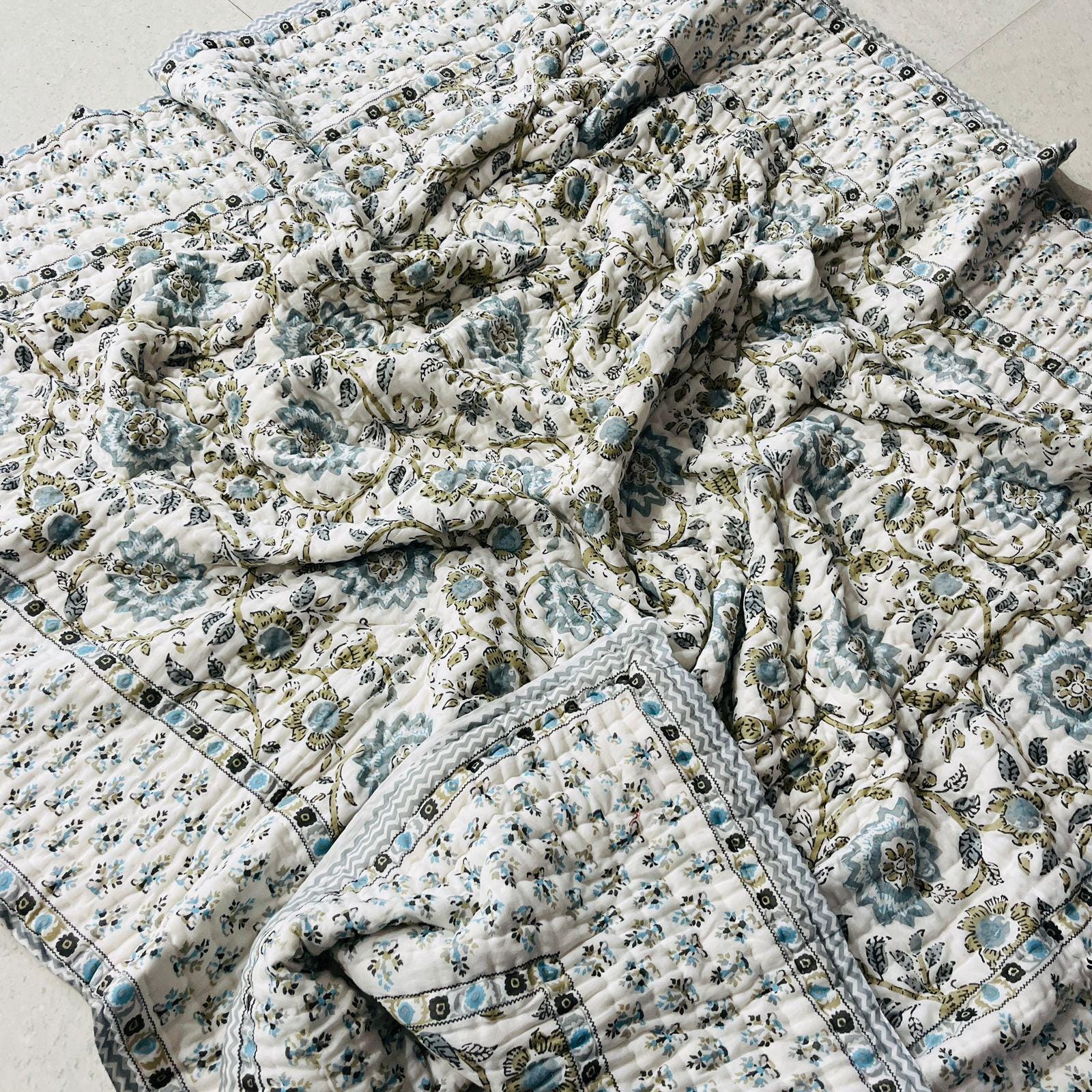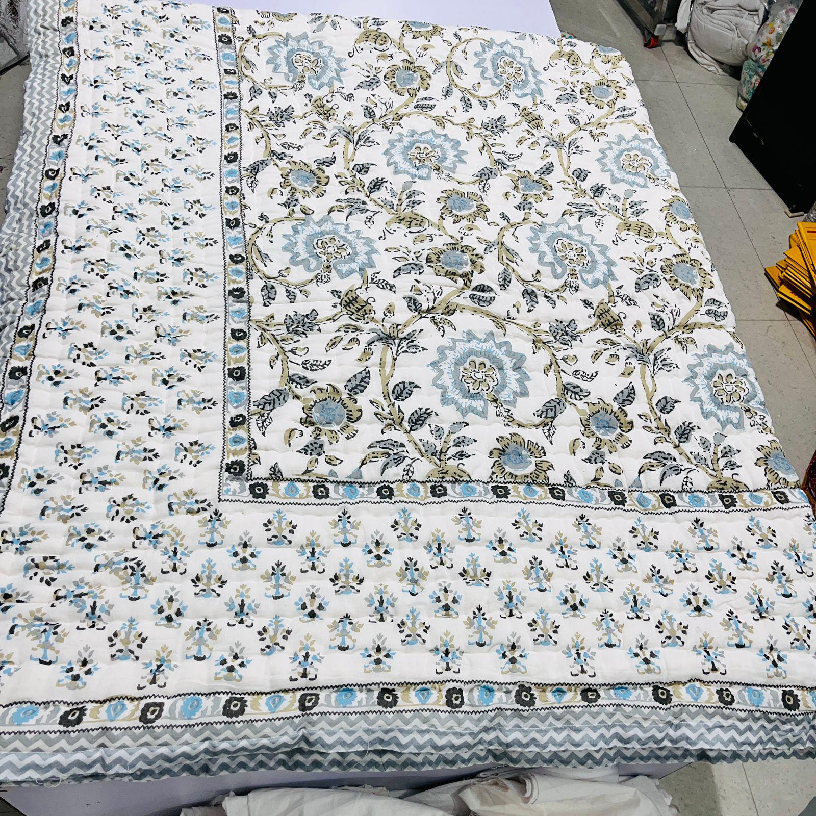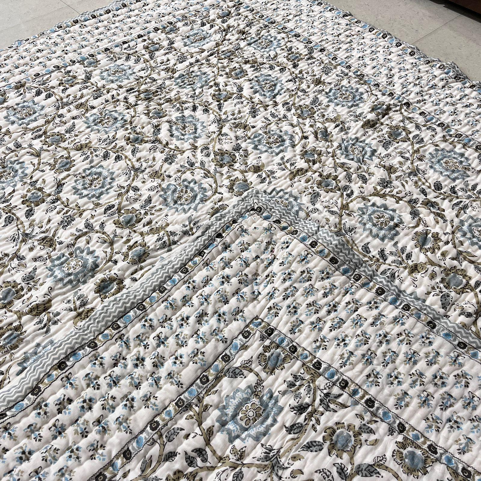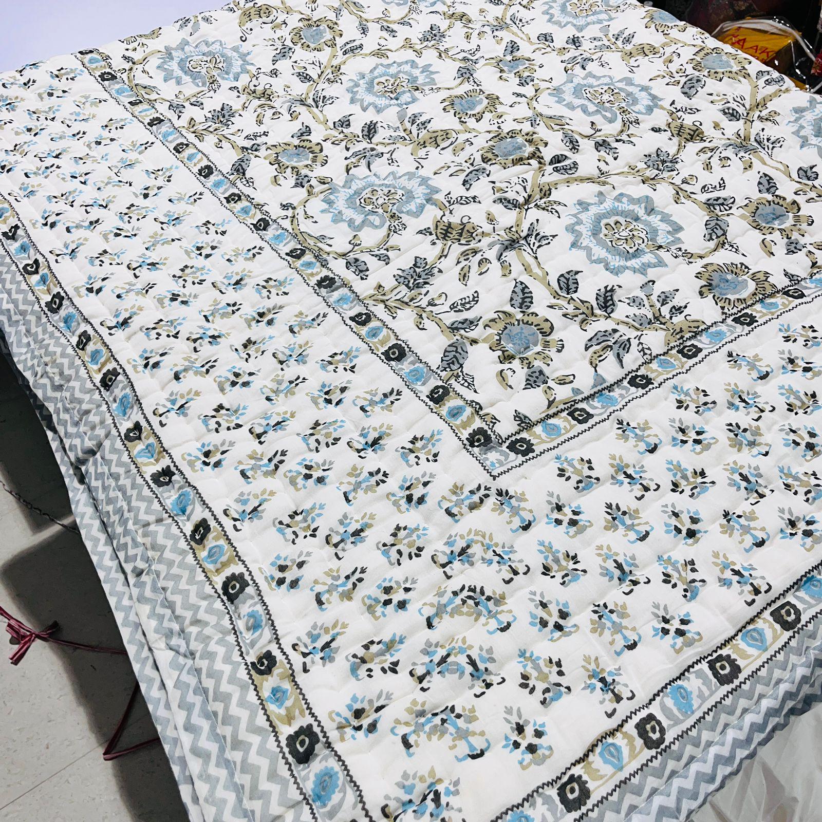 Jaipuri Hand Block Print Quilt: Queen Size Reversible Floral Razai