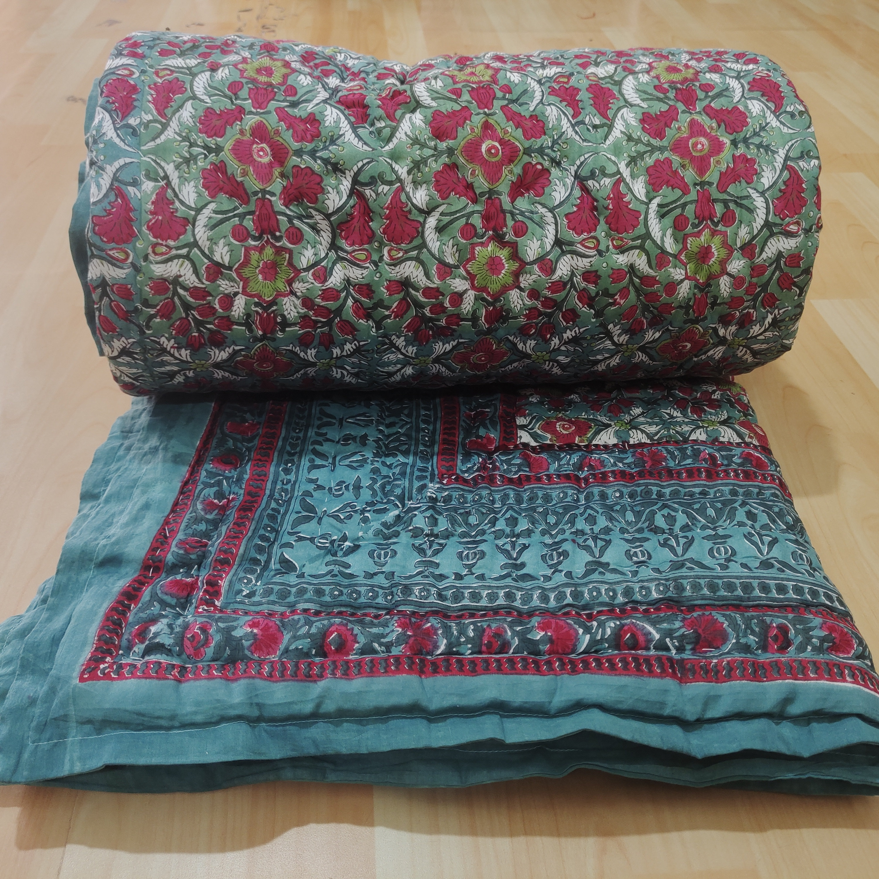 Indulge in the artistry of traditional craftsmanship with our exquisite Hand Stitched Hand Block Print Quilt. Each quilt is a masterpiece of skill and creativity, meticulously crafted by skilled artisans in Jaipur, India. From the intricate hand block printing to the careful stitching, every step in the process is a labor of love, resulting in a quilt that's as beautiful as it is functional.