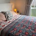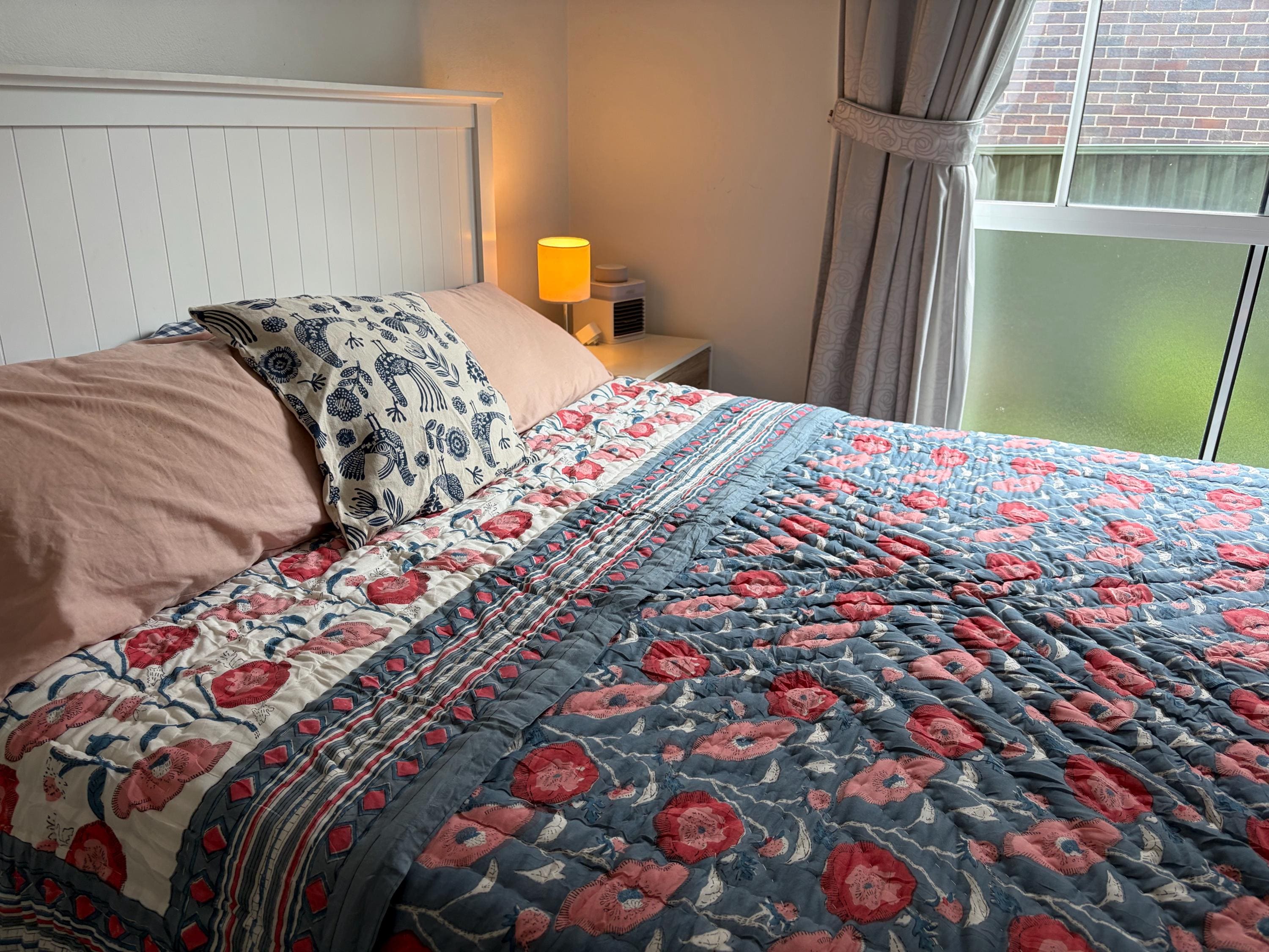 I’m absolutely delighted with this quilt! The craftsmanship is beautiful and you can really tell it’s handmade with care. The colours are even more lovely in person — the soft blue background with the pink floral pattern adds such a cosy, calming feel to the bedroom. The stitching and quilting details are excellent, and the fabric feels high quality and comfortable. It’s the perfect weight — warm without being too heavy — and it lays beautifully on the bed, instantly making the whole room look more inviting. I especially appreciate the attention to detail in packing as well. It came packed in a vacuum bag and shipping was tracked. It arrived just as described on time as well. Highly recommend this shop if you’re looking for a unique, well-made quilt. Thank you for such a gorgeous piece!!
