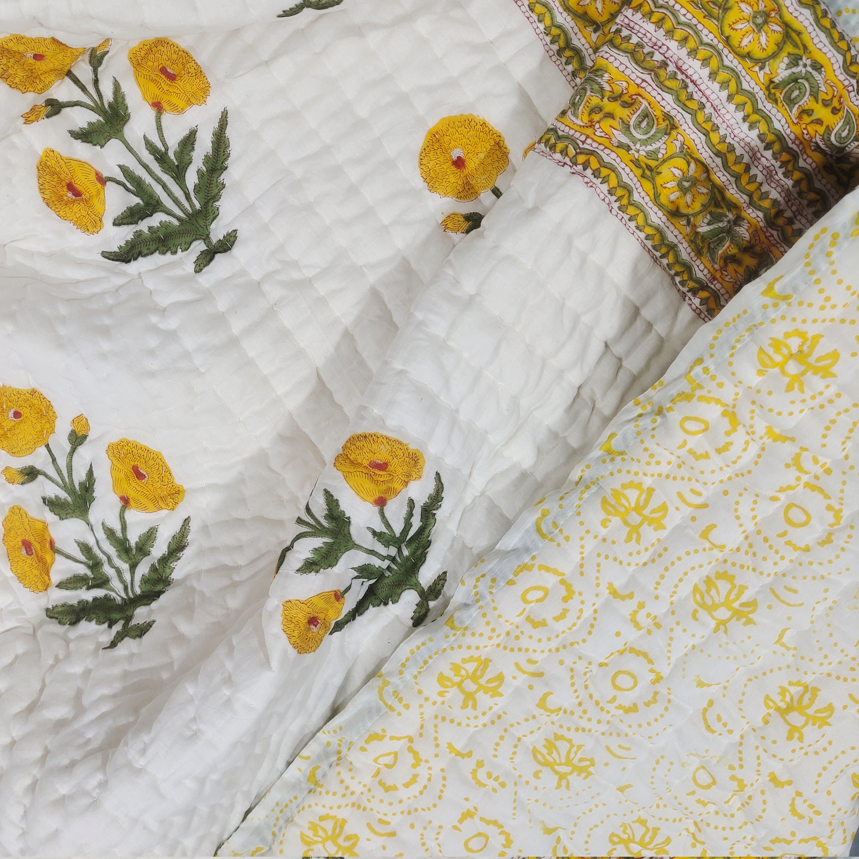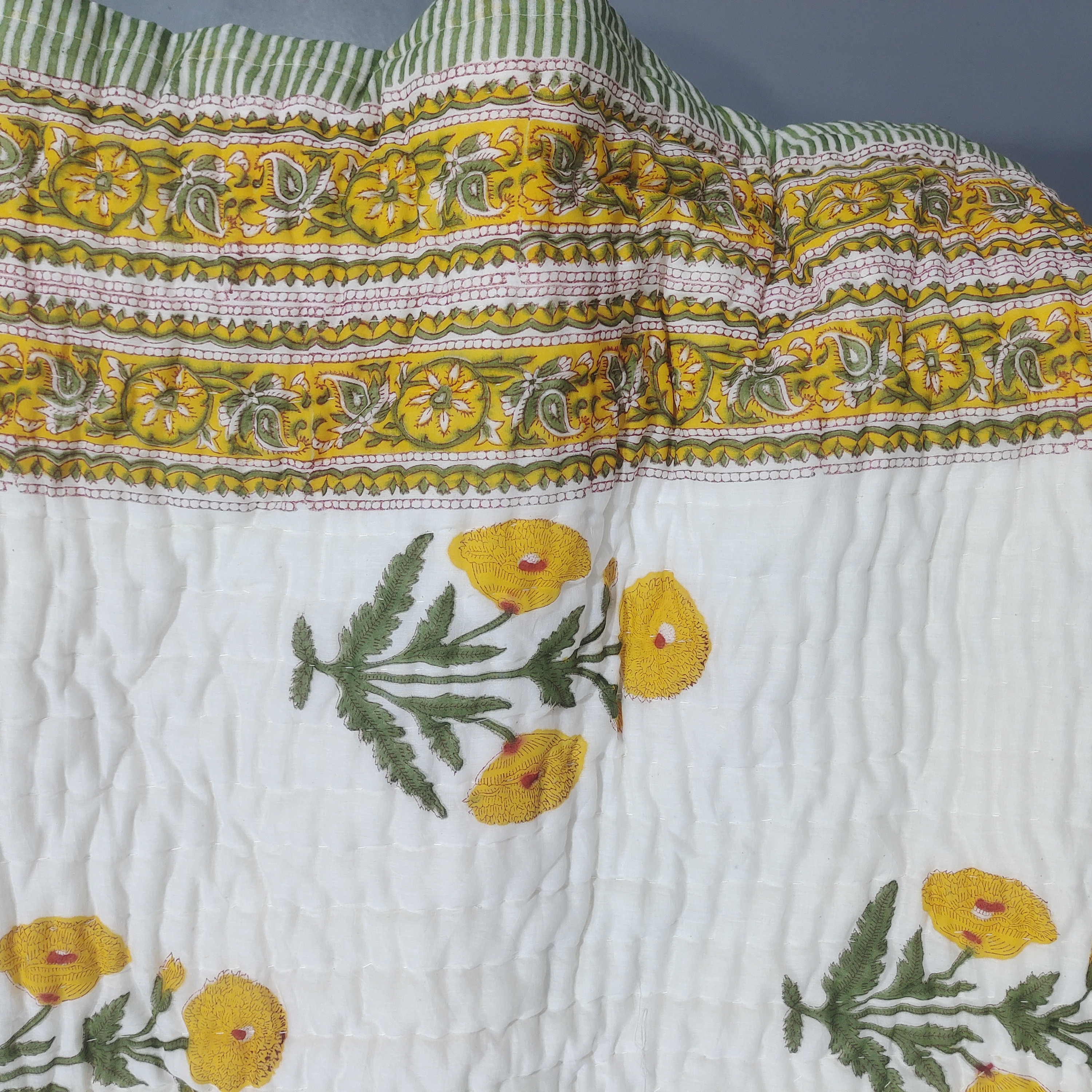 Indulge in the artistry of traditional craftsmanship with our exquisite Hand Stitched Hand Block Print Quilt. Each quilt is a masterpiece of skill and creativity, meticulously crafted by skilled artisans in Jaipur, India. From the intricate hand block printing to the careful stitching, every step in the process is a labor of love, resulting in a quilt that's as beautiful as it is functional.