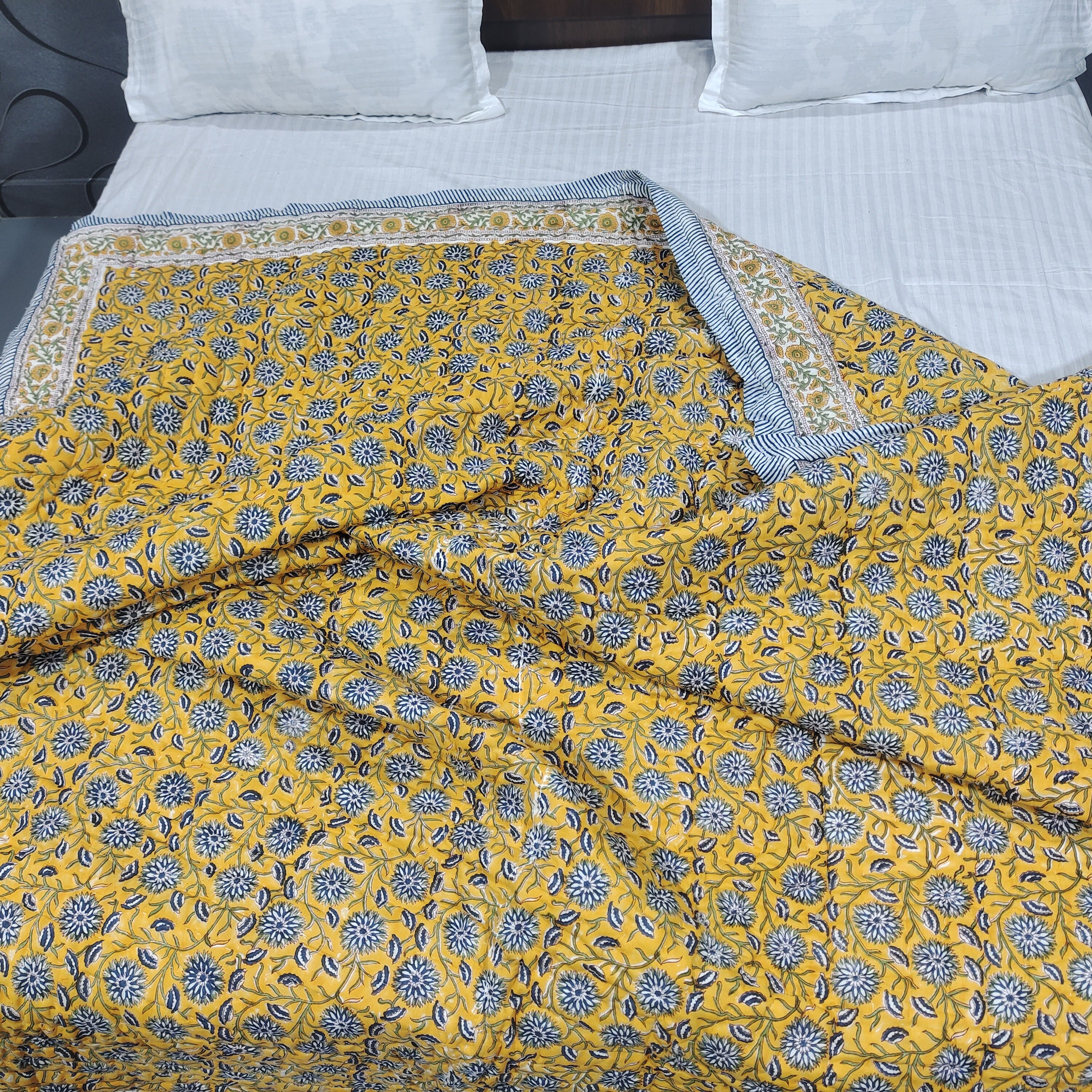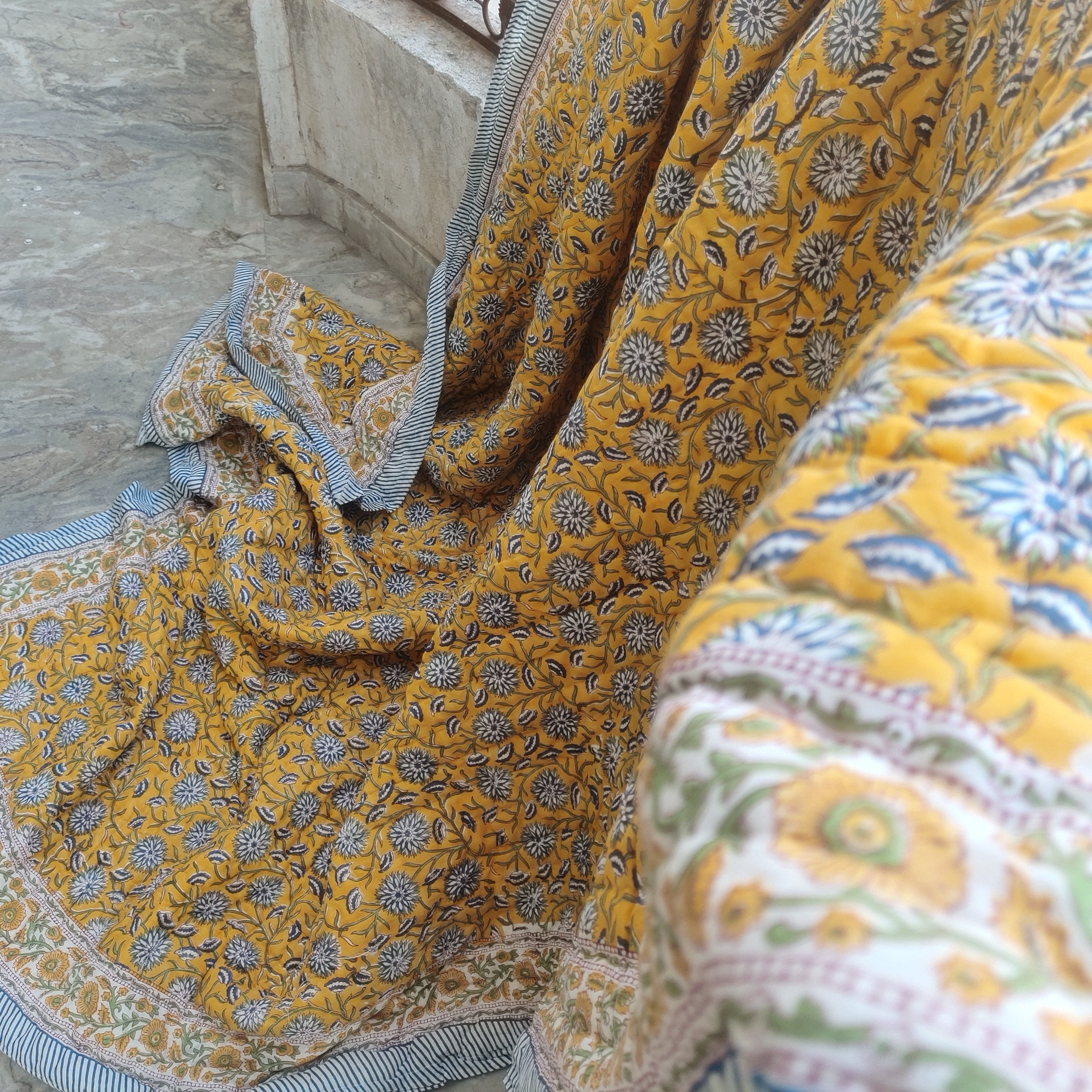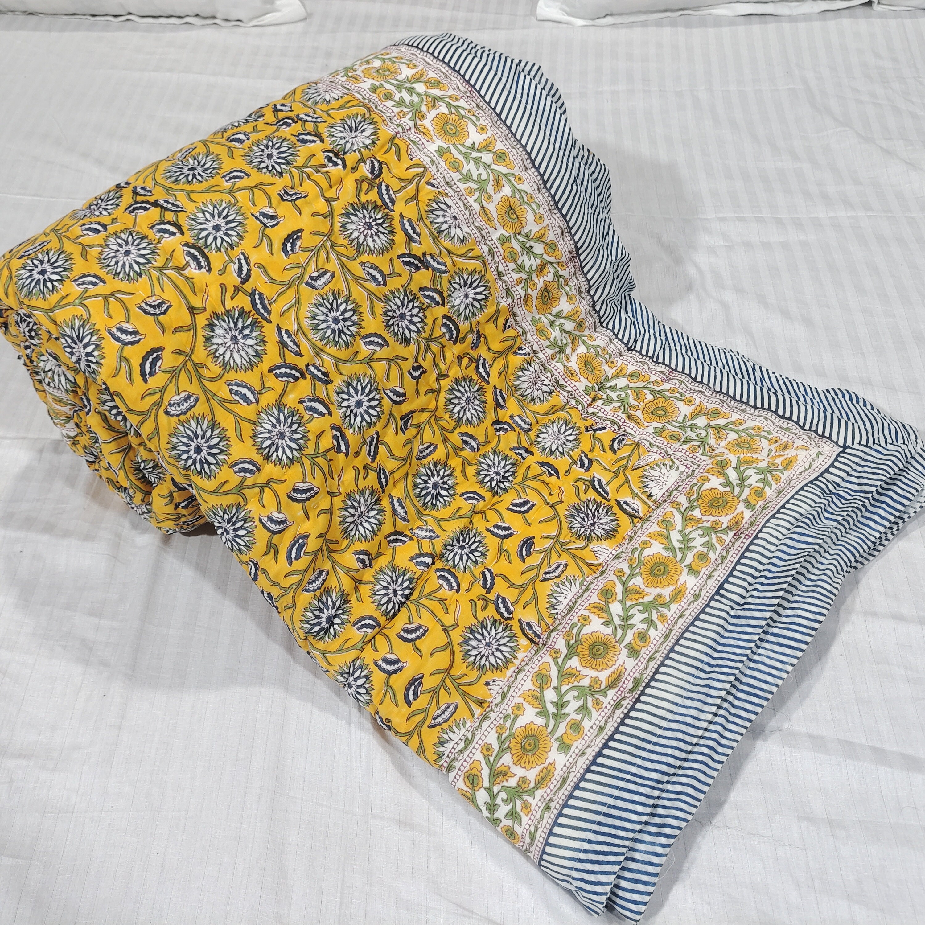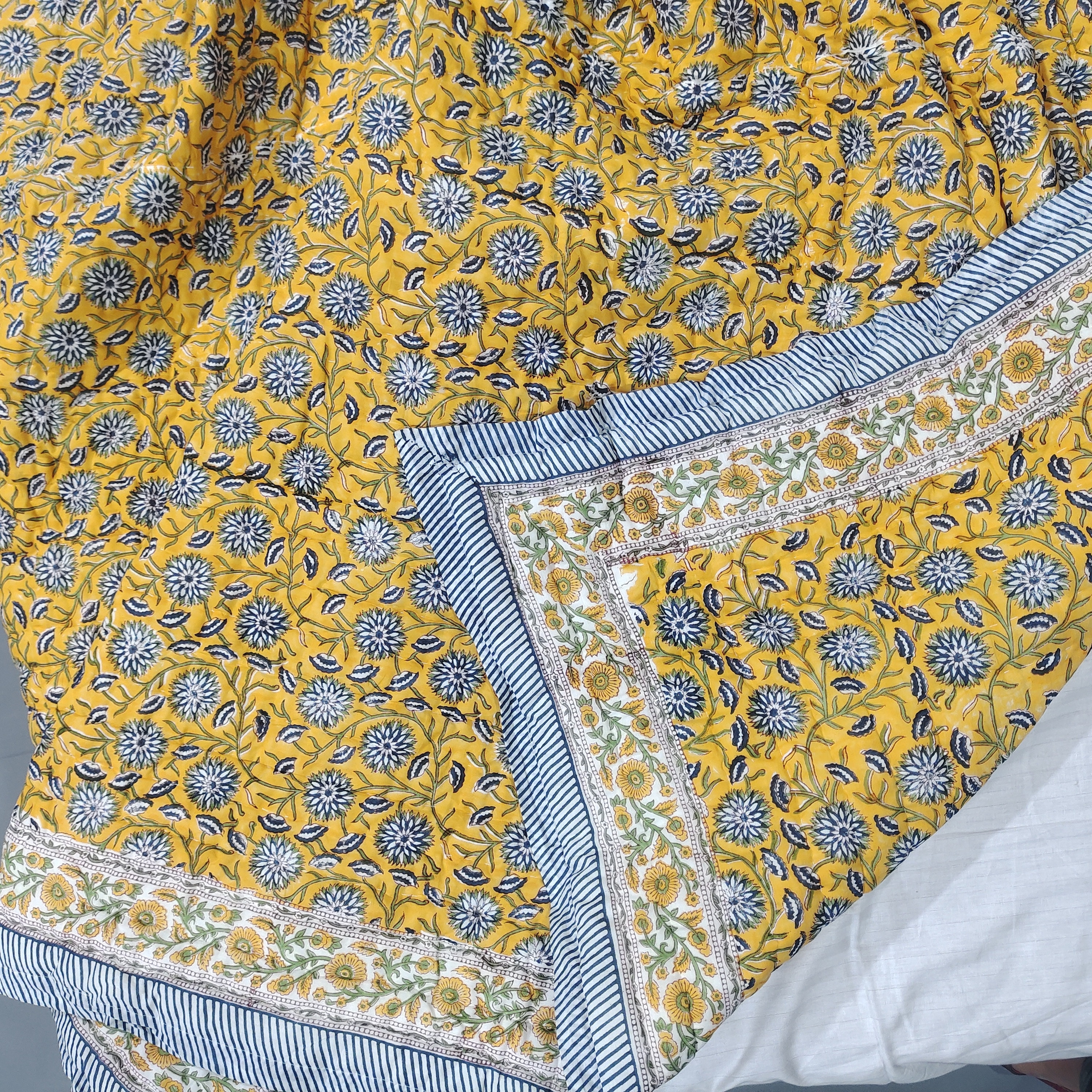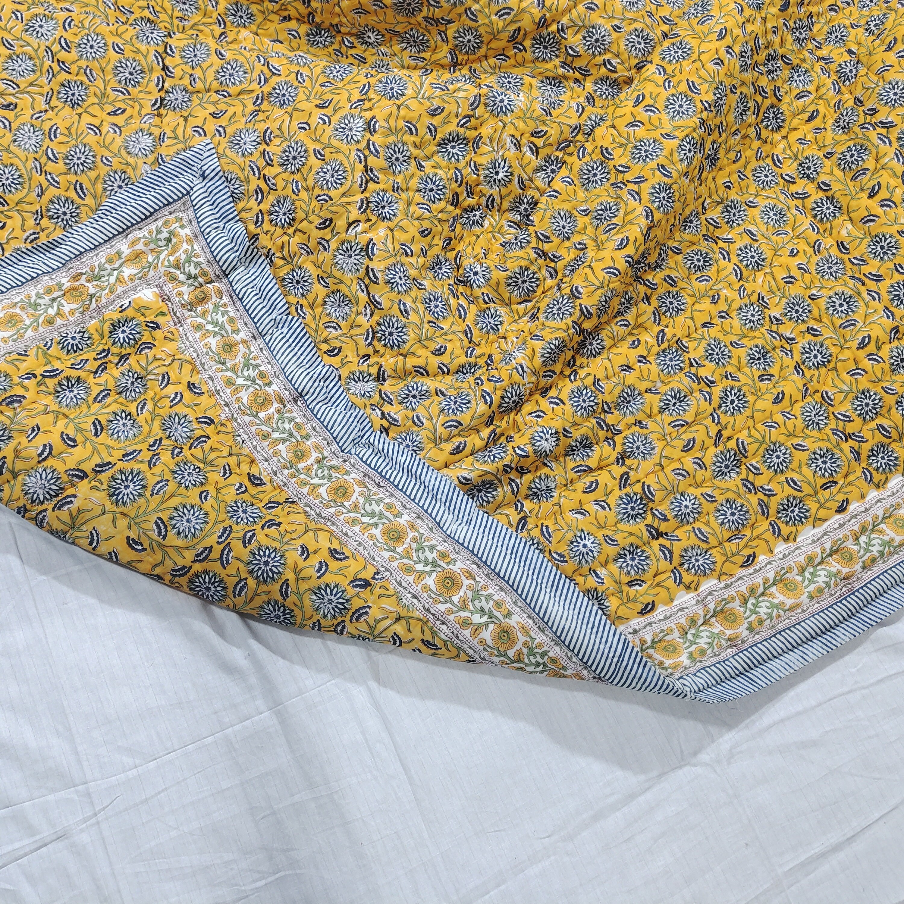 Indulge in the artistry of traditional craftsmanship with our exquisite Hand Stitched Hand Block Print Quilt. Each quilt is a masterpiece of skill and creativity, meticulously crafted by skilled artisans in Jaipur, India. From the intricate hand block printing to the careful stitching, every step in the process is a labor of love, resulting in a quilt that's as beautiful as it is functional.