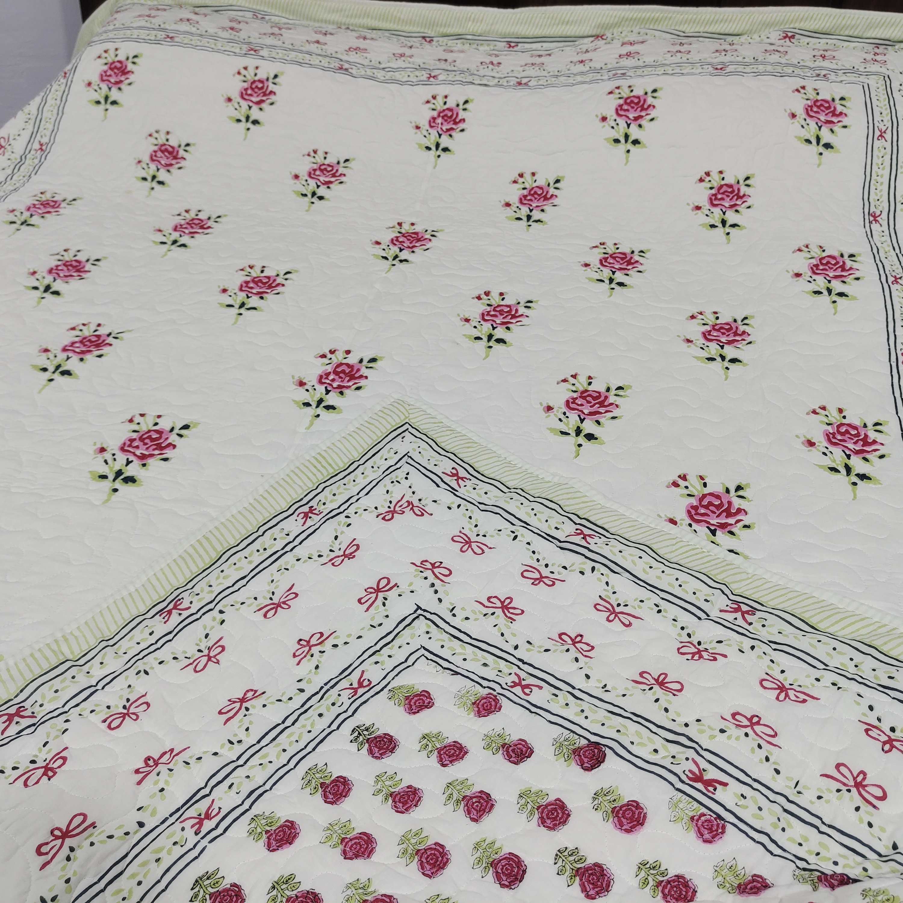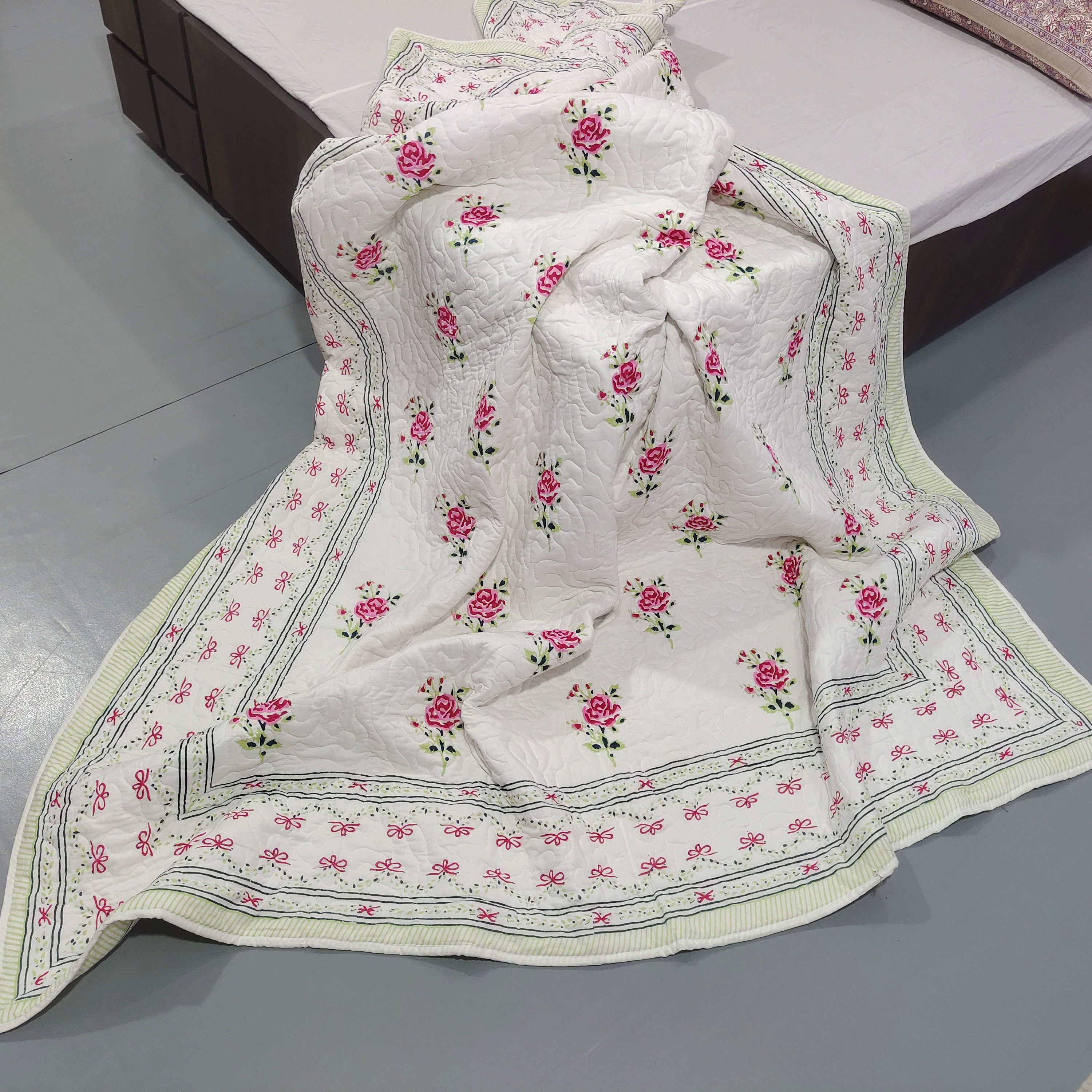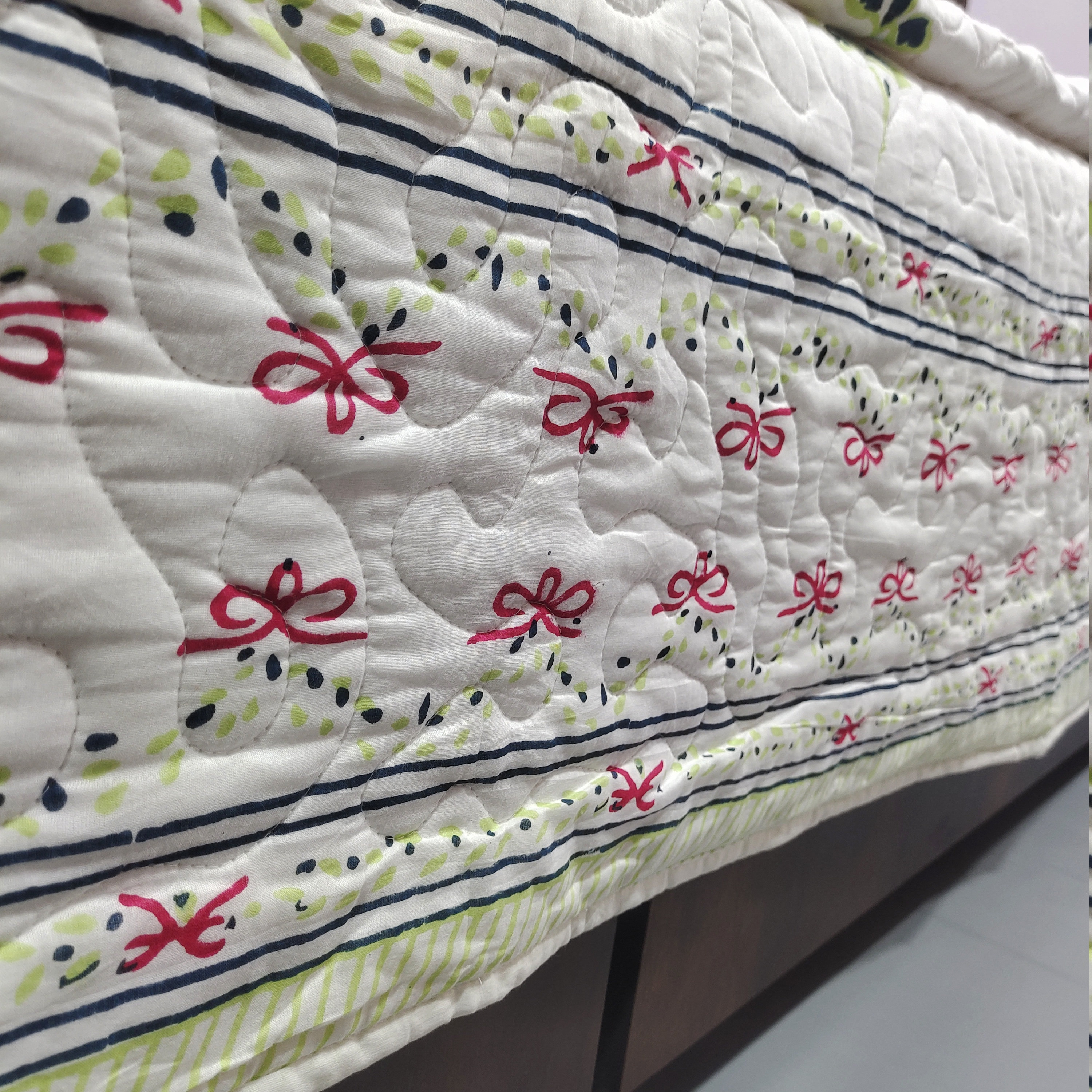 One distinctive feature of this quilt is its reversible hand block print. This traditional printing technique adds a unique and artistic touch to the quilt, making it not only a functional bedding item but also a piece of aesthetic appeal. Hand block printing involves skilled artisans carving intricate designs onto wooden blocks, which are then dipped in dye and stamped onto the fabric.