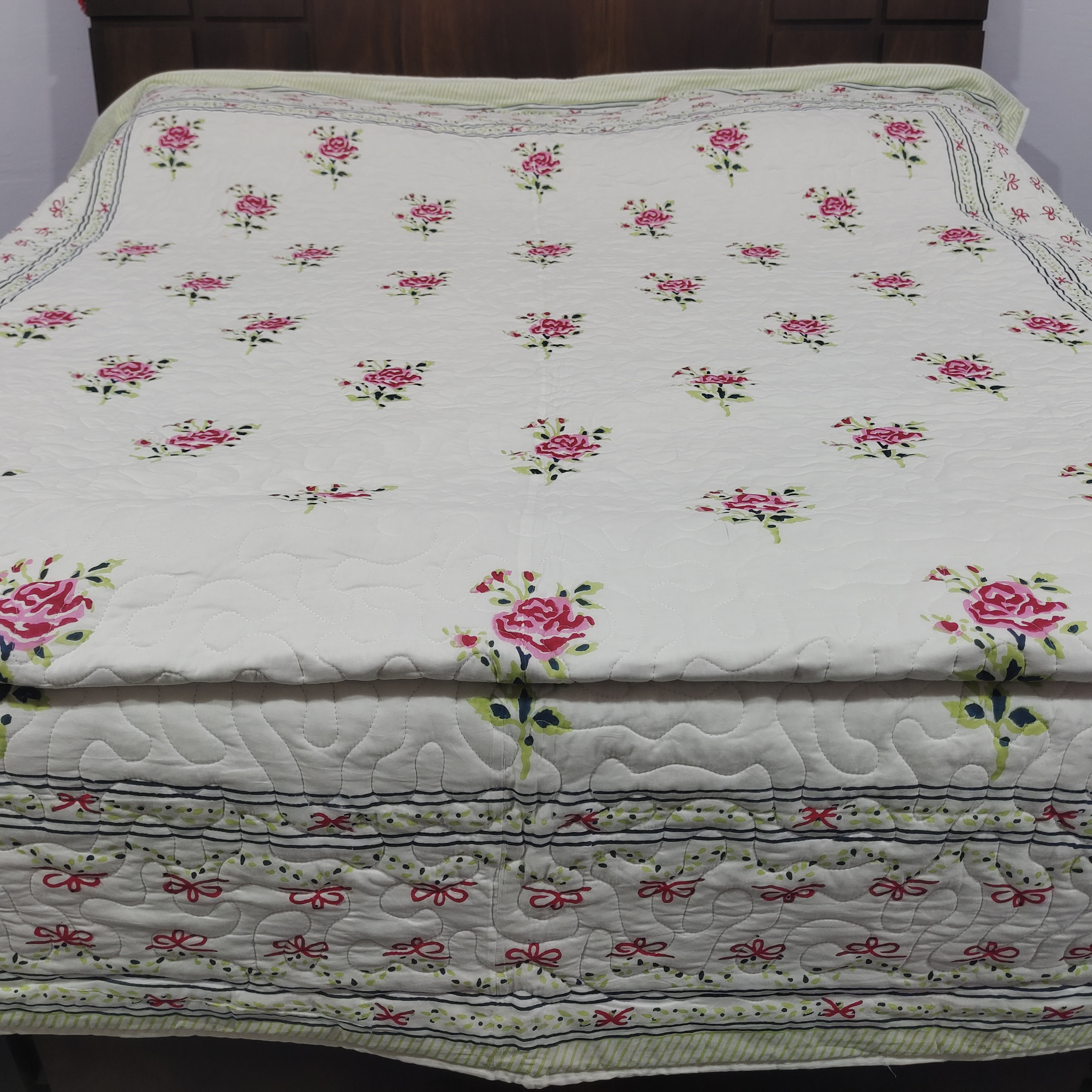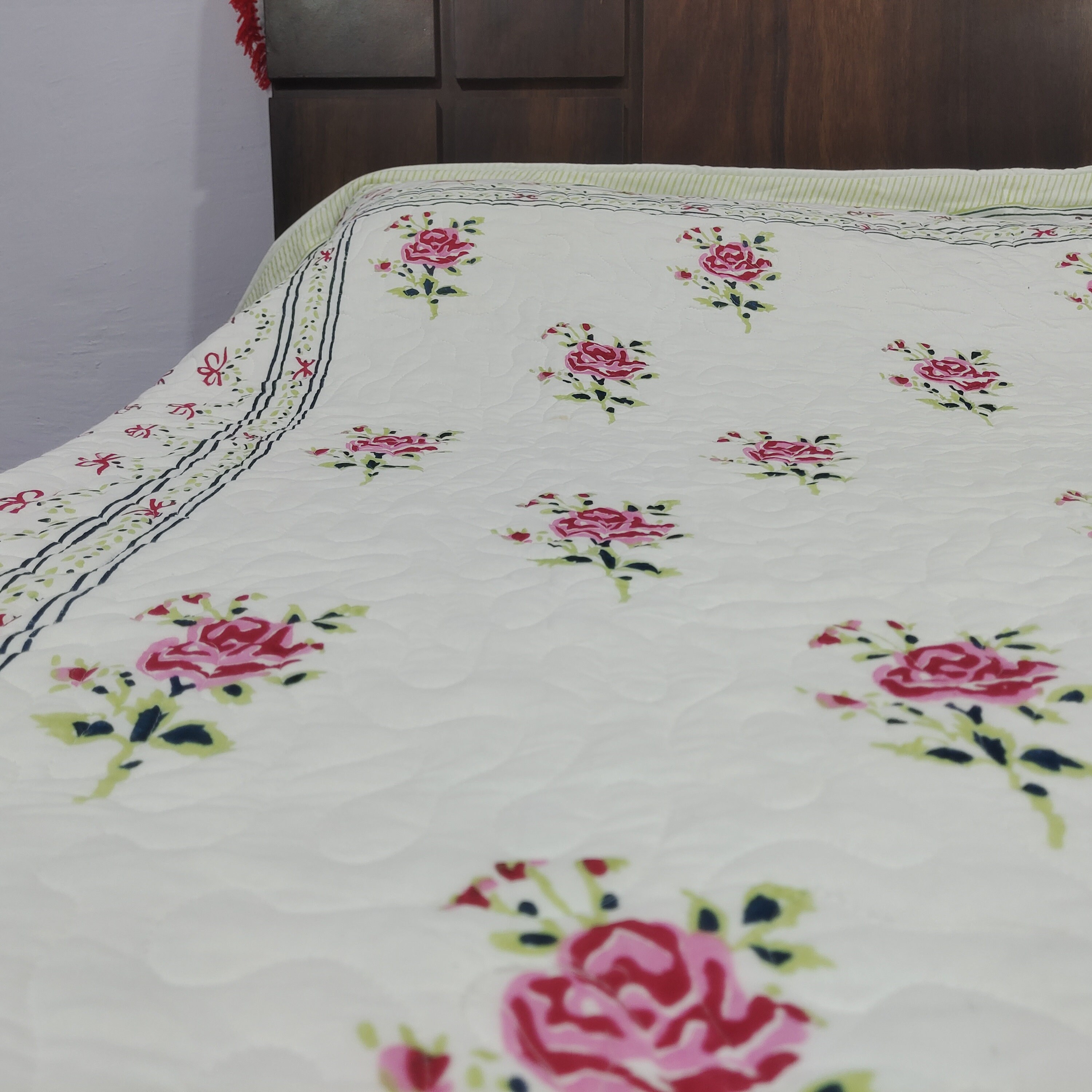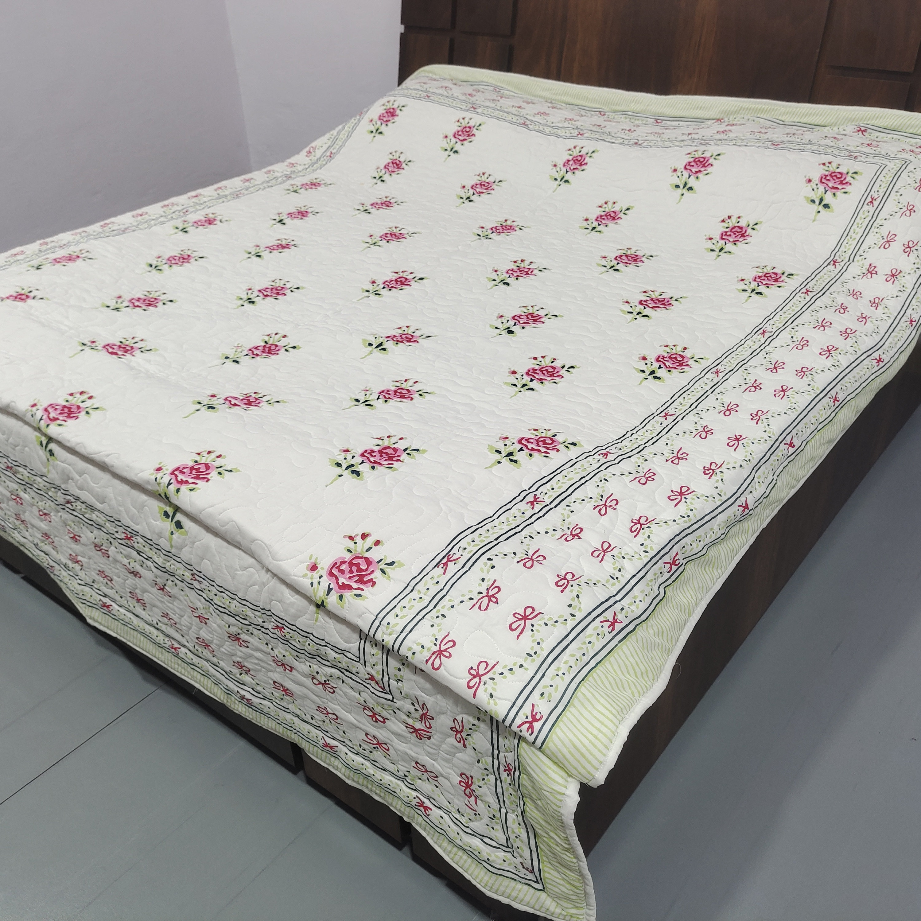 One distinctive feature of this quilt is its reversible hand block print. This traditional printing technique adds a unique and artistic touch to the quilt, making it not only a functional bedding item but also a piece of aesthetic appeal. Hand block printing involves skilled artisans carving intricate designs onto wooden blocks, which are then dipped in dye and stamped onto the fabric.